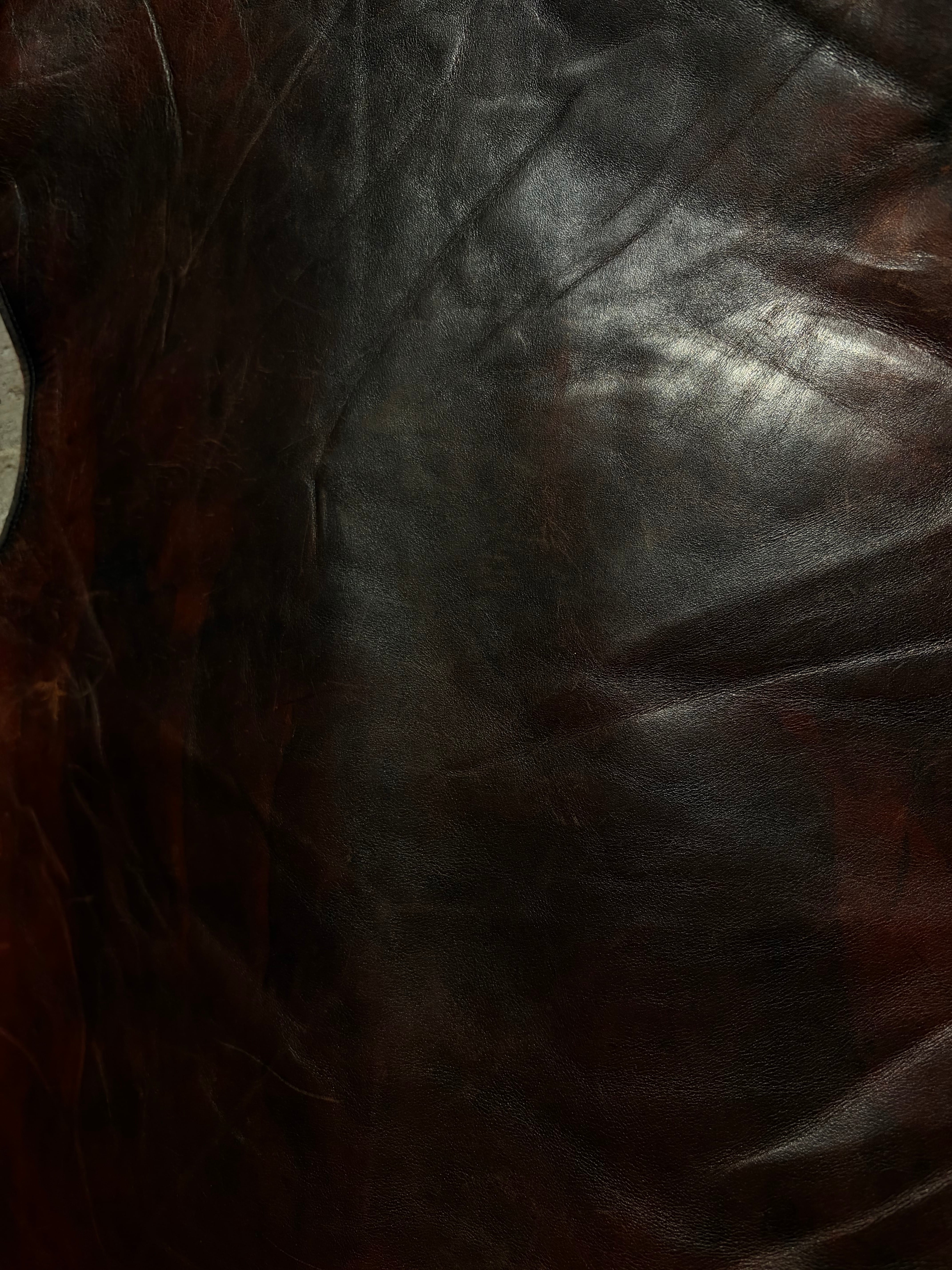 しっかりとした厚みと密度を感じさせるレザーは、部位ごとにムラのある色味が現れ、奥行きのある表情を形成。着込まれることで生まれたシワや陰影が、素材そのものの力強さをより一層引き立てています。