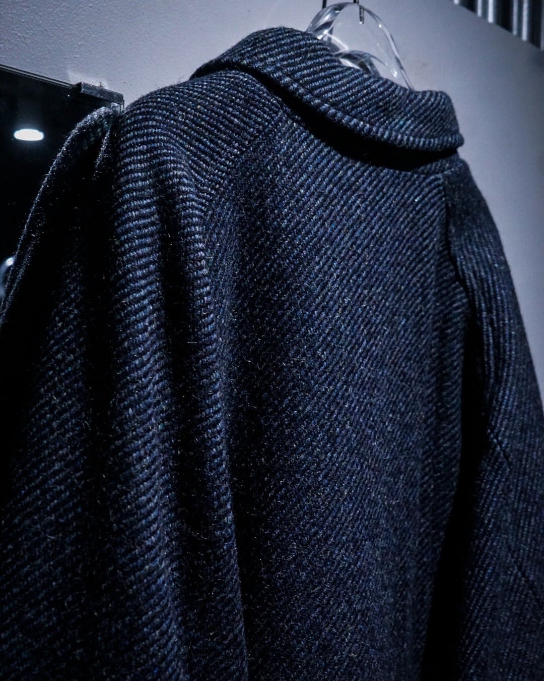 フロントは比翼仕立てを採用し、ボタンやジップを表に出さないミニマルな構造に。すっきりとした印象を保ちつつ、ウール素材の表情やシルエットの美しさが際立つ仕上がりに。