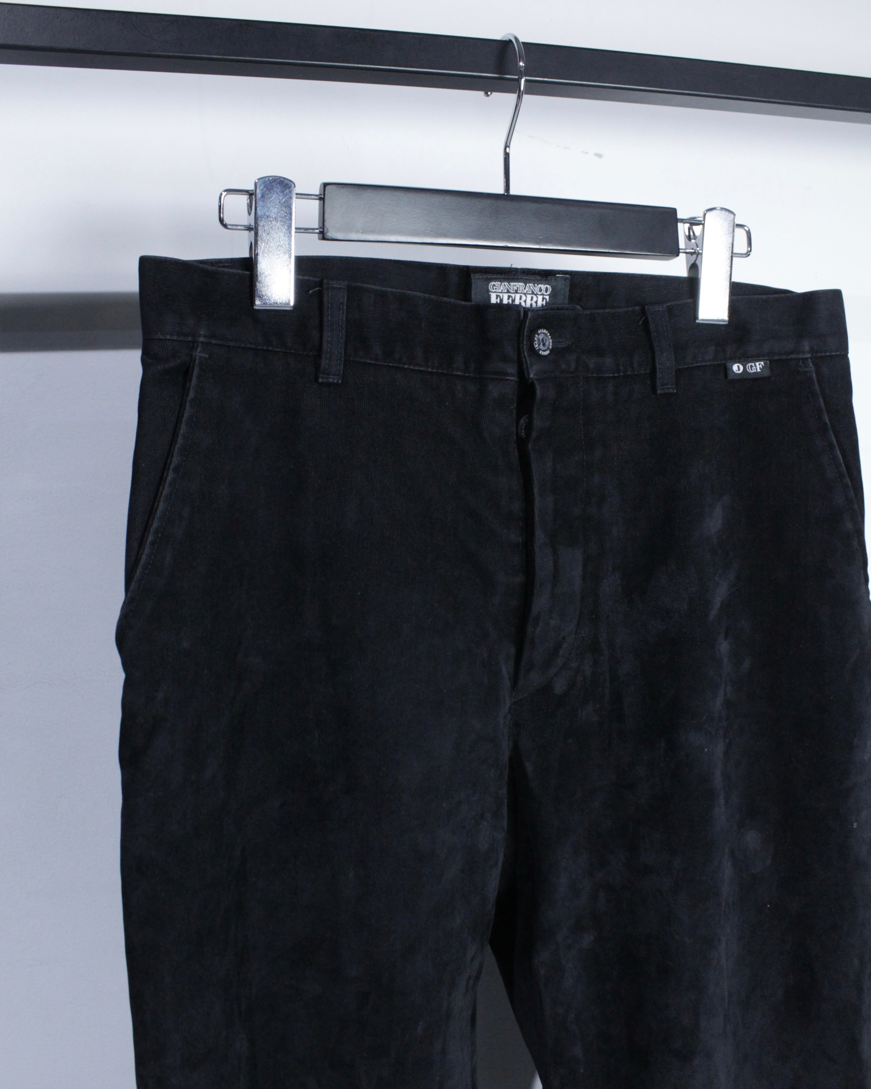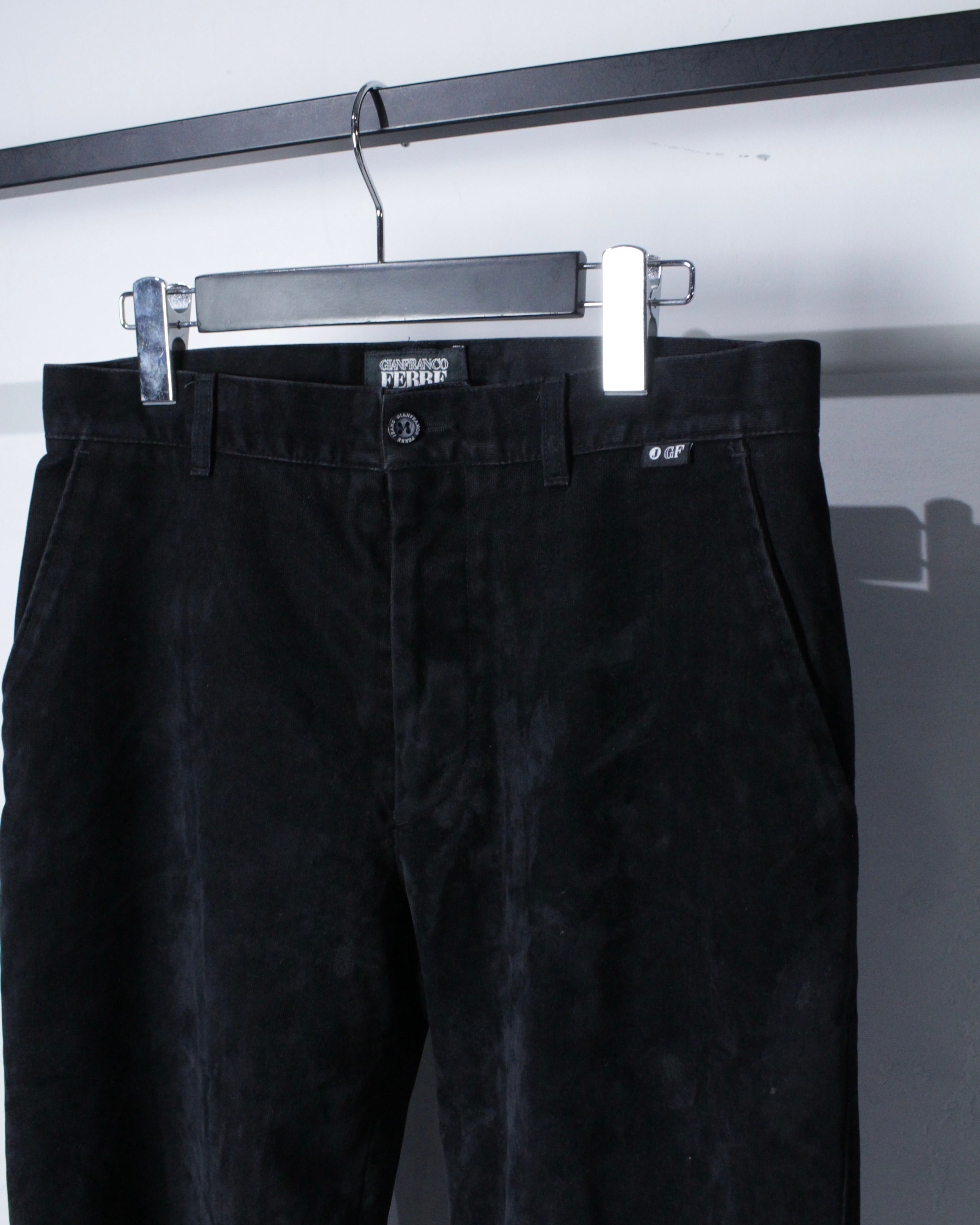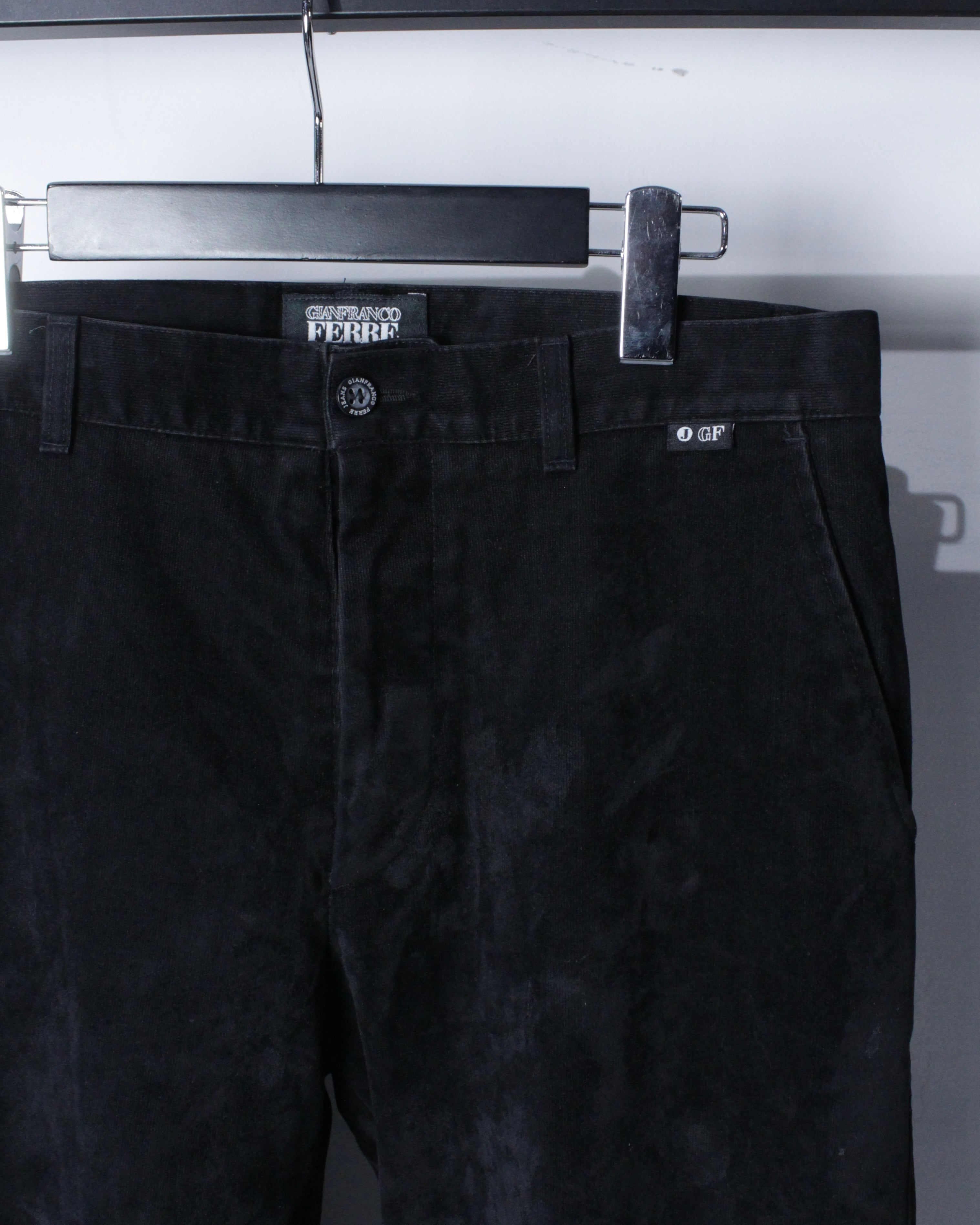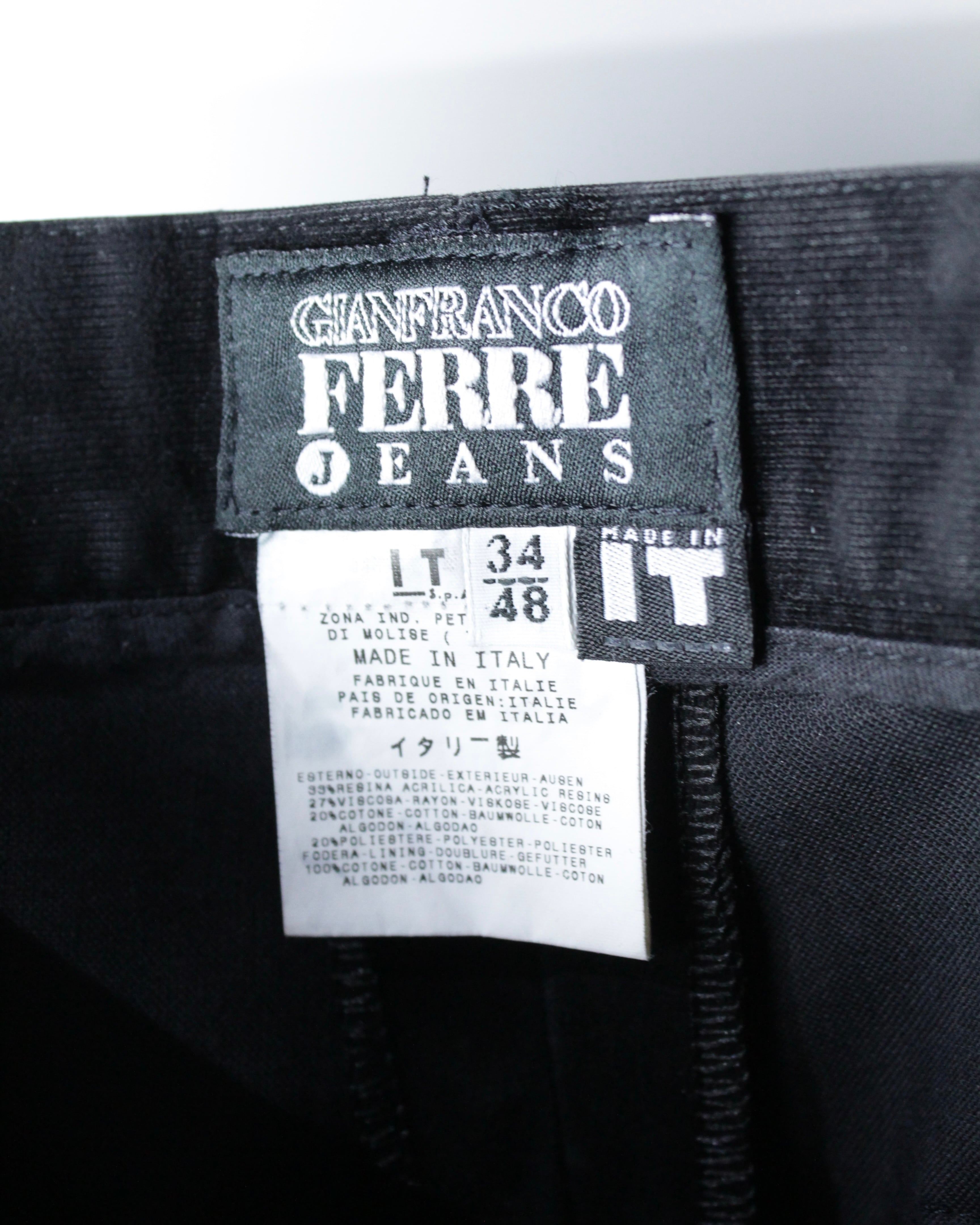 “GIANFRANCO FERRÉ JEANS”らしい構築美と素材使いが際立つパンツ。