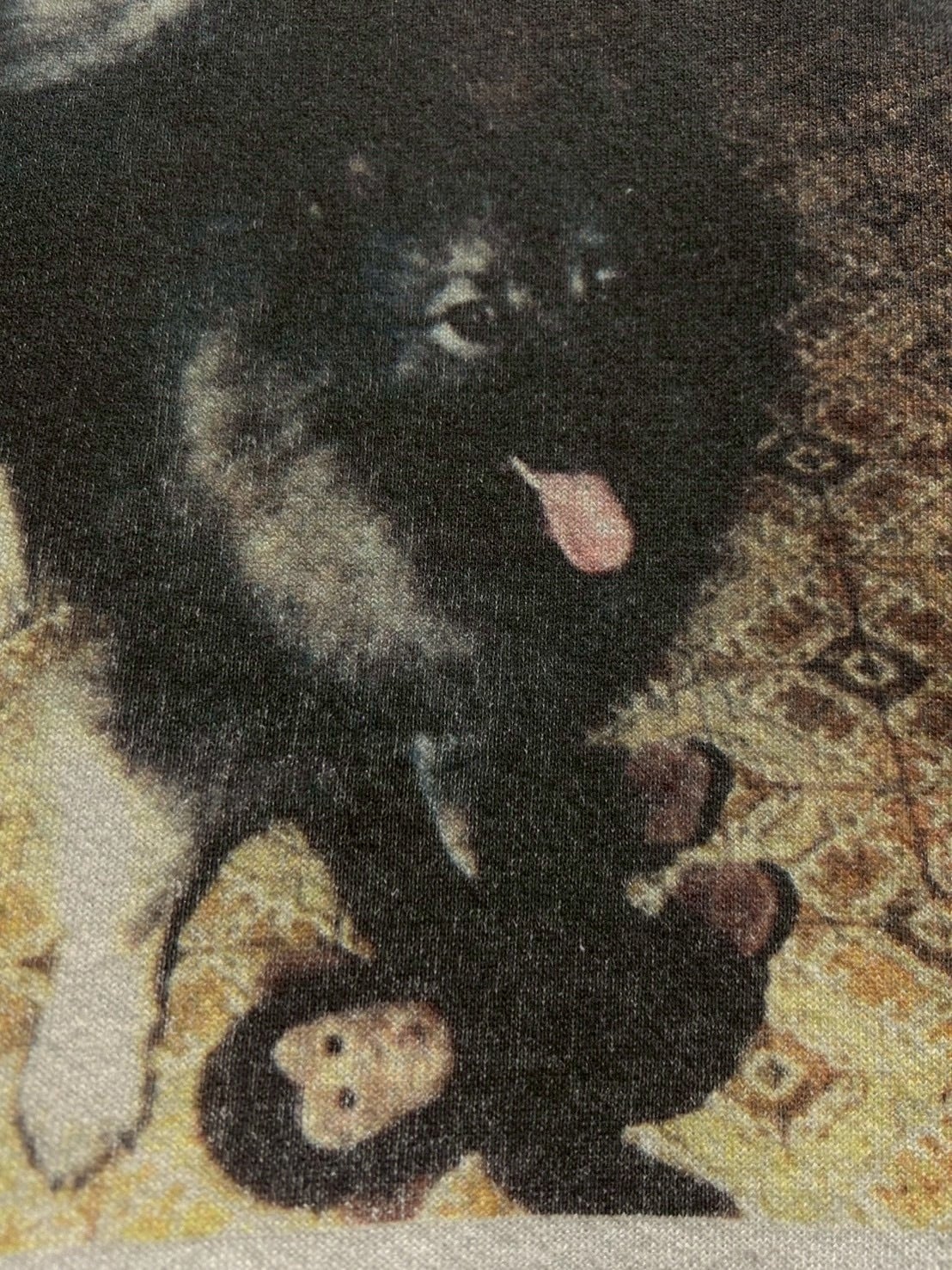 フロントには、愛嬌のある犬のフォトプリントを載せ、無名だからこそ生まれるこのゆるさとリアリティ。何気ない日常のワンシーンをそのまま落とし込んだような温度感が、絶妙な力の抜け具合を演出します。