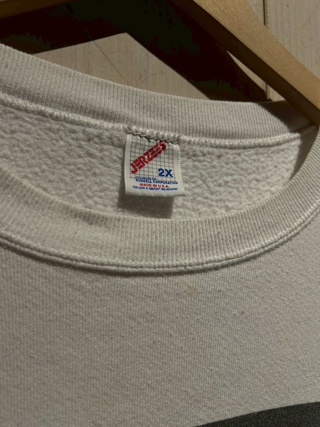 主張しすぎないけれど、確実に目を引く1着。90’s Jerzeesボディに日常的な写真というバランスが光る、唯一無二のスウェットです。