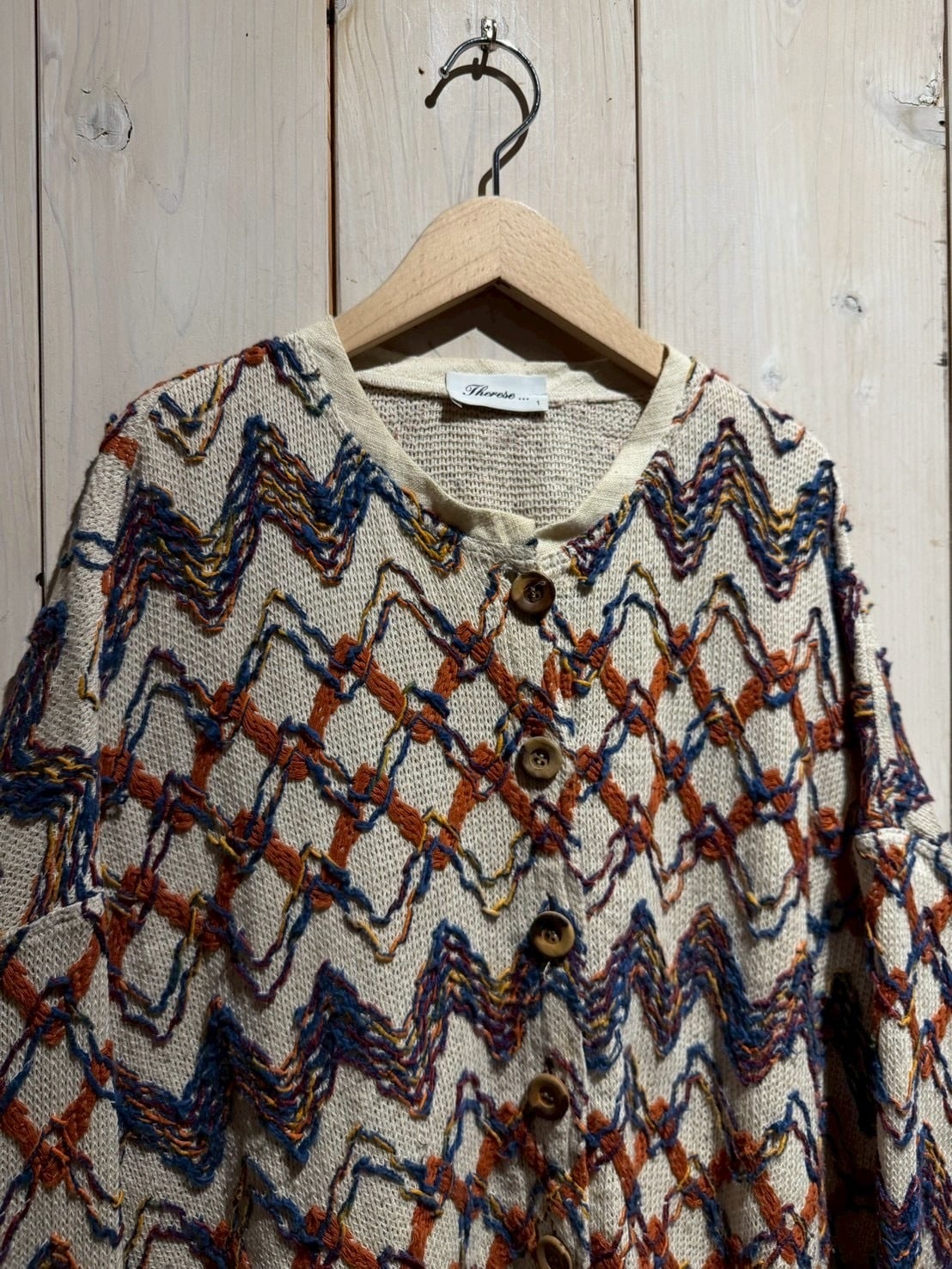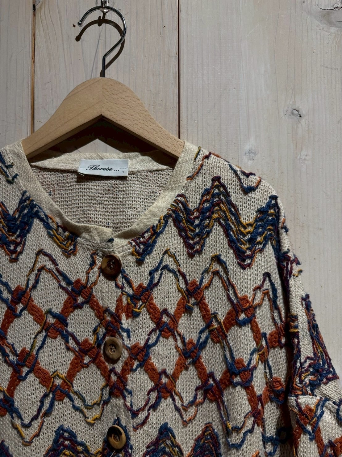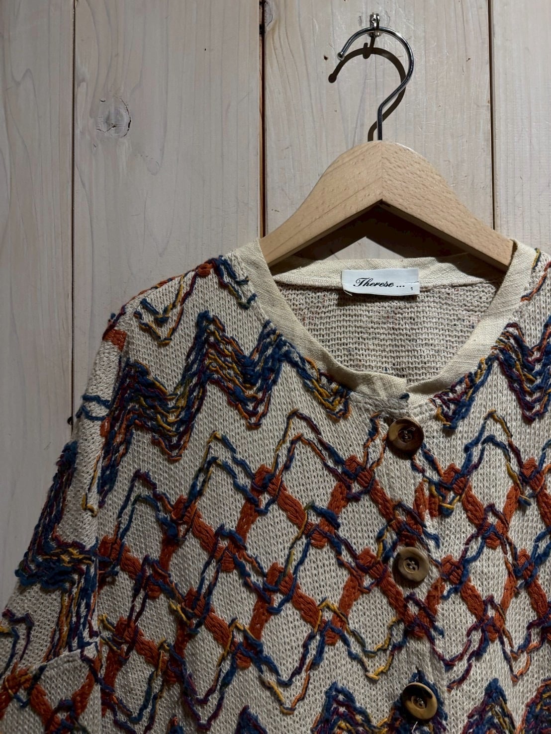 ベースはナチュラルなアイボリーカラーのボディで、そこにブルー、オレンジ、イエローといった多色の糸でジグザグや格子状のパターンを立体的な刺繍で表現した1着。