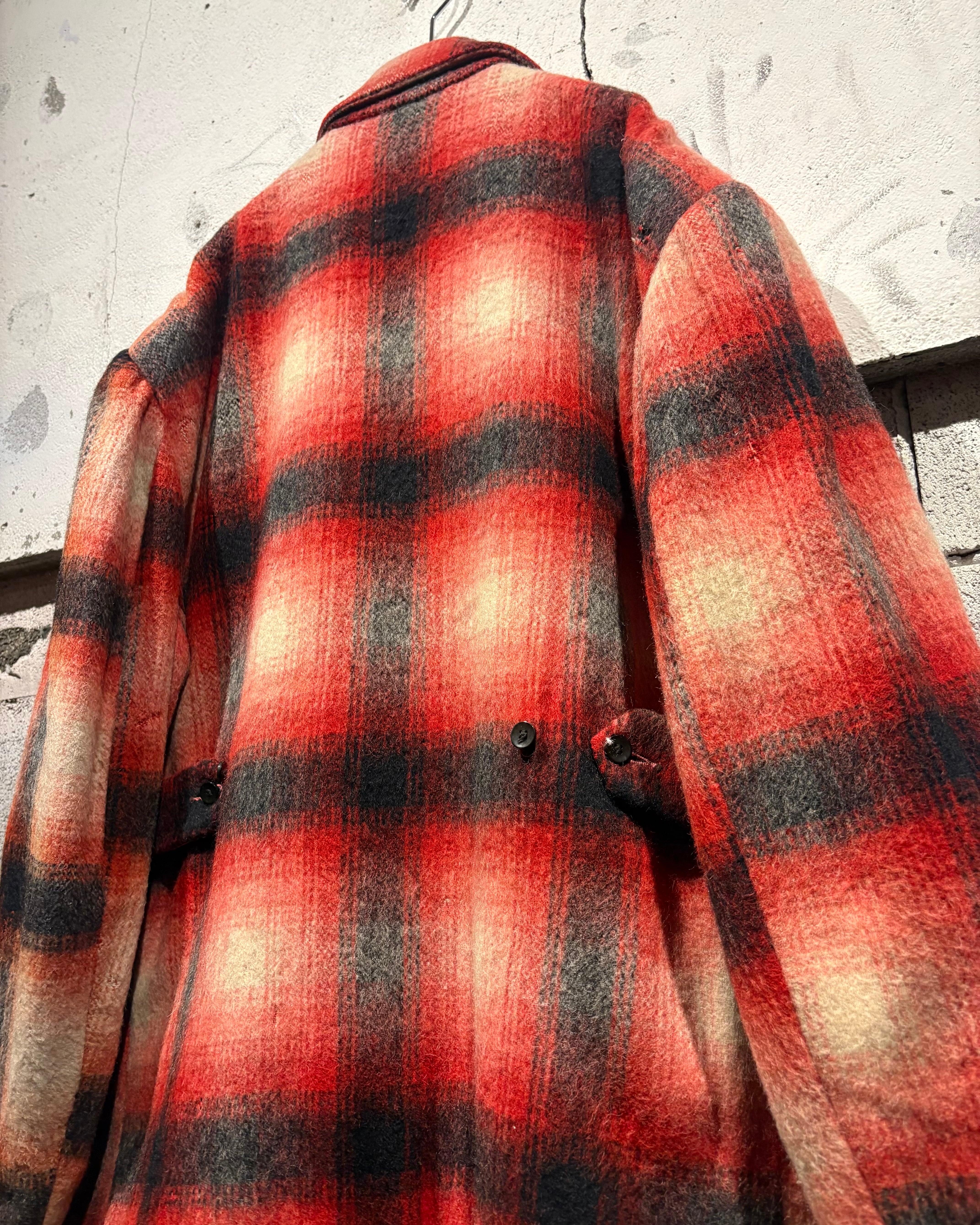 赤を基調に、ブラックとアイボリーが溶け合うように滲むオンブレチェック。毛足のあるウールファブリックはふっくらと柔らかく、ヴィンテージならではの雰囲気を漂わせています。