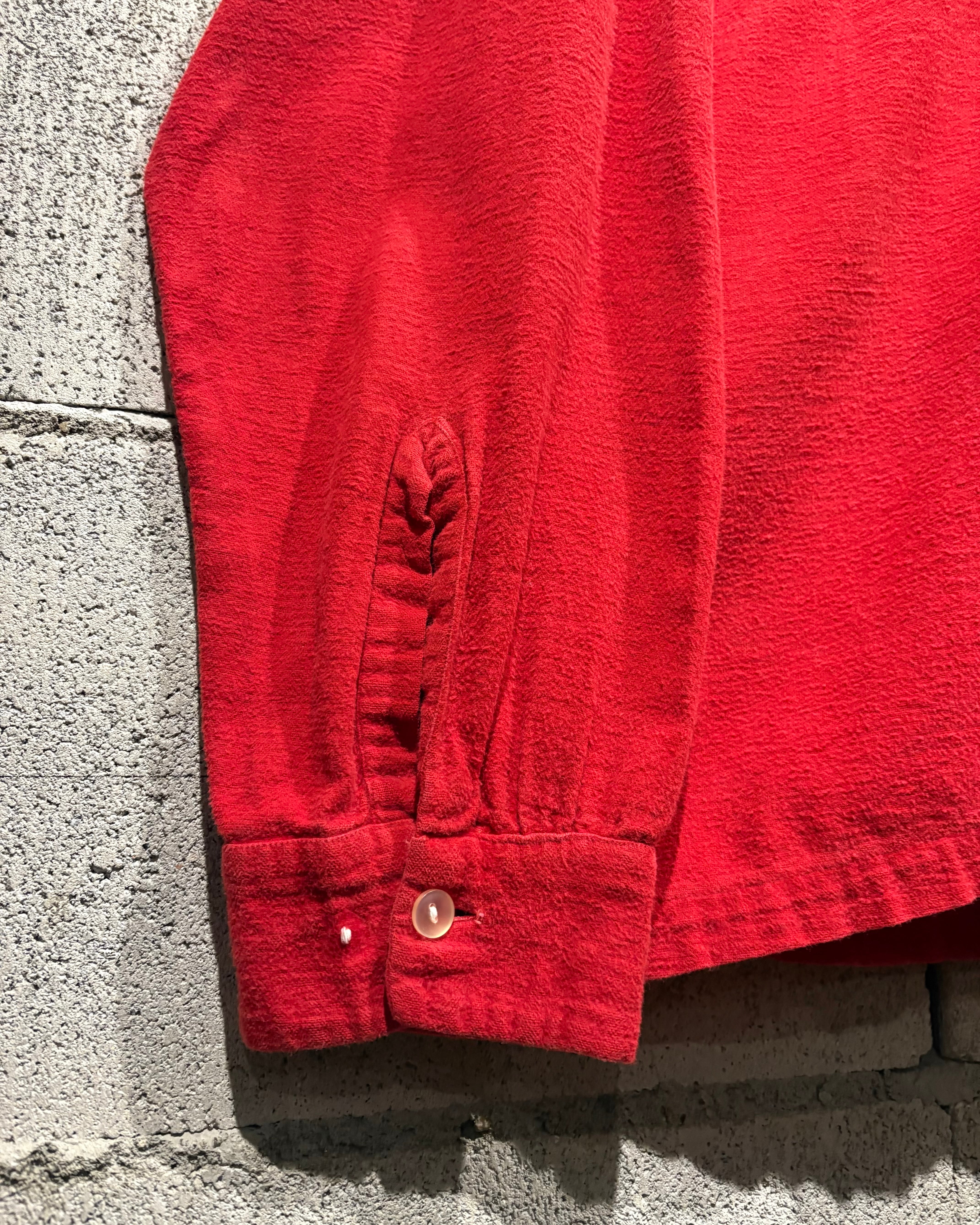 軽やかで落ち感のあるファブリックは、着用時に自然なドレープを描き、身体のラインに沿って柔らかく揺れる質感。鮮やかな赤のカラーリングもマッチして、シンプルながらヴィンテージらしい雰囲気を纏っています。