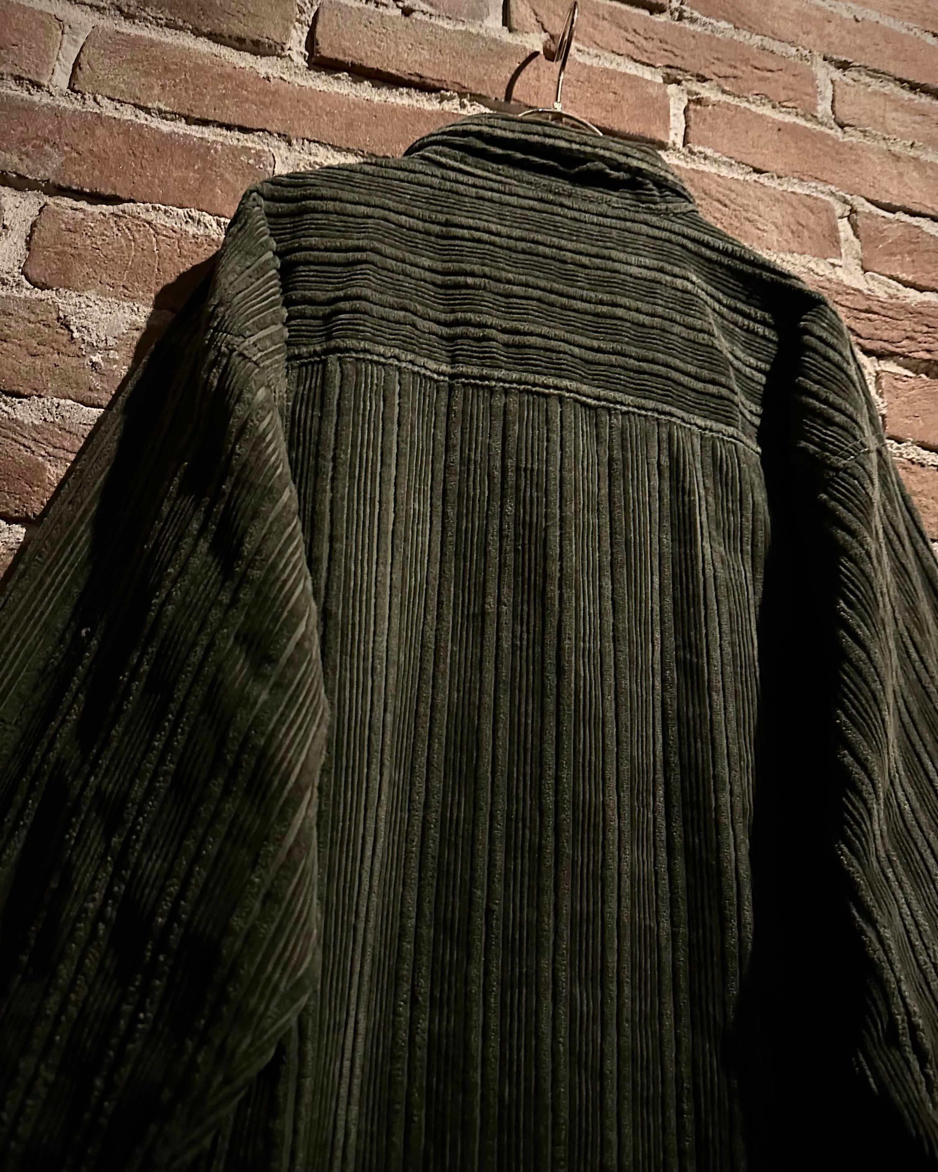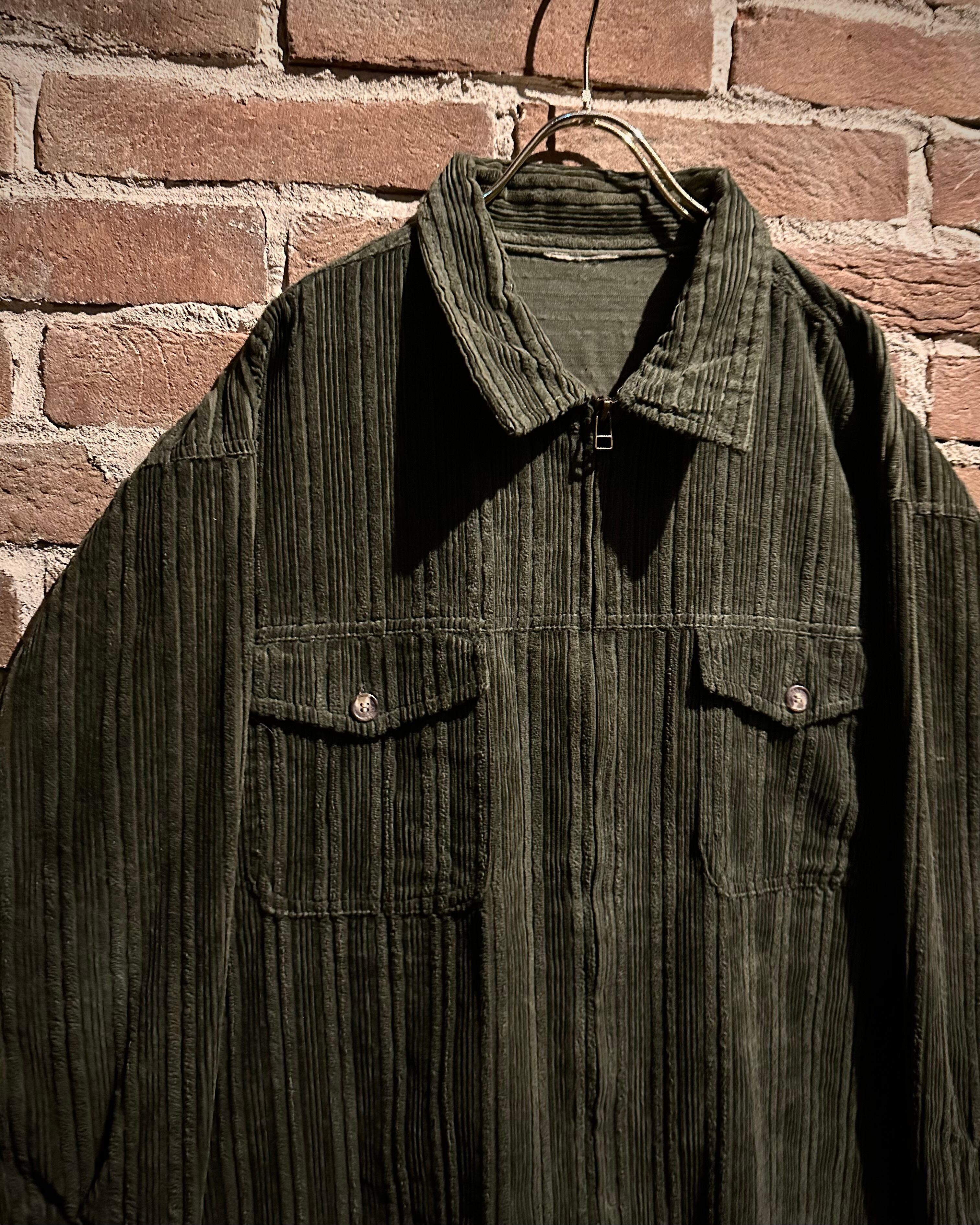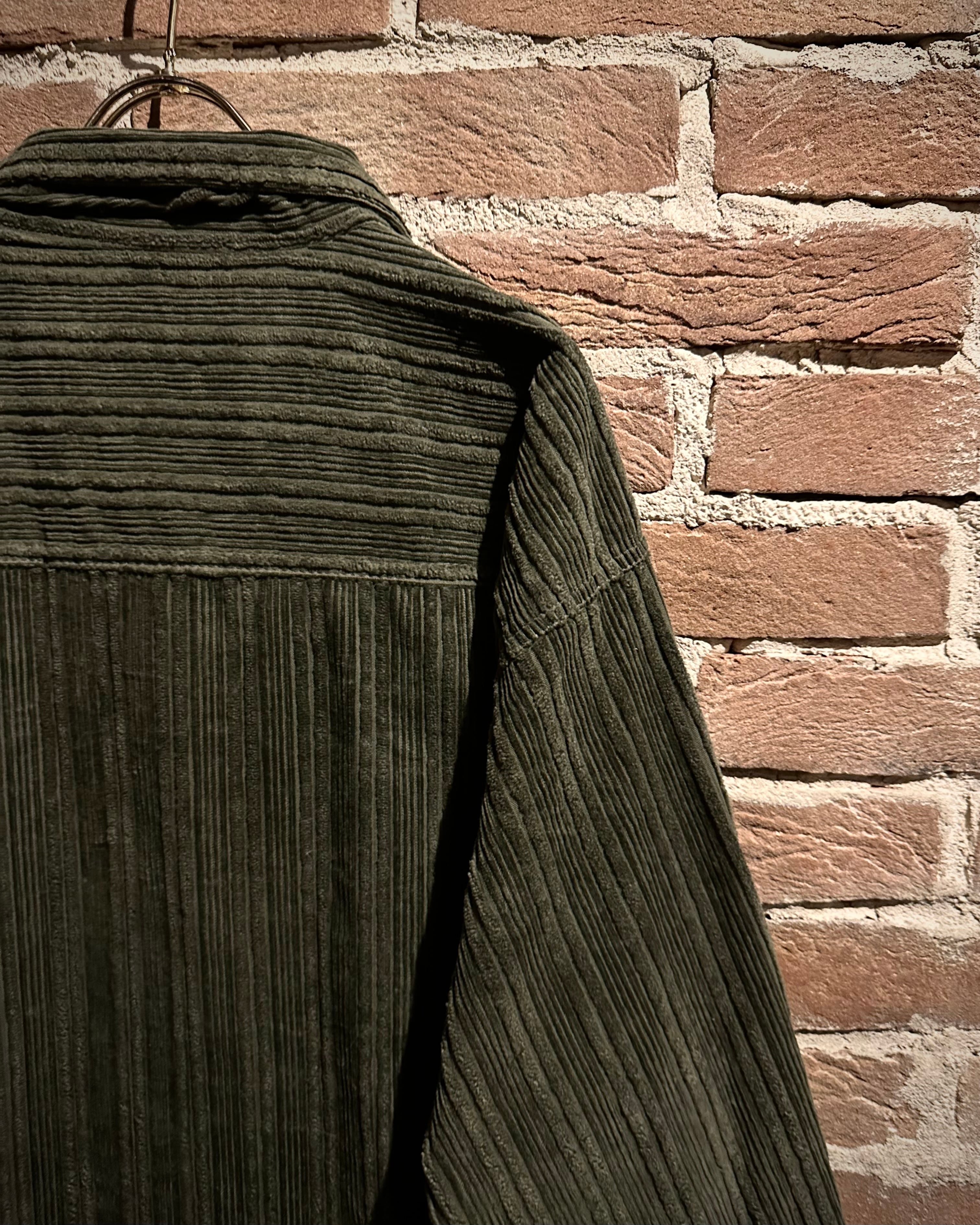 深みのあるオリーブカラーが目を惹く、ジップアップ仕様のコーデュロイシャツジャケット。