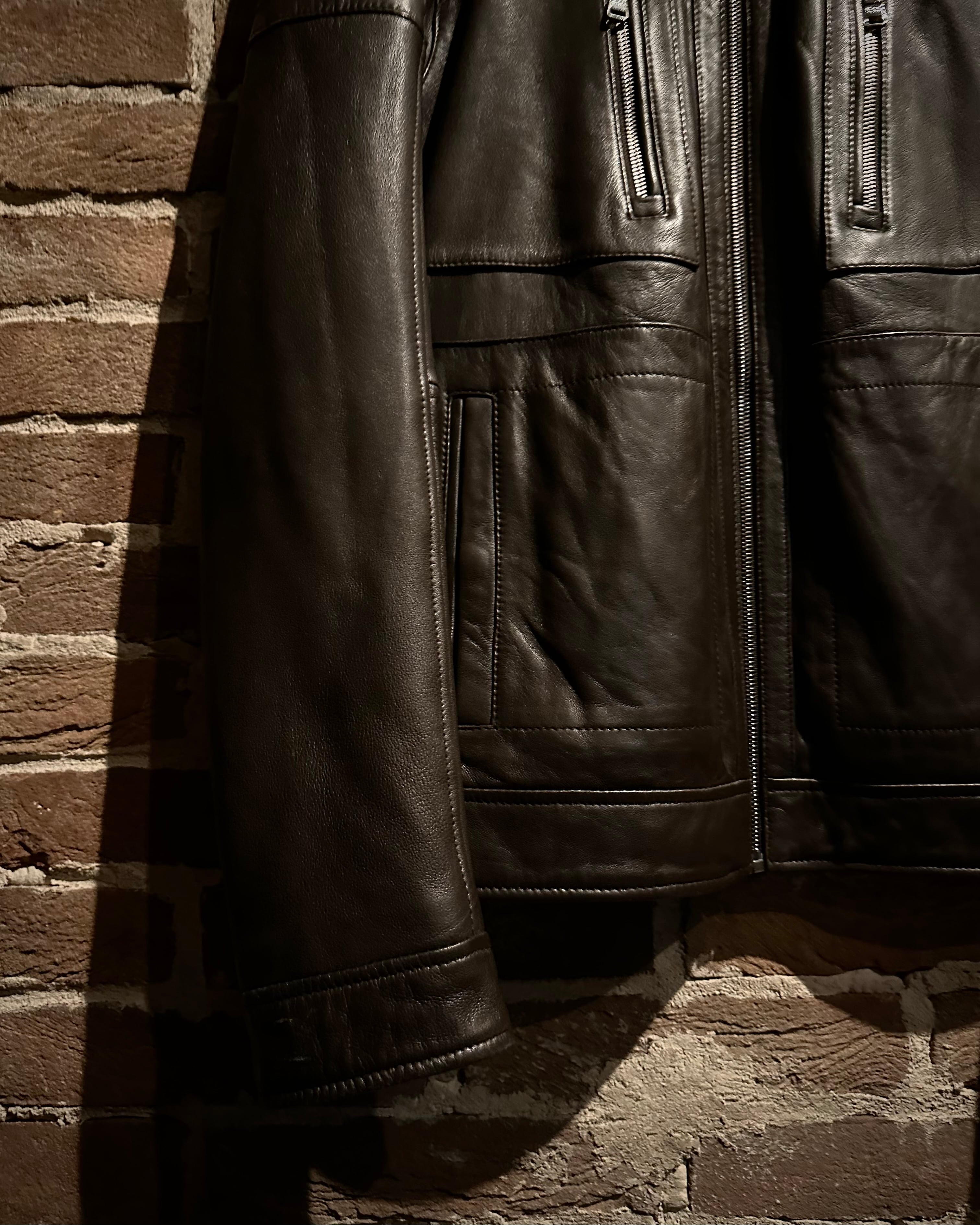 上質なラムレザーを贅沢に使用したバイカージャケット。きめ細かくしなやかな革質に鈍く上品な艶が宿り、光の当たり方で立体的な陰影を描くその表情はまさに一級品。重厚感がありながらも非常に柔らかく、身体に吸い付くような着心地を実現しています。