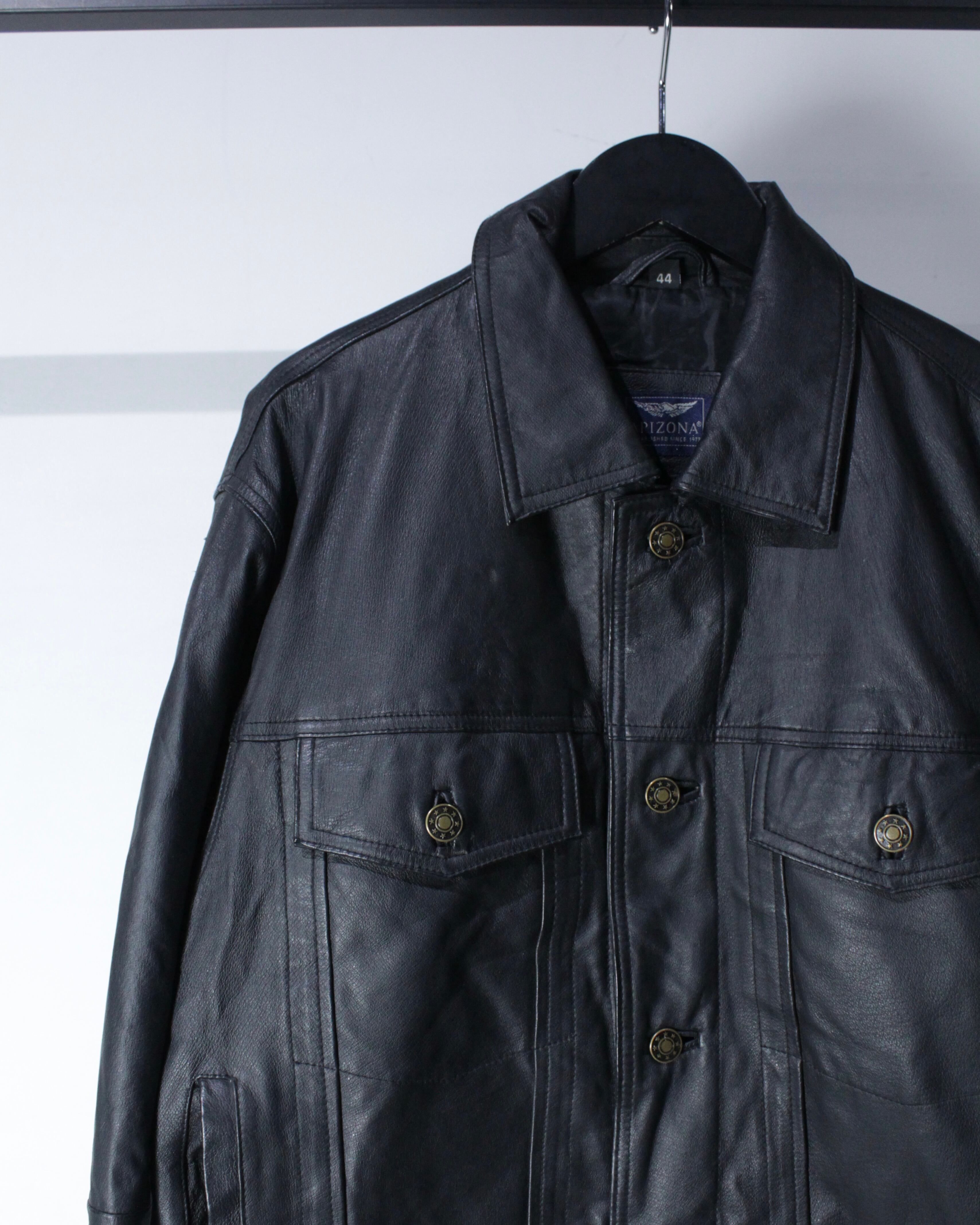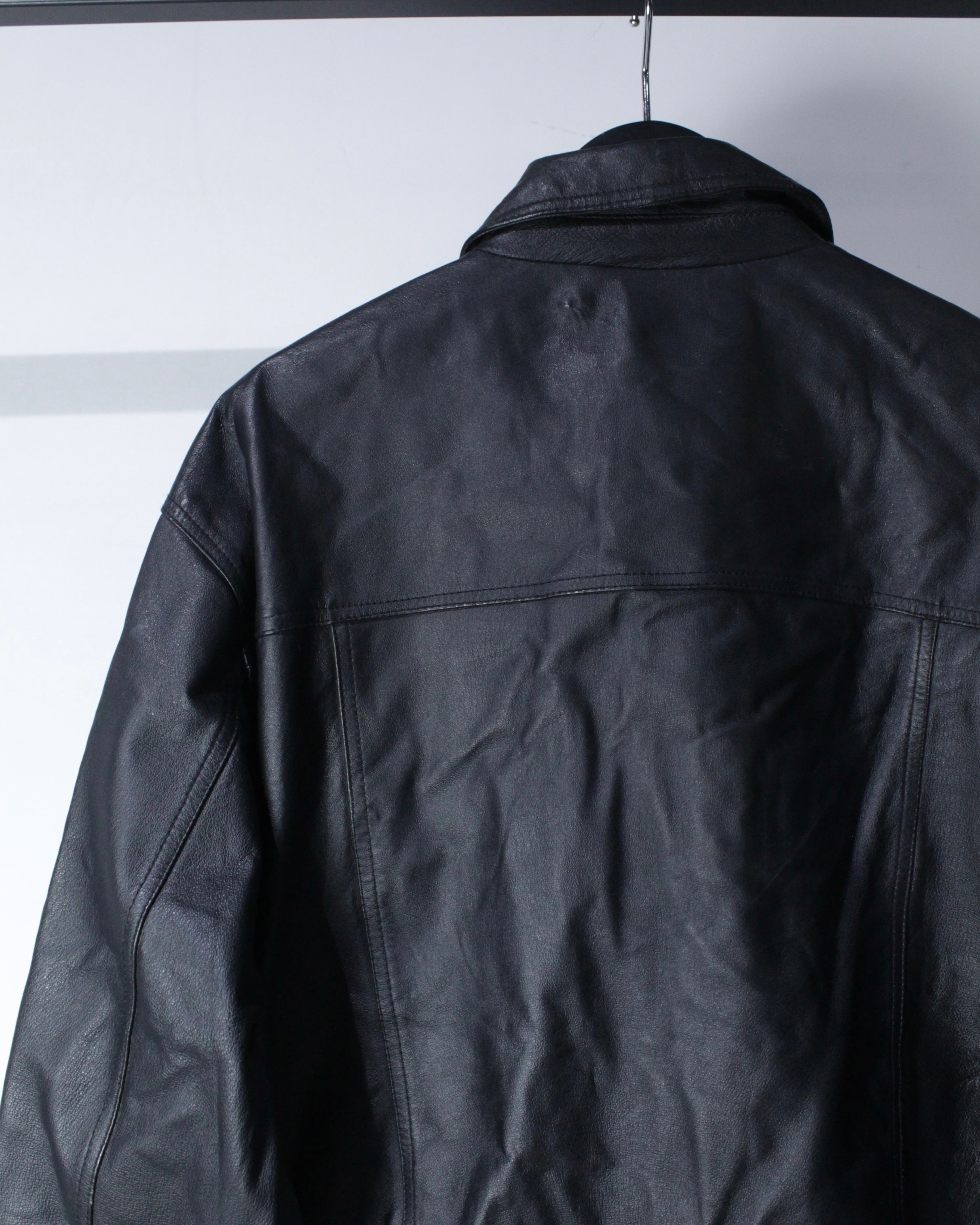 程よくハリを残しつつも、袖を通せばすっと身体に馴染む柔らかなレザー。ブラックの奥行きある艶感が光の当たり方で陰影を生み、無骨さの中にどこか上品さを漂わせます。