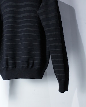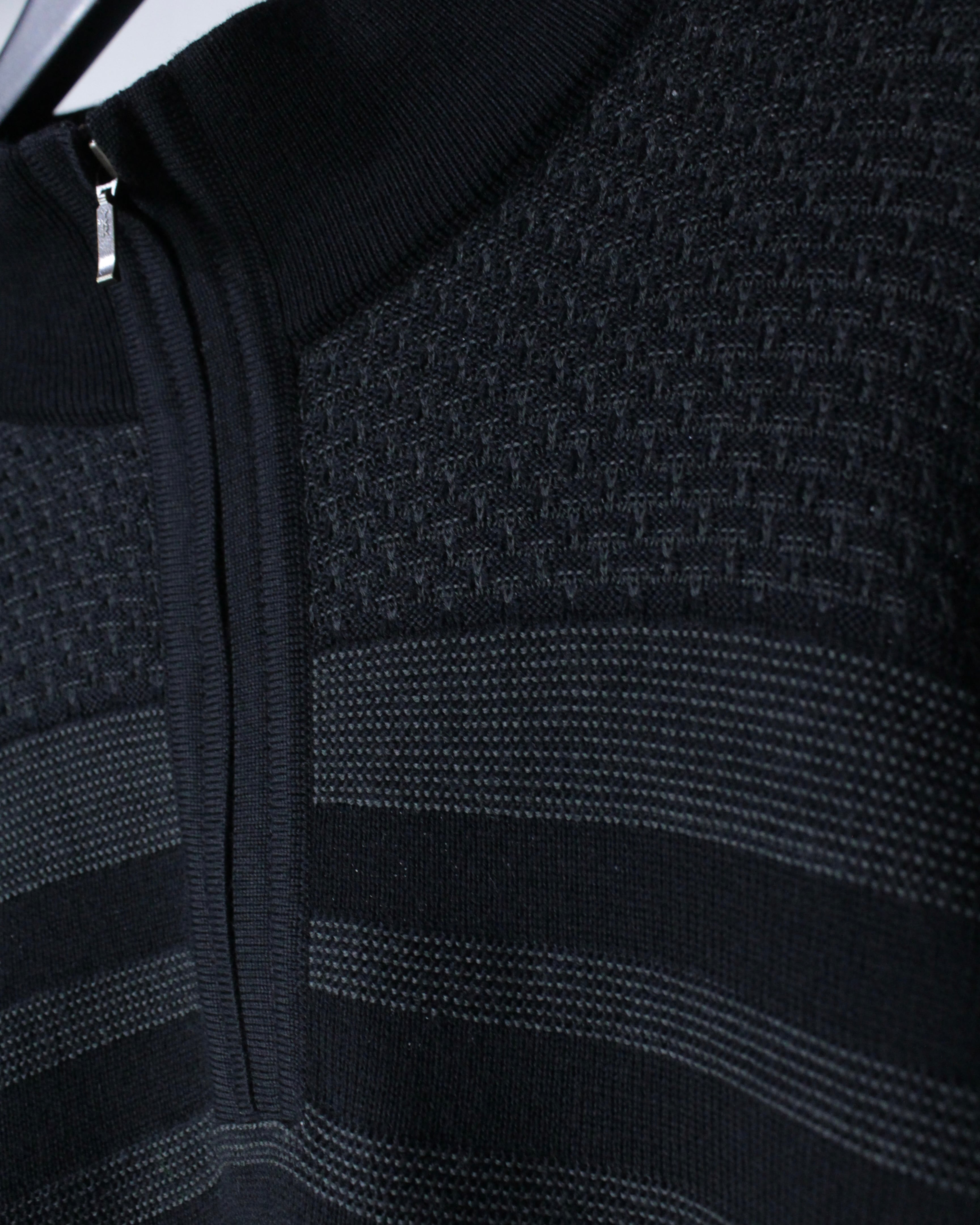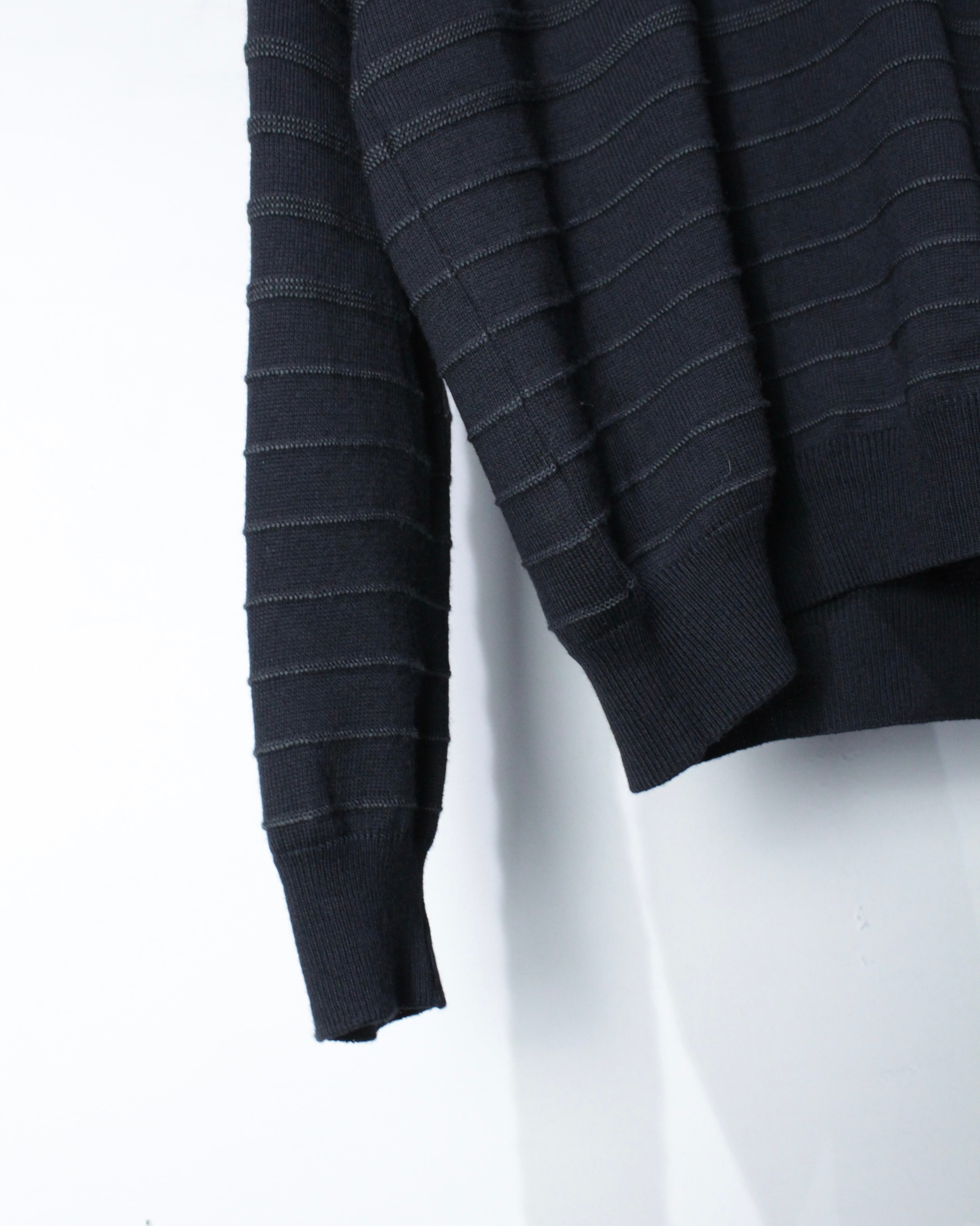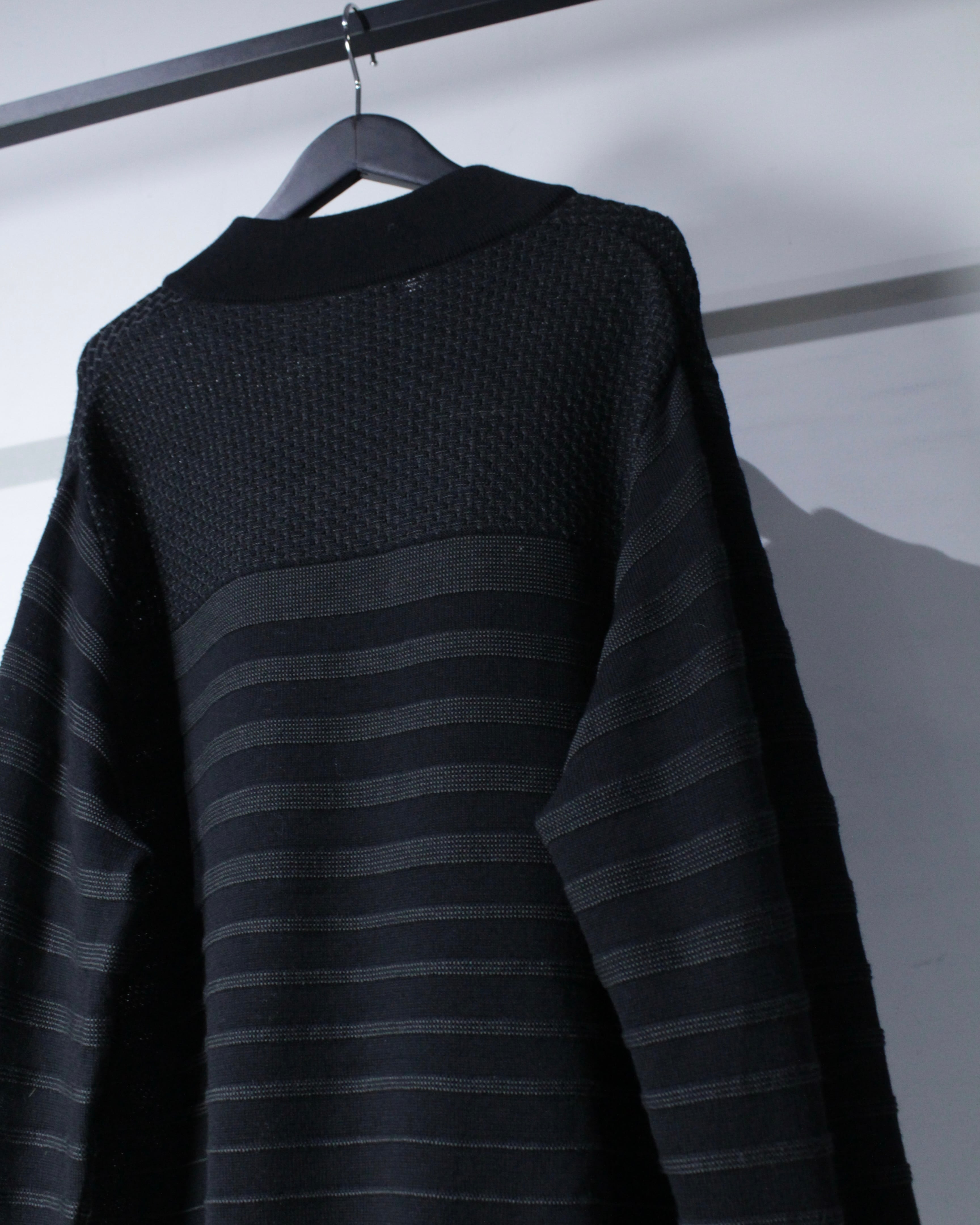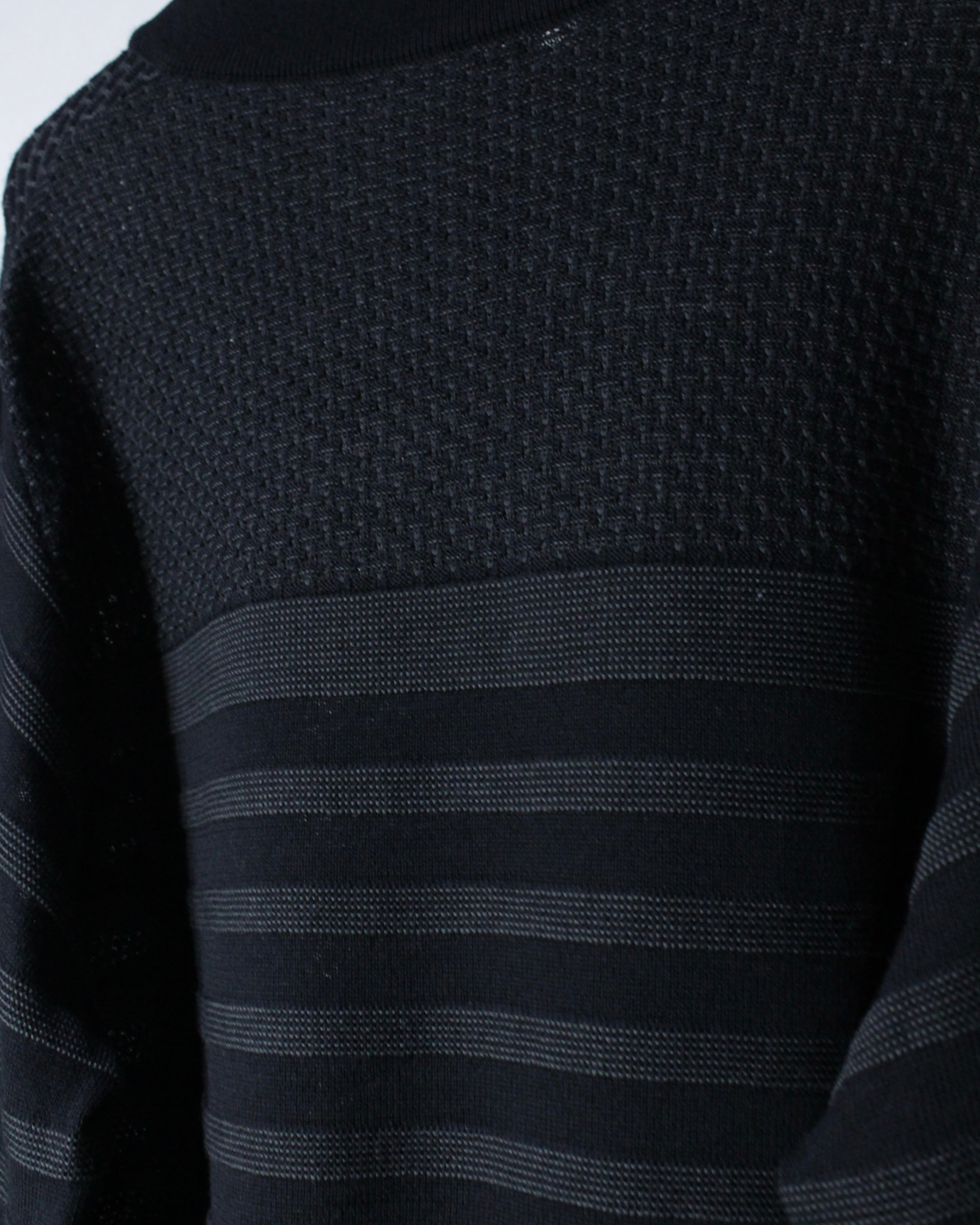 黒×グレーのカラーリングをベースに身頃、アームにボーダーを走らせ、肩周りに編みによって立体的なデザインを施した1着。
