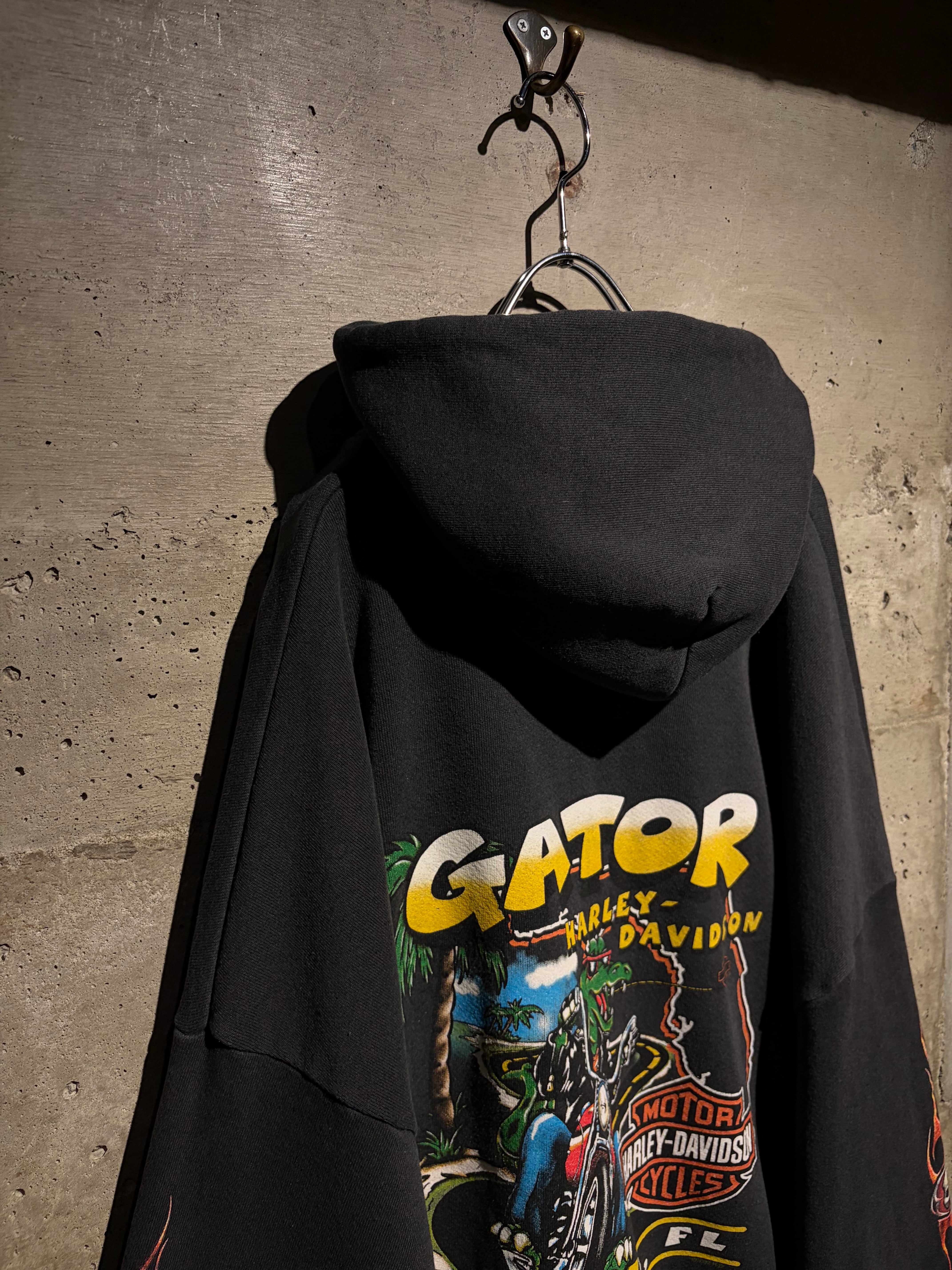 フェード感のあるブラックボディをベースに、胸元、アームにはフレイム×スカルのプリント。背面には「GATOR HARLEY-DAVIDSON / LEESBURG, FL」のグラフィックを大判で配置。