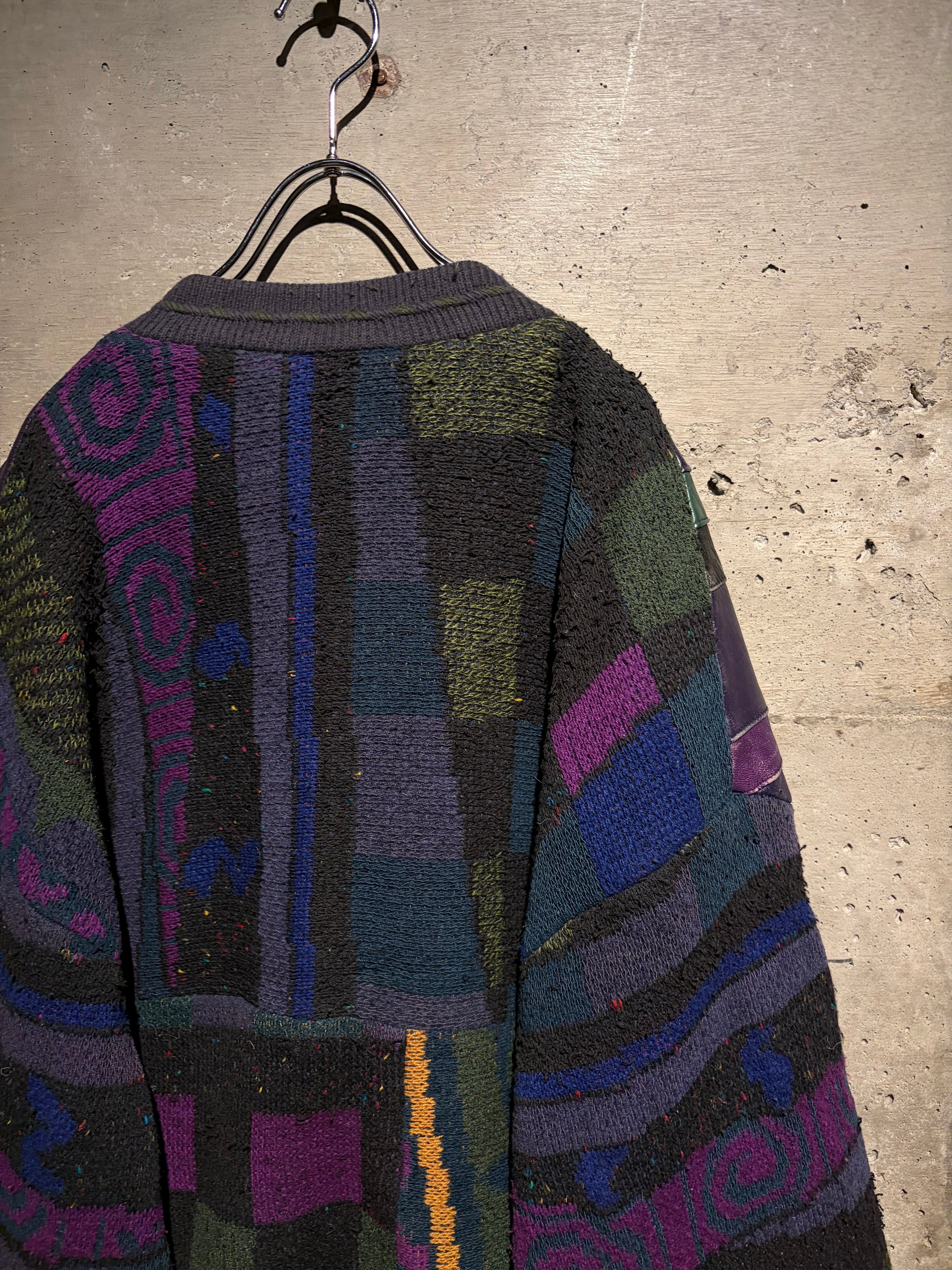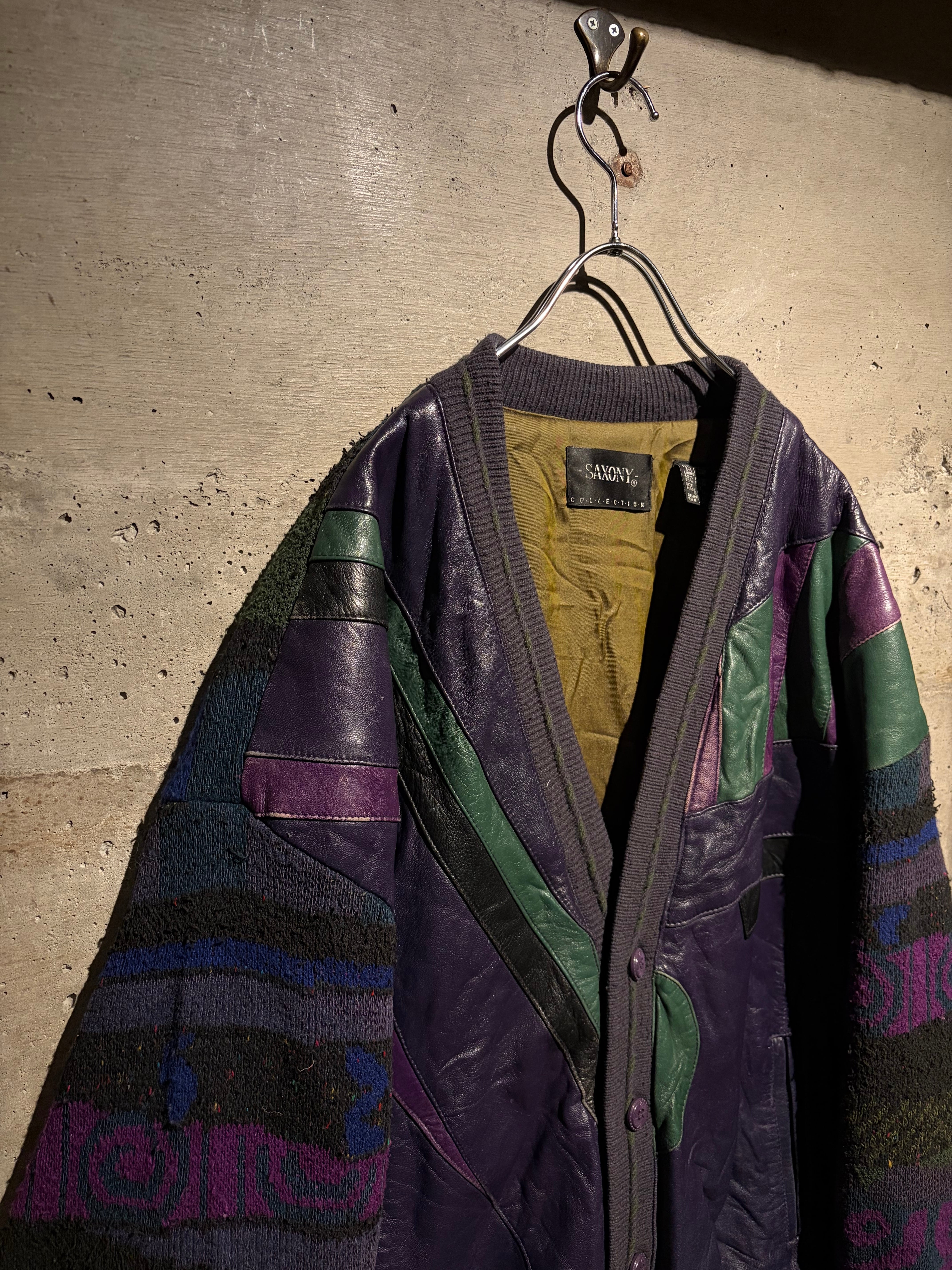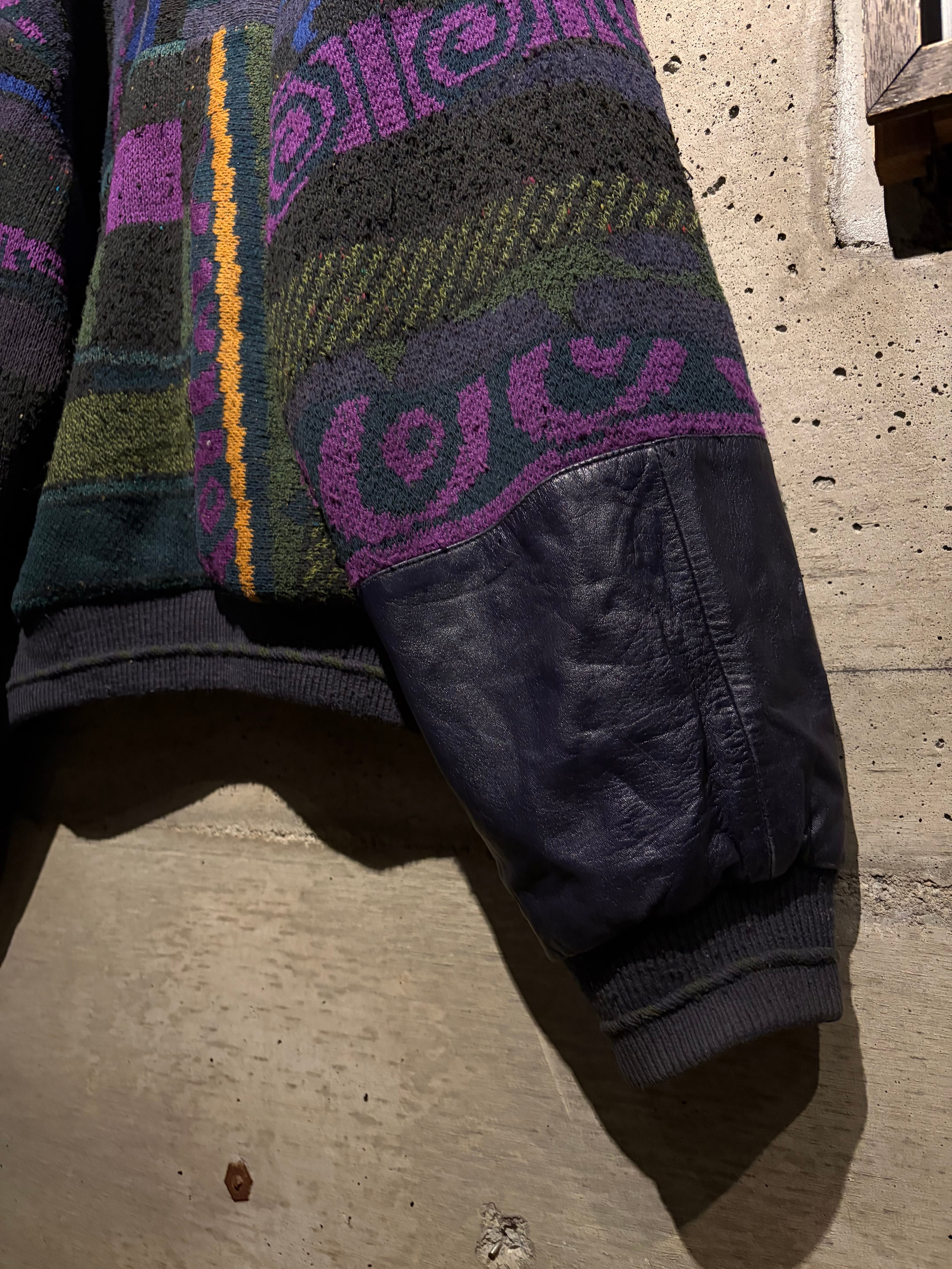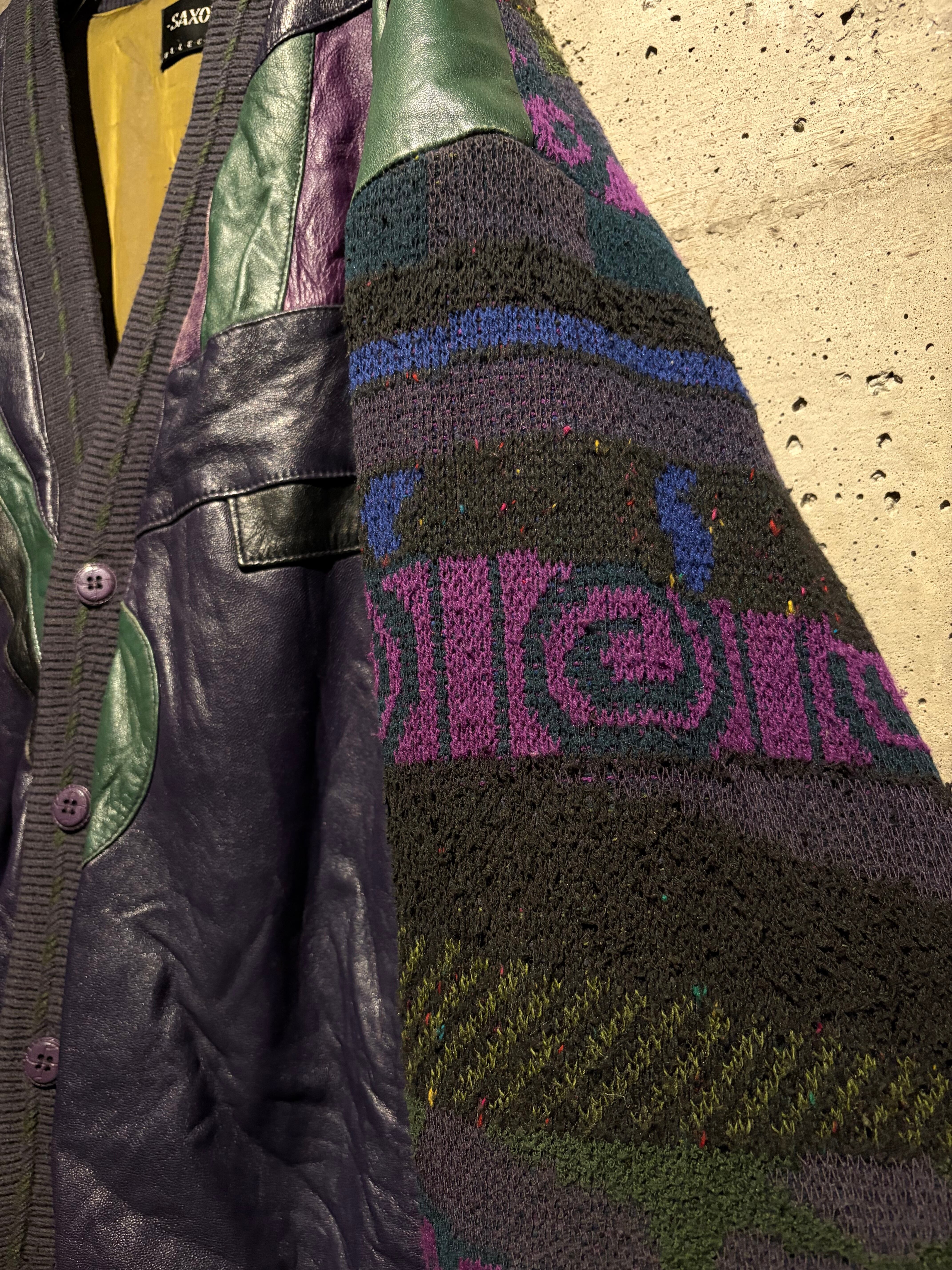 様々なモチーフをランダムに組み合わせた、マルチカラーのニットボディを軸に、フロントやアームへ鈍い光沢を帯びたモッチリとした極上レザーをアシンメトリーに切り替えた、アーティスティックな存在感を見せる1着。