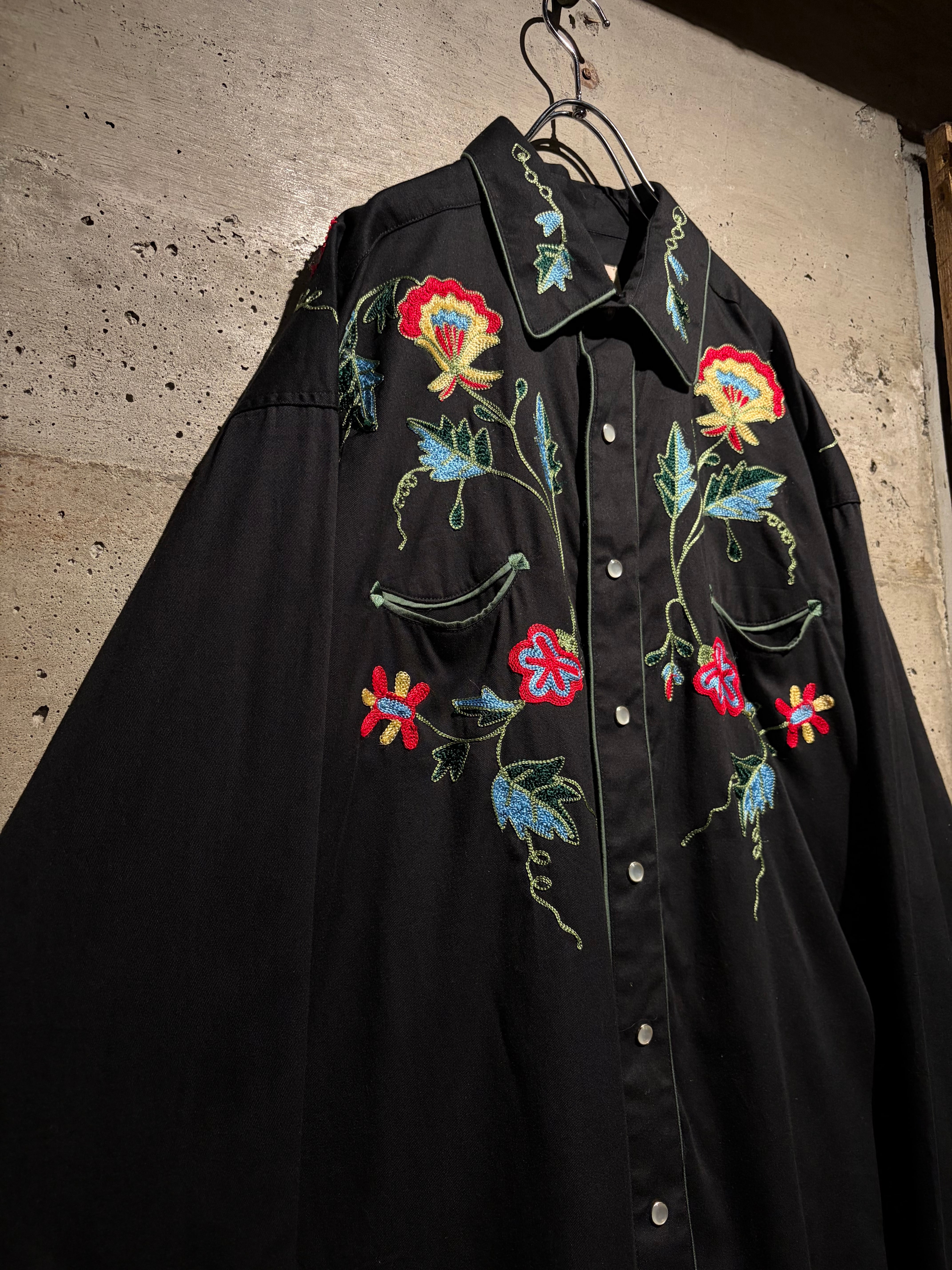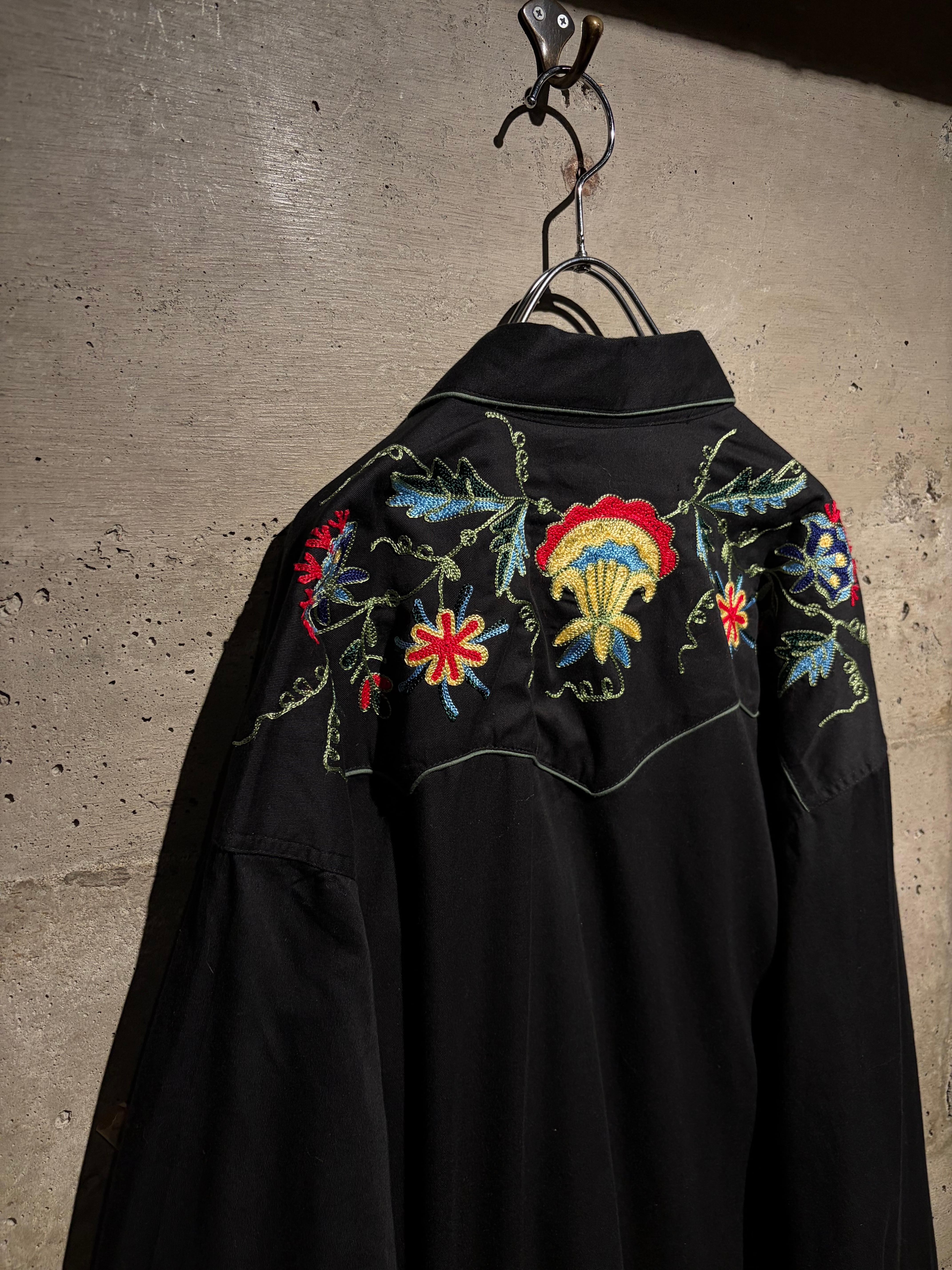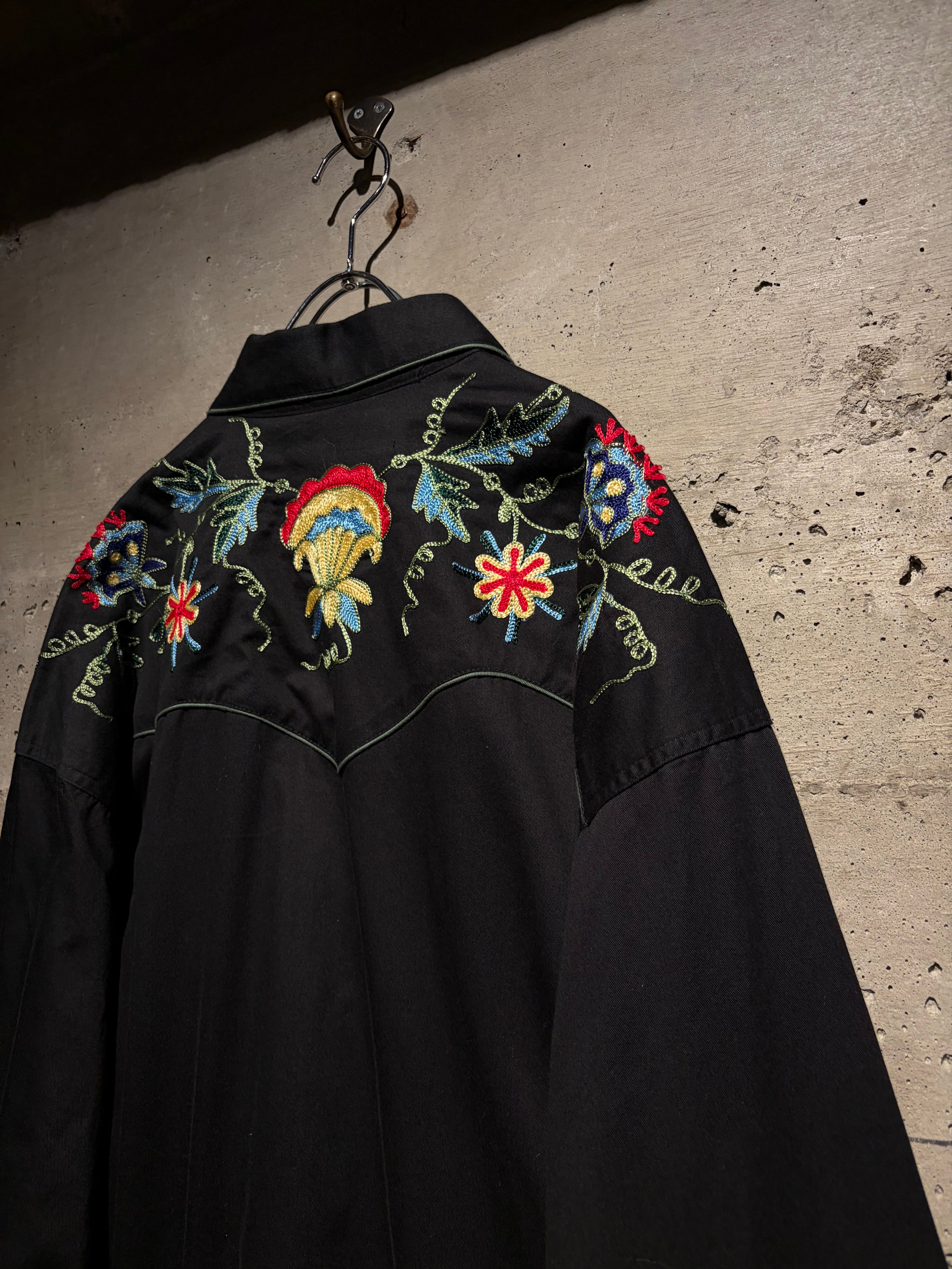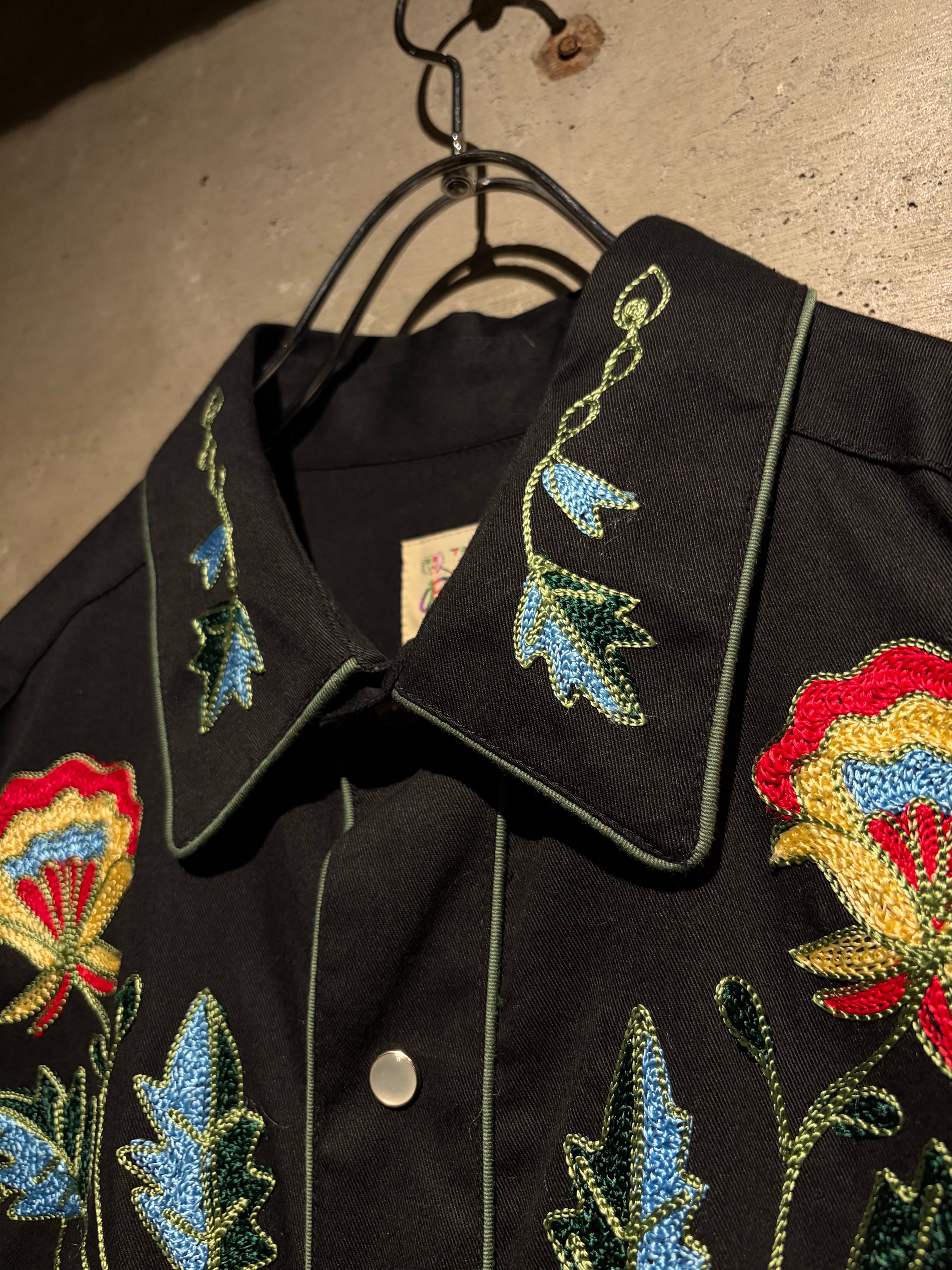 滑らかなブラックボディをベースに、前後のヨーク、襟、カフスに花の刺繍をON。レッド、イエロー、ブルー、グリーンと多色使いの立体的な刺繍が、無地のボディに鮮烈なコントラストを与えています。