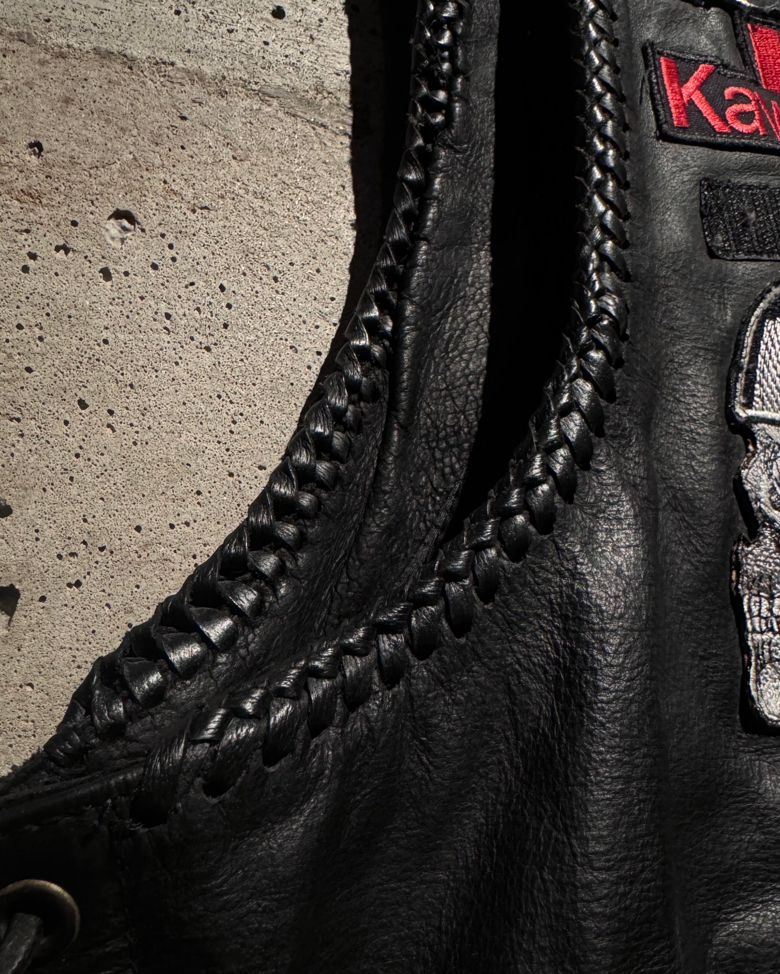 胸元には“Hardcore”のアイアンクロス、“GUIDO”、そして“Kawasaki”のレタードワッペン。さらにヘルメットを被ったスカルが配され、バイカーカルチャーを色濃く反映。反対側には“AC/DC”のワッペンも入り、ハードロックとモーターサイクルカルチャーが交差するストーリー性をしっかりと感じられます。