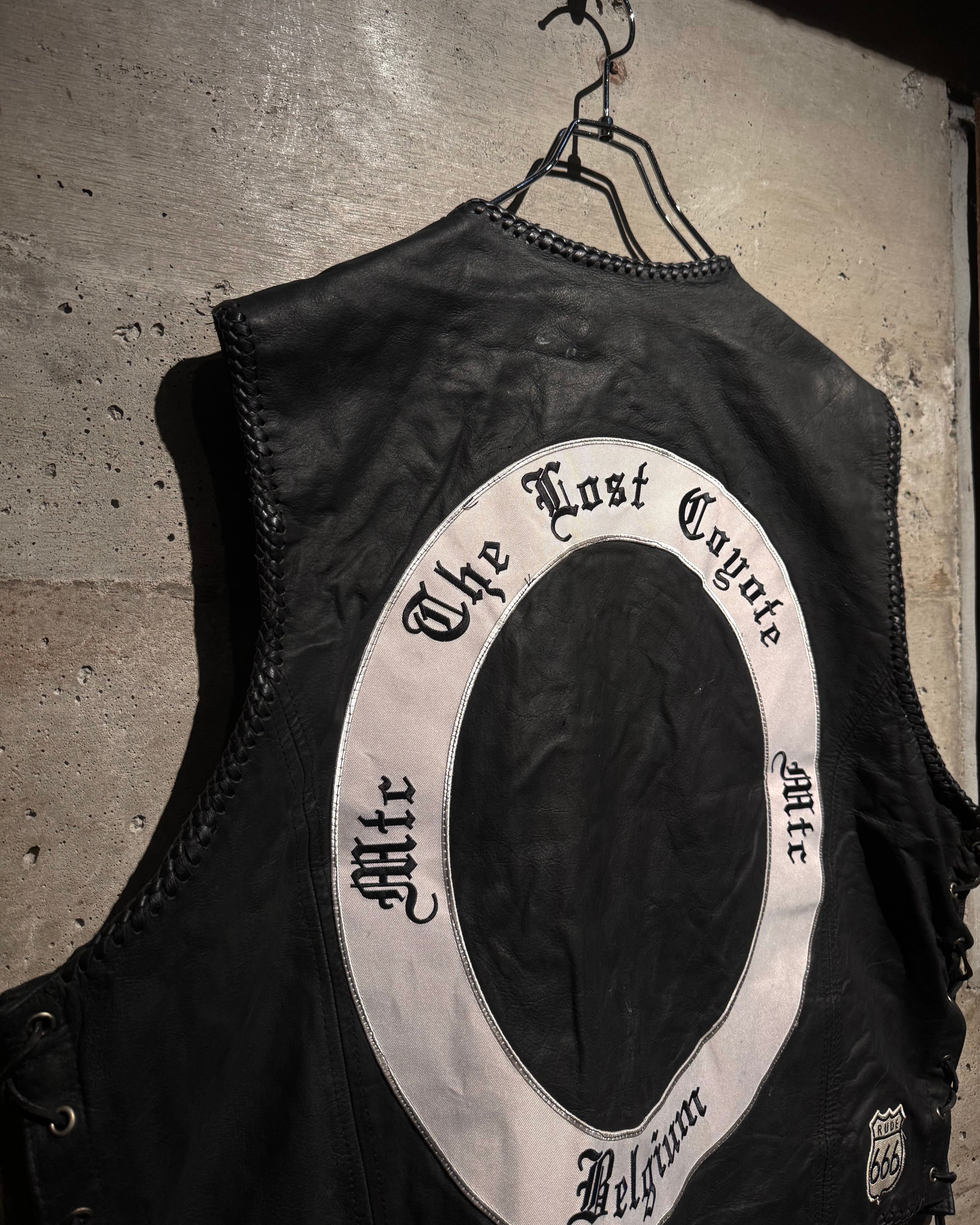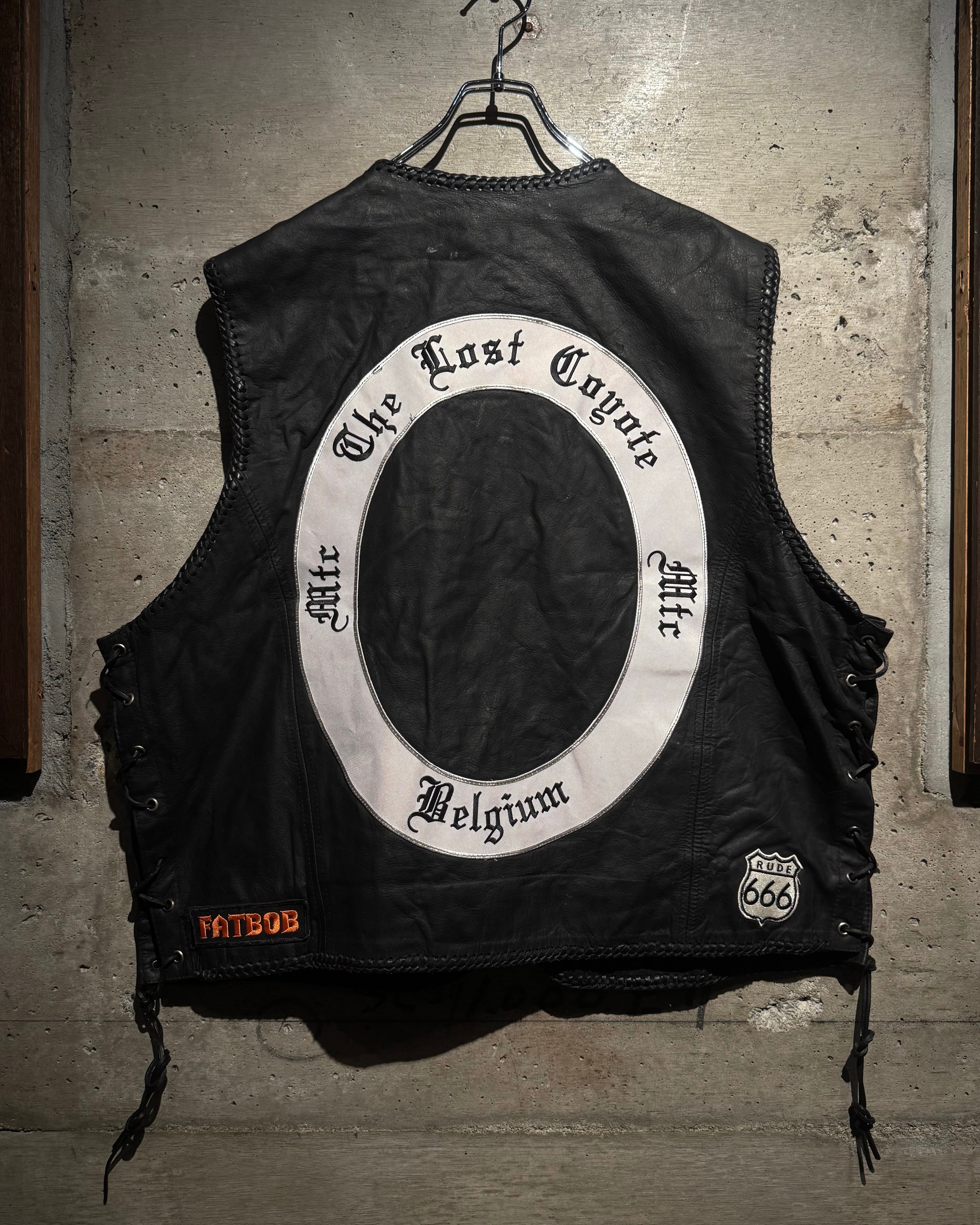 バックには大判の“THE LOST COUTE MC BELGIUM”のサークルパッチ。裾には“FATBOB”、そして“RUDE 666”のシールドワッペンと、前後左右どこから見ても抜かりのないカスタムバランスで、まさに一点物と呼ぶに相応しい仕上がり。