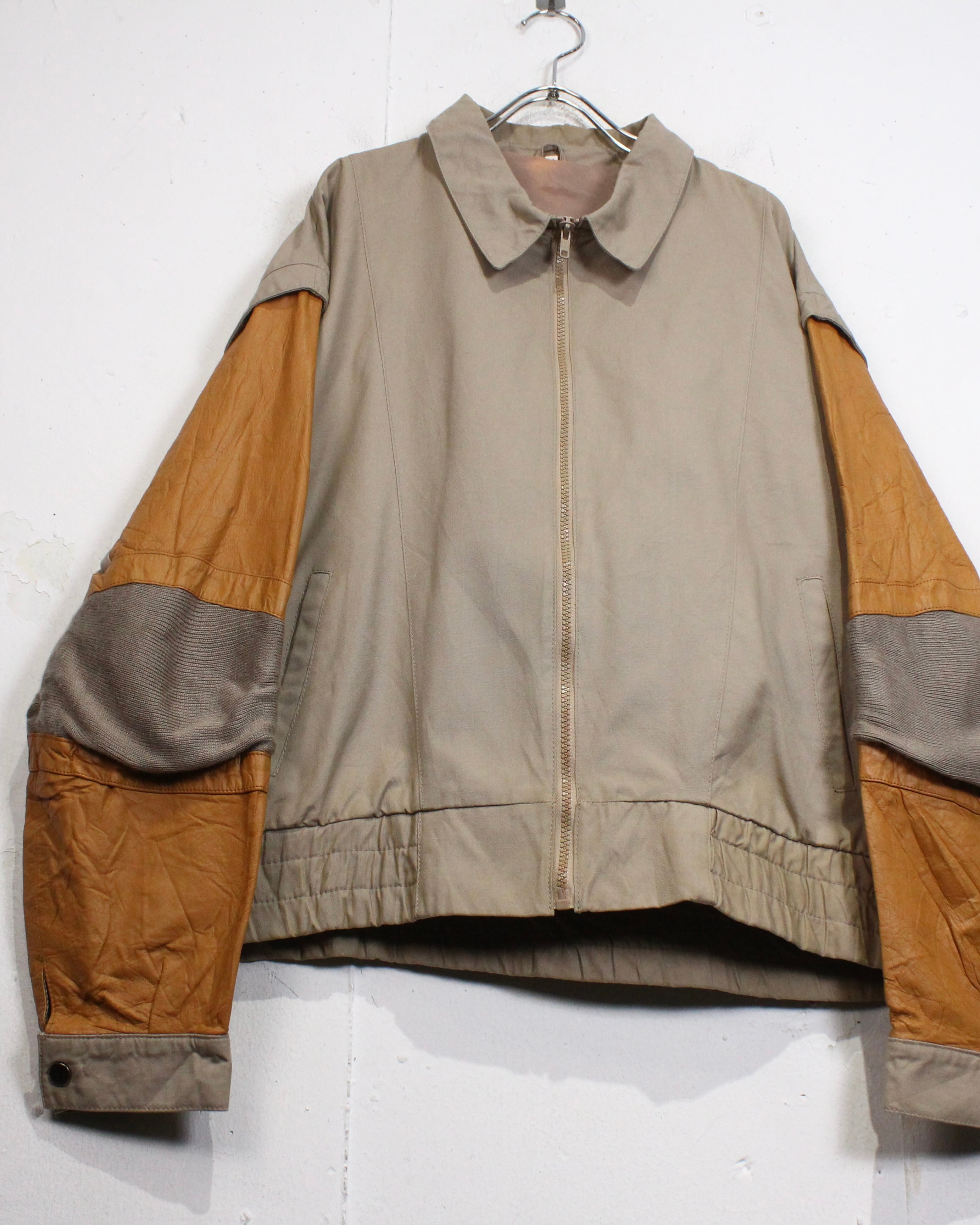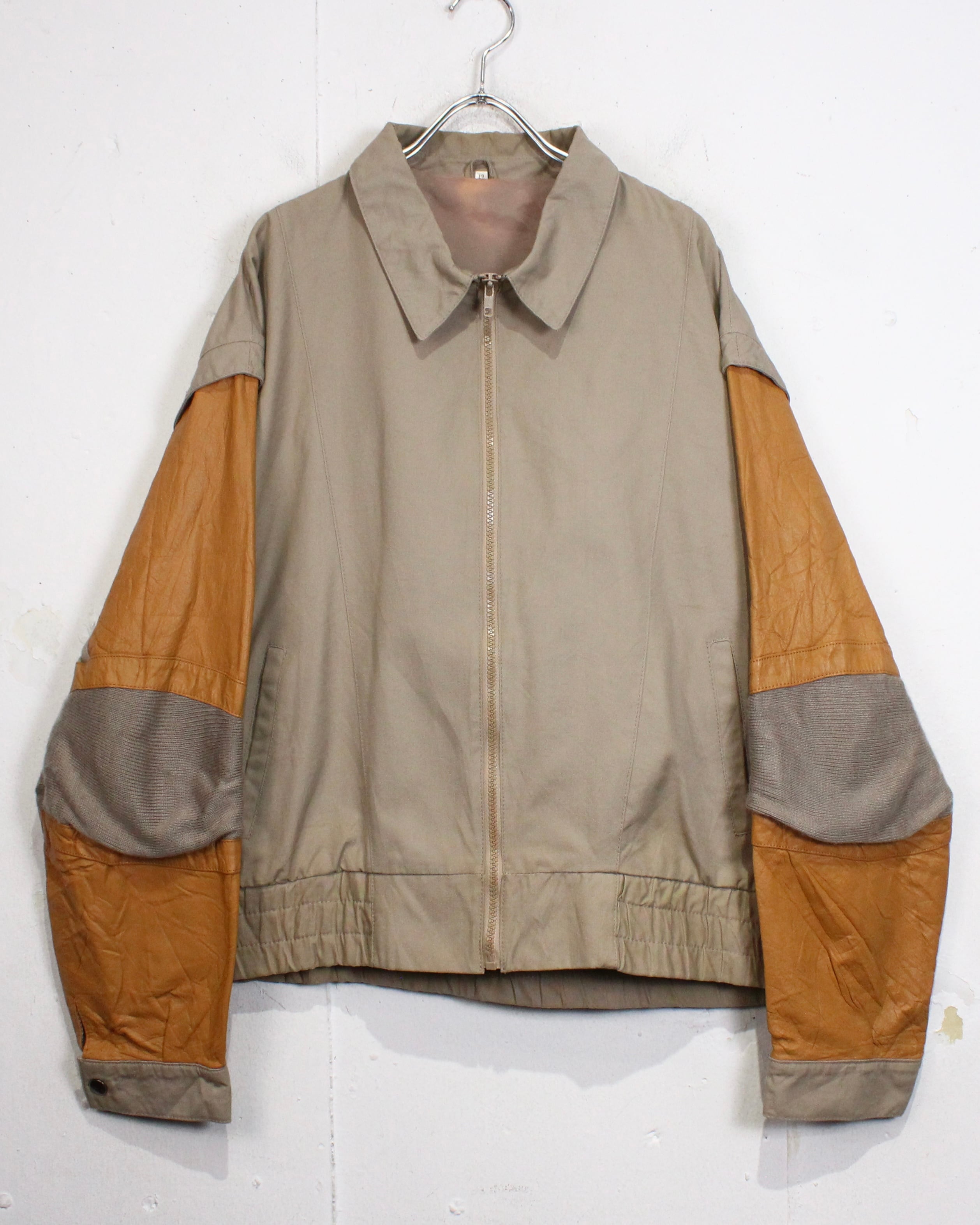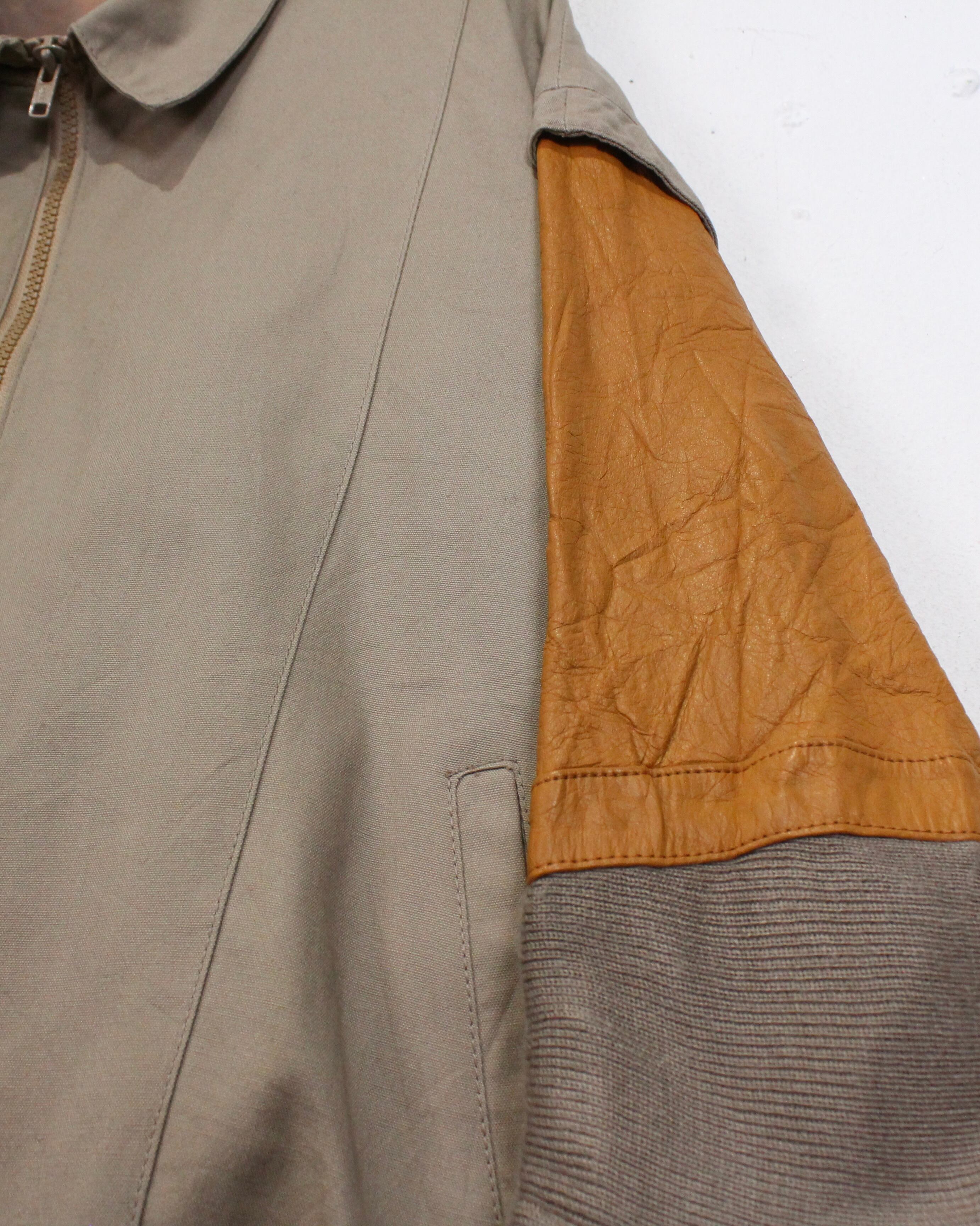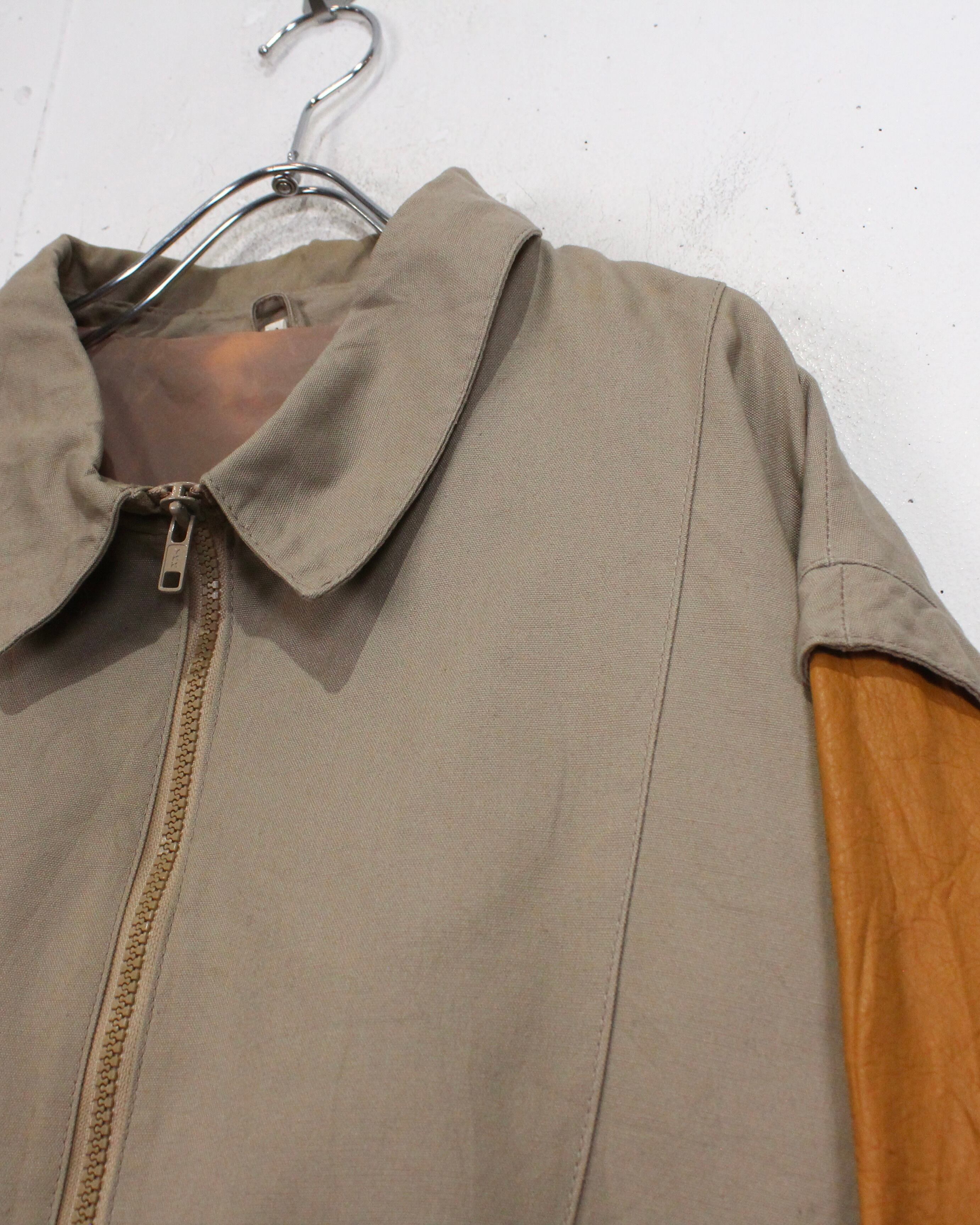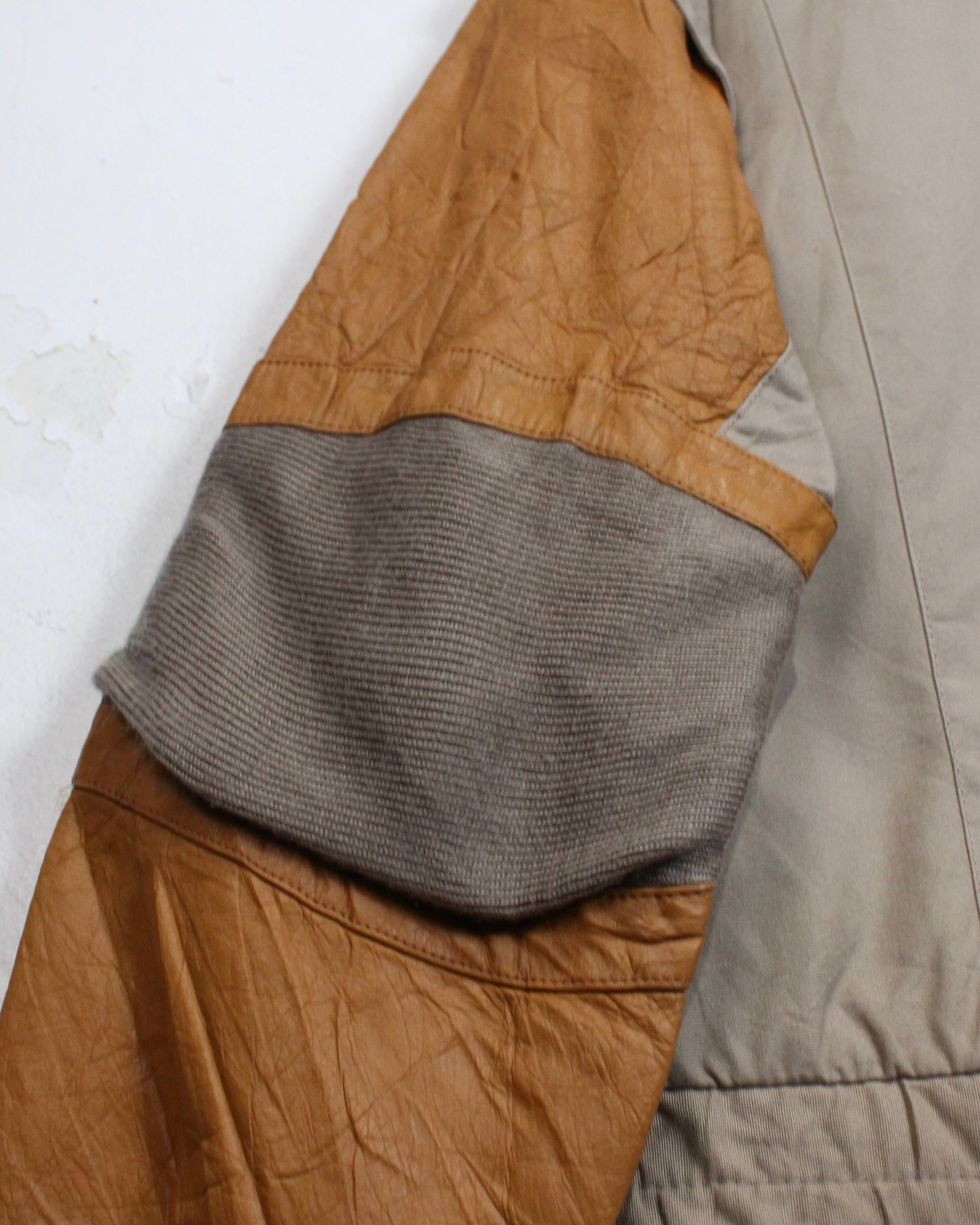 タフでドライな質感を持つコットンキャンバスのボディをベースに、アーム部分にはしなやかなレザーを大胆に切り替え。ベージュのキャンバスとキャメルブラウンのレザーが織りなすコントラストが奥行きを生み、素材そのものの表情を楽しめる1着に仕上がっています。