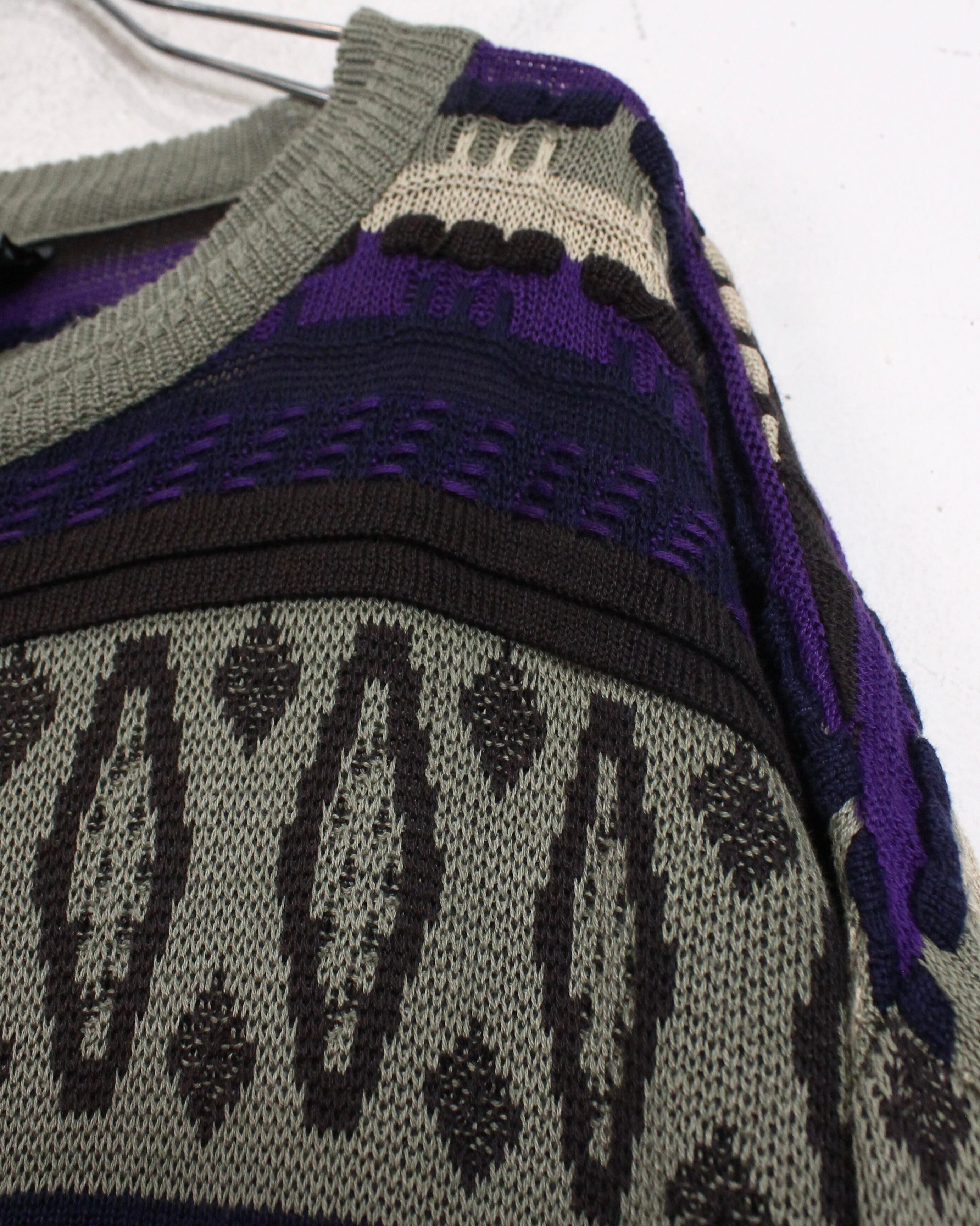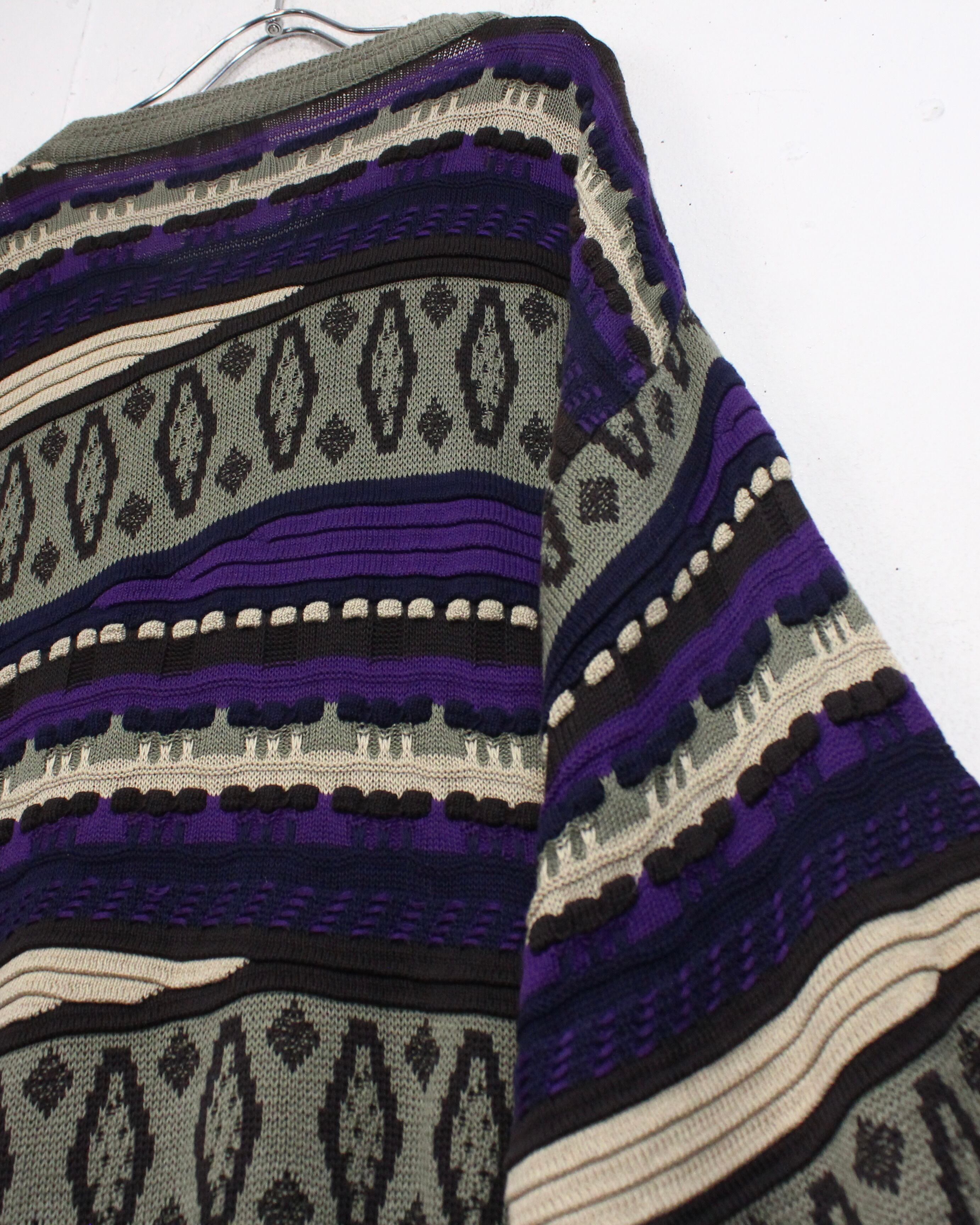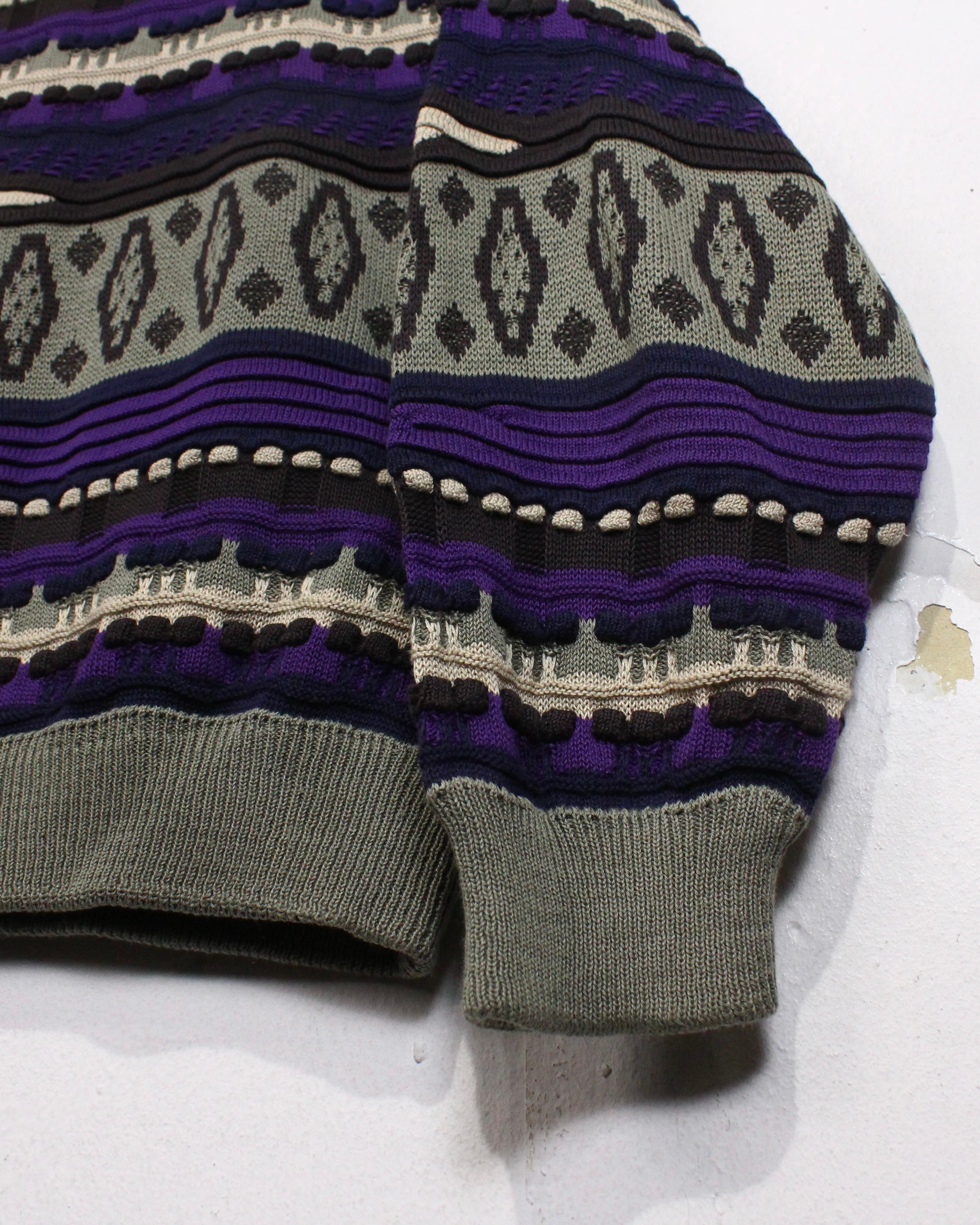 切り替えの中に、凹凸のある立体編みや幾何学モチーフを組み込み、クオリティの高さを感じられます。