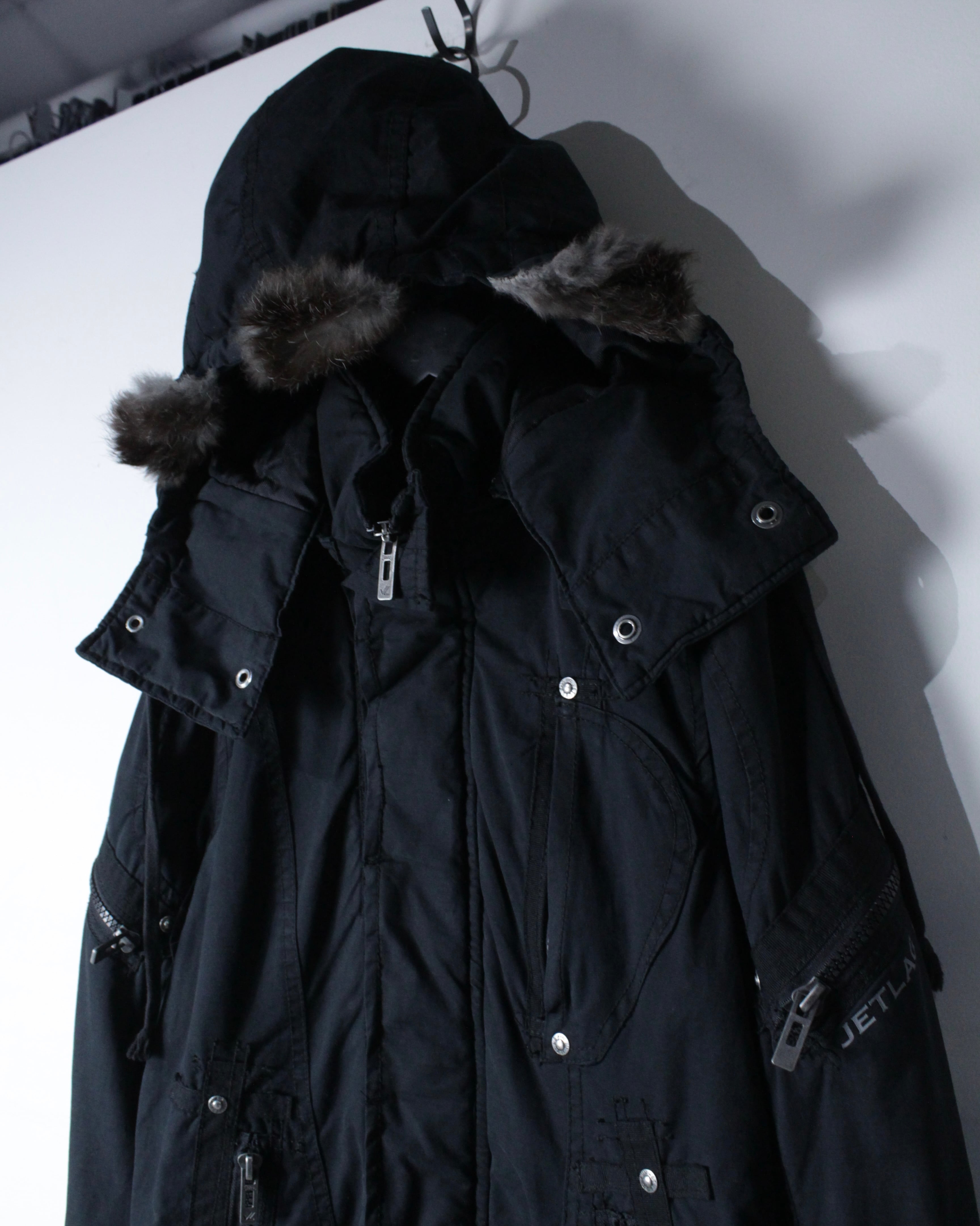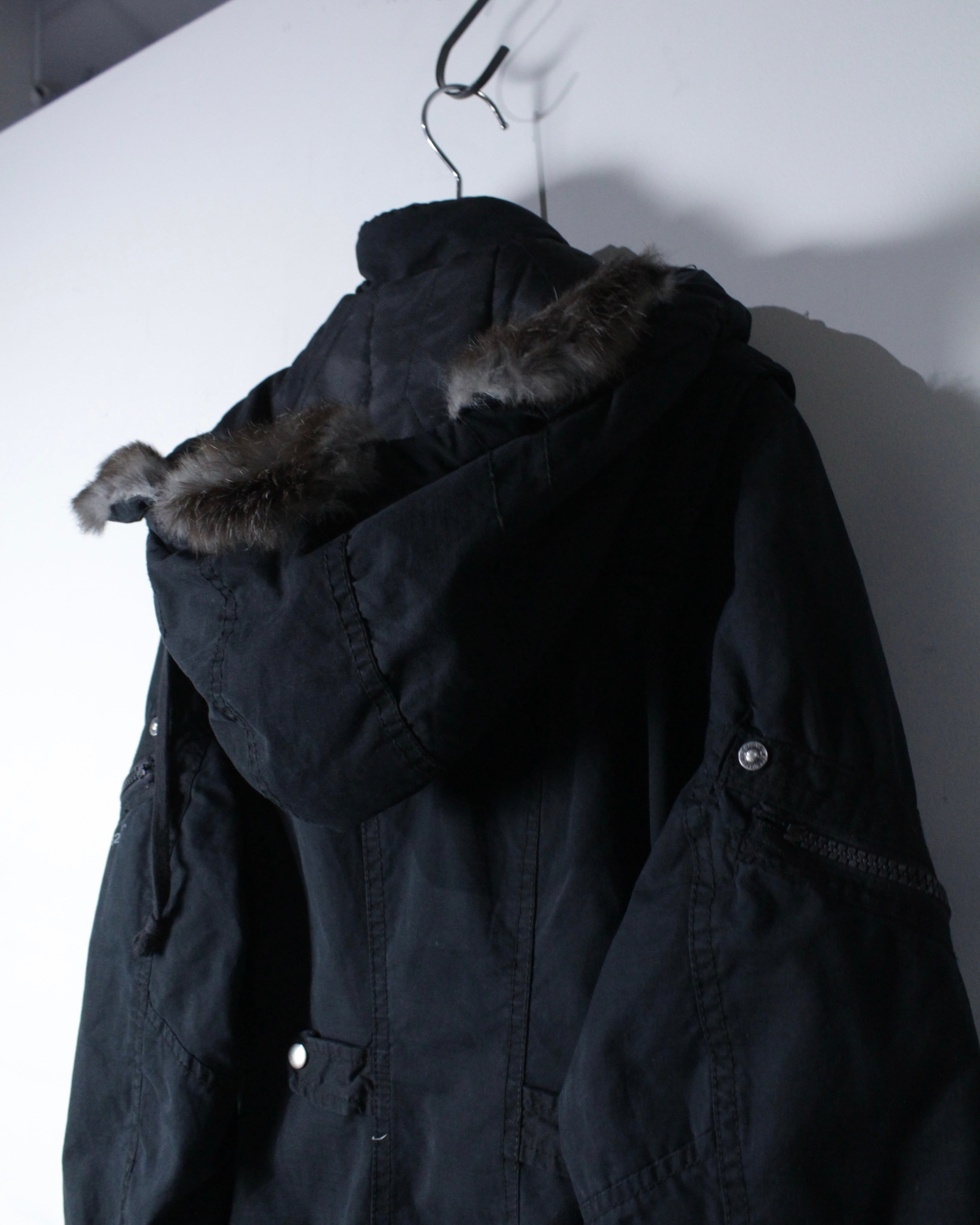 フードにはリアルラビットファーをあしらい、着脱可能という実用性と、ラグジュアリーなエッセンスをプラスしたバランス感も◎