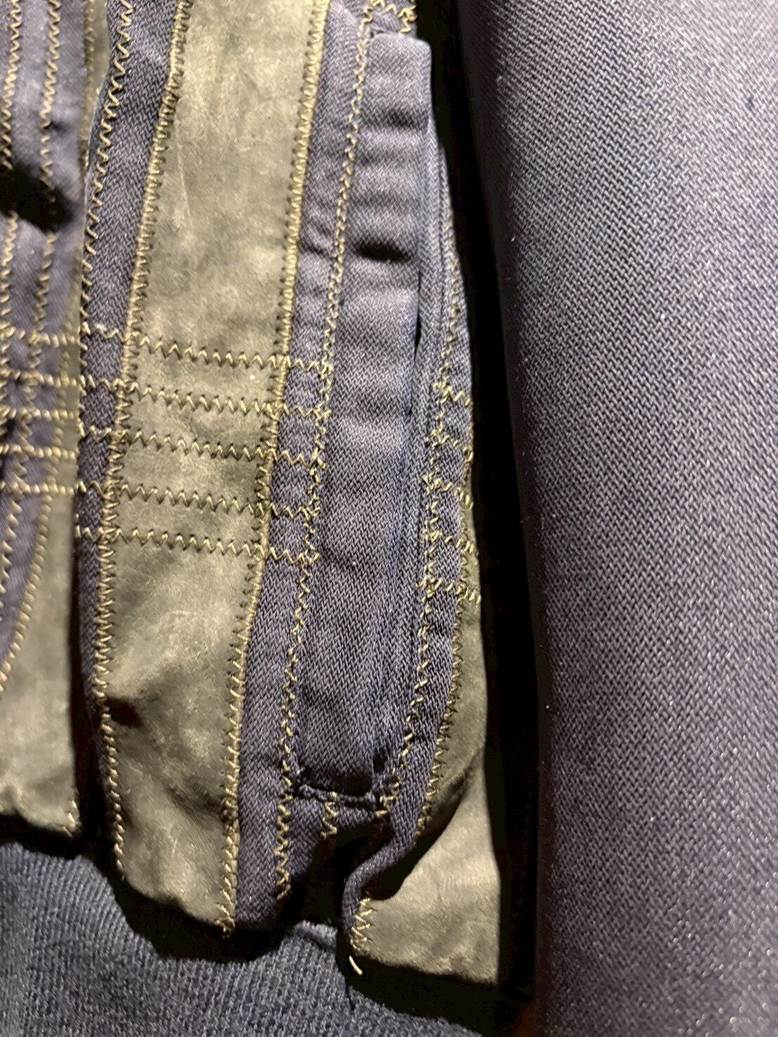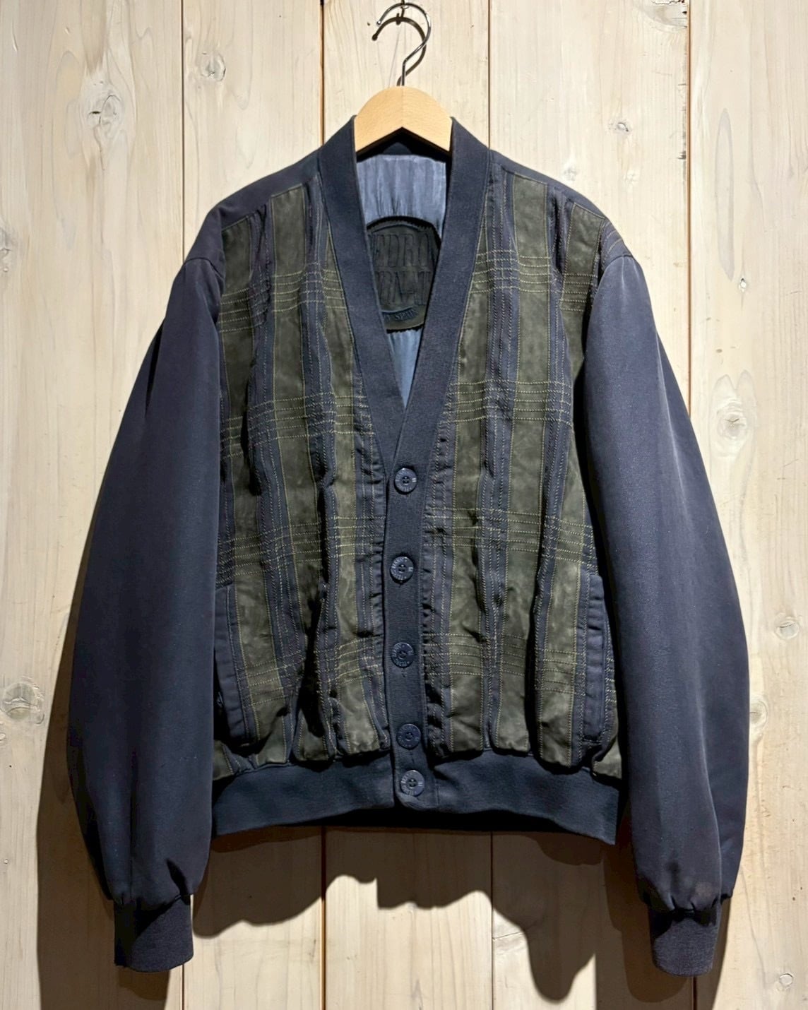 手触りの滑らかなファブリックに、フロントのみスエードレザーをストライプ状に切り替えた、スペイン製のカーディガンジャケット。
