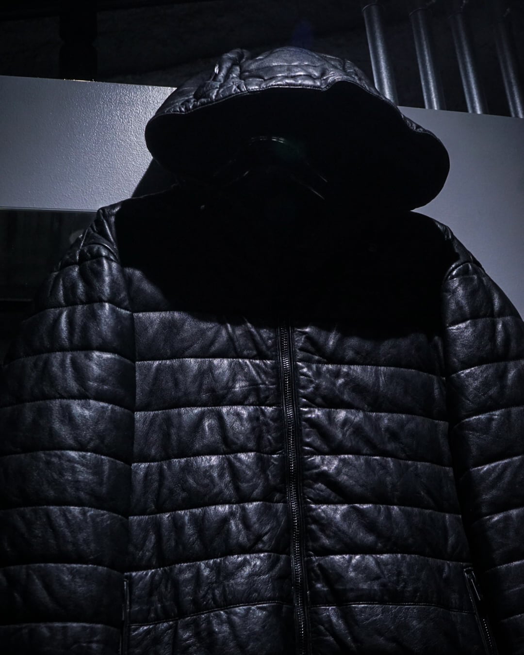 フロントはジップアップ仕様、両サイドにはジップポケットを配置。フード付きでストリートなムードを漂わせつつ、レザー特有の無骨さも感じられるデザインバランスが光ります。