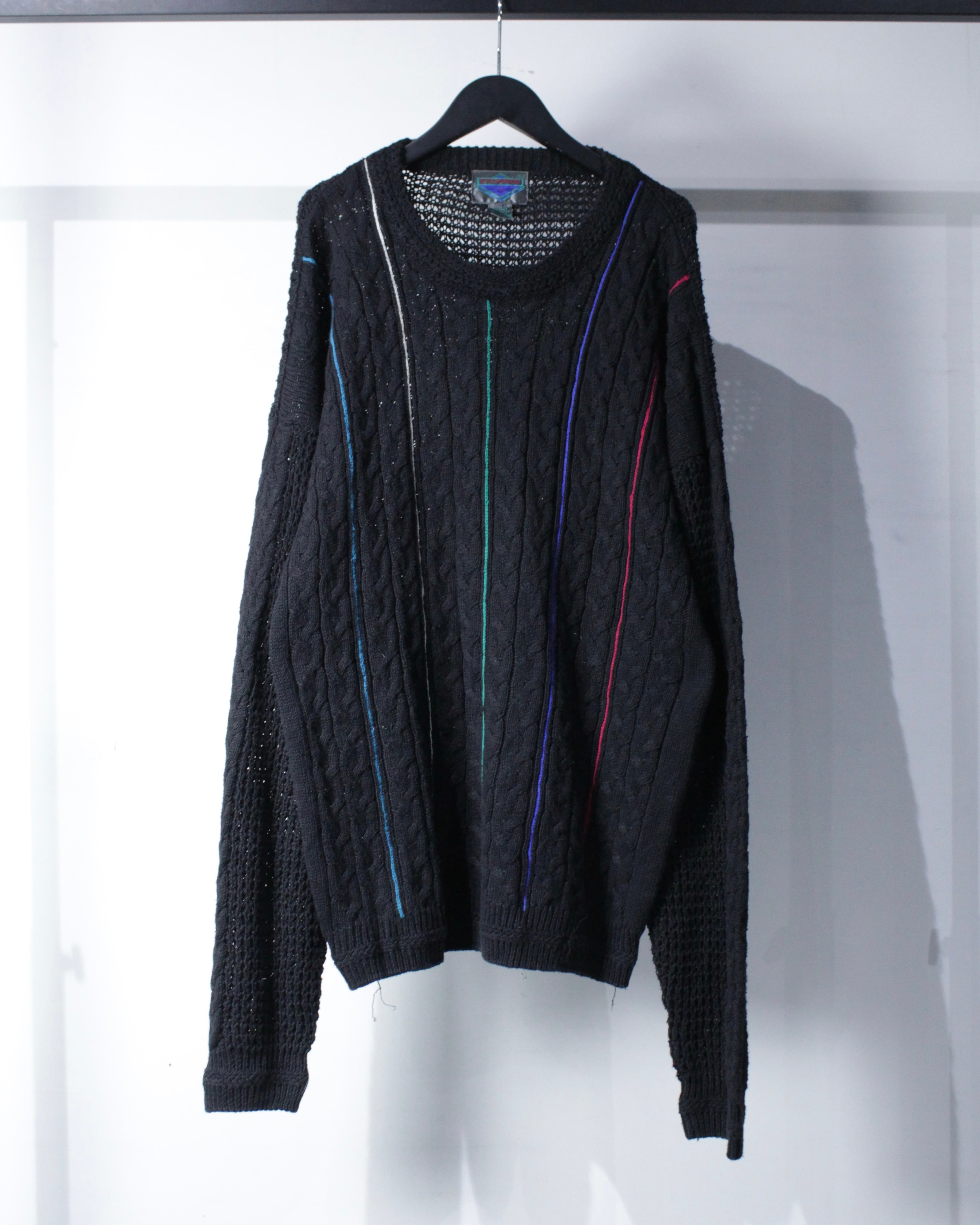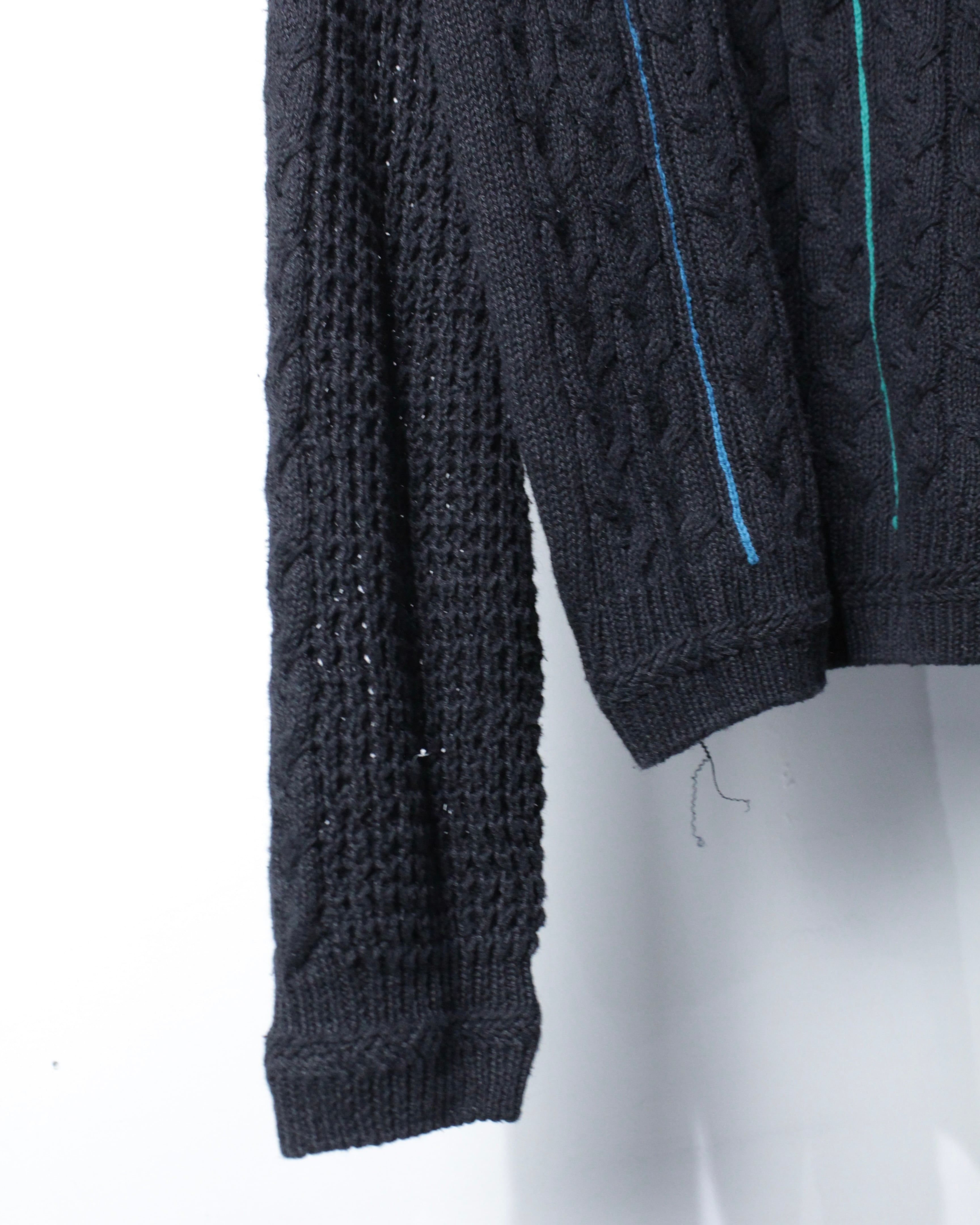 フロントの立体的なケーブル編みを基調に、ブルー、グリーン、パープル、レッドなどのラインを走らせたニット。