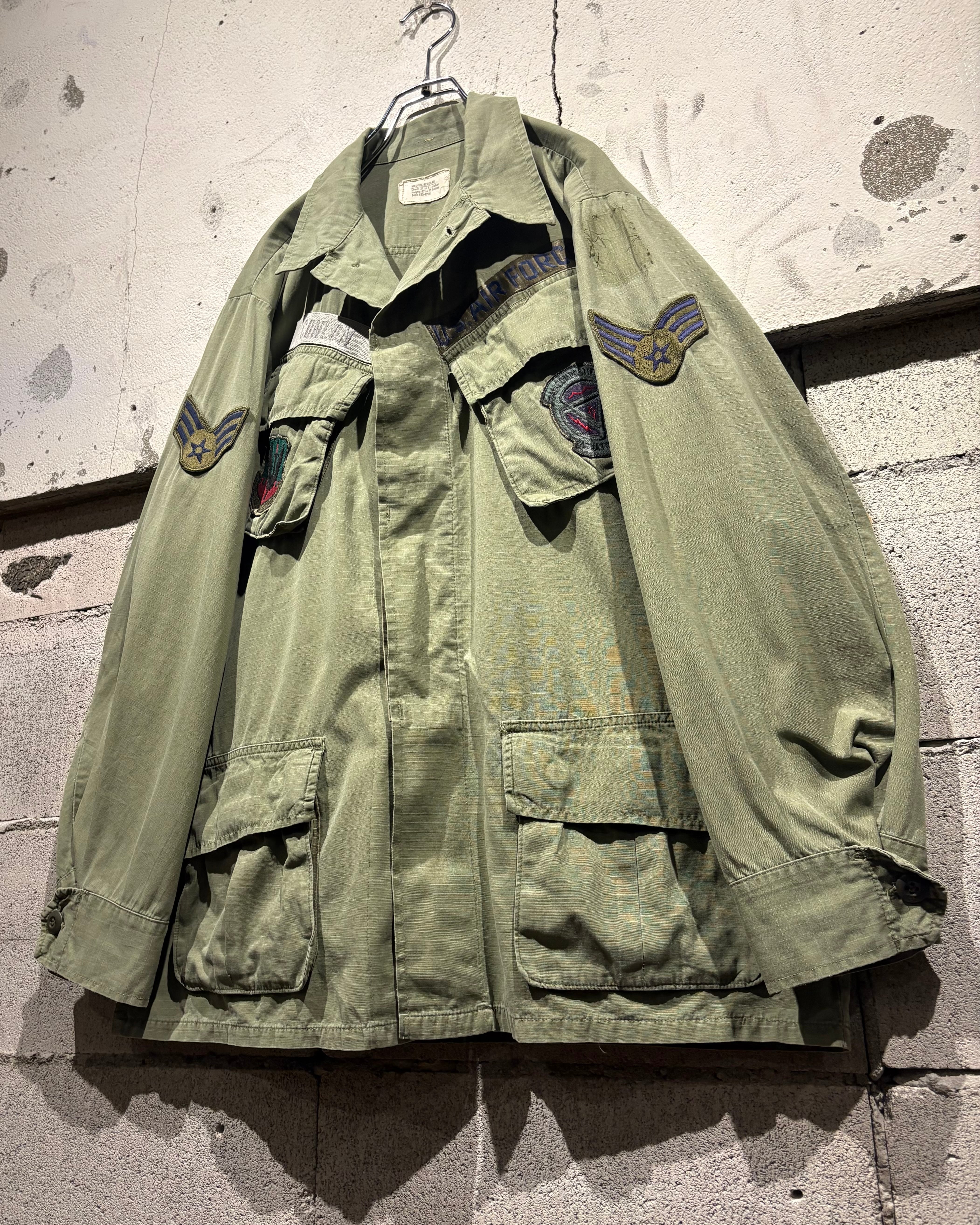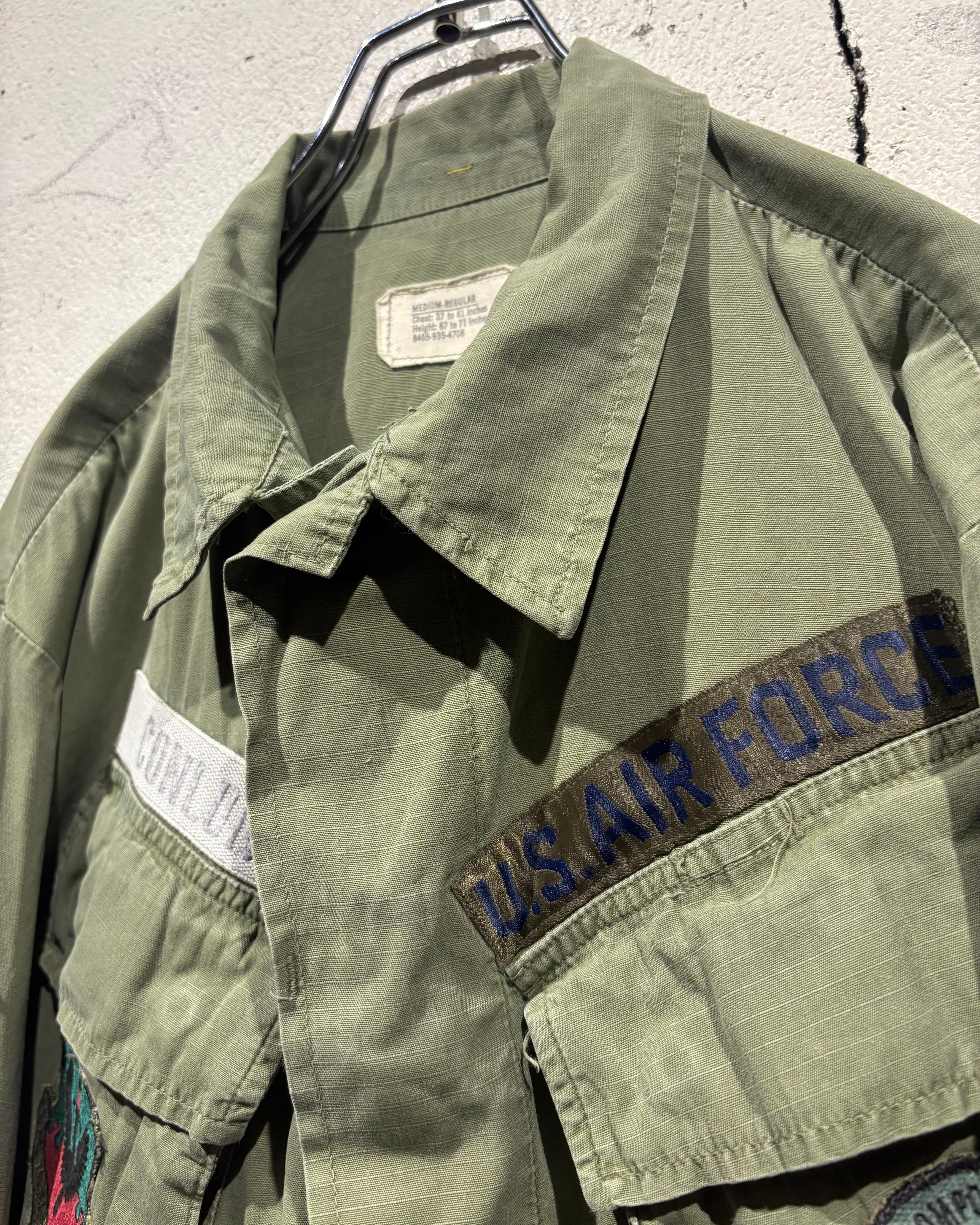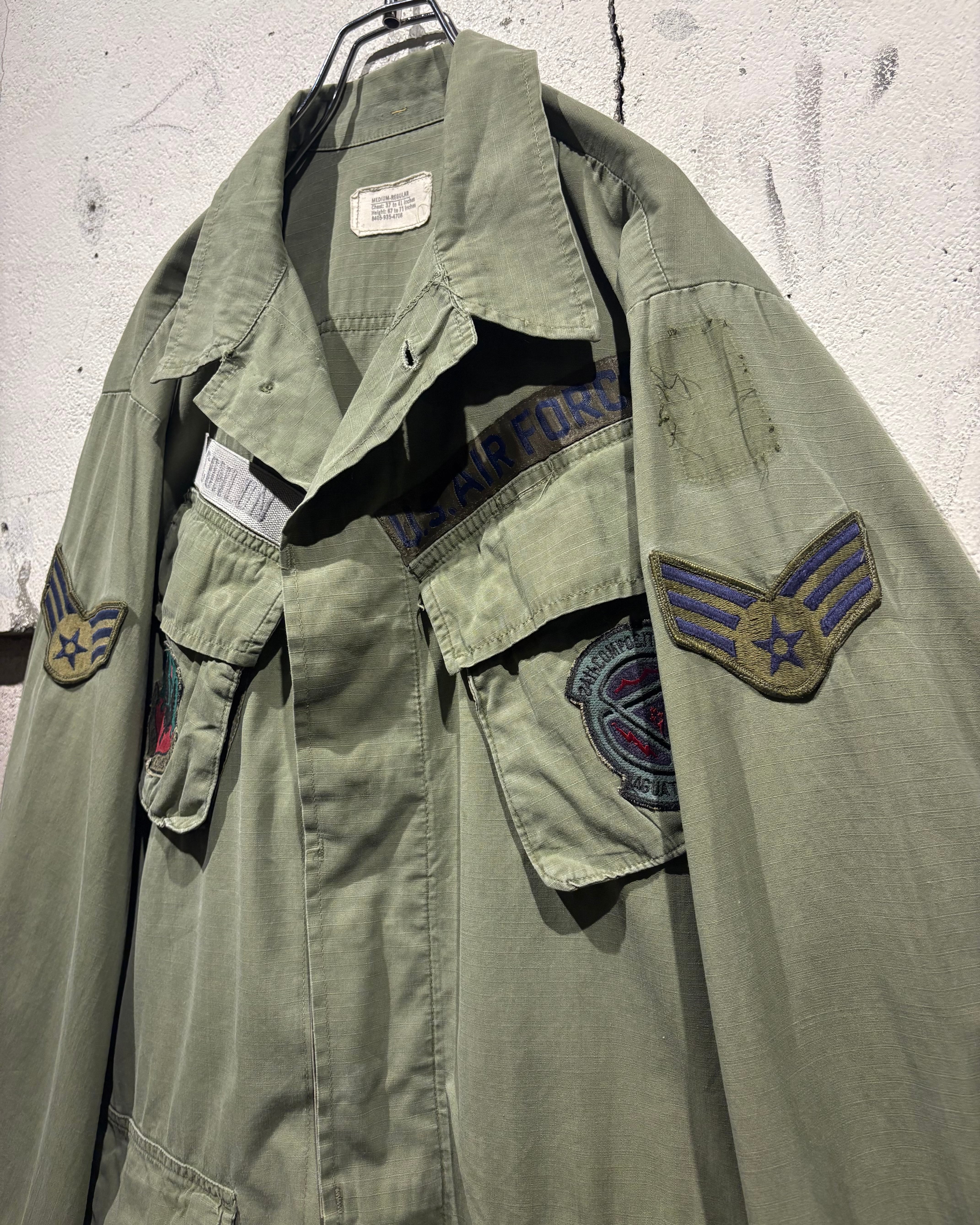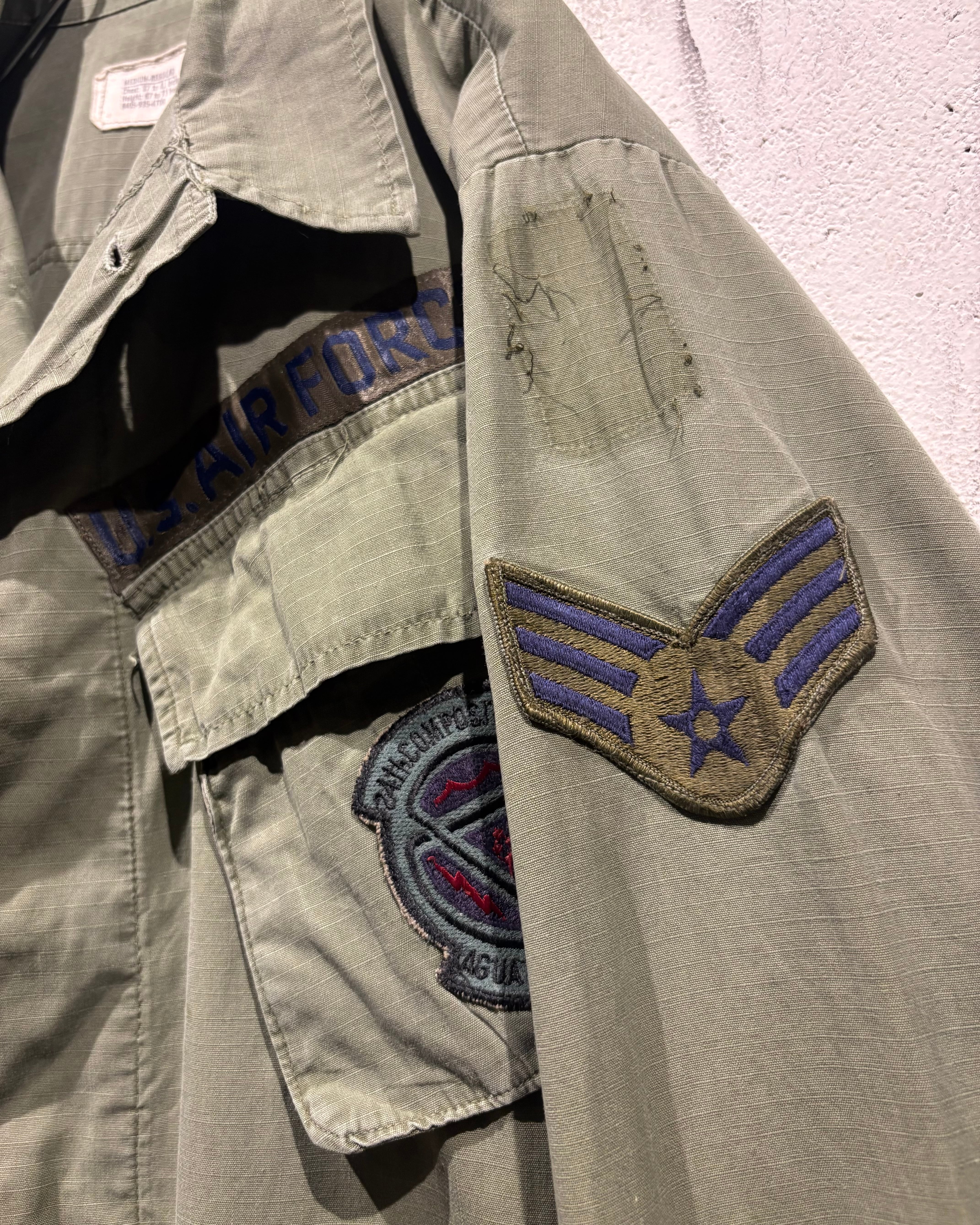 フロントには4つのフラップポケット、胸元にはU.S. AIR FORCEのネームテープ。さらに各種ワッペンやスリーブの階級章が残り、当時の背景を想像できる醍醐味も。