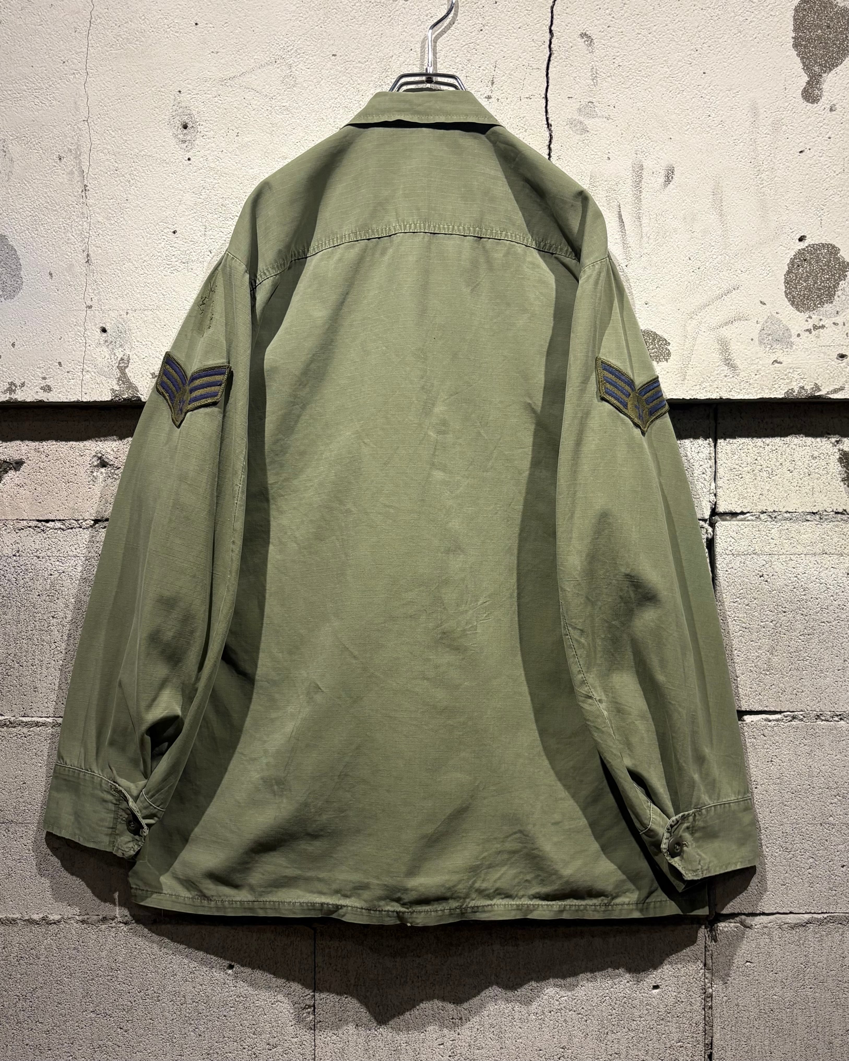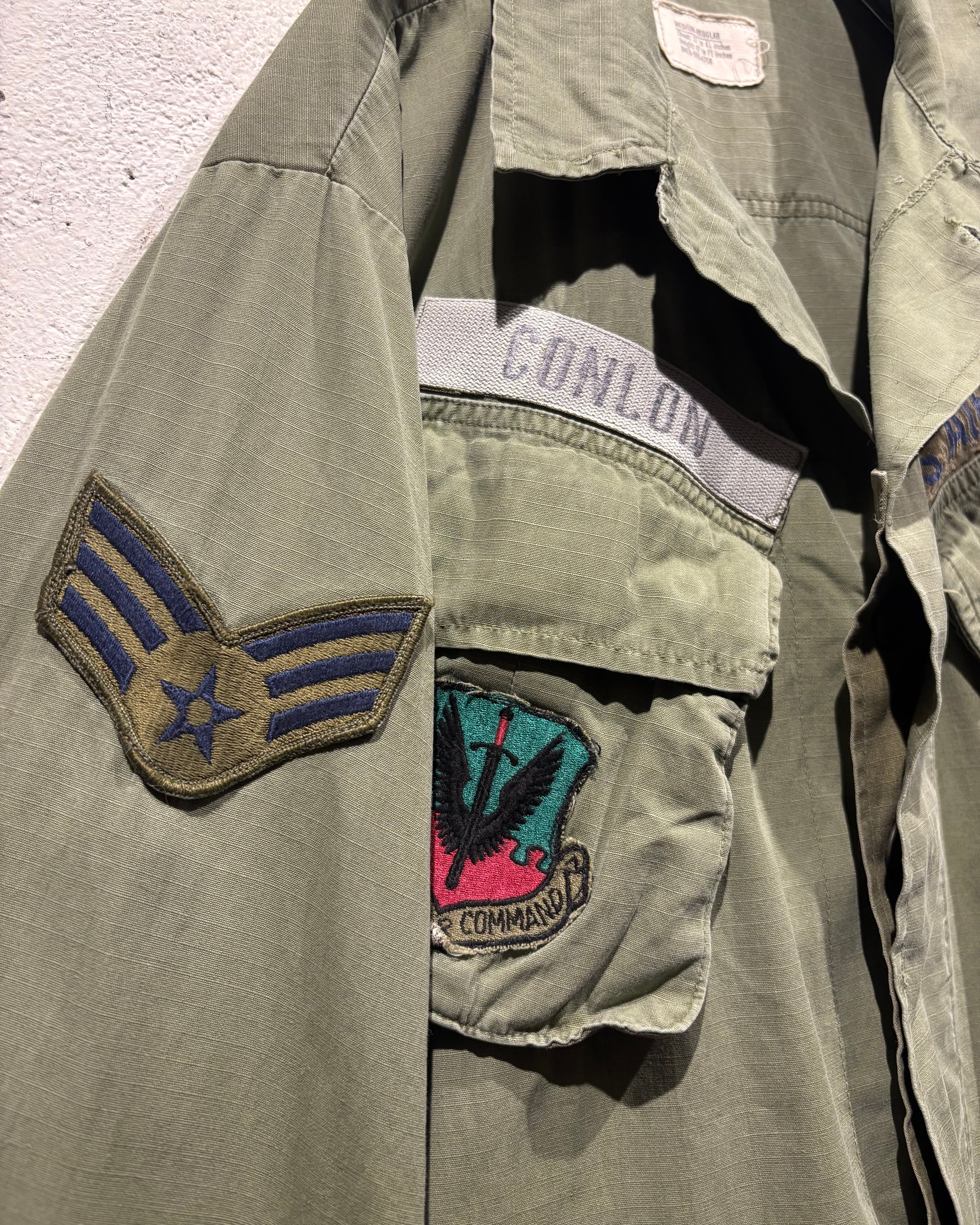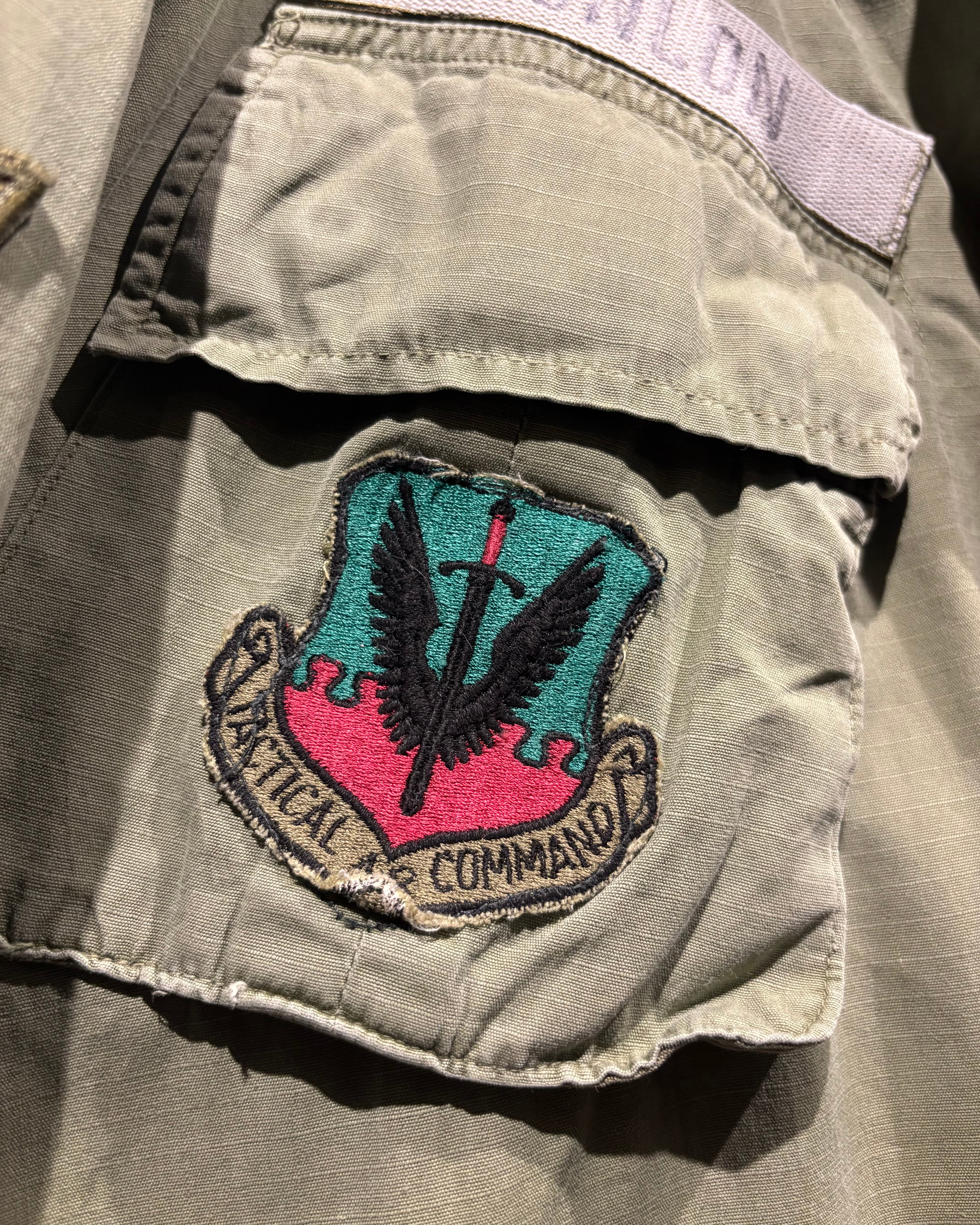 フロントには4つのフラップポケット、胸元にはU.S. AIR FORCEのネームテープ。さらに各種ワッペンやスリーブの階級章が残り、当時の背景を想像できる醍醐味も。