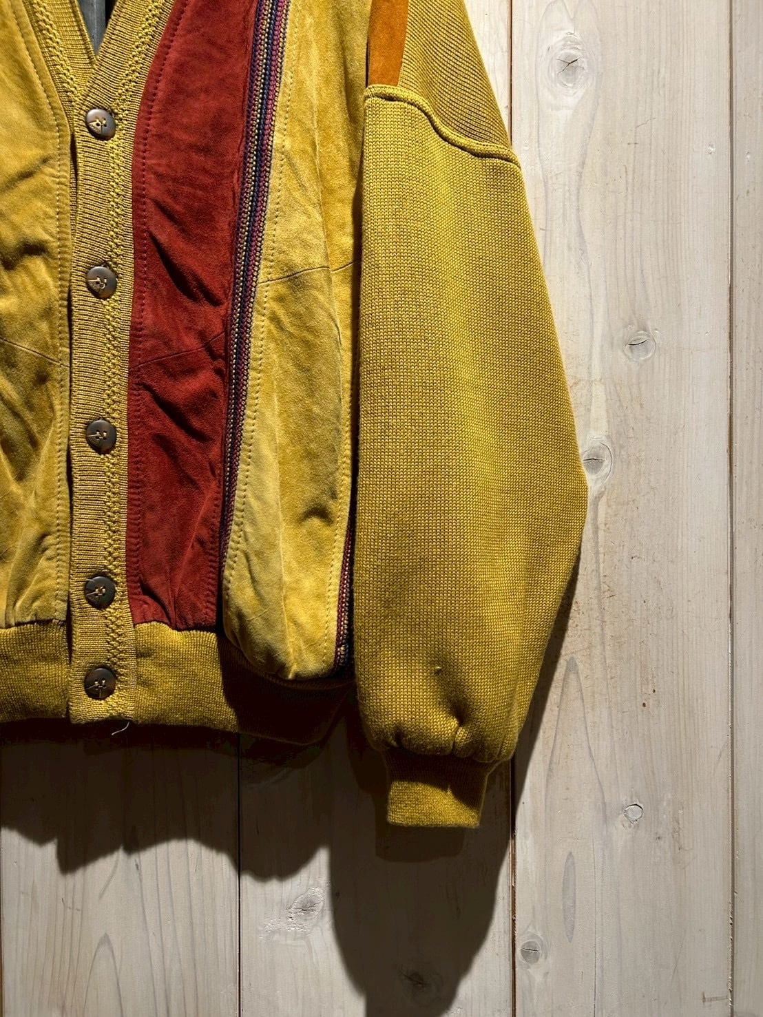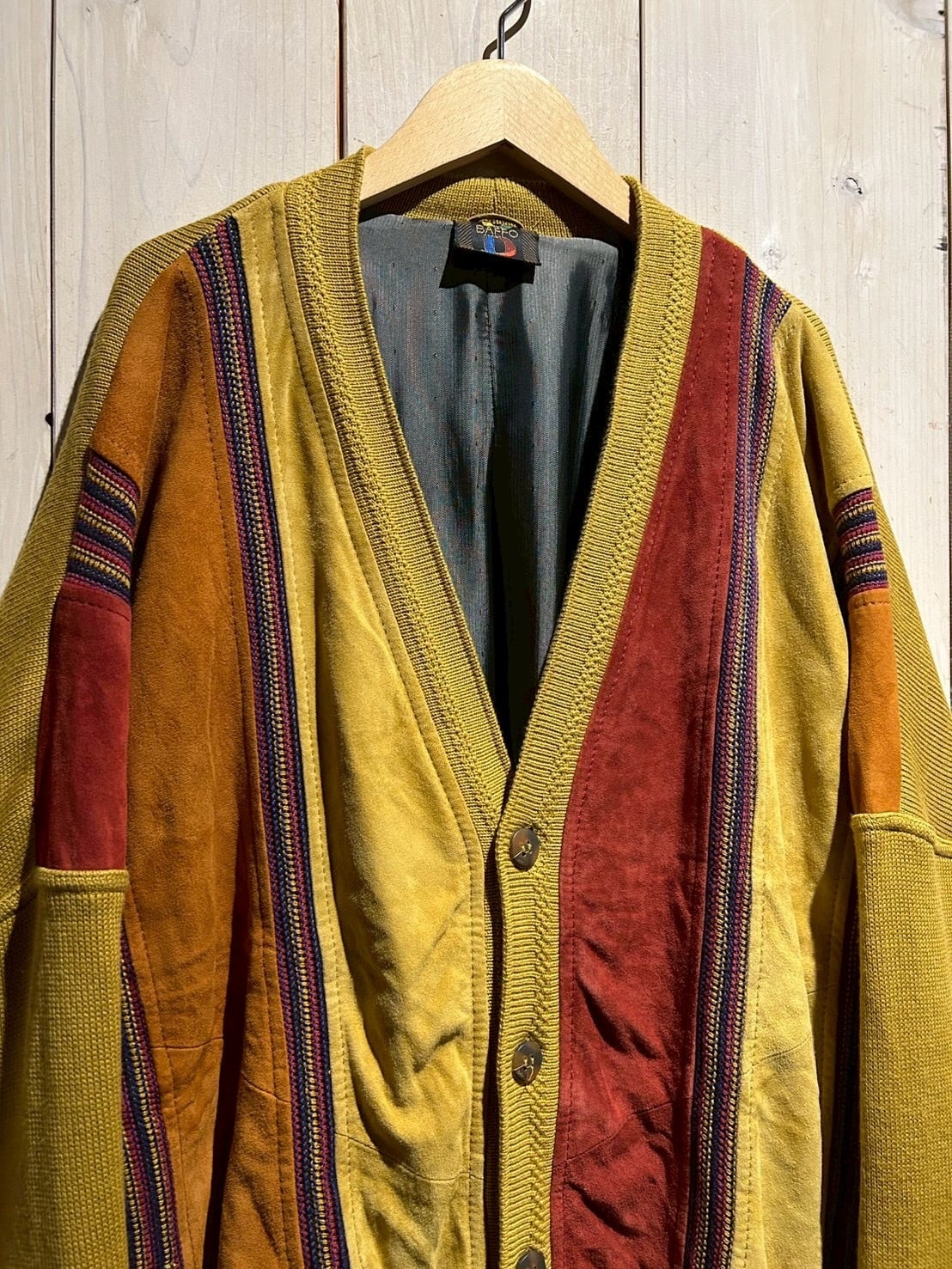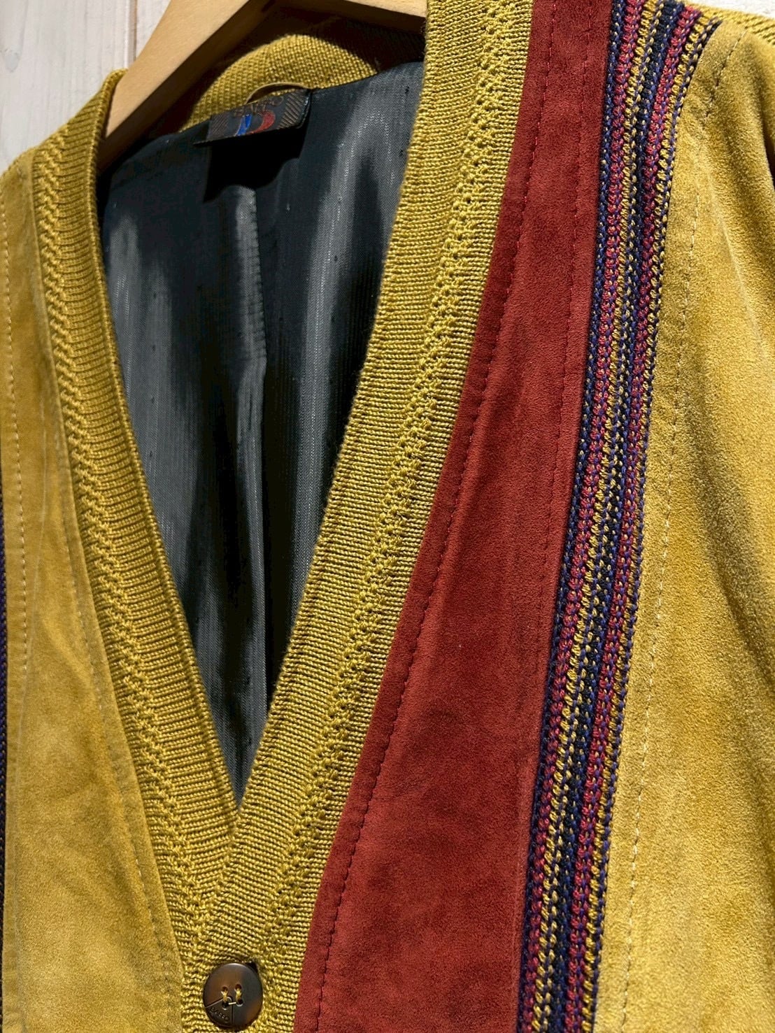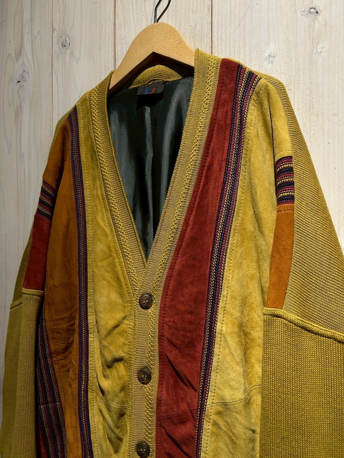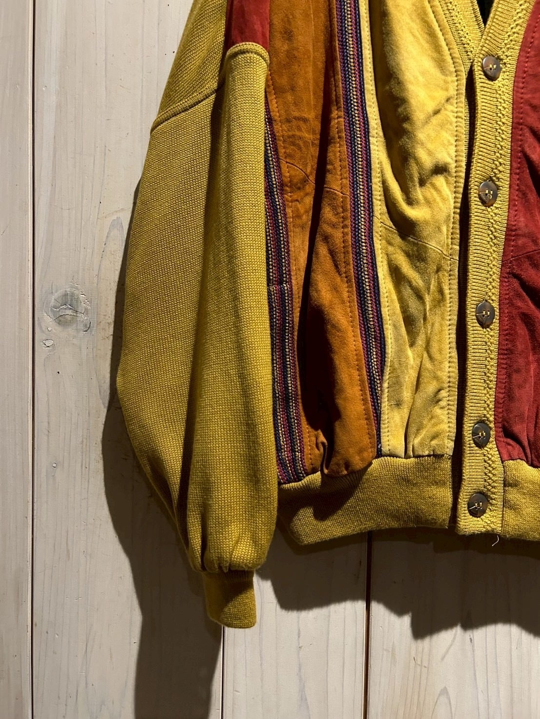 さらにカラフルなニットを挟み込むことで、立体的かつ奥行きのある表情へと仕上げられています。ニットの柔らかさとスエードの起毛感、そのコントラストが非常に秀逸です。