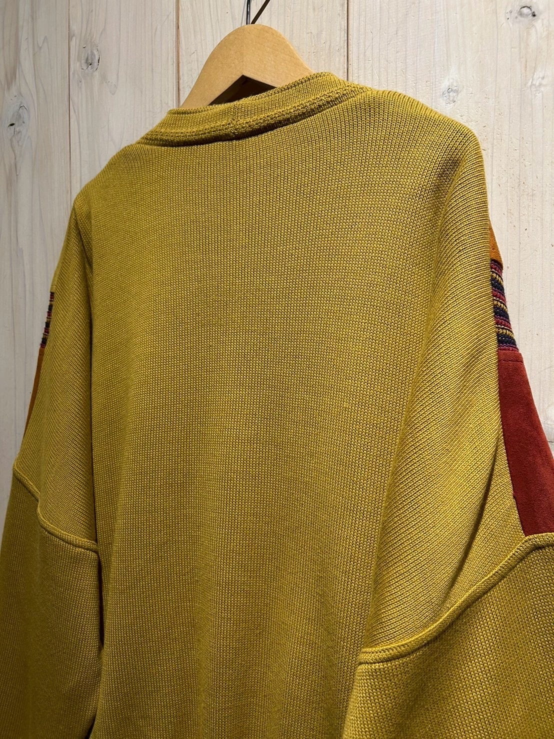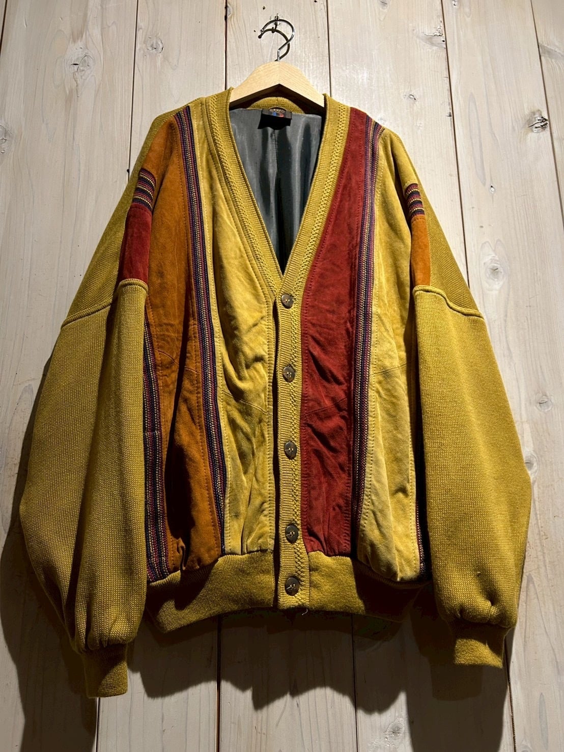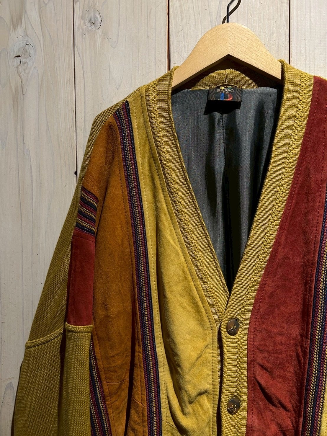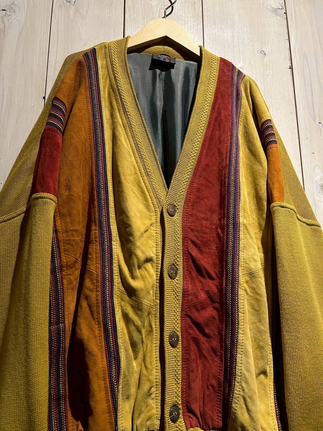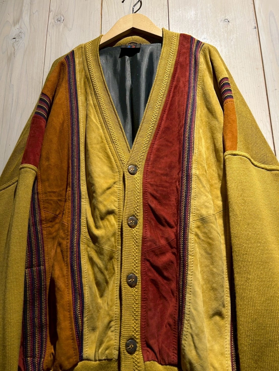 さらにカラフルなニットを挟み込むことで、立体的かつ奥行きのある表情へと仕上げられています。ニットの柔らかさとスエードの起毛感、そのコントラストが非常に秀逸です。