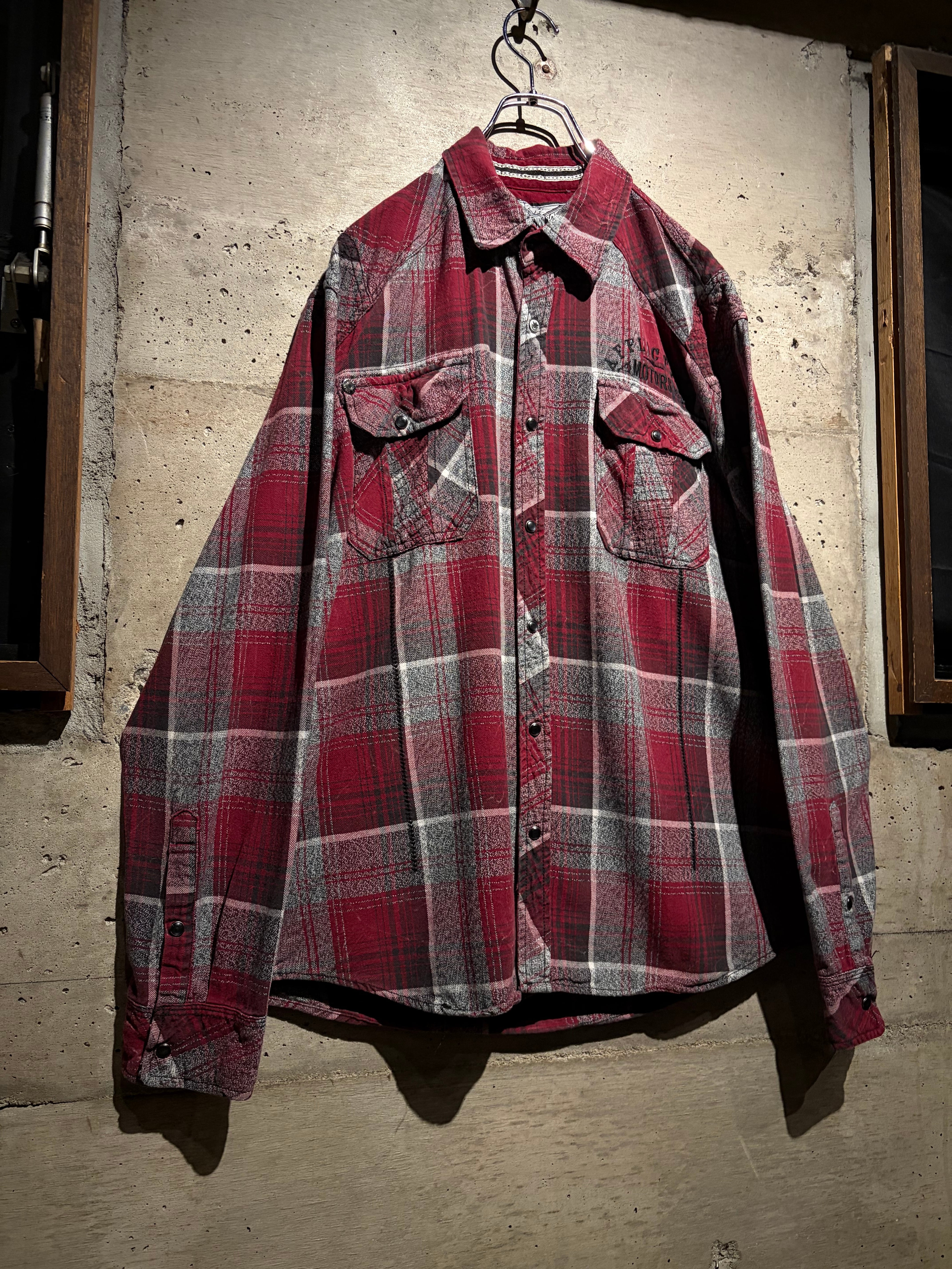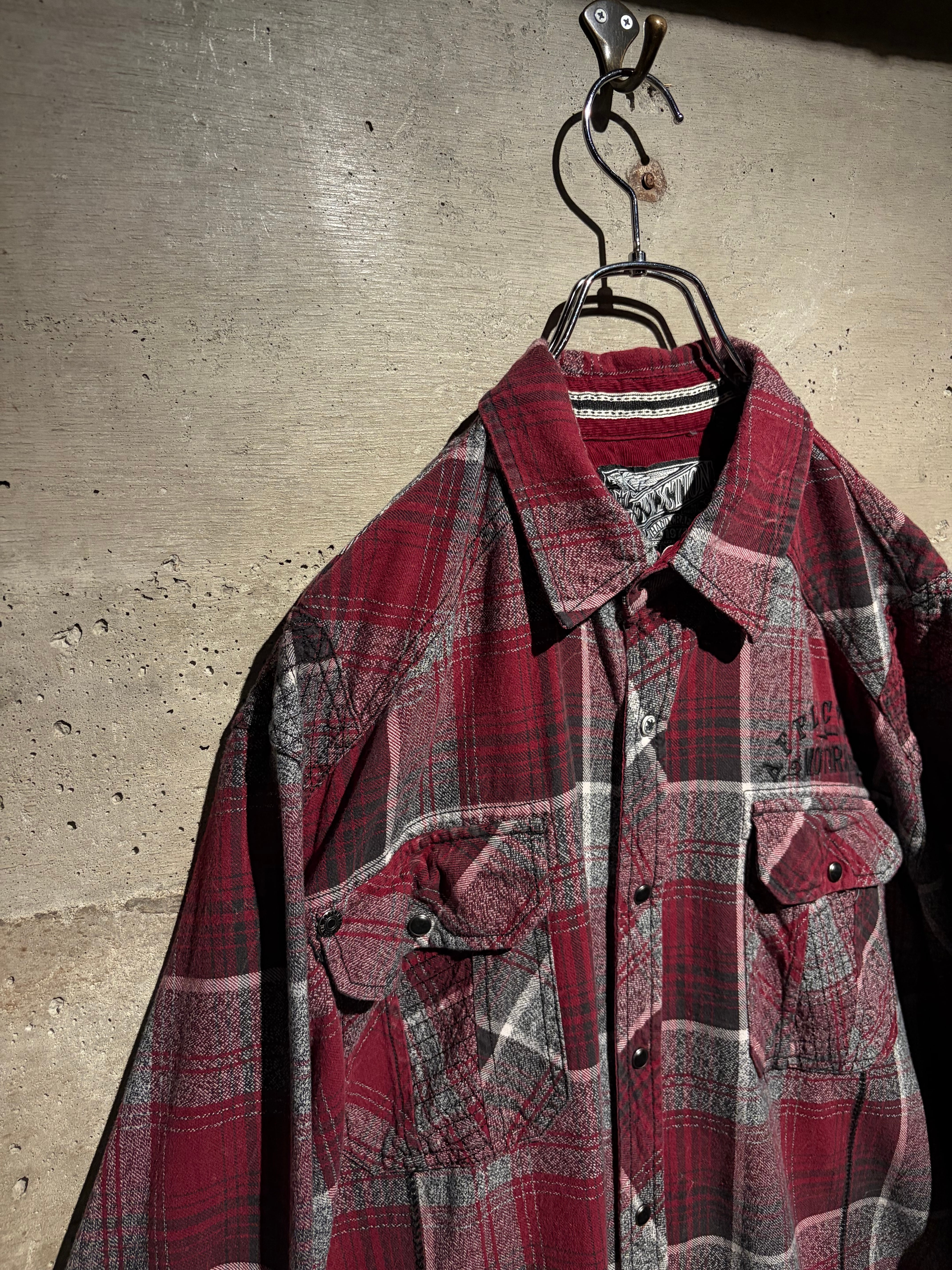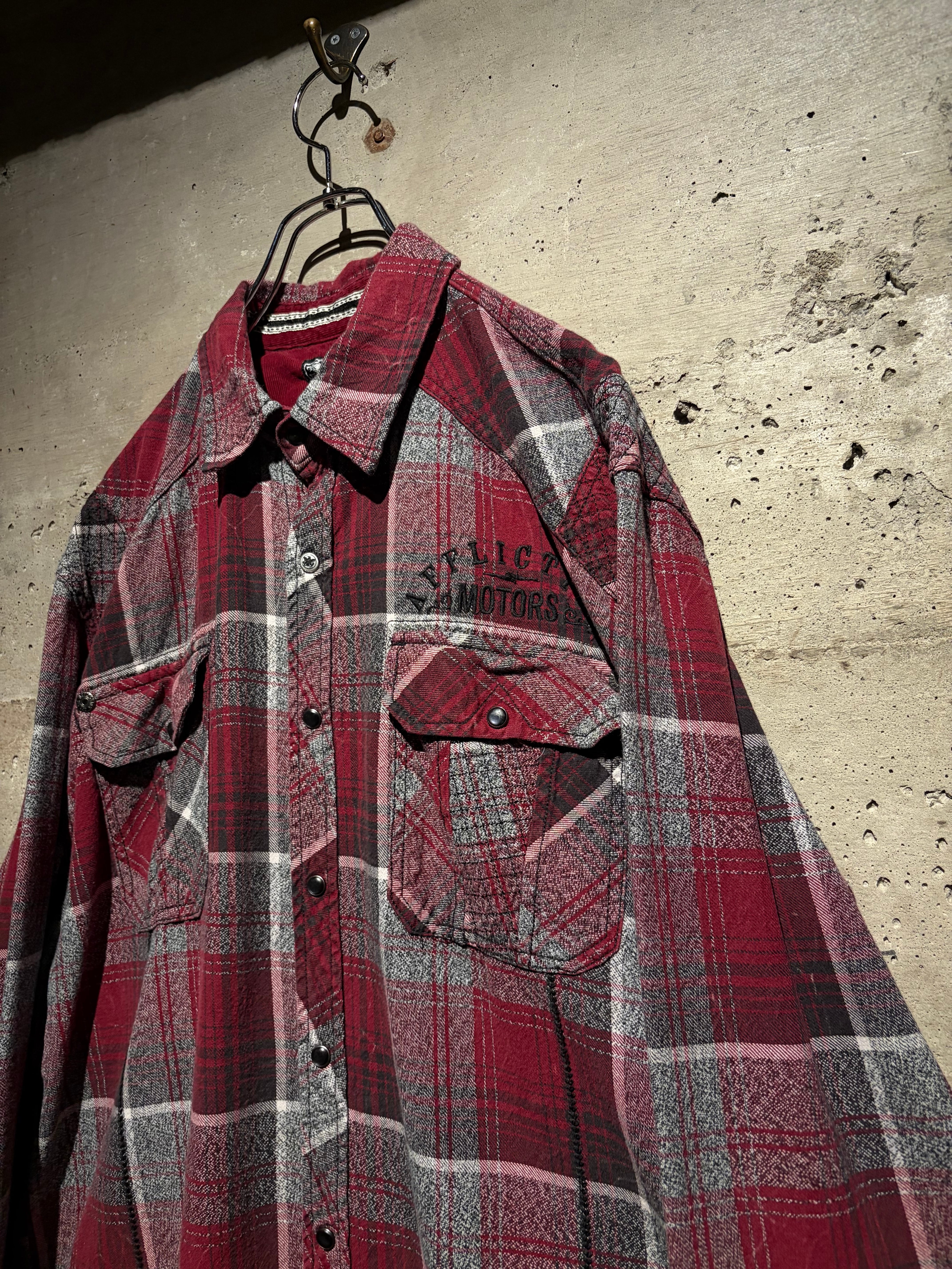 Afflictionらしい世界観を存分に落とし込んだ、レッド×グレーを基調としたオンブレチェックシャツ。