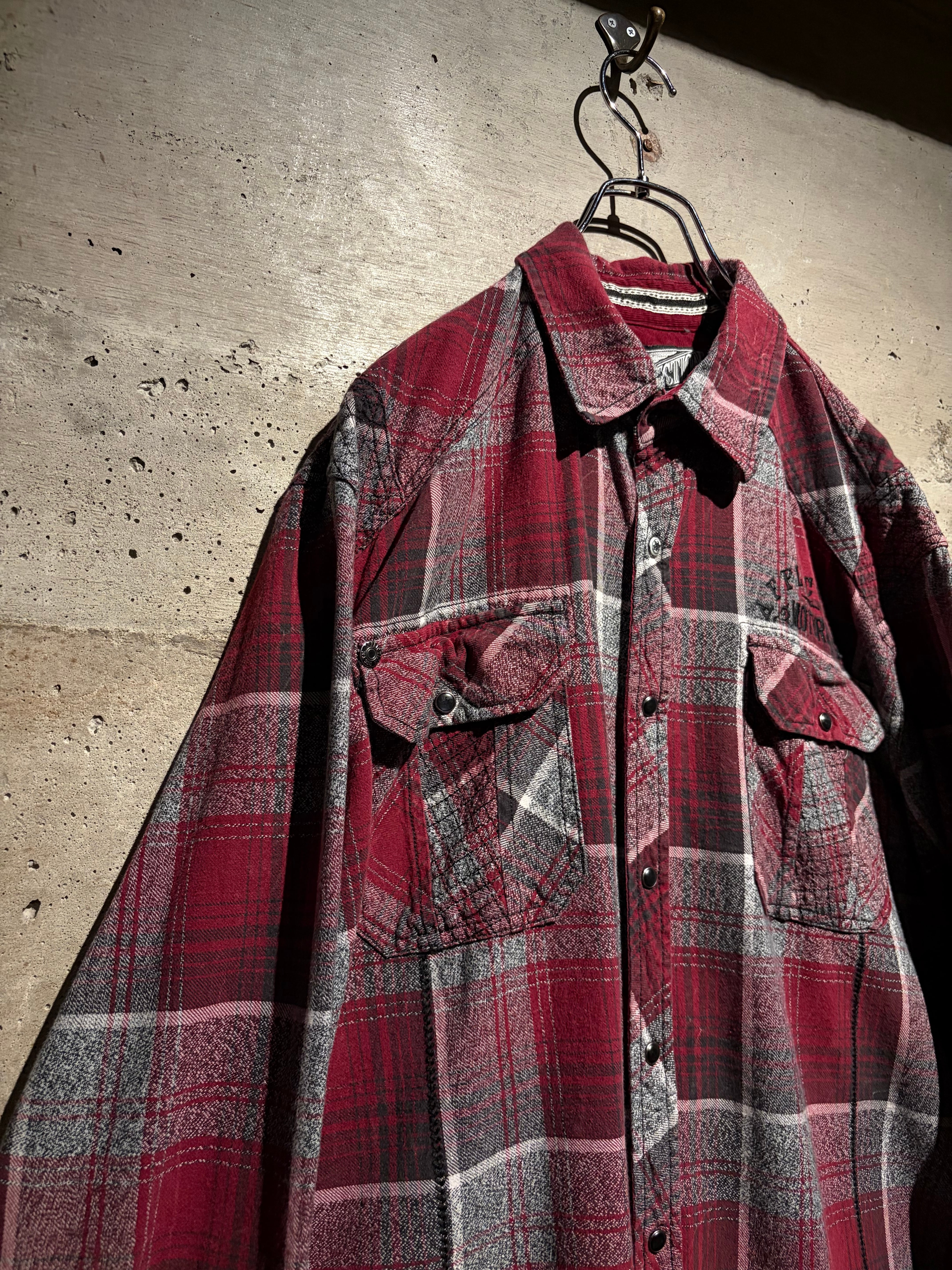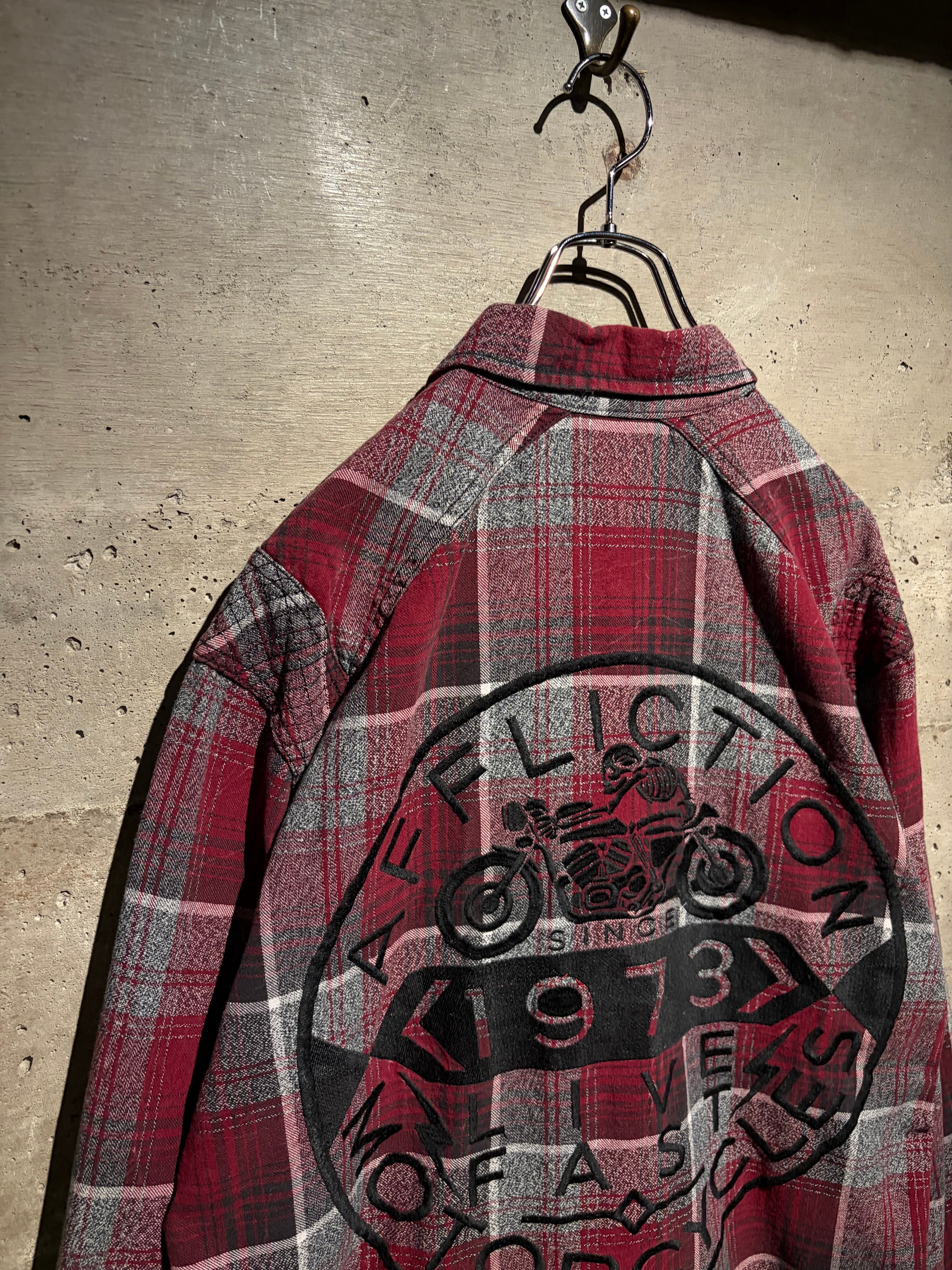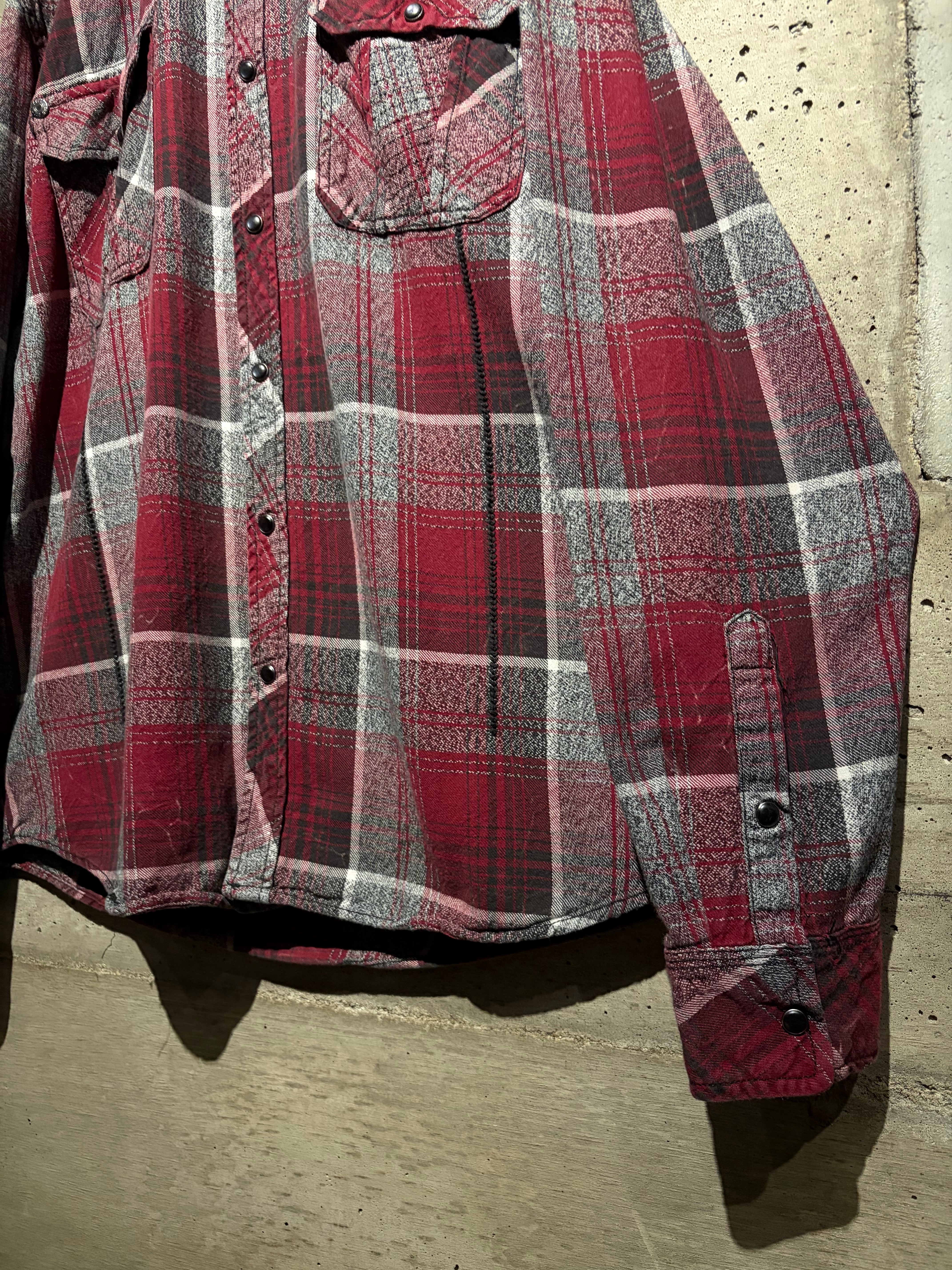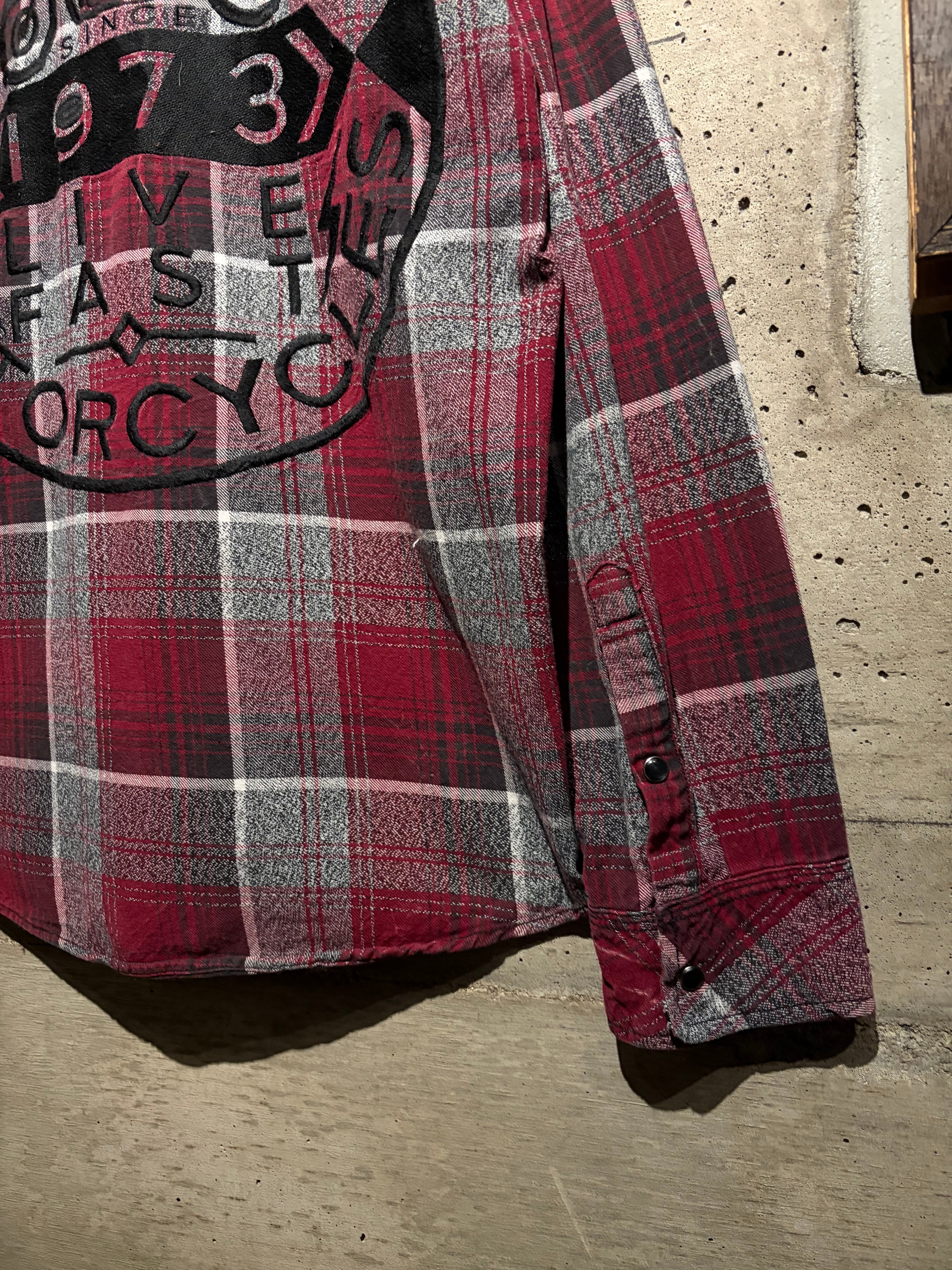 Afflictionらしい世界観を存分に落とし込んだ、レッド×グレーを基調としたオンブレチェックシャツ。