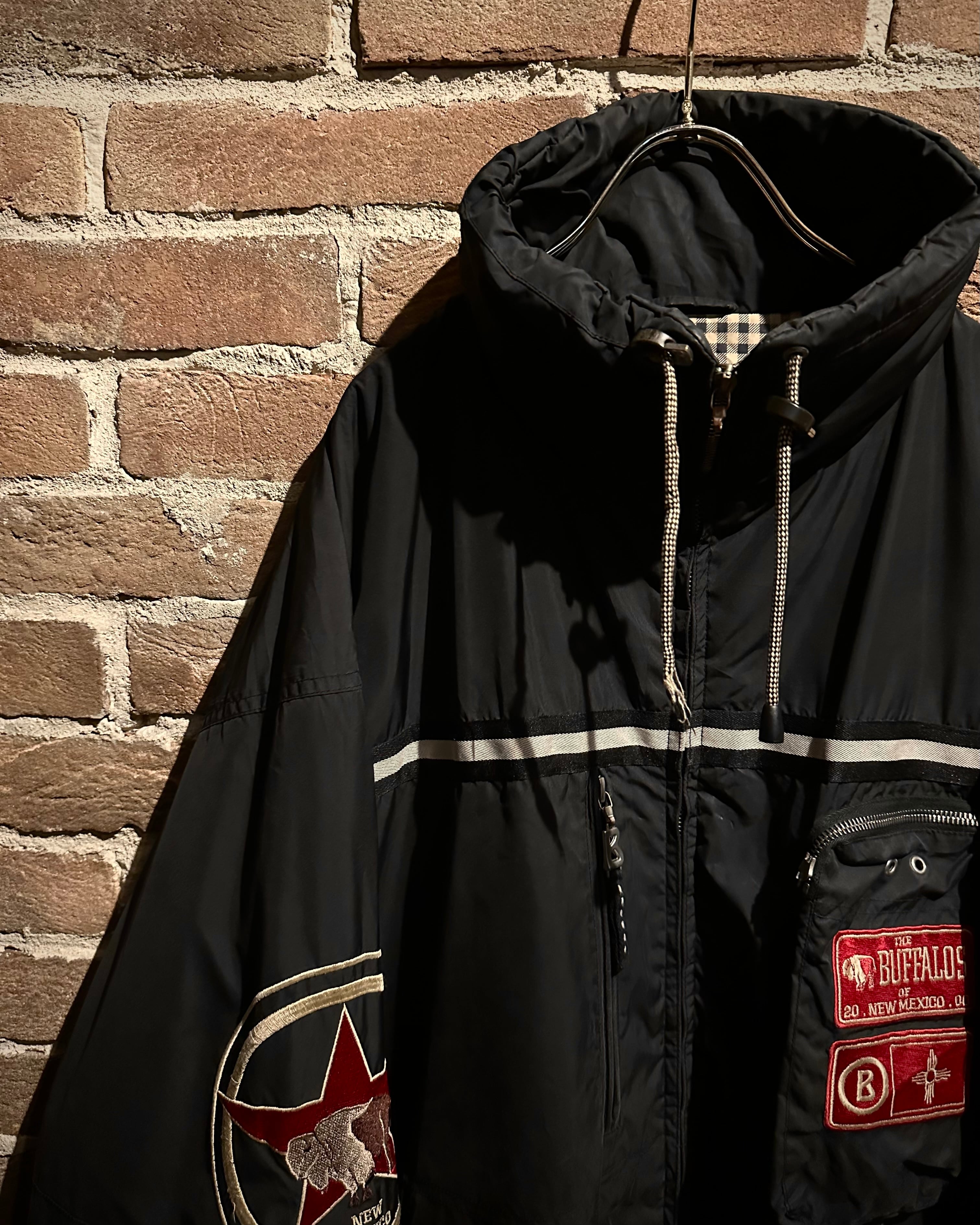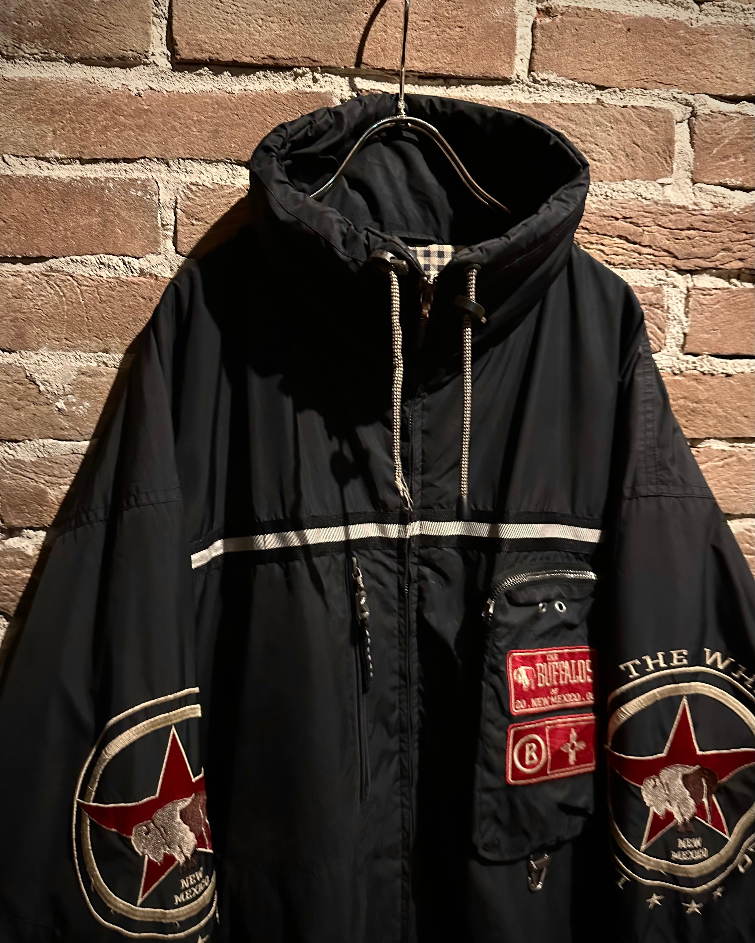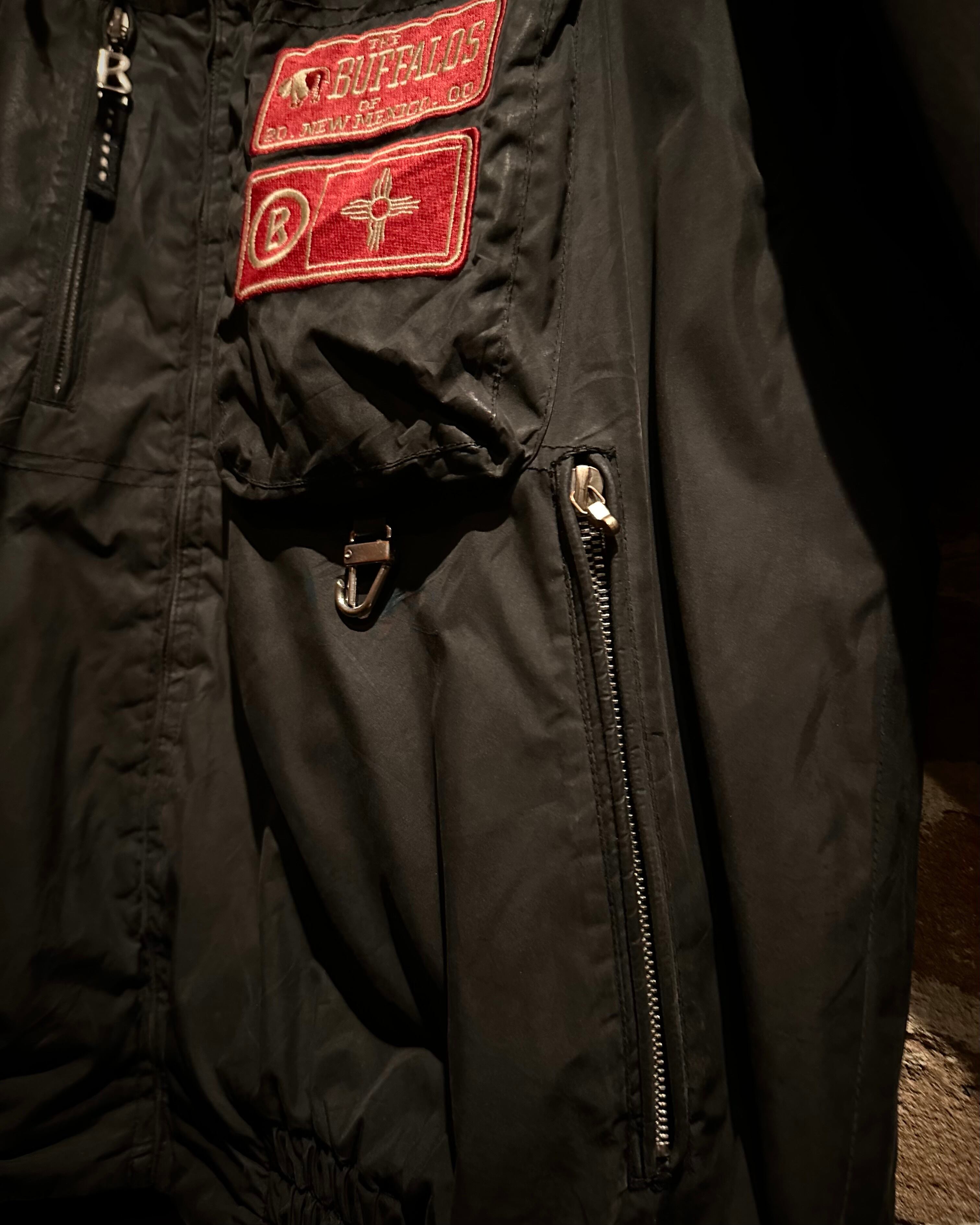 フロントにはジップポケットに重ねる大胆なワッペンワーク。“THE BUFFALOS OF NEW MEXICO”のグラフィック、袖には星×バッファローのサークルエンブレムを配し、スポーティーかつアイコニックな表情を演出しています。