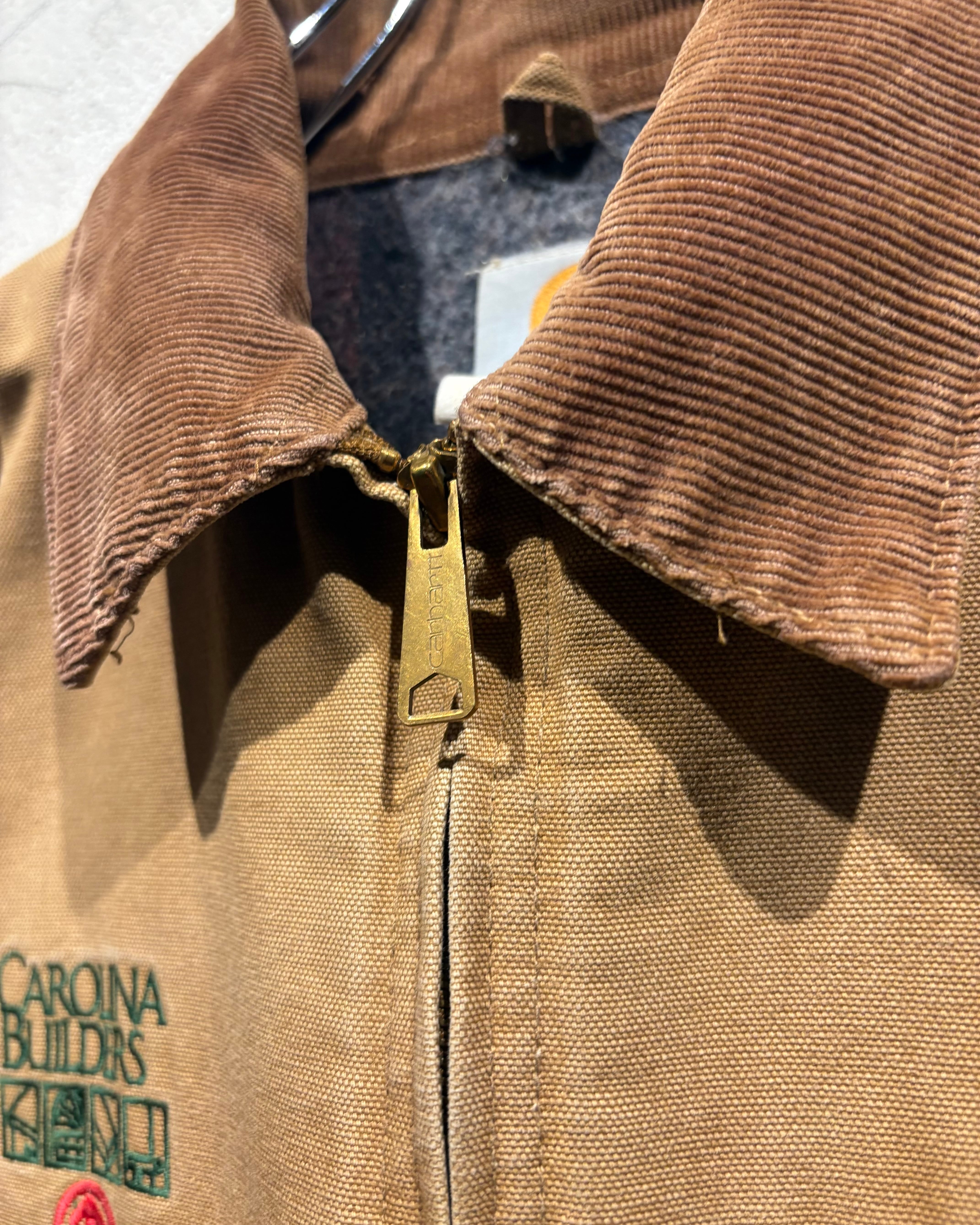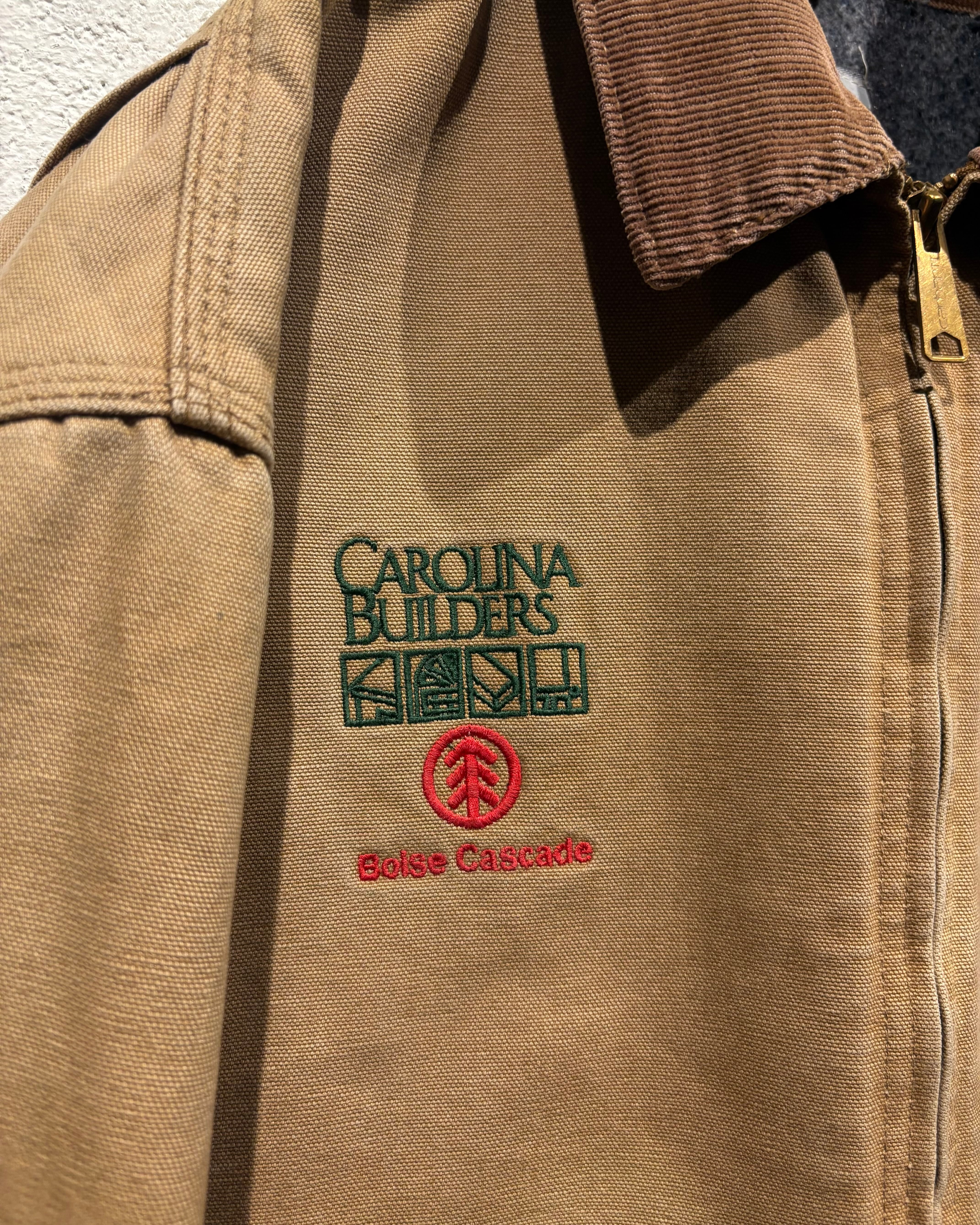 フロントには“CAROLINA BUILDERS Boise Cascade”の刺繍ロゴを配置。企業モノならではの一点物感があり、定番モデルにさりげない個性を加えるアクセントに。胸のスクエアパッチ、ジップ仕様、ハンドウォーマーポケットといったデトロイトらしいディテールも健在です。