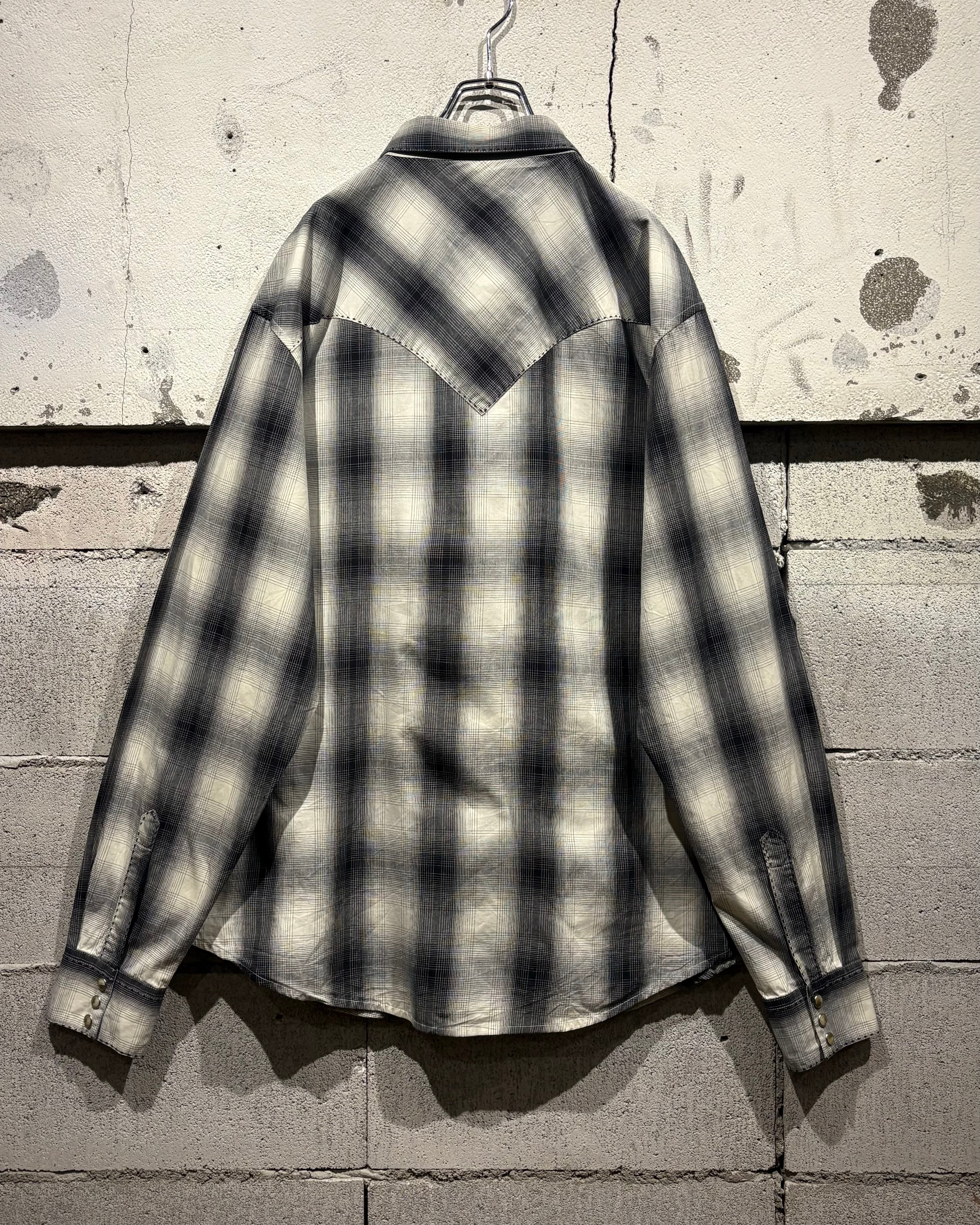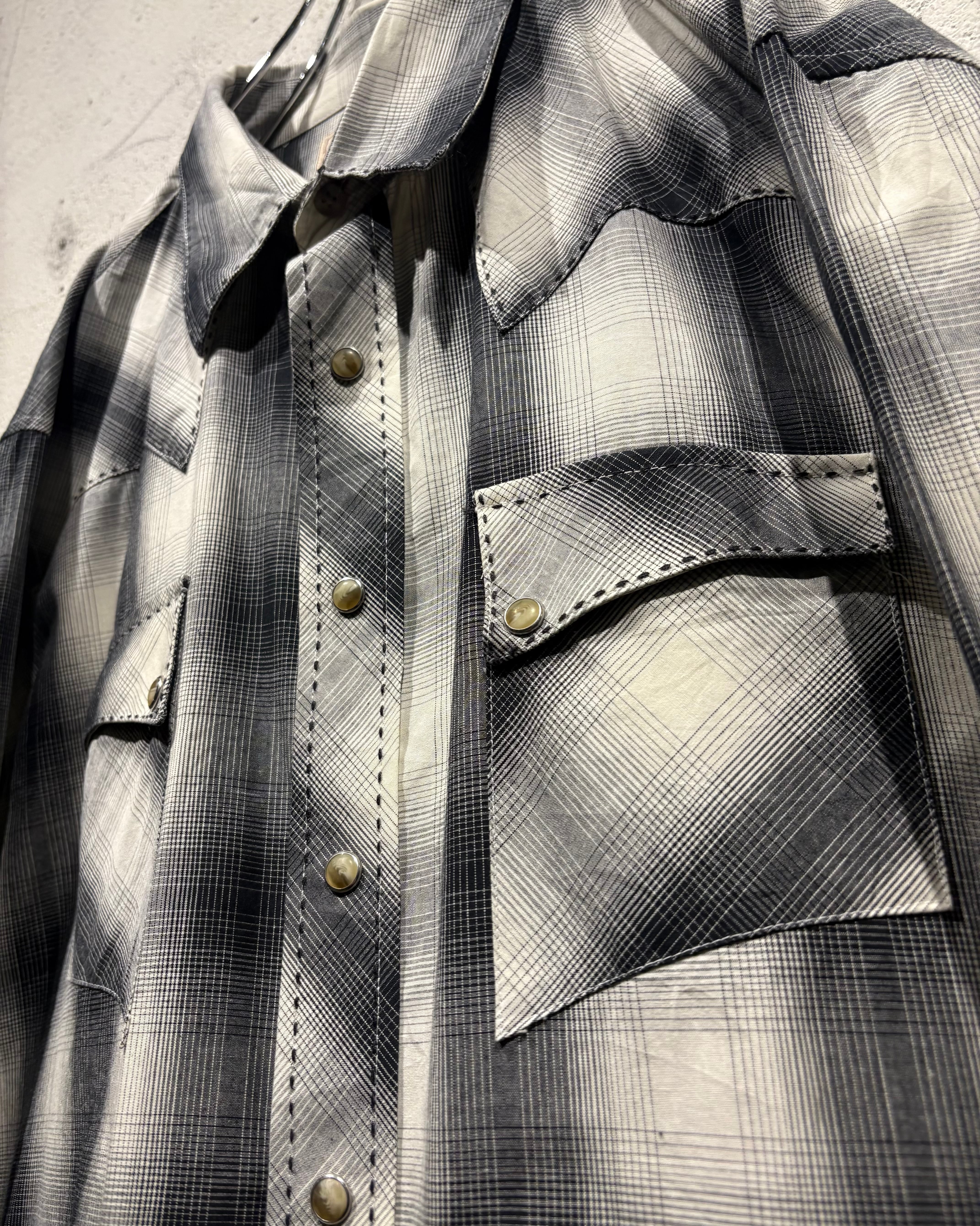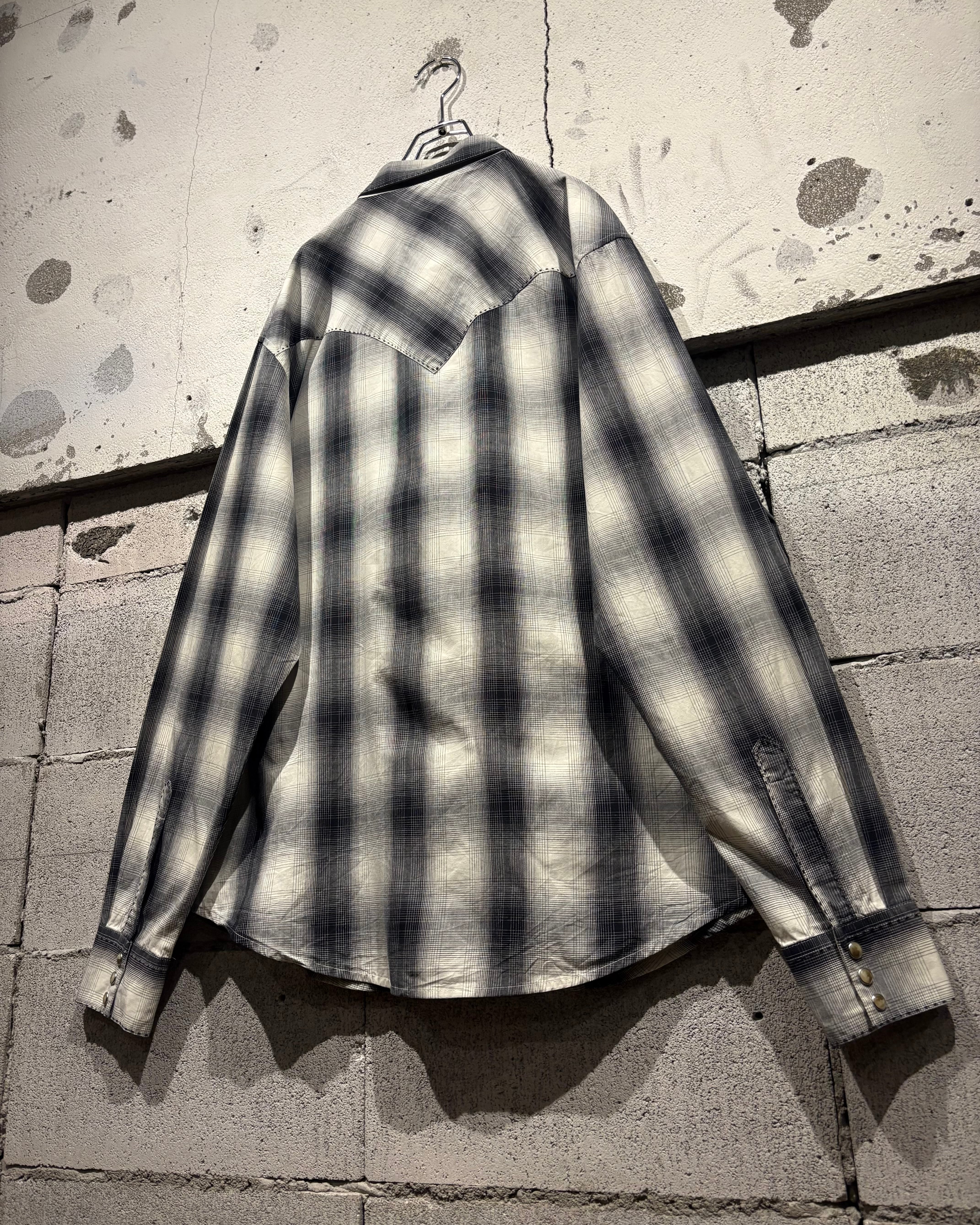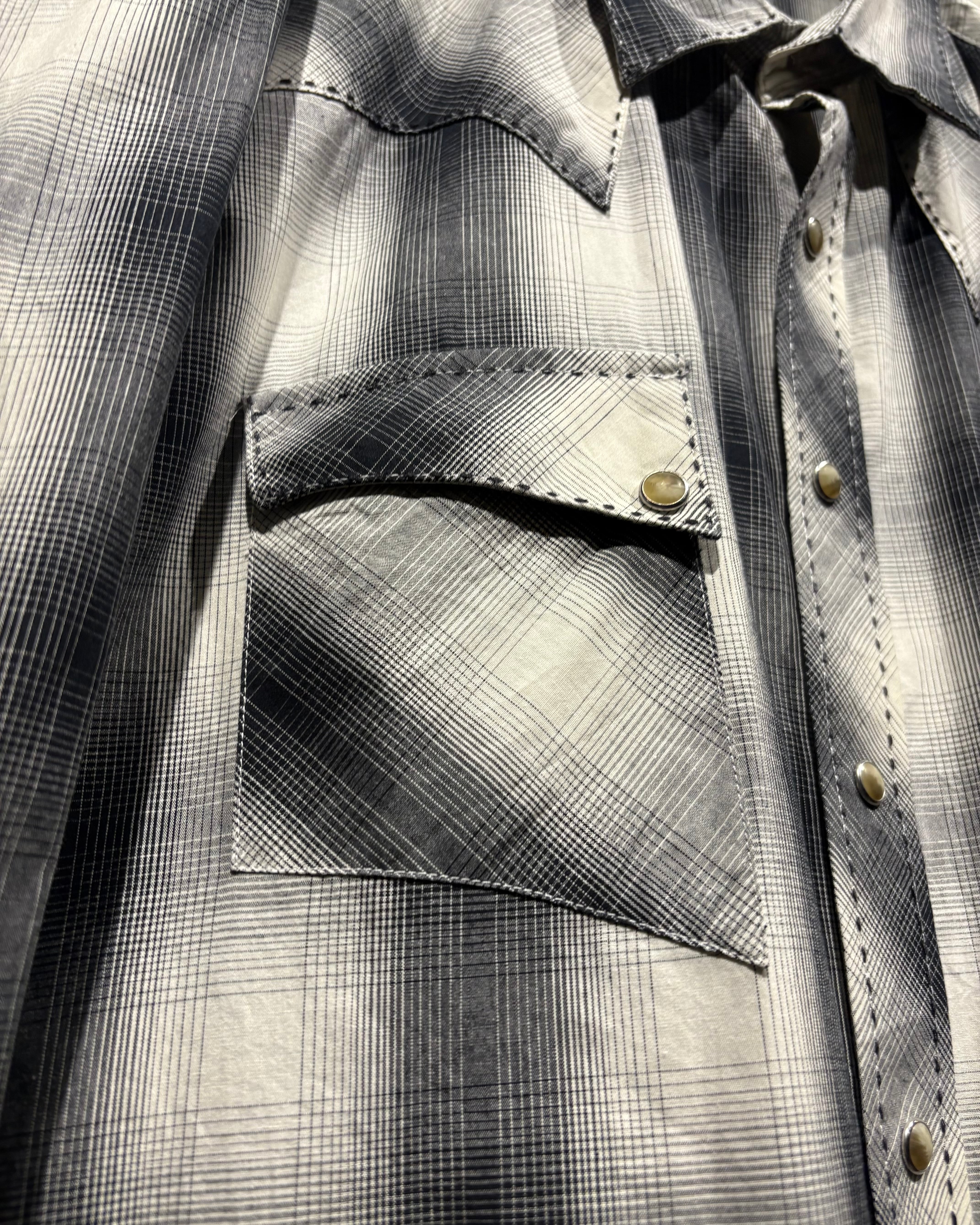 ブラックからグレー、そして淡いホワイトへと滑らかにフェードしていくオンブレチェックが美しく、無骨な印象を持つウエスタンシャツに、どこかストリートな空気感を与えるデザインバランスが◎