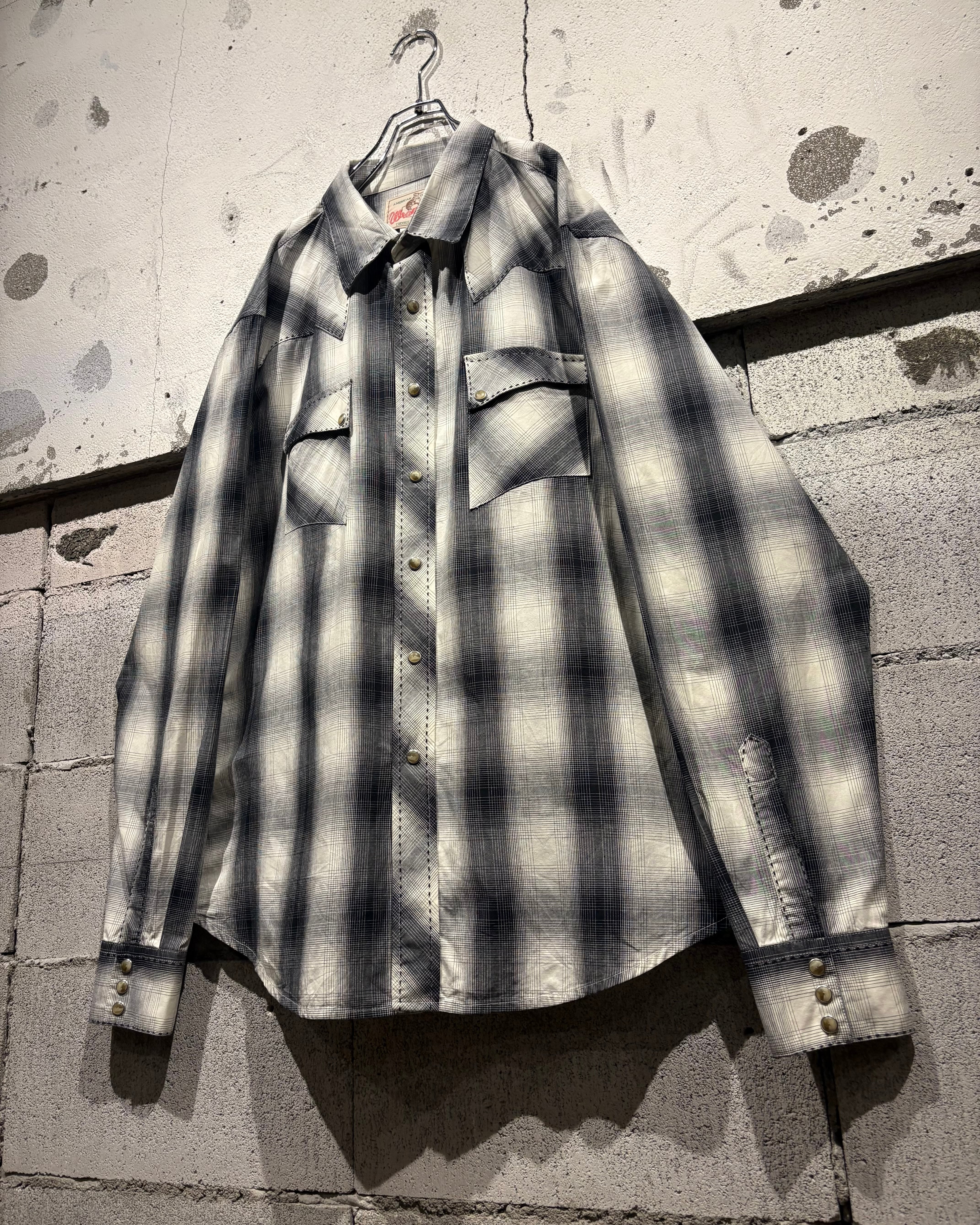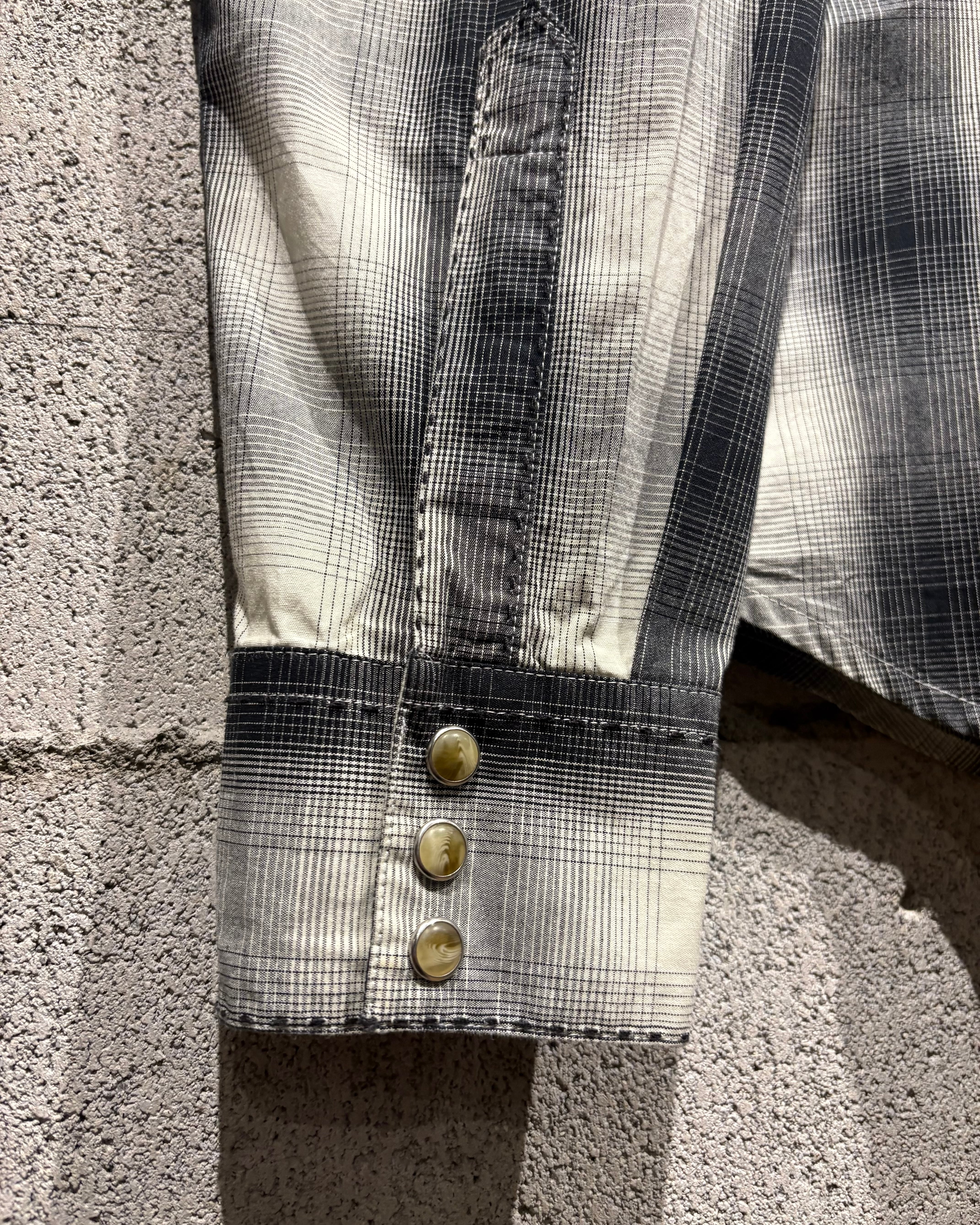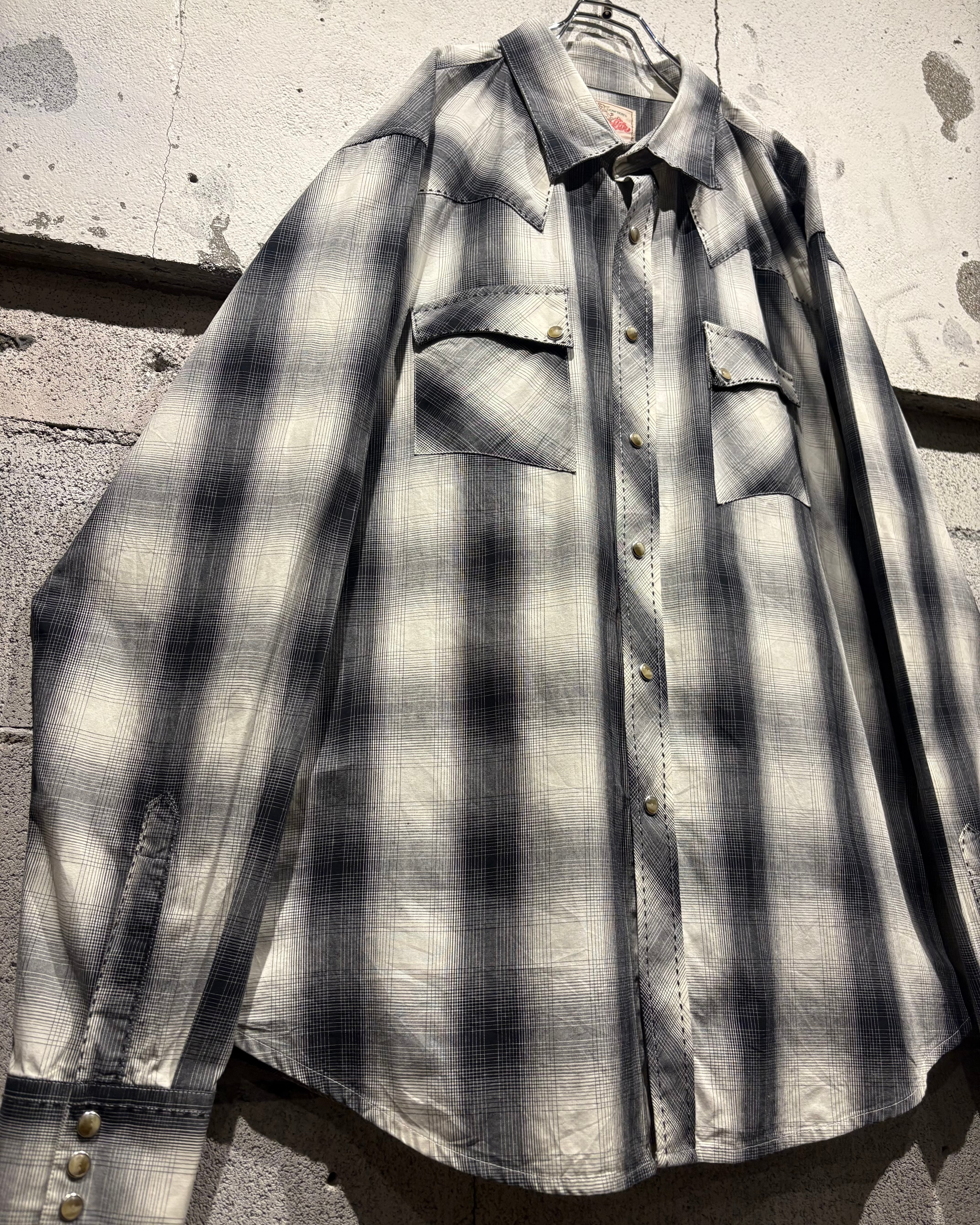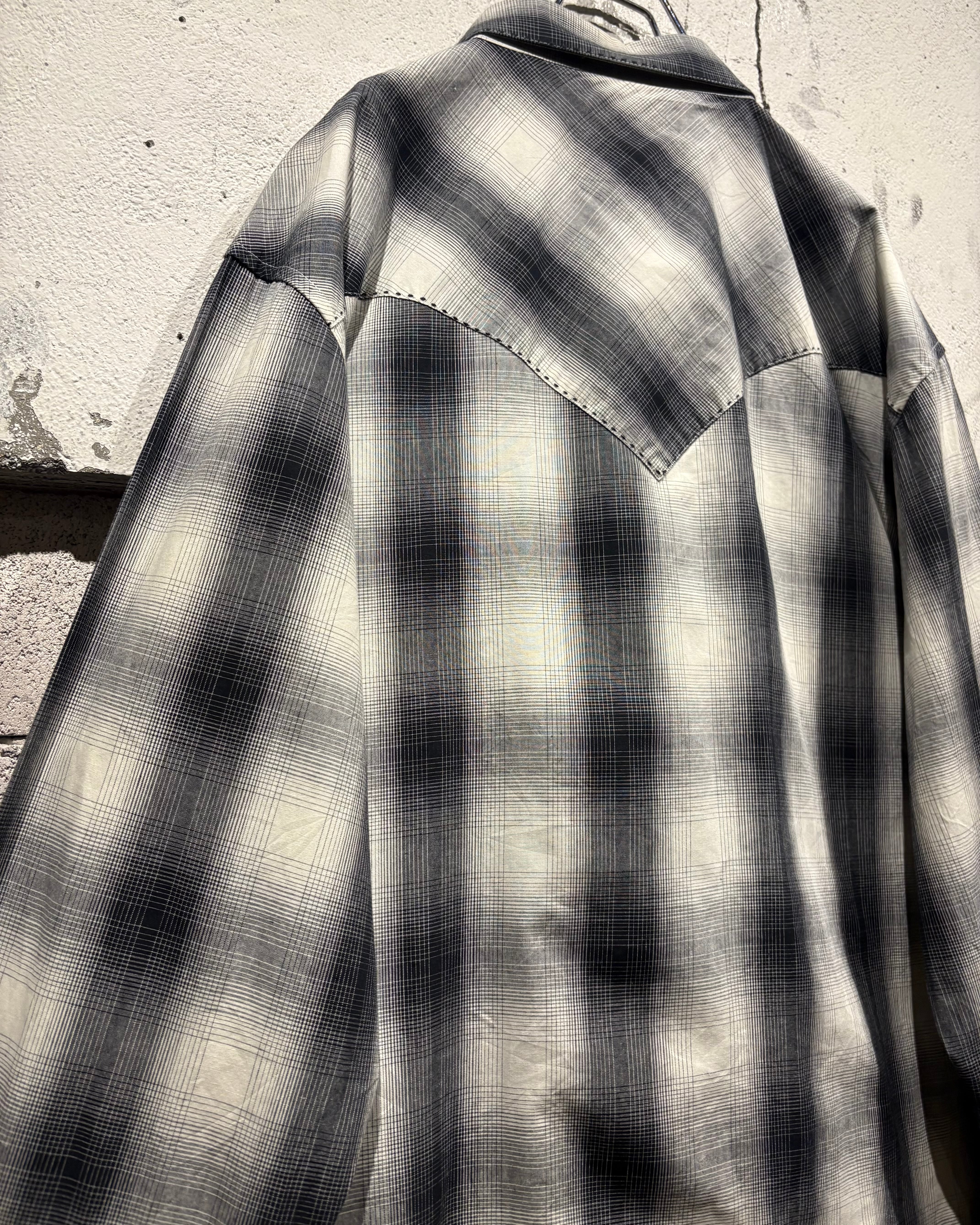 ブラックからグレー、そして淡いホワイトへと滑らかにフェードしていくオンブレチェックが美しく、無骨な印象を持つウエスタンシャツに、どこかストリートな空気感を与えるデザインバランスが◎