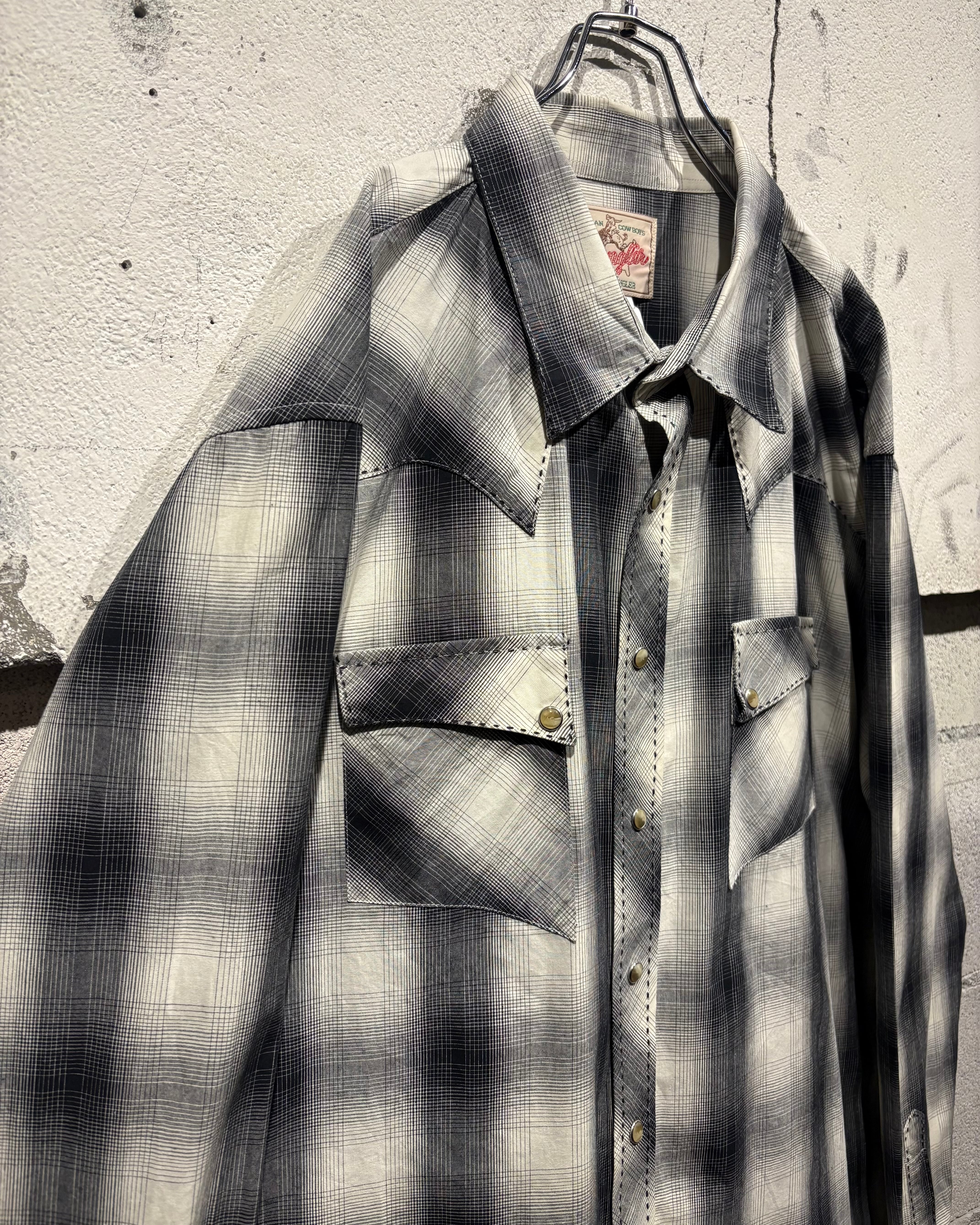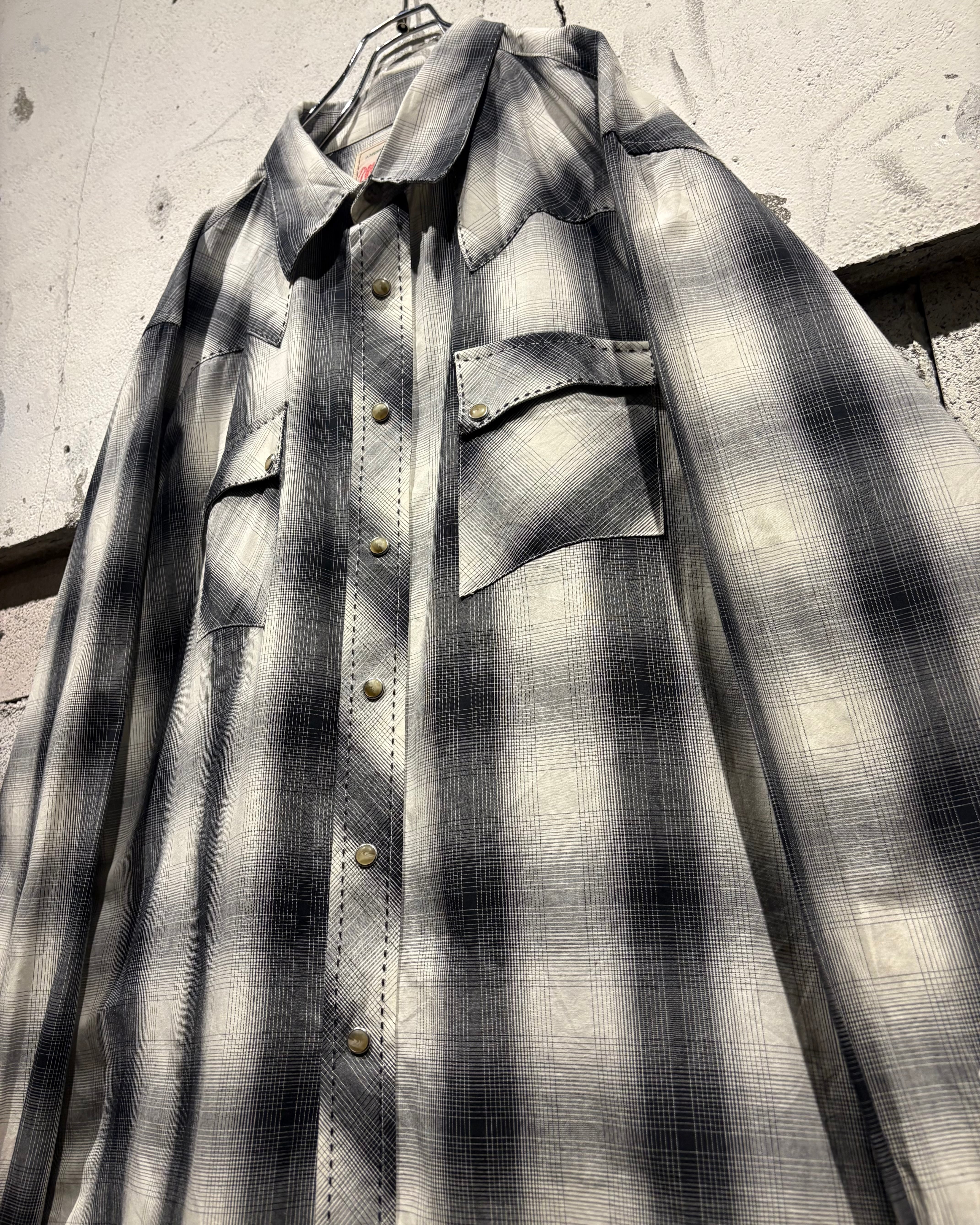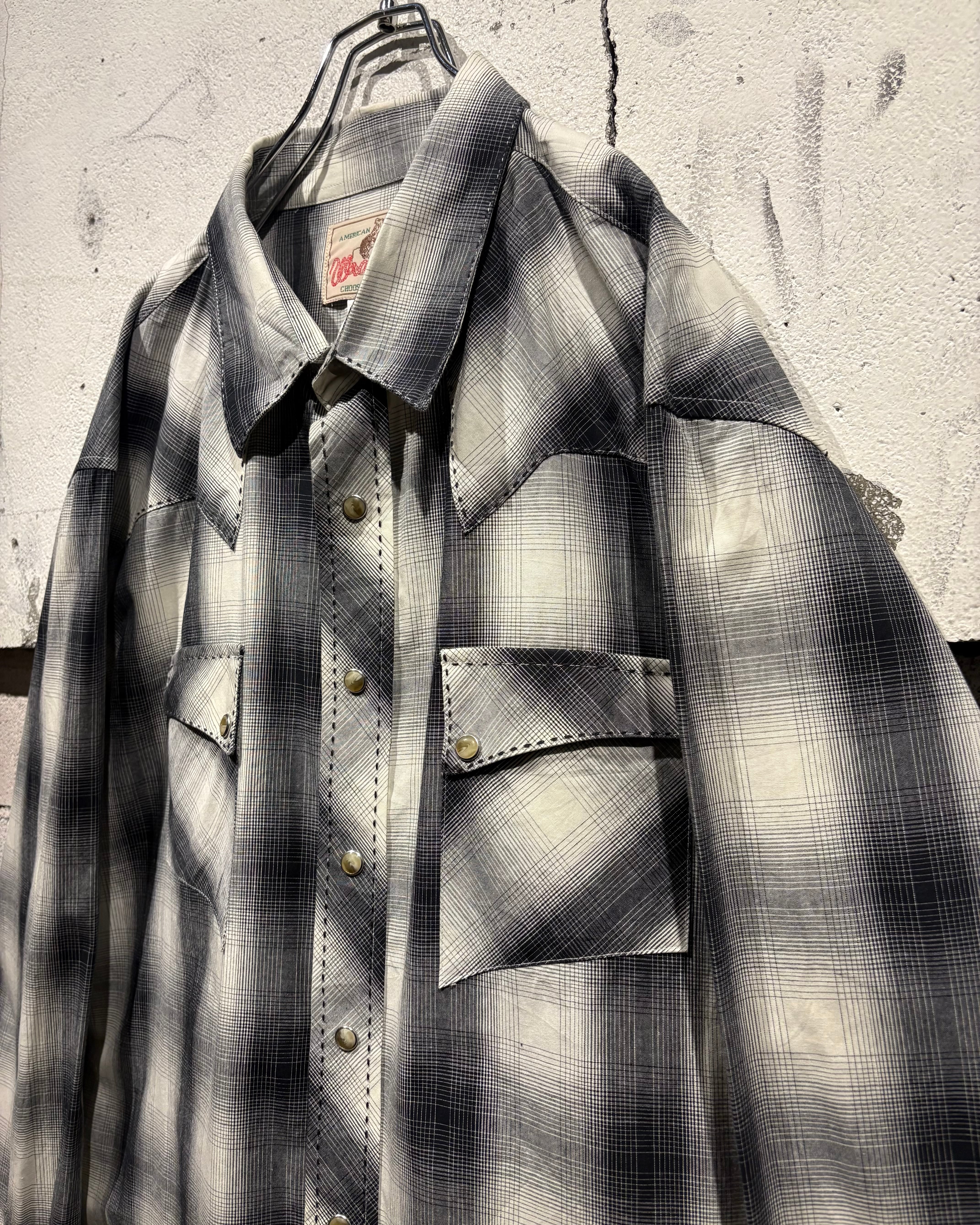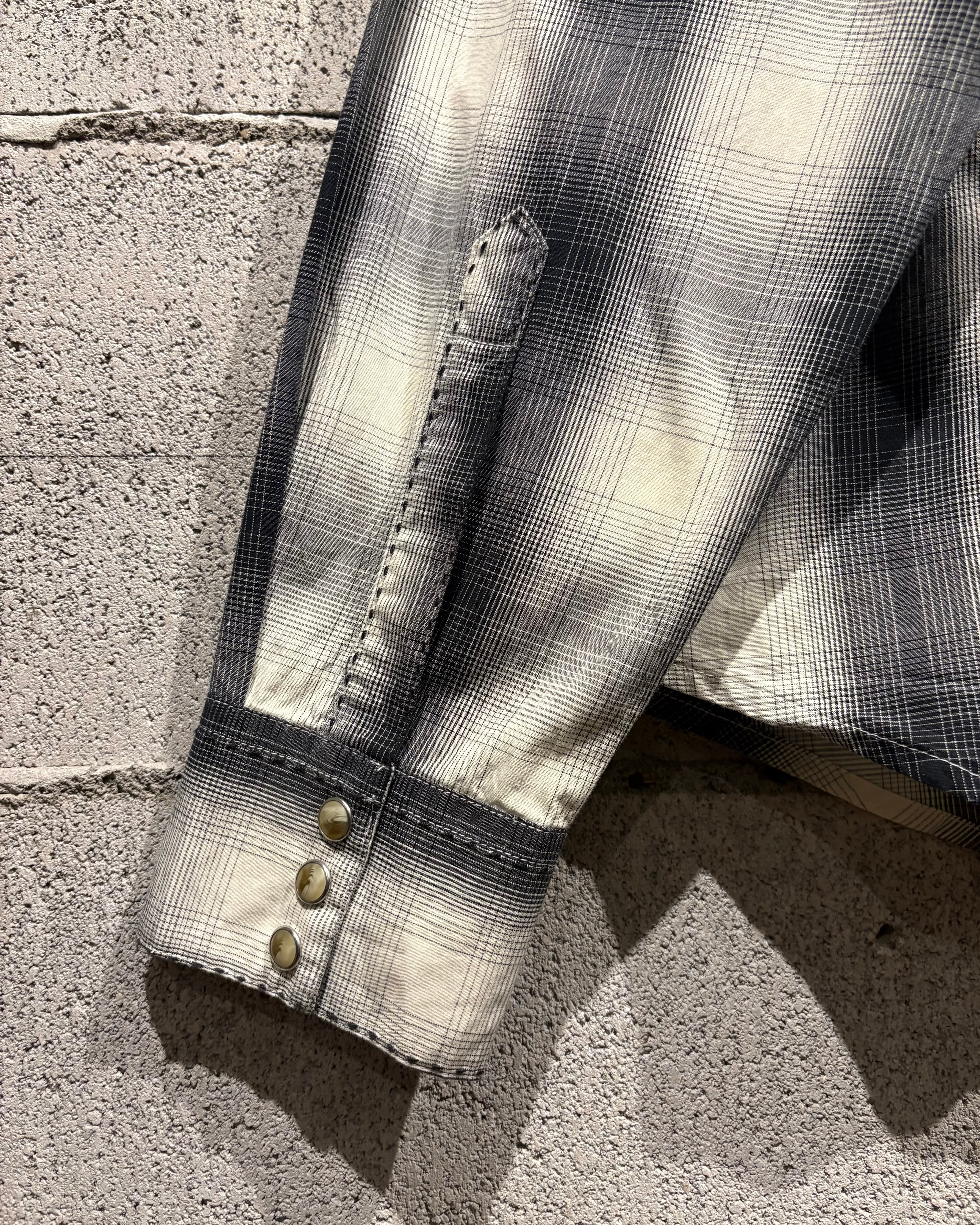 ブラックからグレー、そして淡いホワイトへと滑らかにフェードしていくオンブレチェックが美しく、無骨な印象を持つウエスタンシャツに、どこかストリートな空気感を与えるデザインバランスが◎