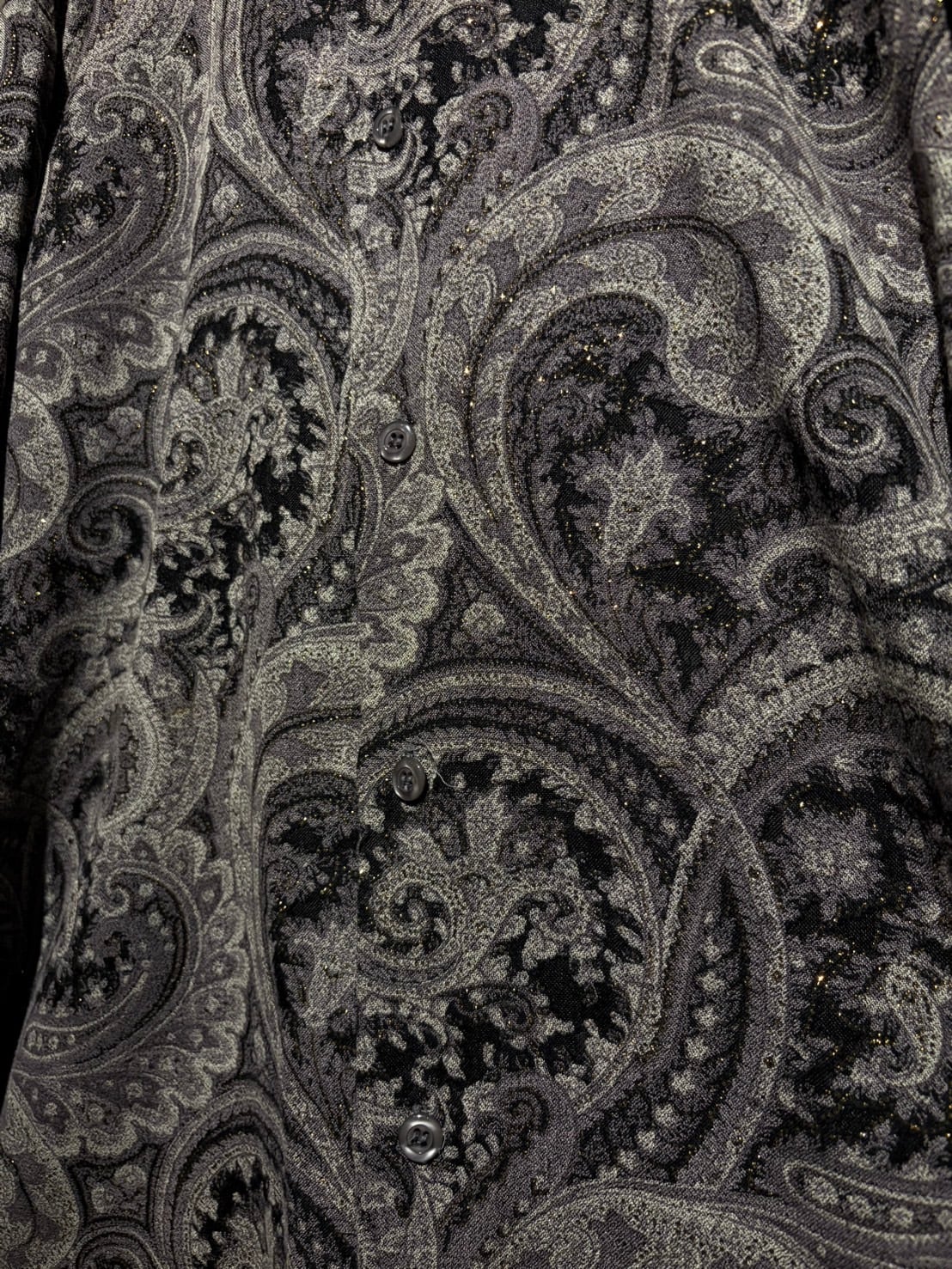 繊細かつ非常に緻密に描かれたペイズリー柄に、随所へさりげなく織り込まれたゴールドの糸が光の当たり方で仄かに煌めき、奥行きと立体感を生み出しています。