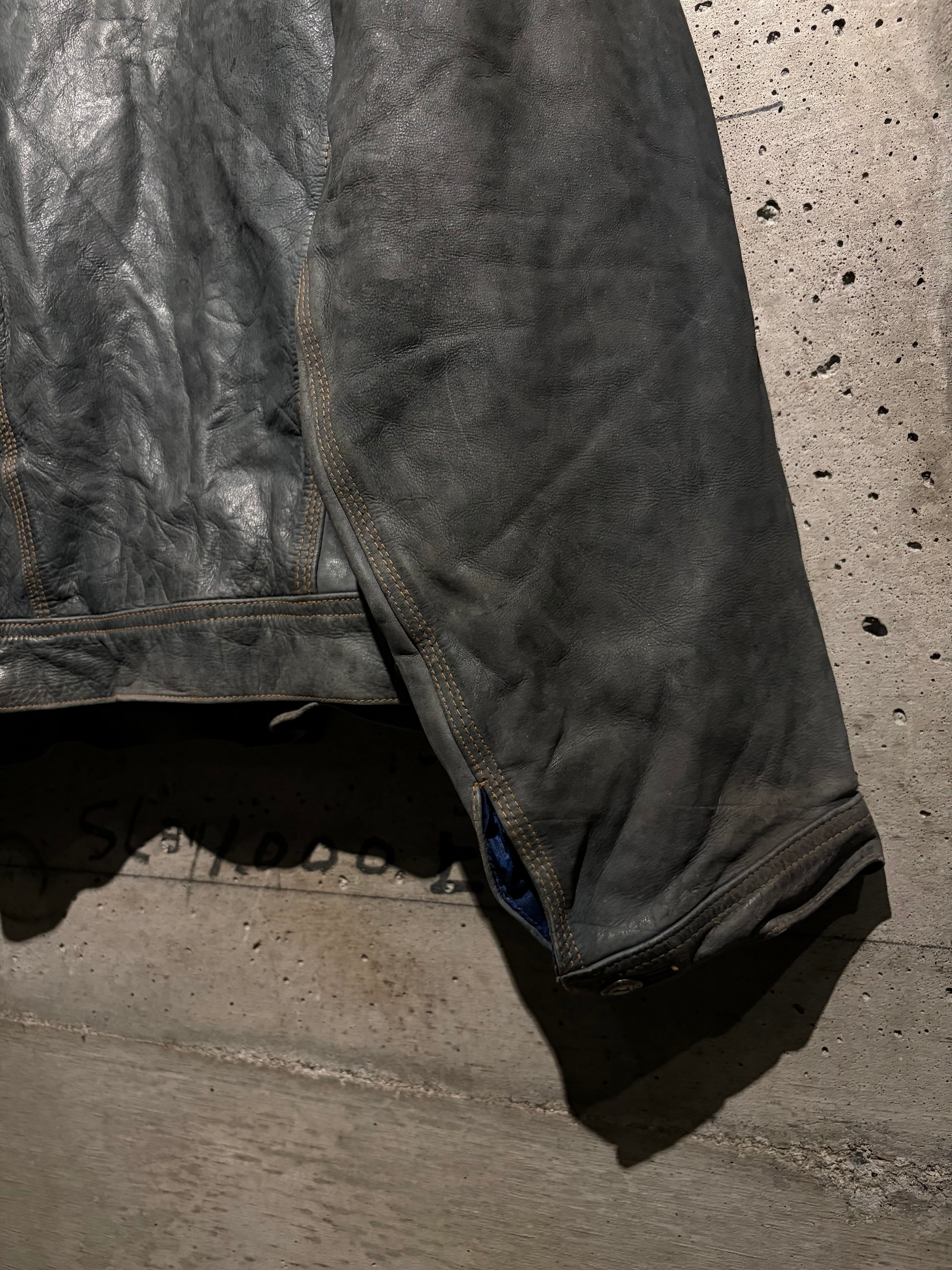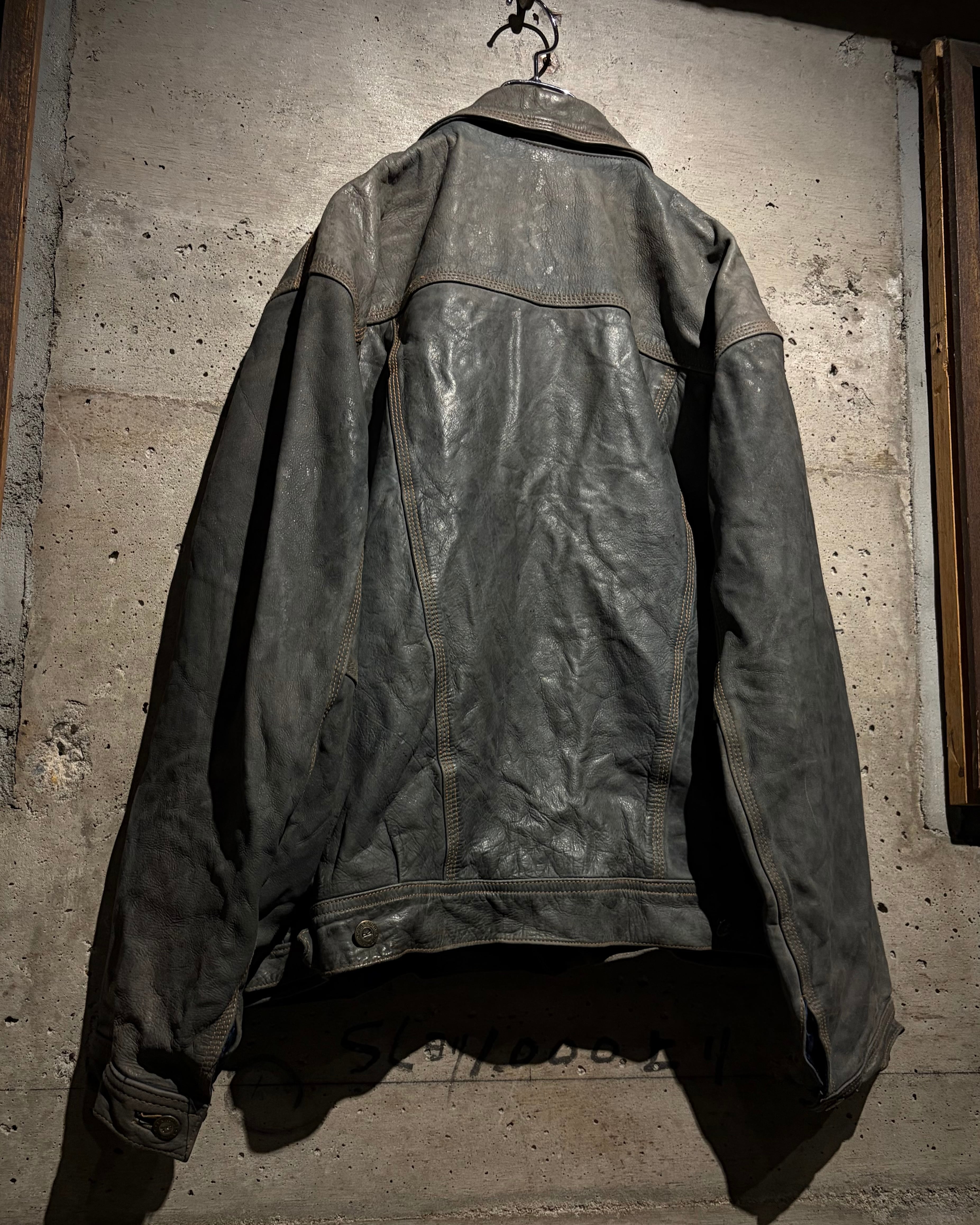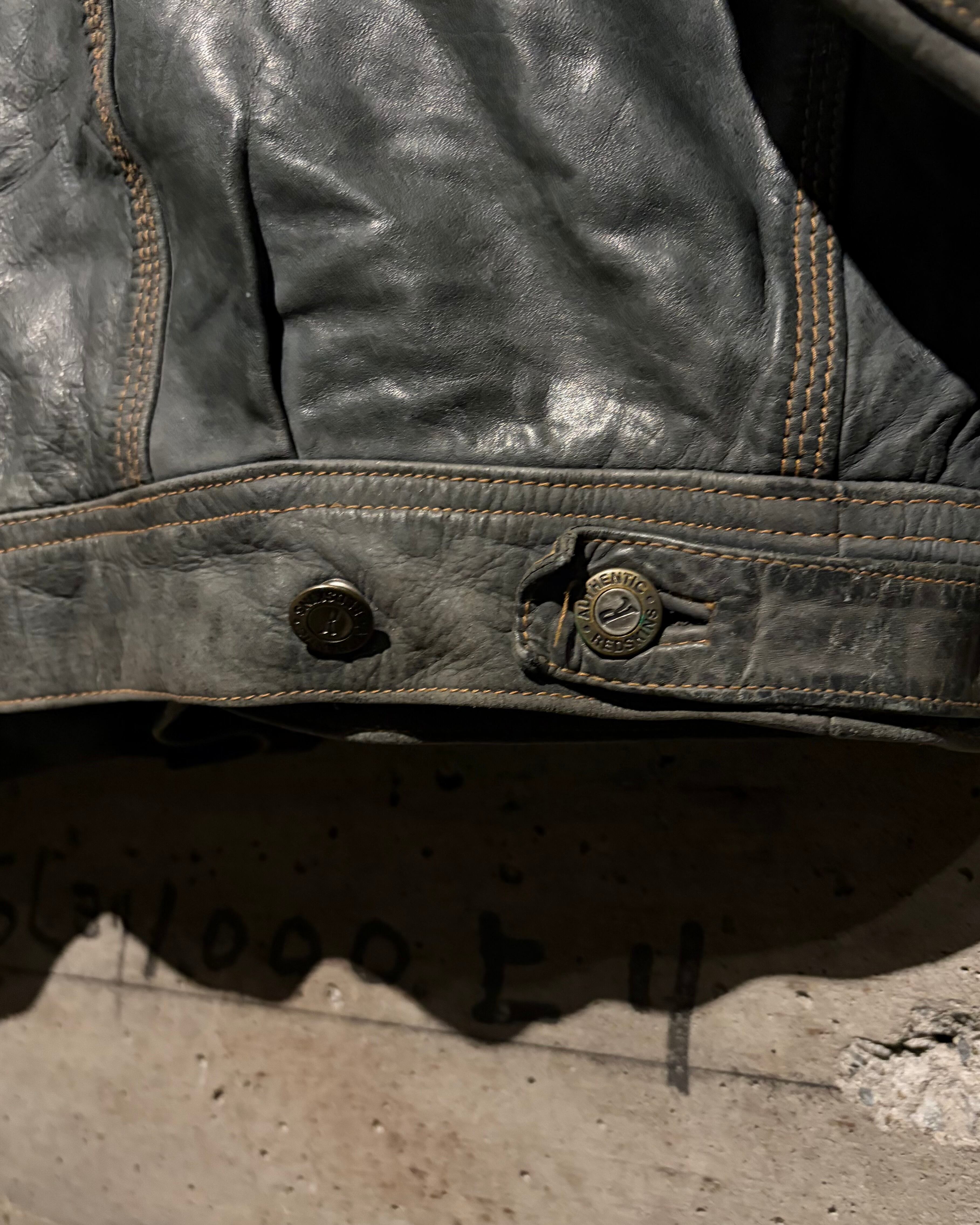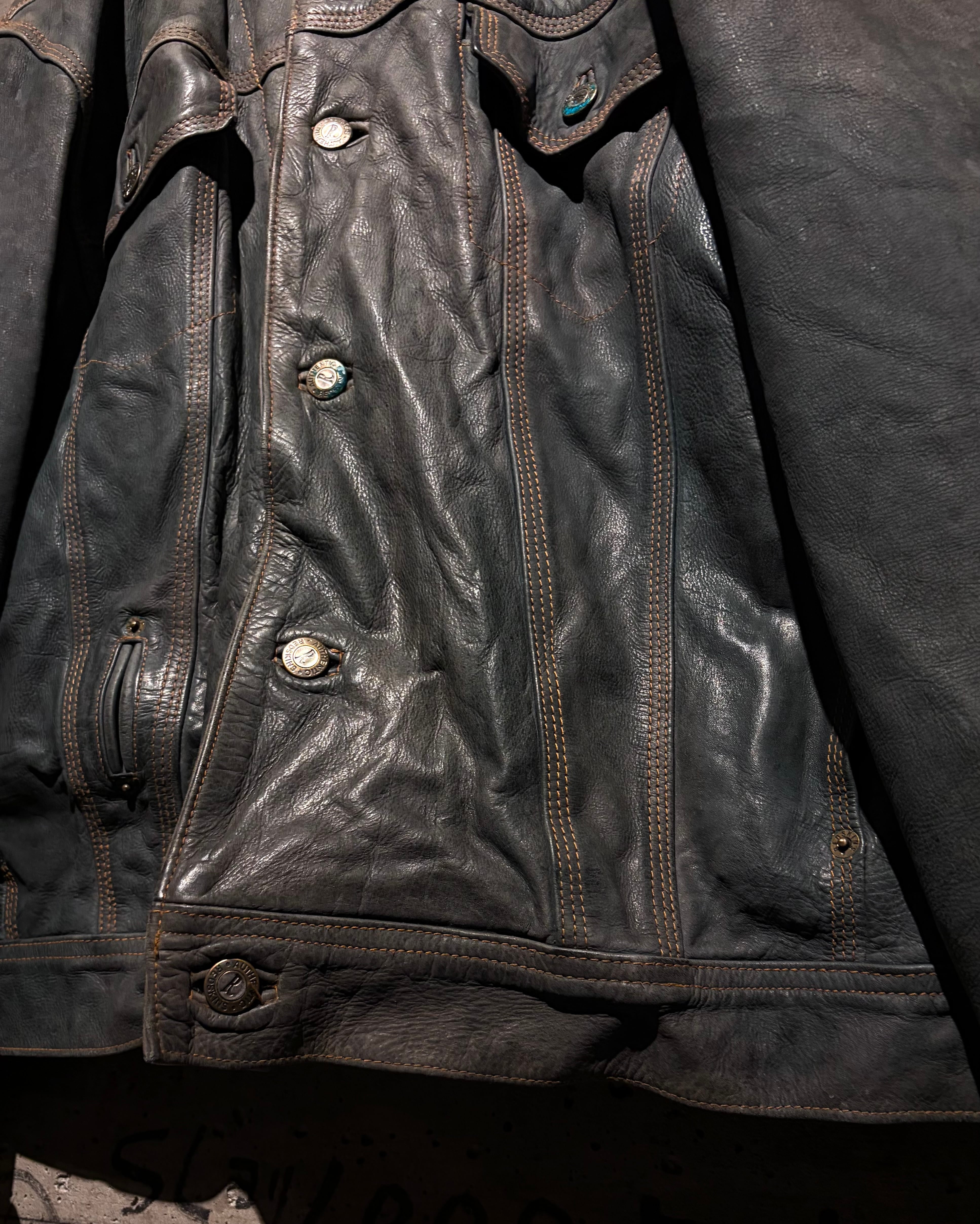 フロントはボタン仕様、胸元にはブランドロゴの刺繍にフラップポケットや切り替え、随所に走るブラウンのトリプルステッチが立体感を強調。トラッカー型の王道ディテールを踏襲しながらも、レザー特有の重厚さと無骨さが際立つ1着に仕上がっています。