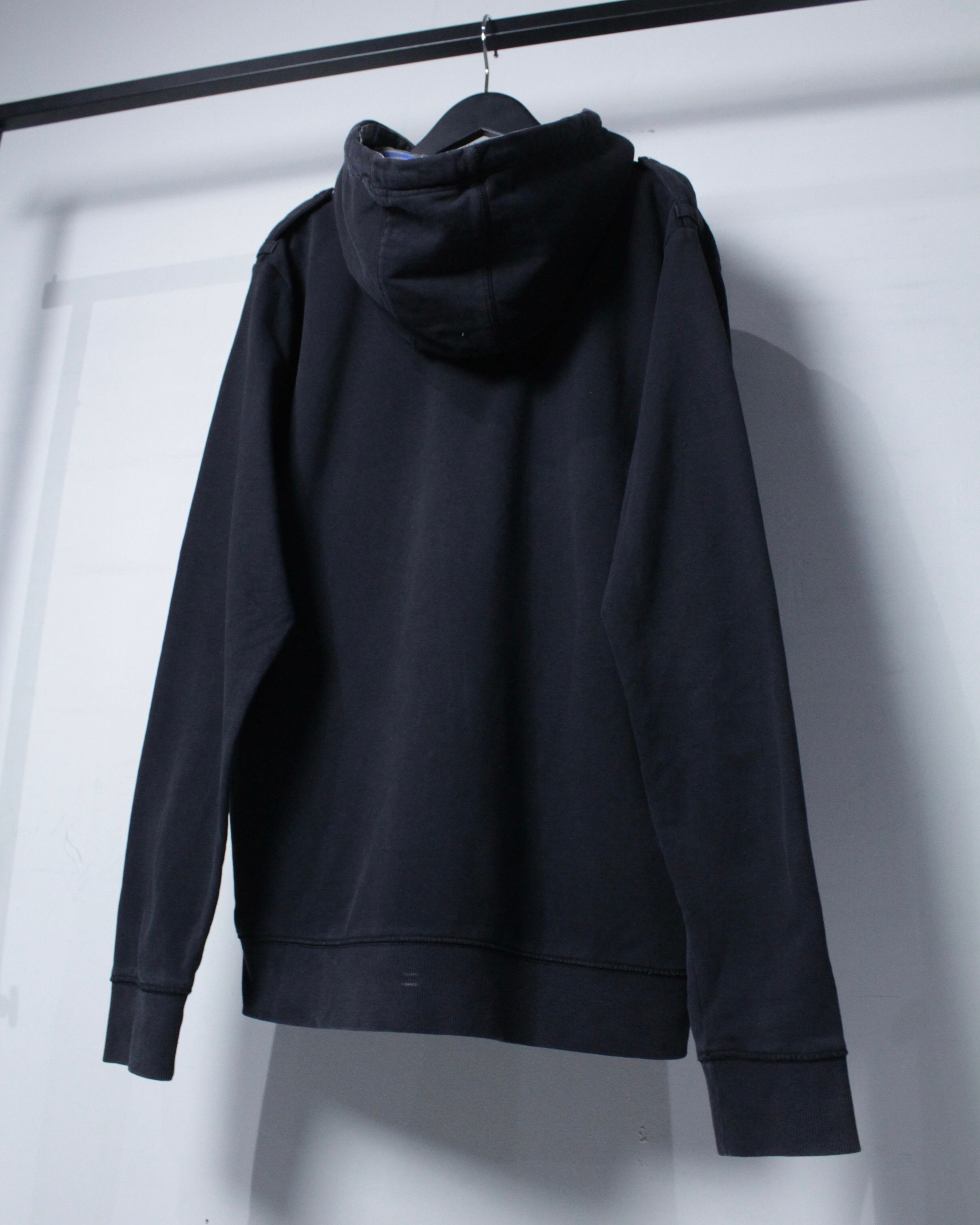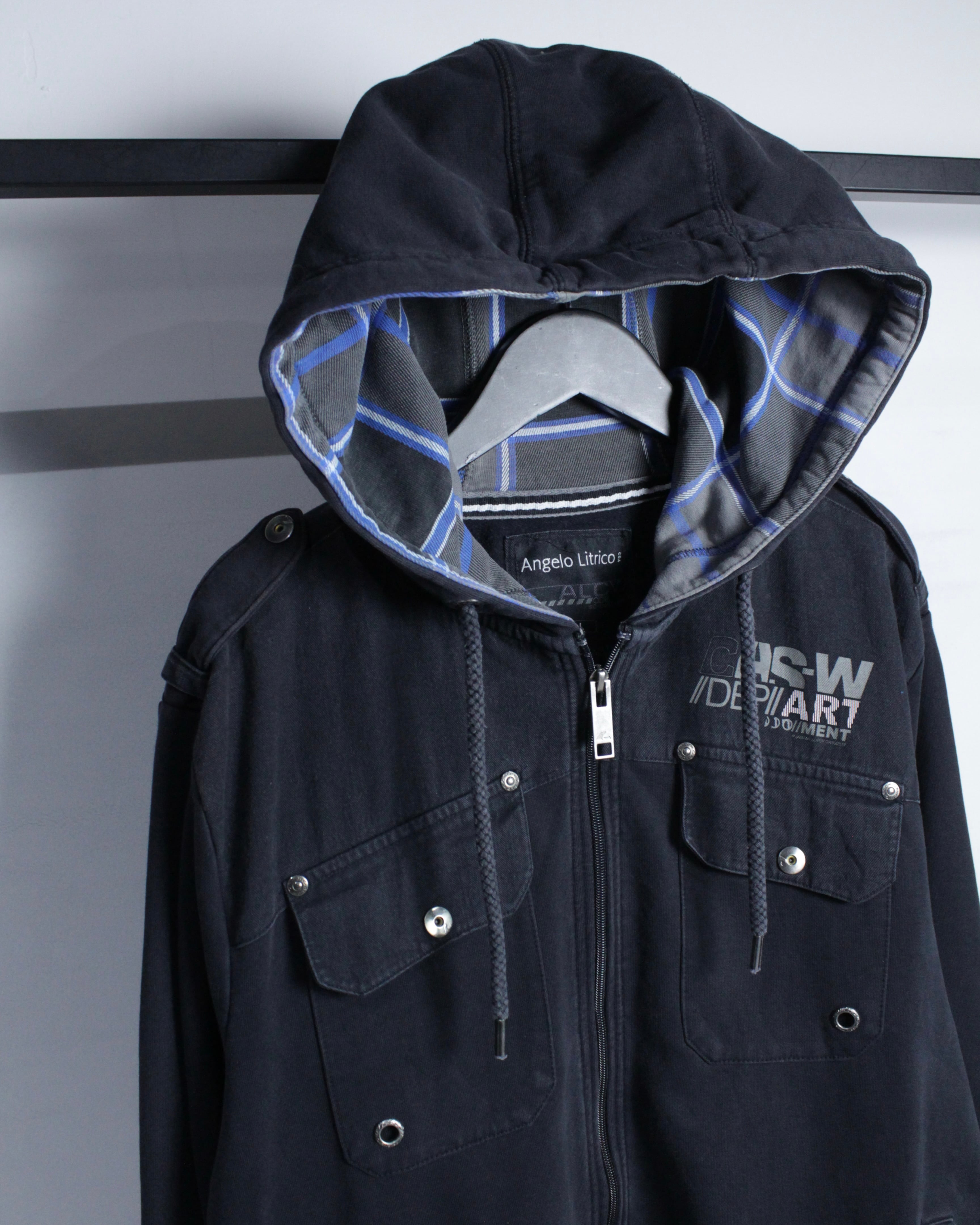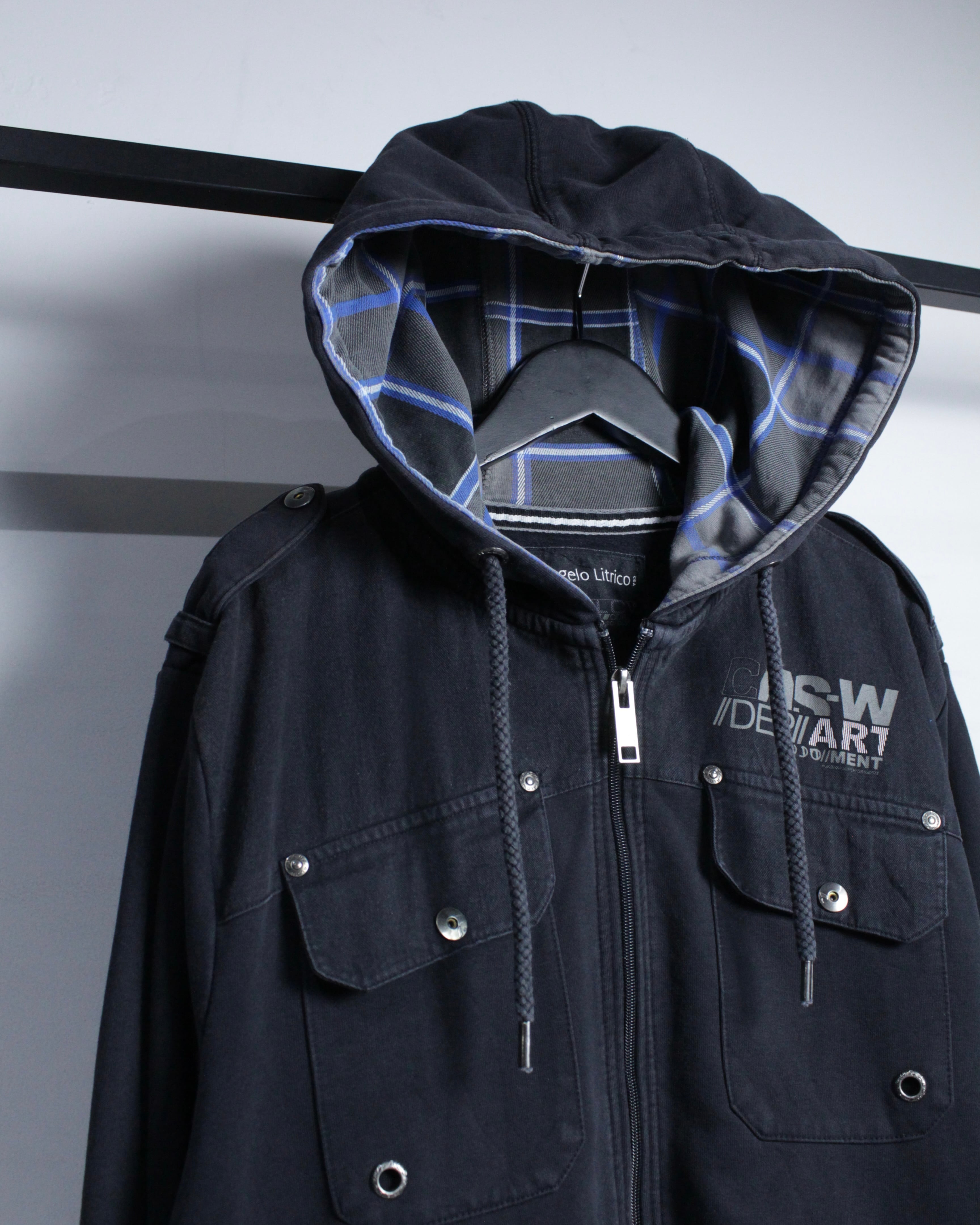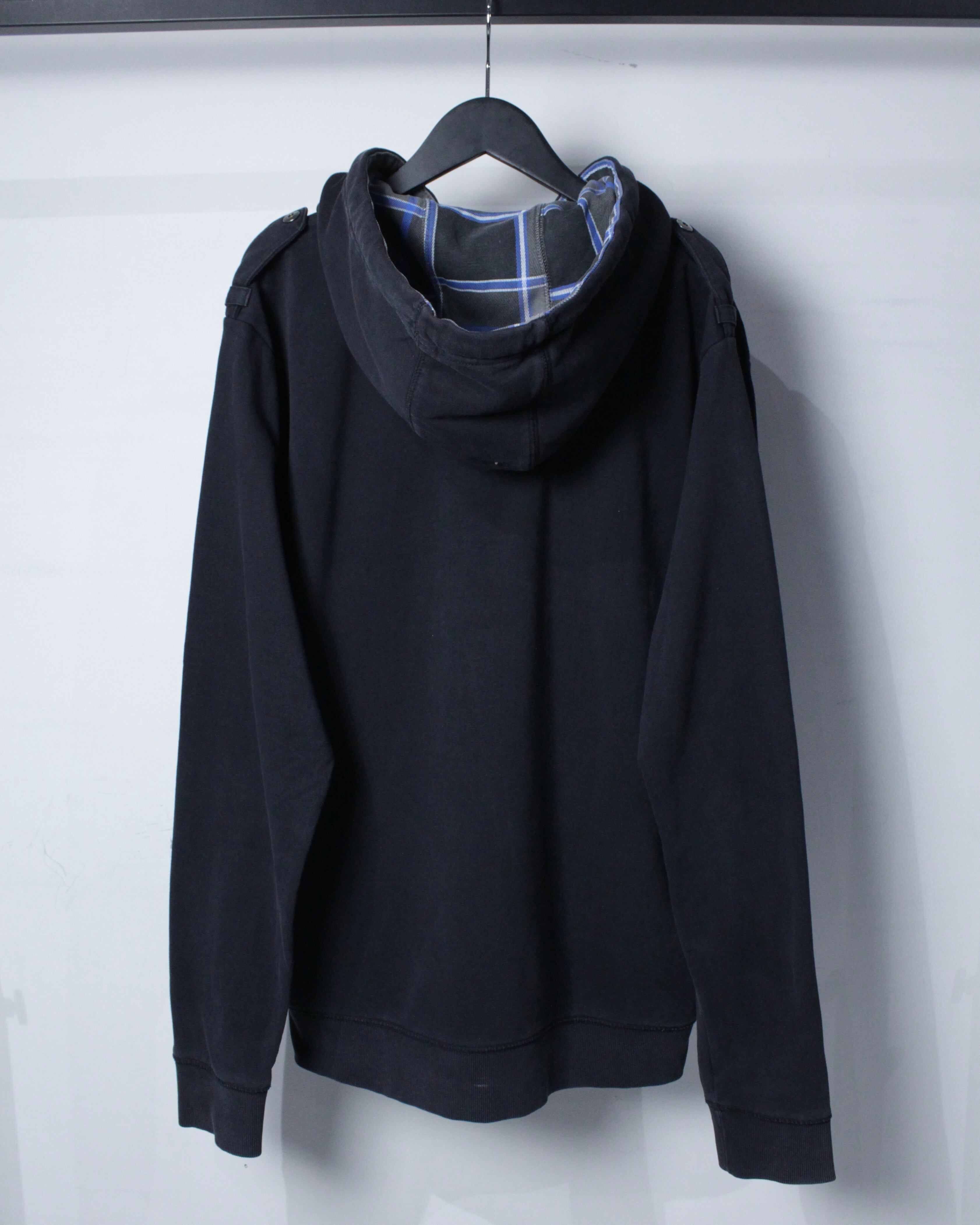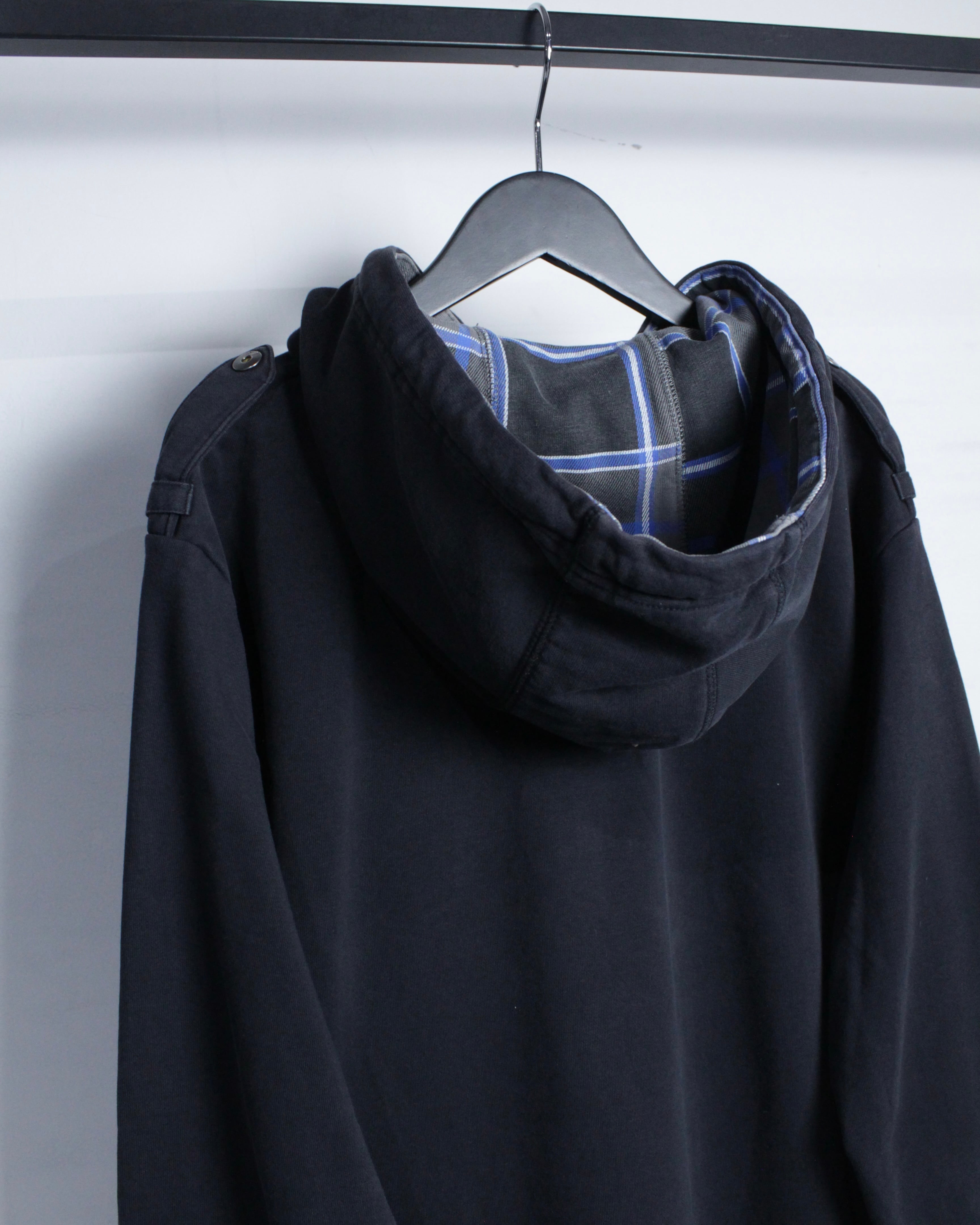 フード裏地にはブルー×ホワイトのチェック地を配し、フード裏から覗くコントラストがスタイリングにさりげないアクセントをプラス。