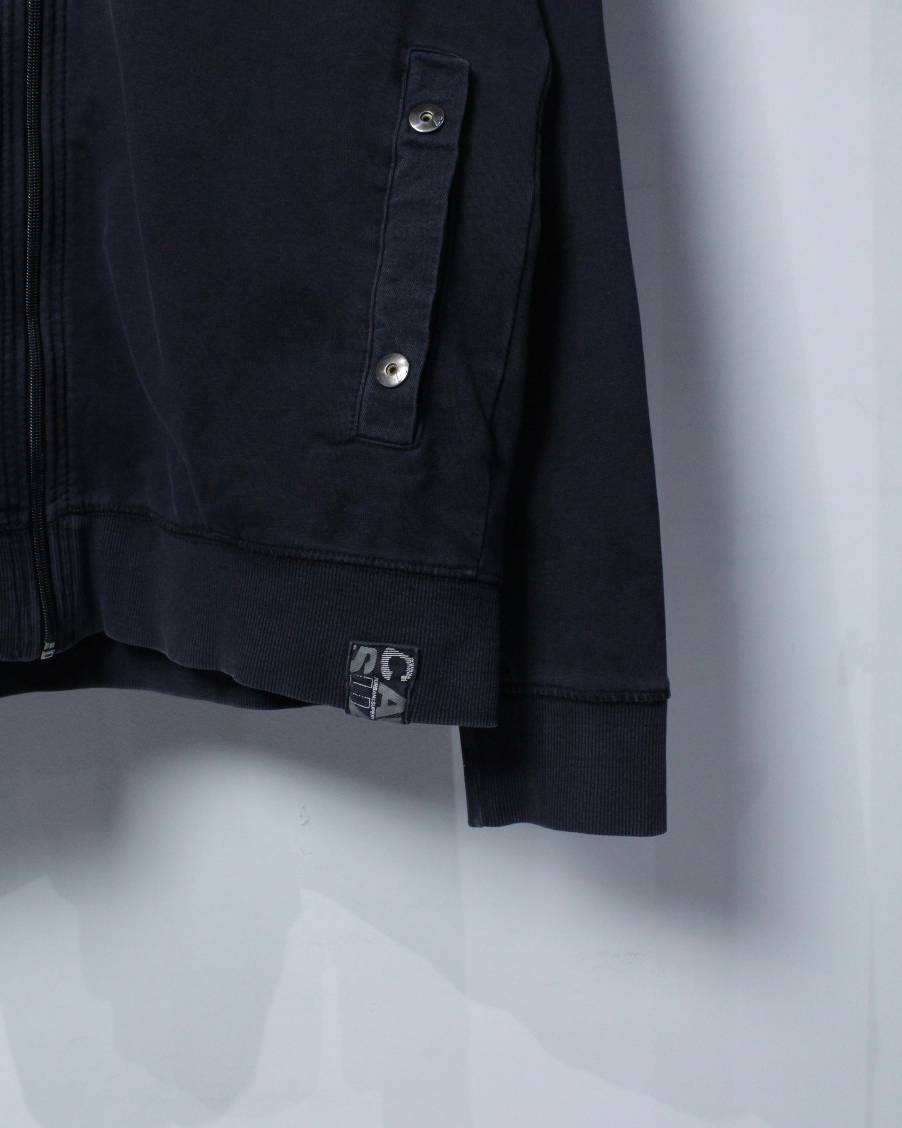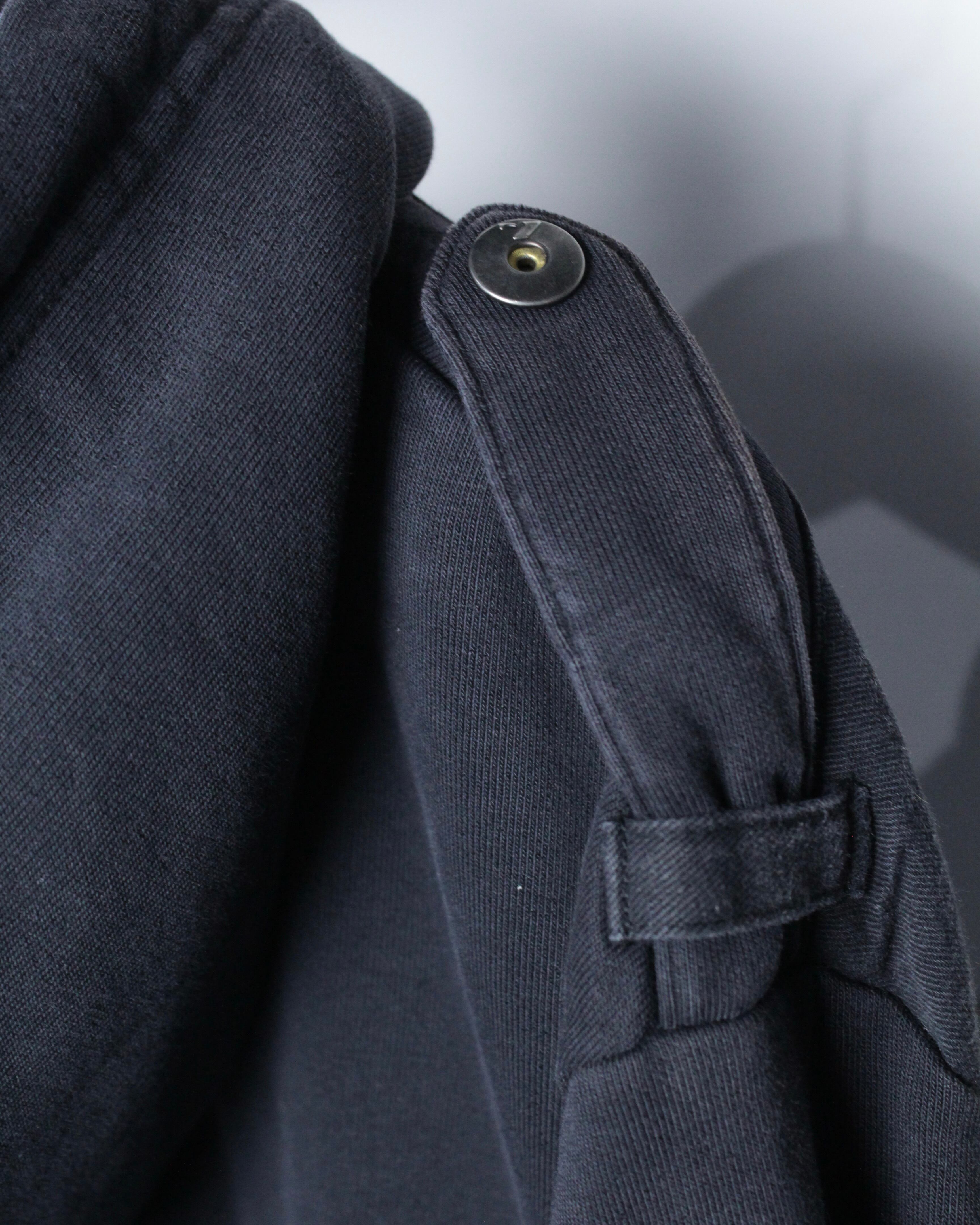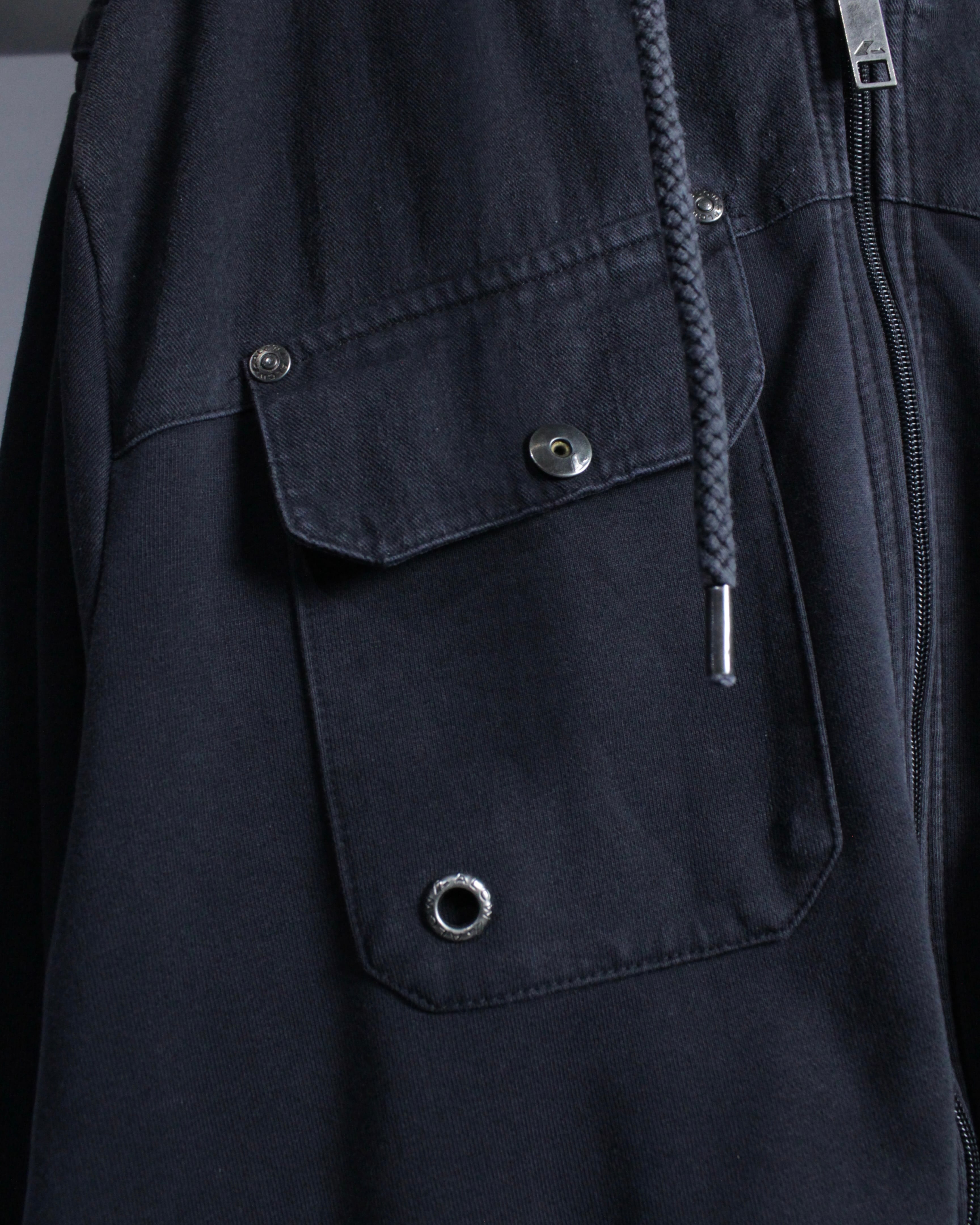 フロントはジップアップ仕様に加え、立体的なフラップポケットやメタルスナップを配置。胸元にはロゴプリントが入り、無骨な表情にストリートのエッセンスを落とし込み、デザインバランス、アプローチ共に素晴らしいですね。