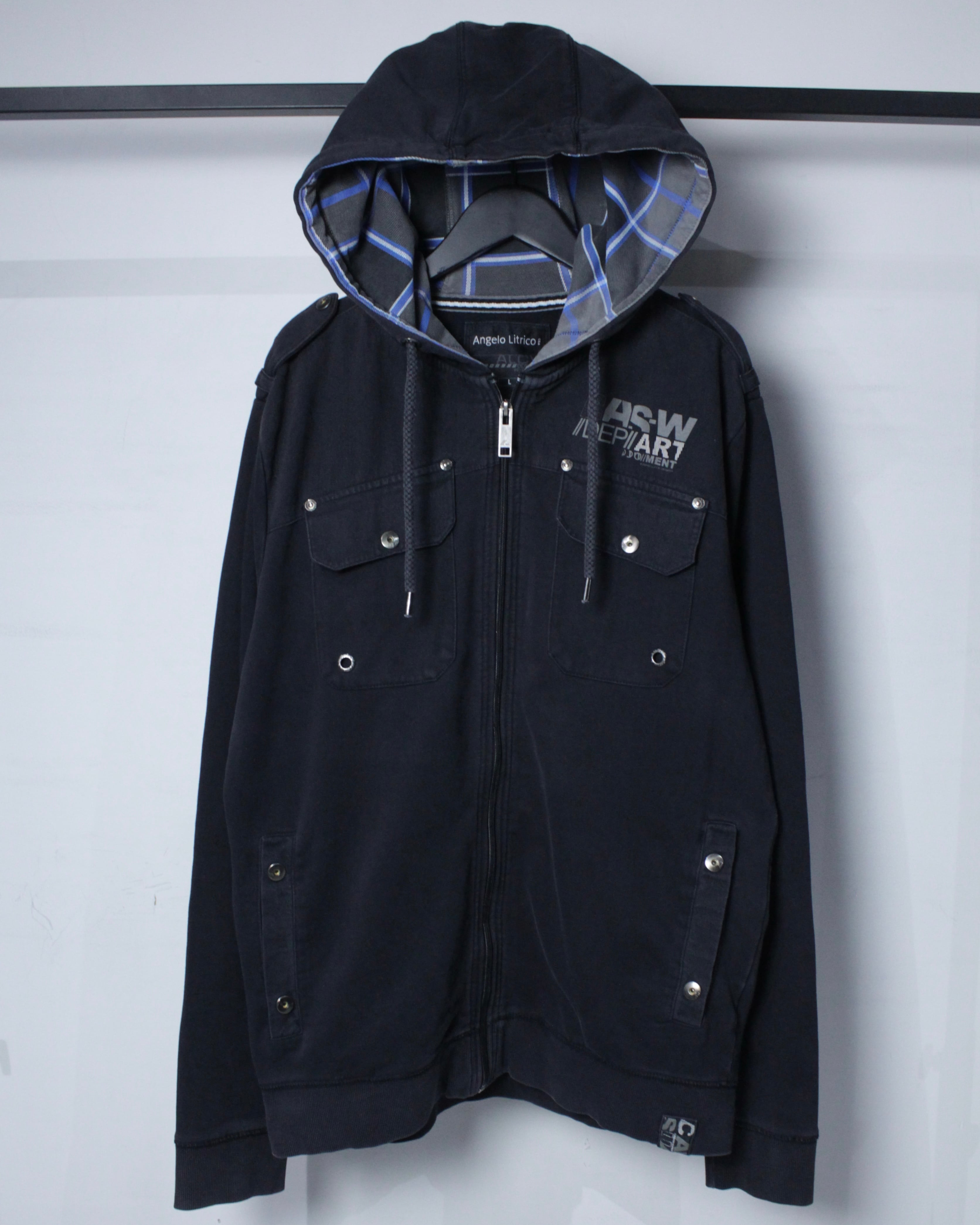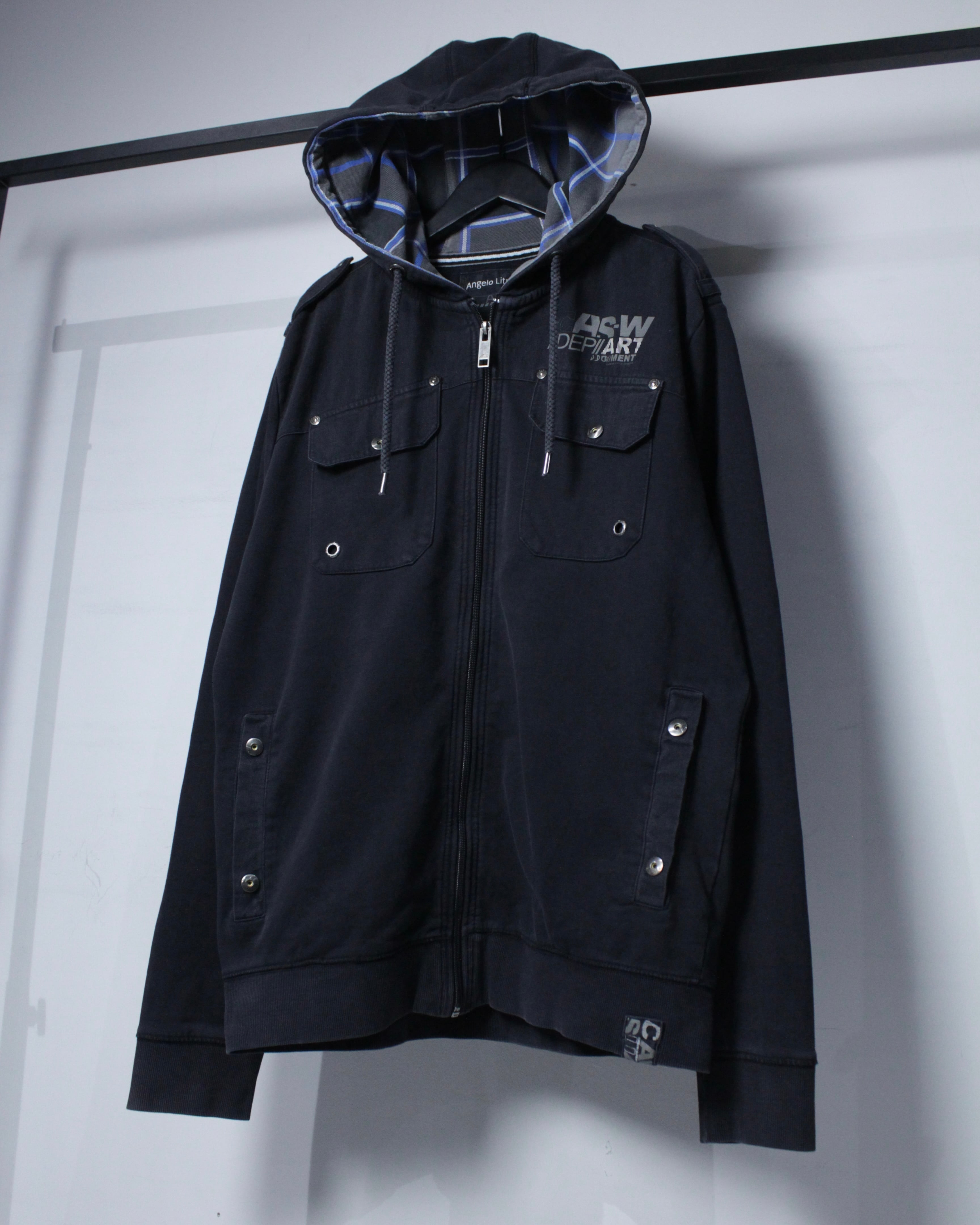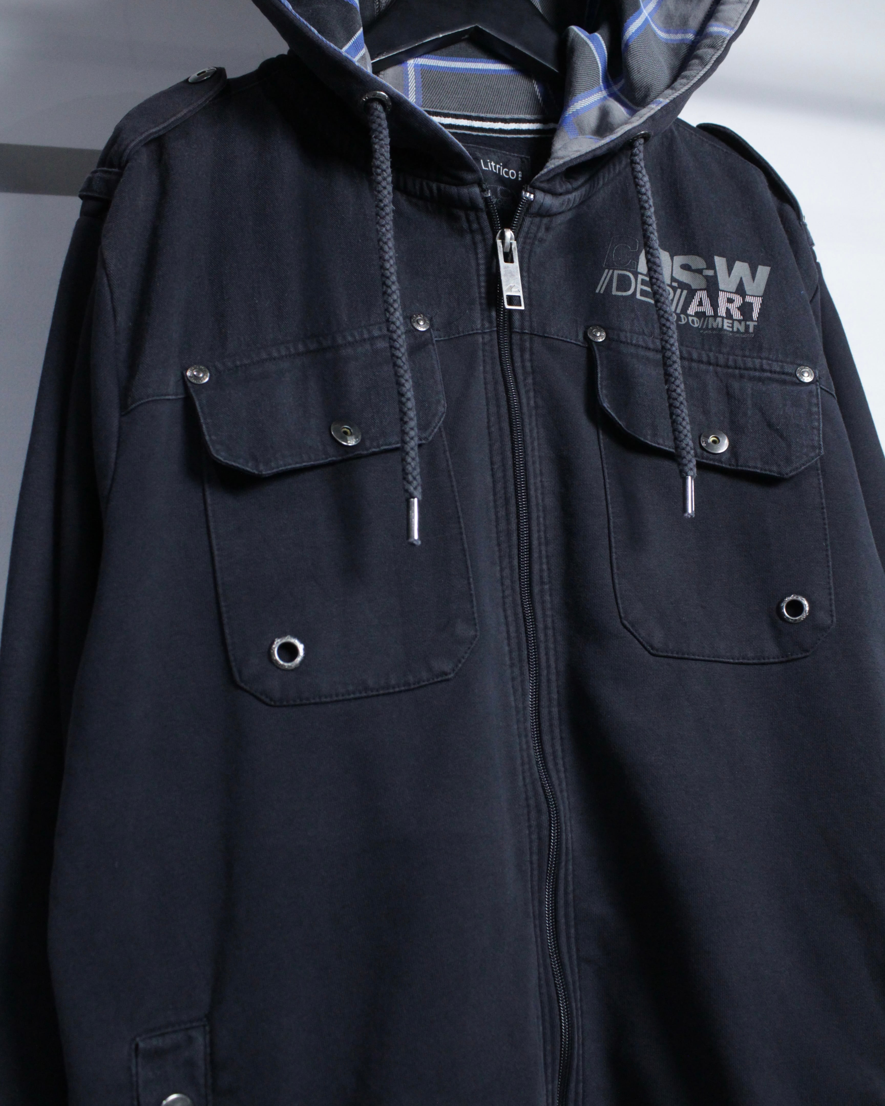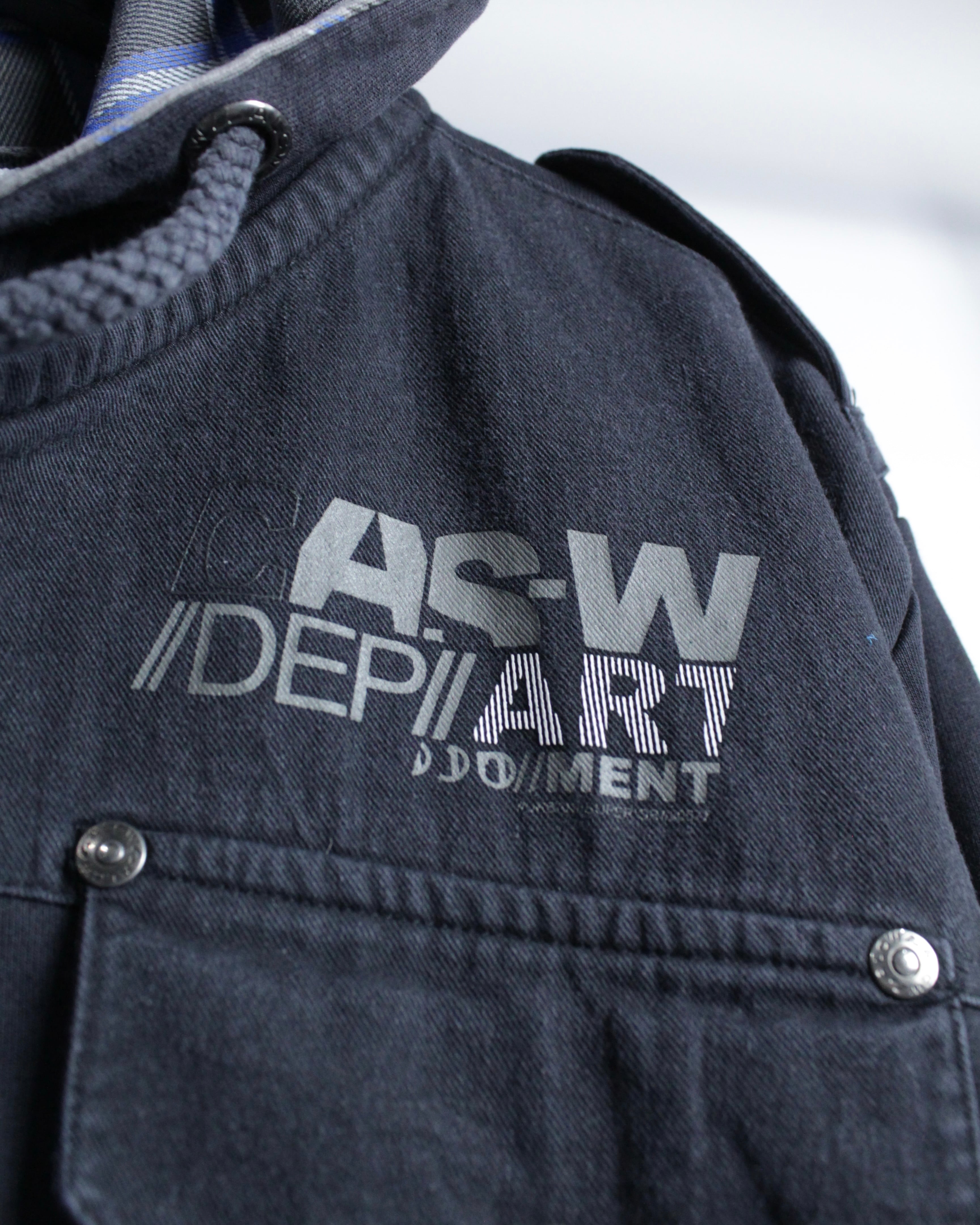 フロントはジップアップ仕様に加え、立体的なフラップポケットやメタルスナップを配置。胸元にはロゴプリントが入り、無骨な表情にストリートのエッセンスを落とし込み、デザインバランス、アプローチ共に素晴らしいですね。