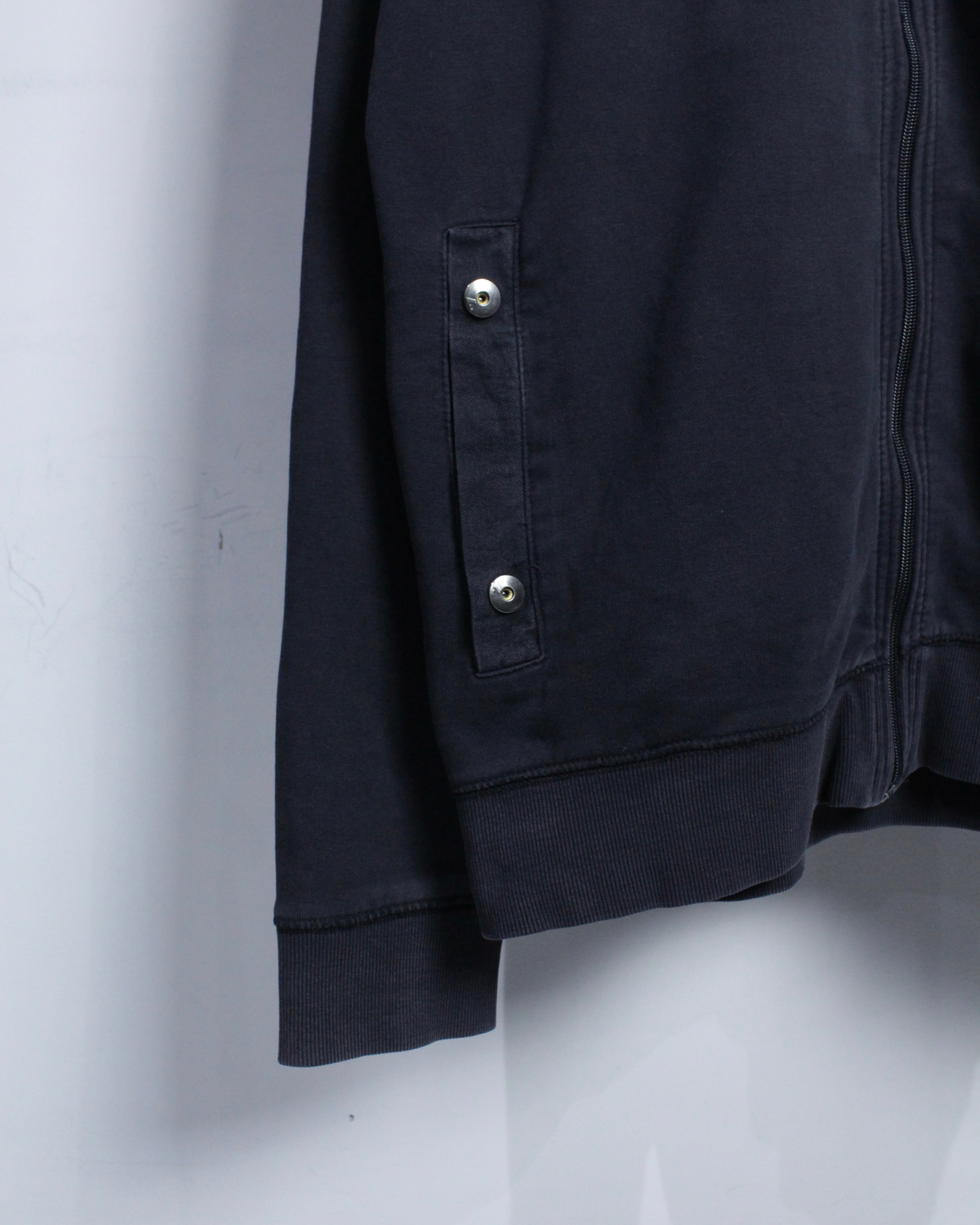 しなやかなスウェット地のボディに、コットン生地を切り替えたジップアップフーディ。