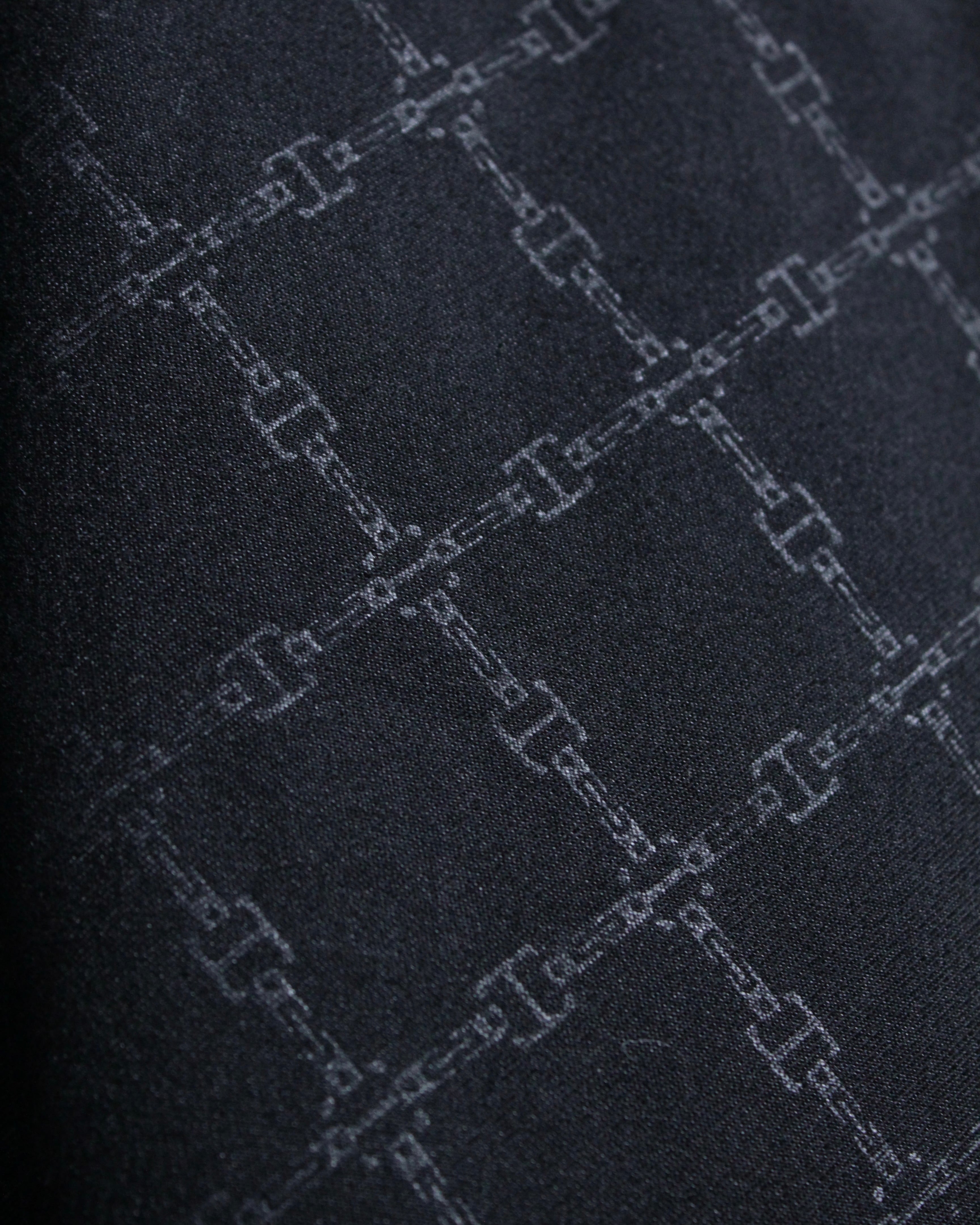 ブラックボディに同色で走らせたモノグラムパターンが印象的で、遠目にはソリッドに映りながら、光の当たり方でさりげなく浮かび上がる総柄が奥行きを演出しています。