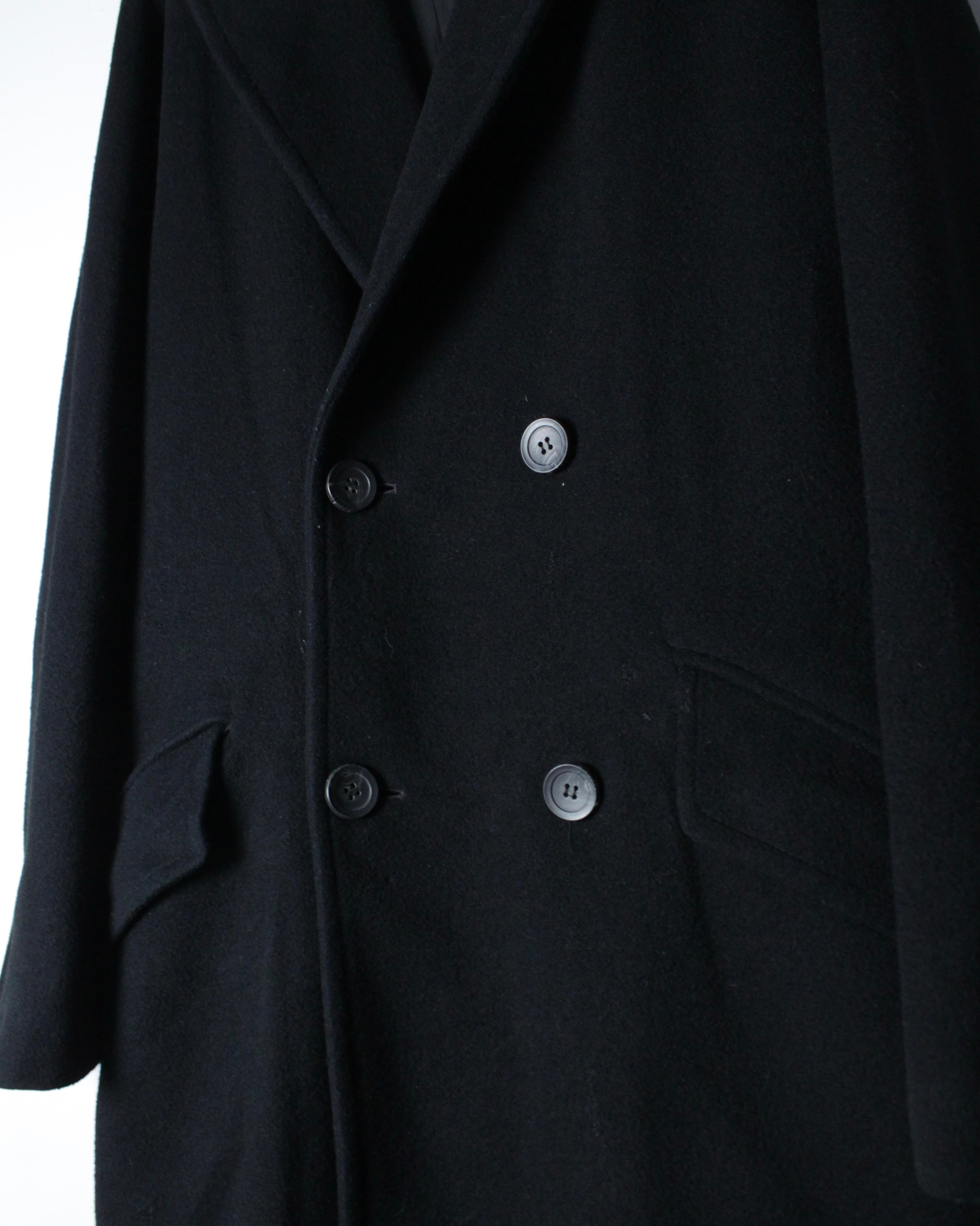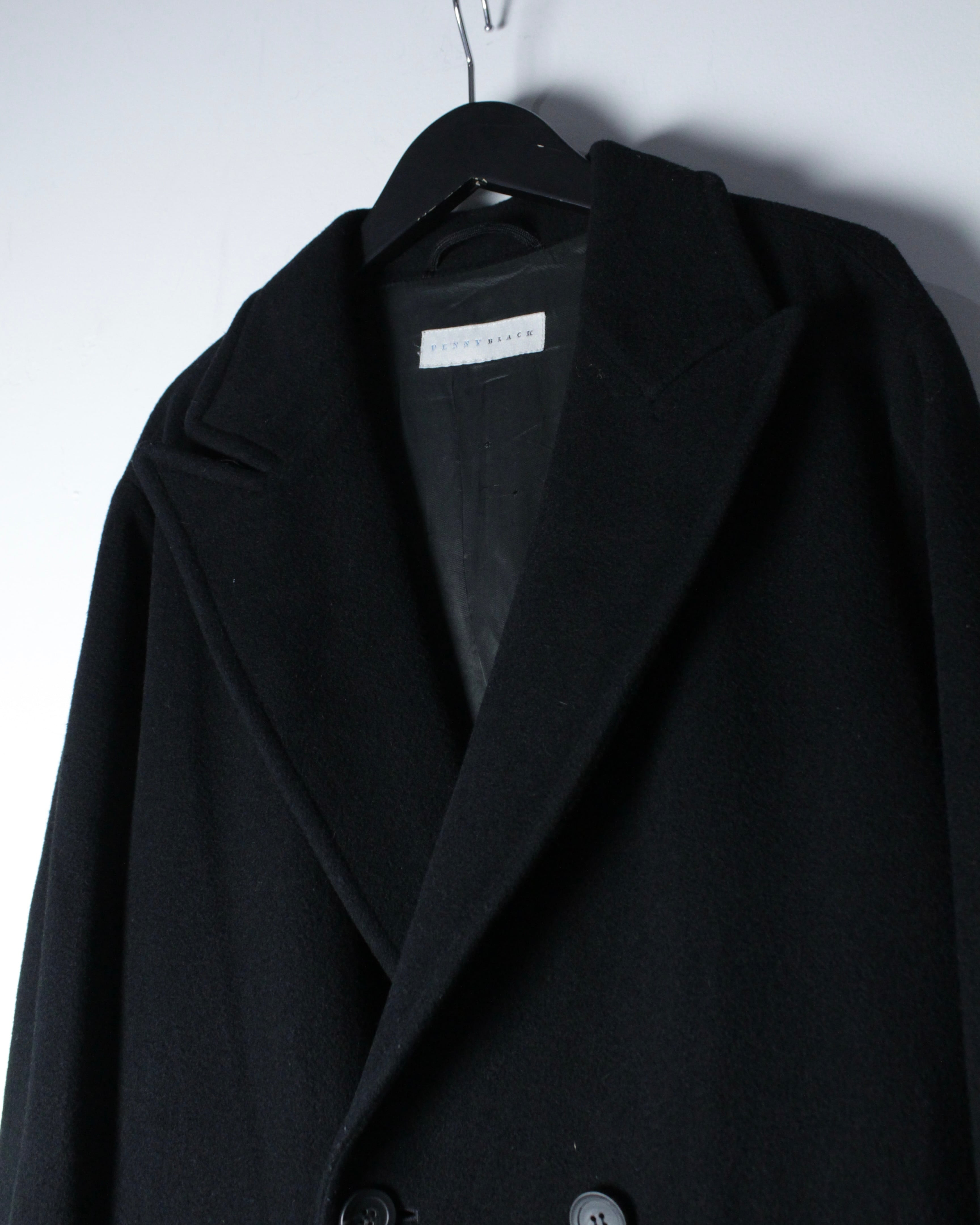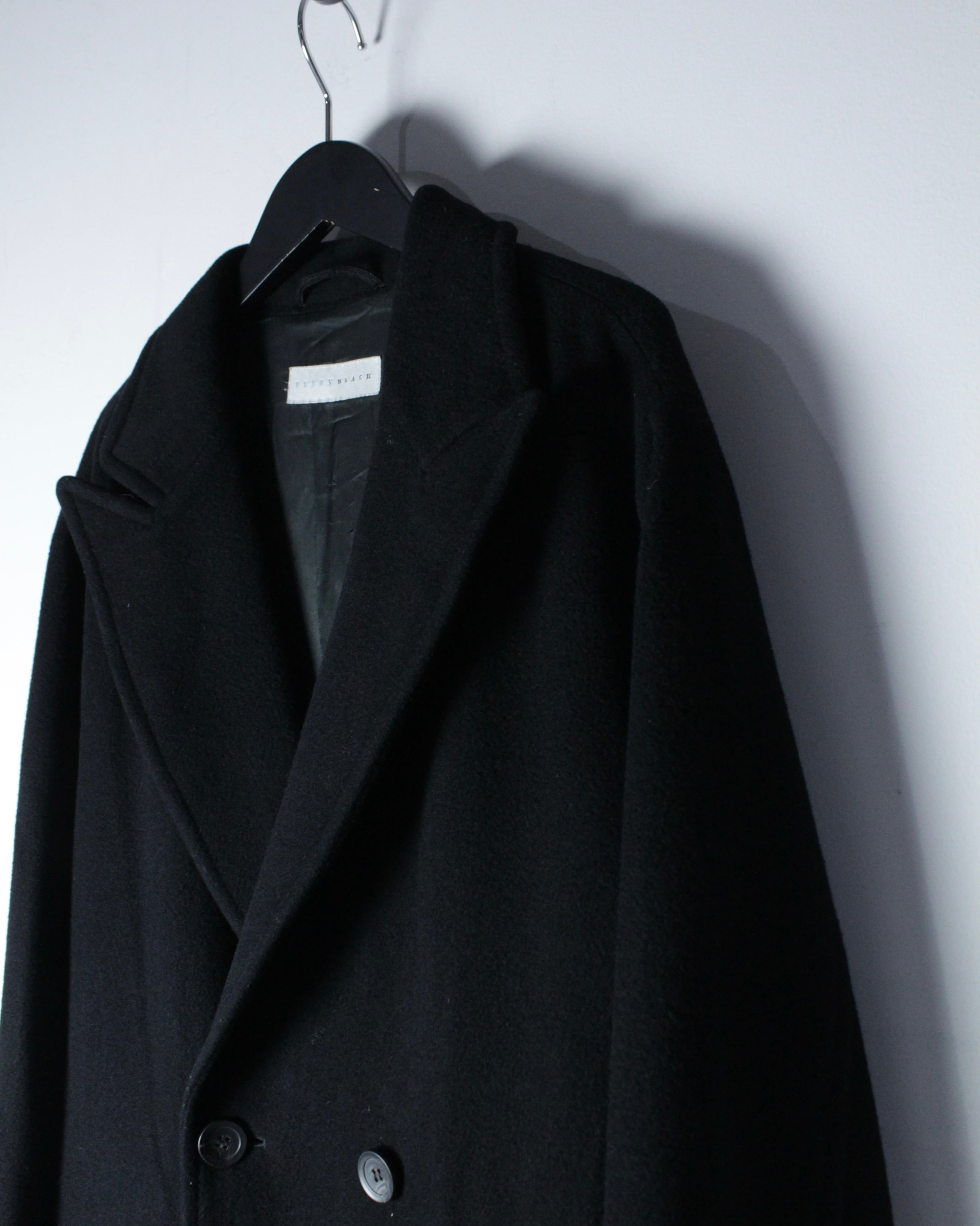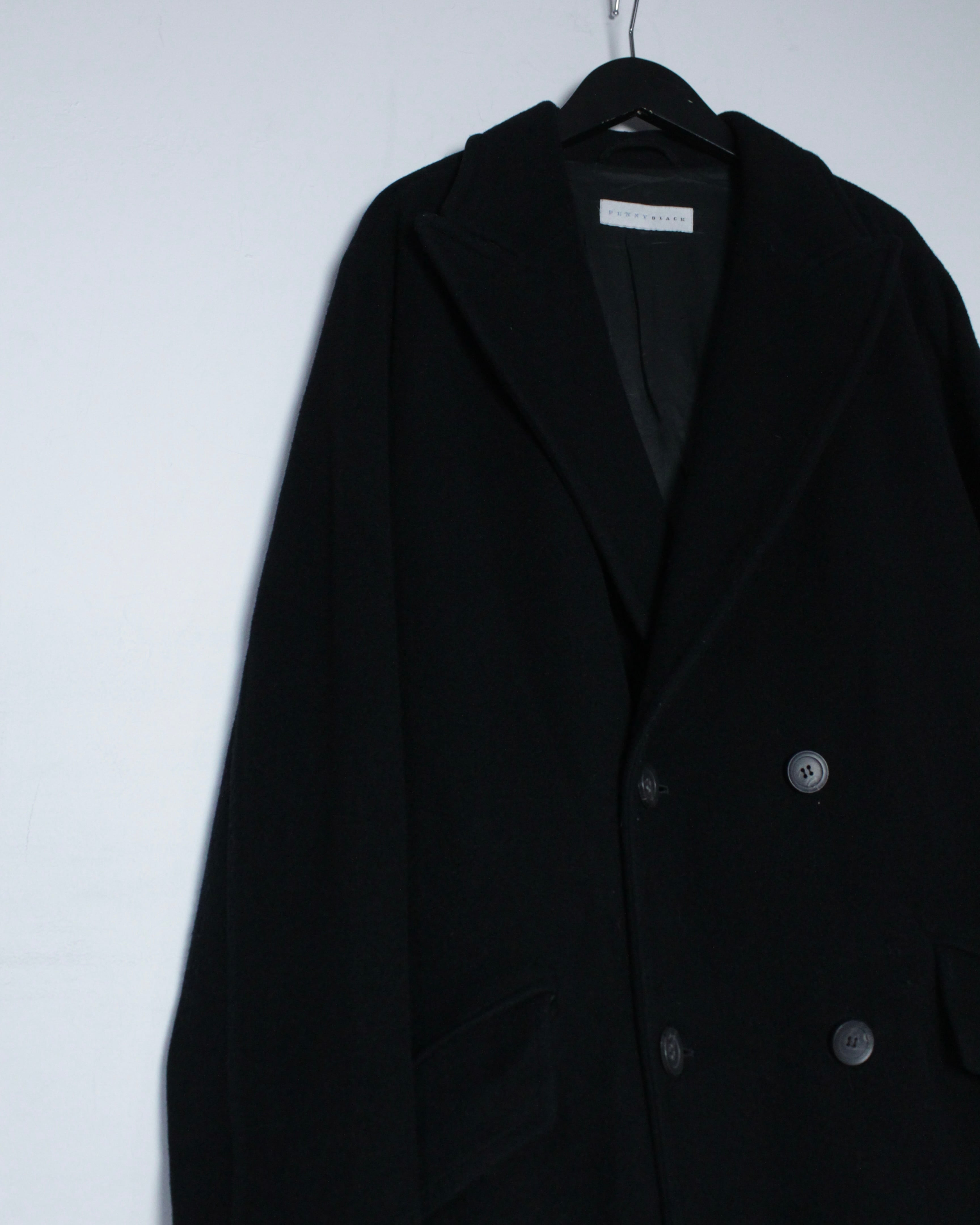 無駄を削ぎ落としたブラックボディに、ピークドラペルを採用。シャープに立ち上がるラペルのラインが顔まわりに立体感を与え、クラシックなダブルブレスト仕様と相まって凛とした佇まいに仕上がっています。