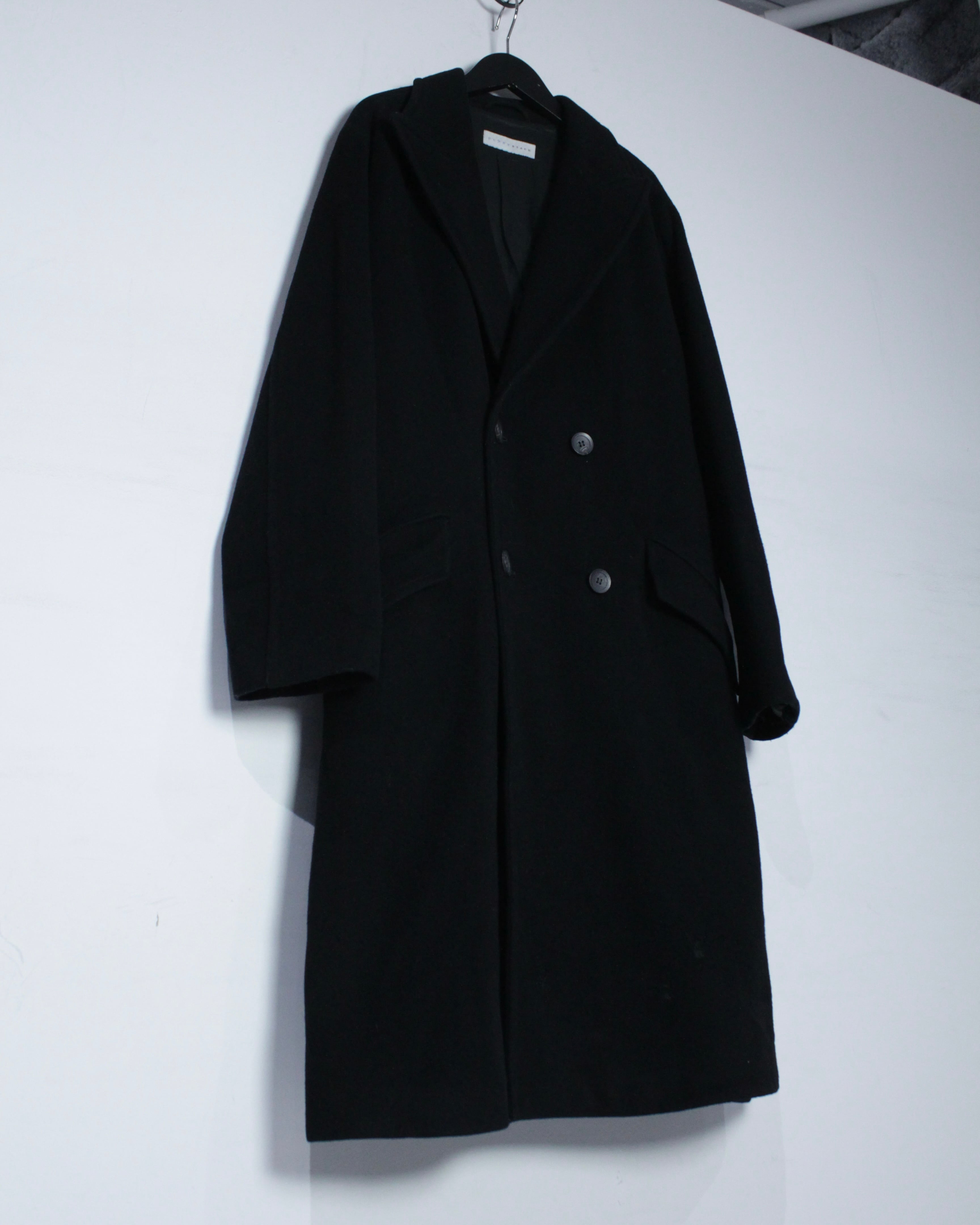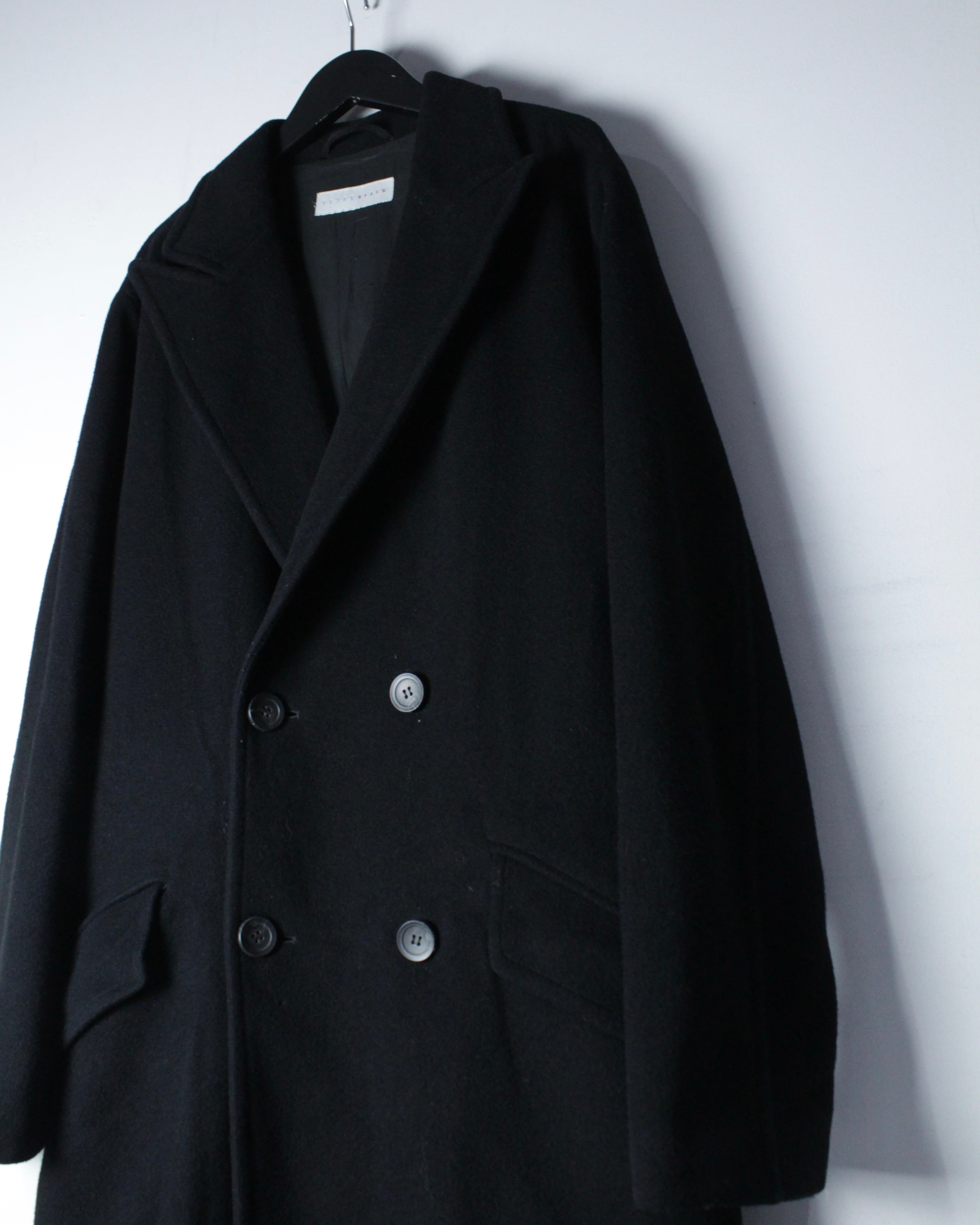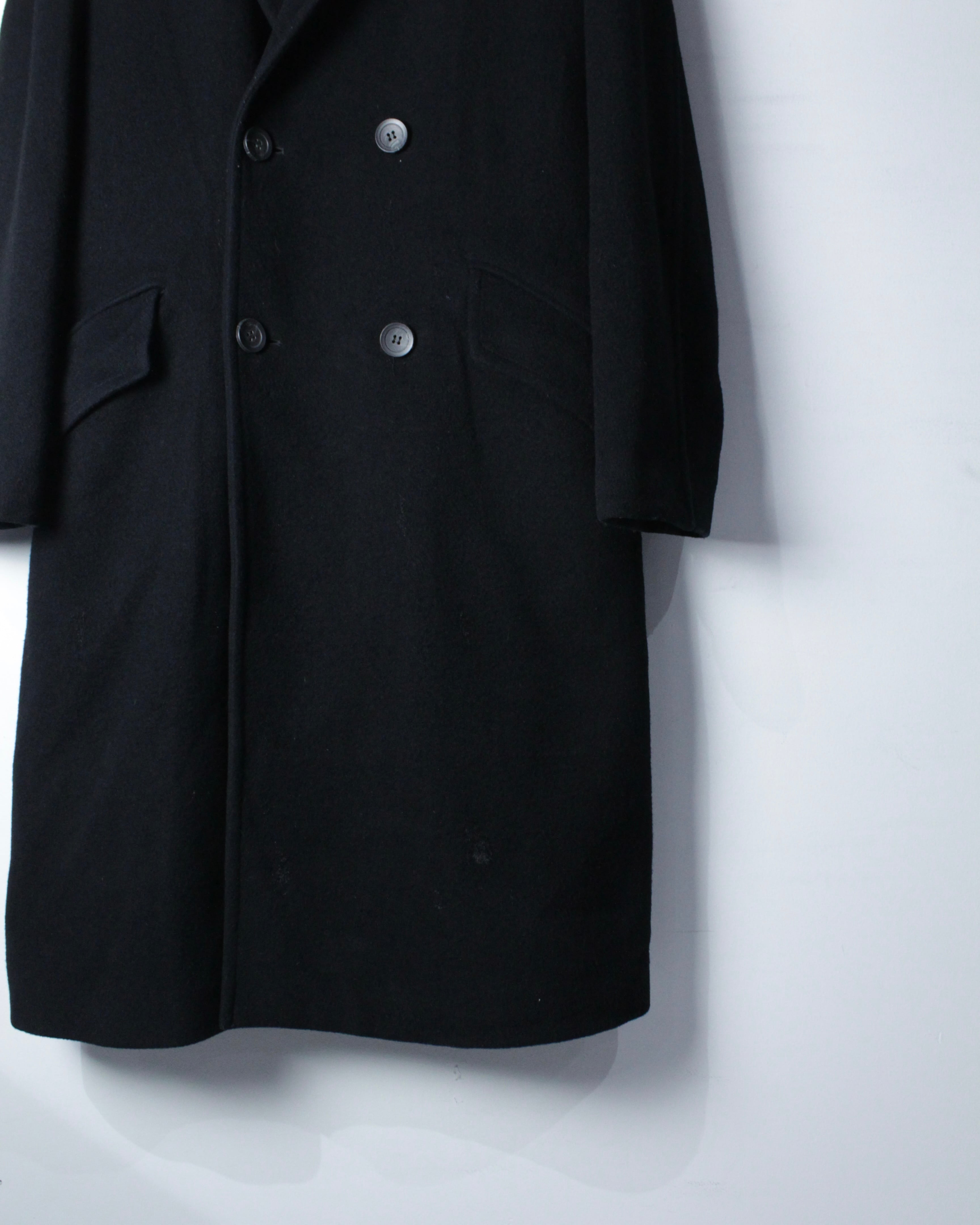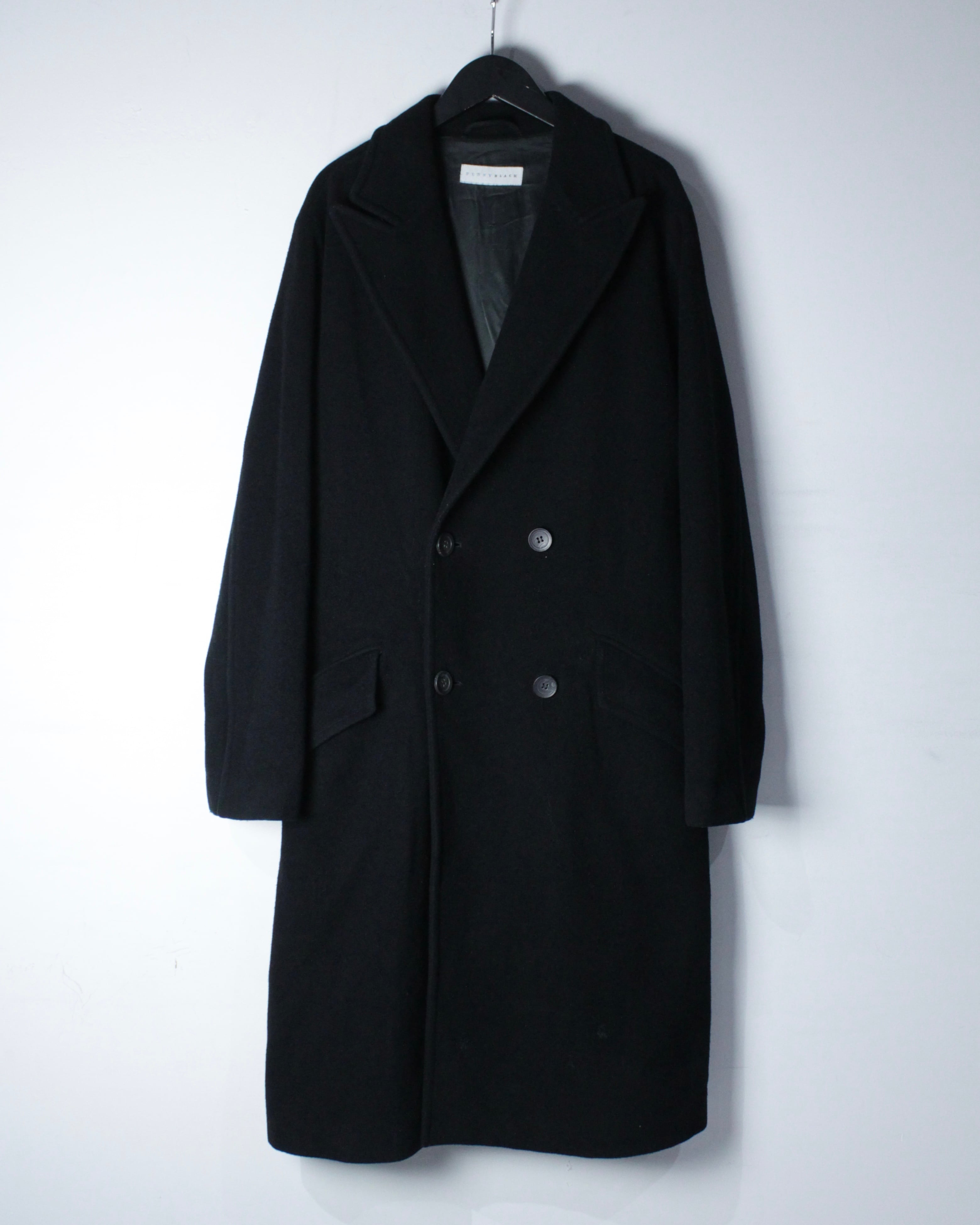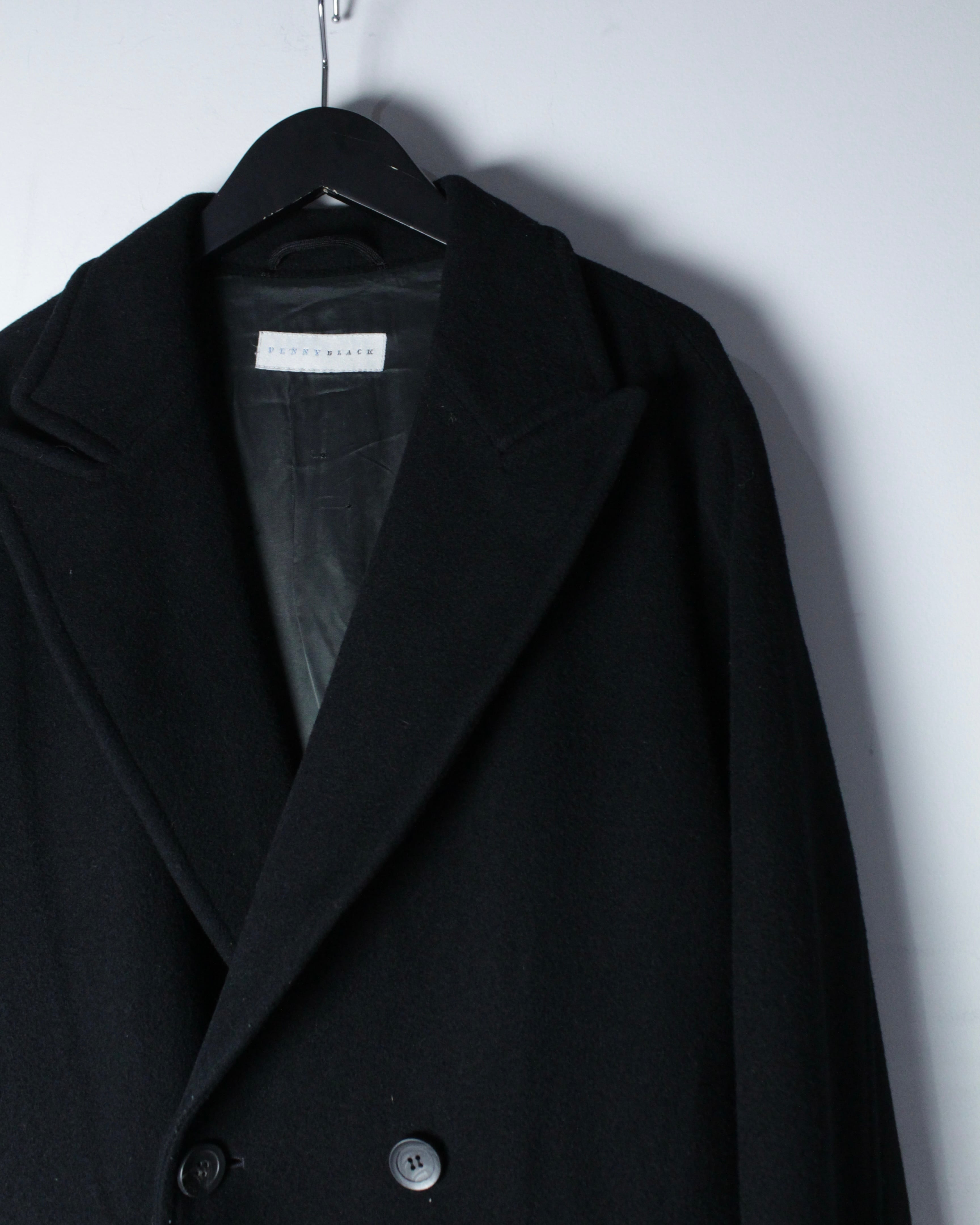 無駄を削ぎ落としたブラックボディに、ピークドラペルを採用。シャープに立ち上がるラペルのラインが顔まわりに立体感を与え、クラシックなダブルブレスト仕様と相まって凛とした佇まいに仕上がっています。