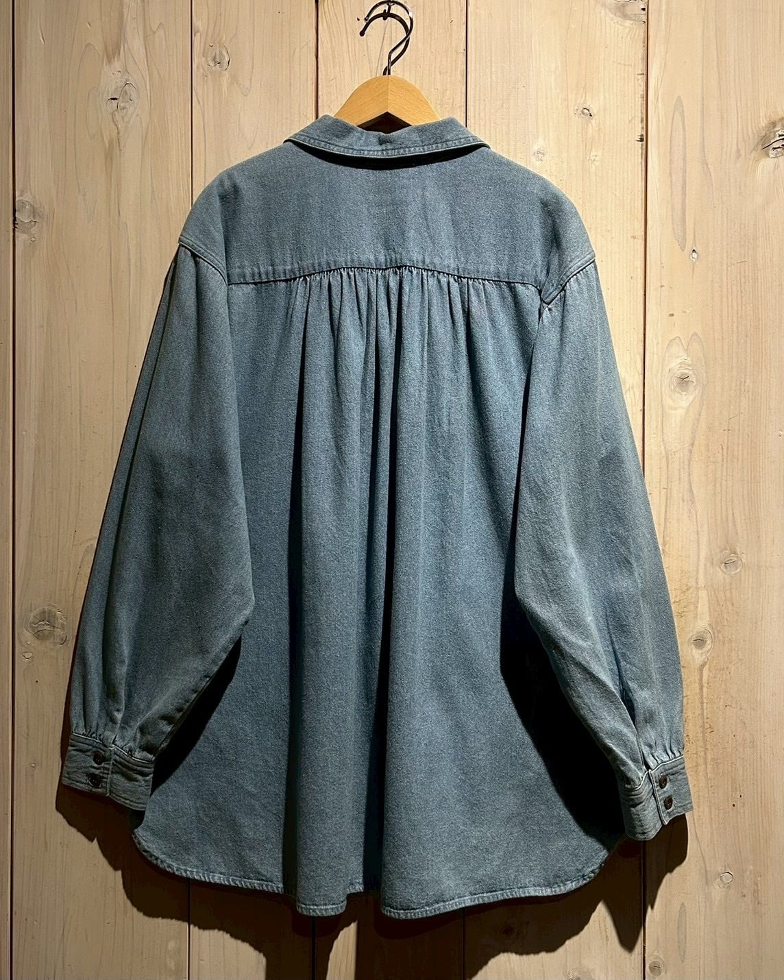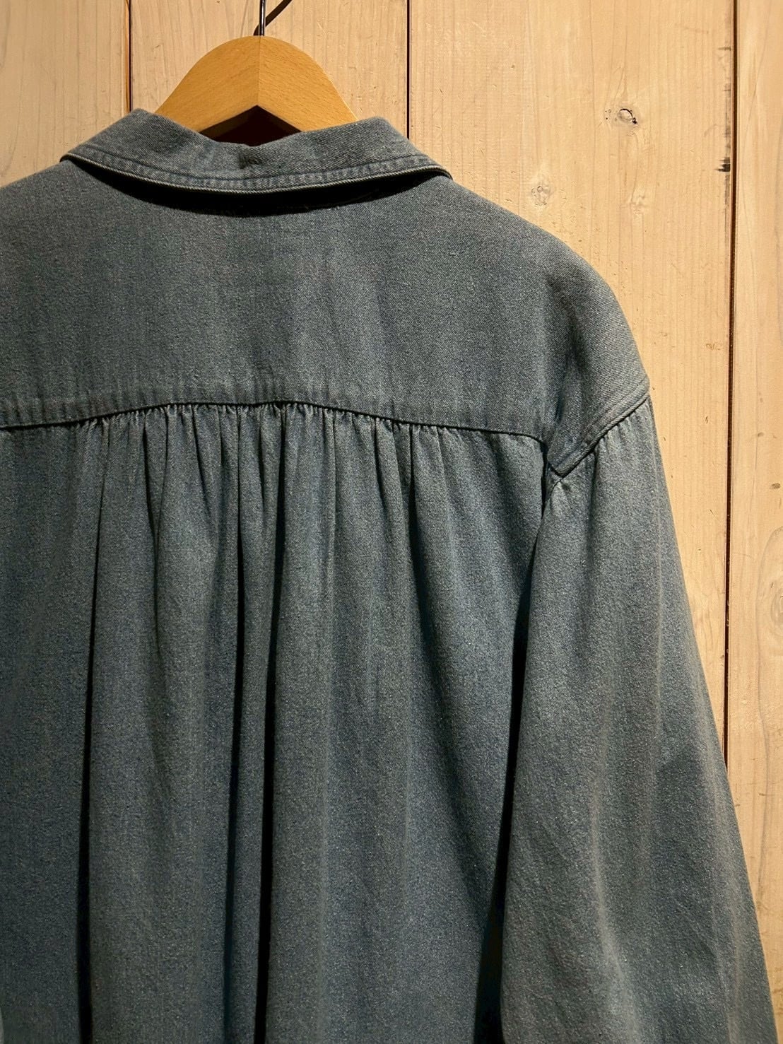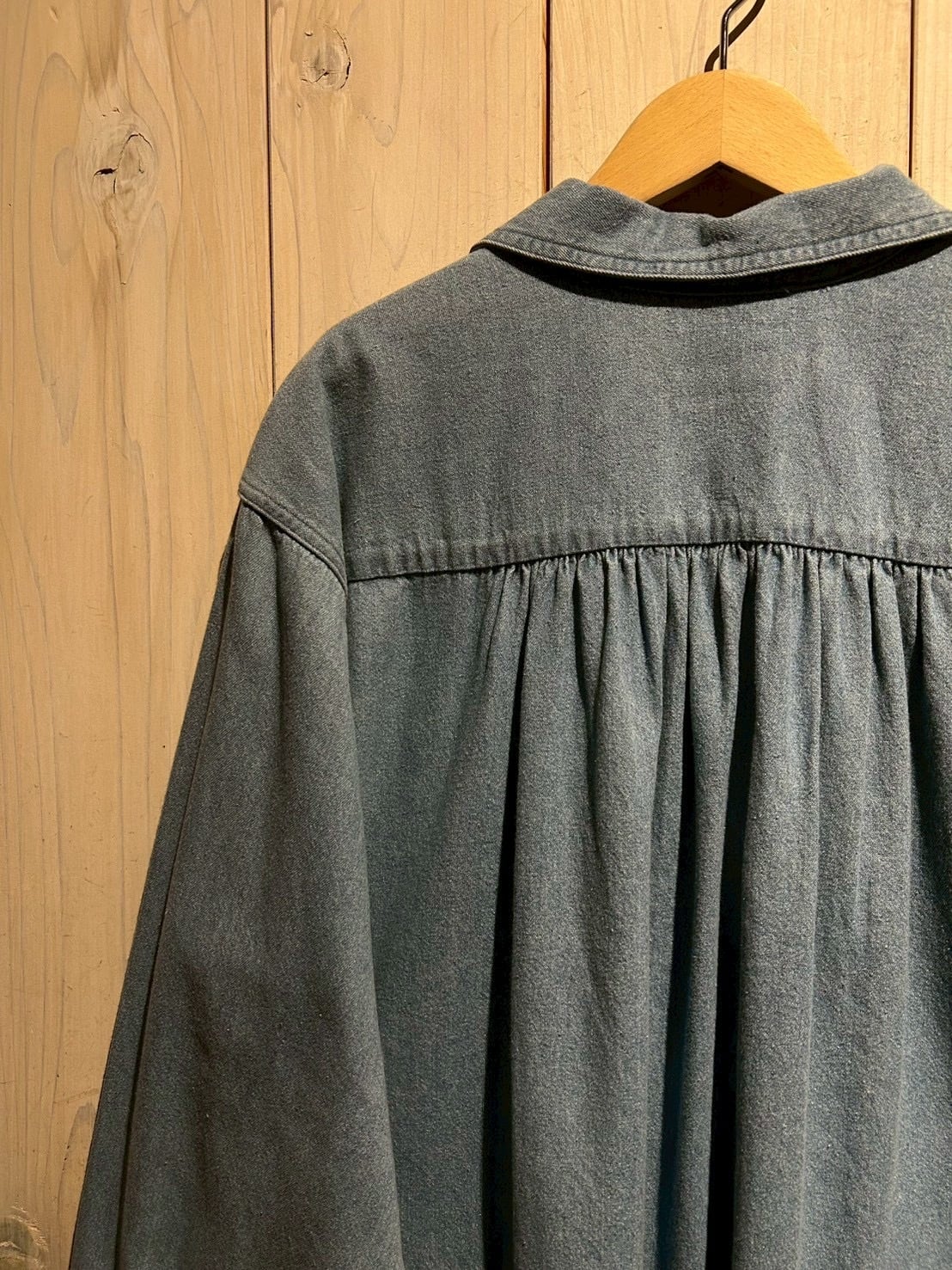 フェードを帯びたブルーデニムのボディは、100%コットンならではのドライな質感と程よい肉感が魅力。後ろ身頃の長さ、背面のギャザーによる自然なドレープと、シンプルな中に、老舗らしい丁寧なパターンメイクとディテール美が光りますね。
