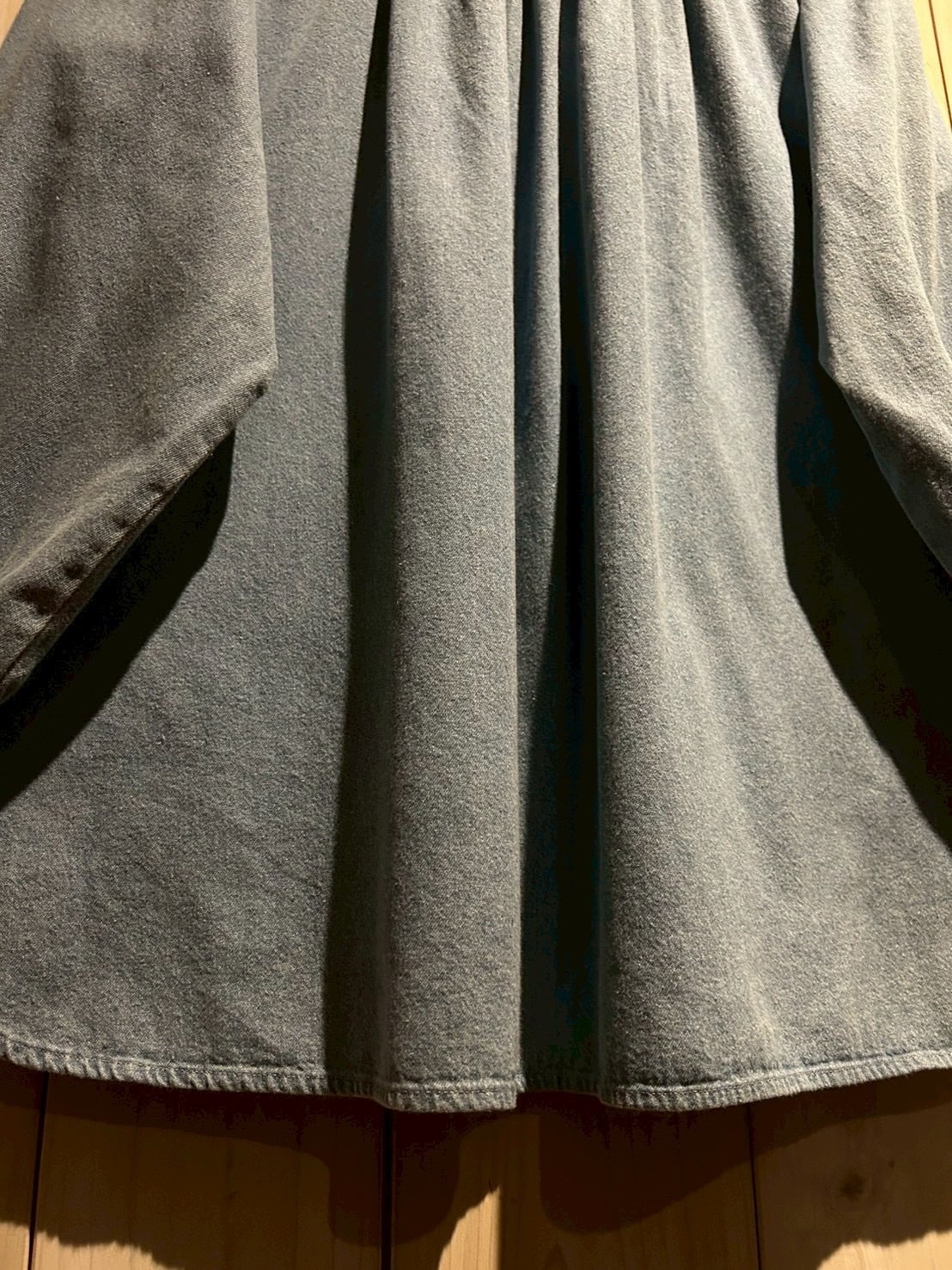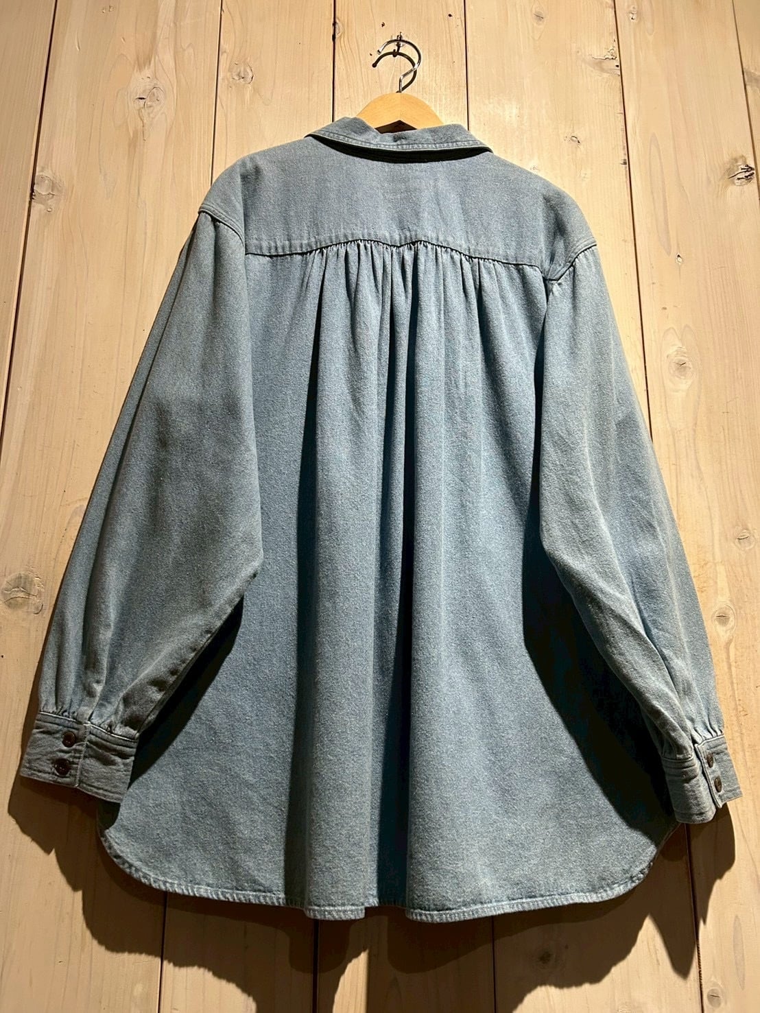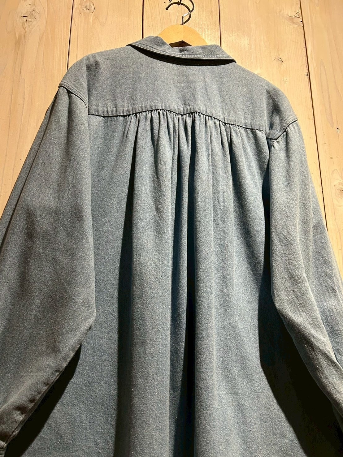 フェードを帯びたブルーデニムのボディは、100%コットンならではのドライな質感と程よい肉感が魅力。後ろ身頃の長さ、背面のギャザーによる自然なドレープと、シンプルな中に、老舗らしい丁寧なパターンメイクとディテール美が光りますね。