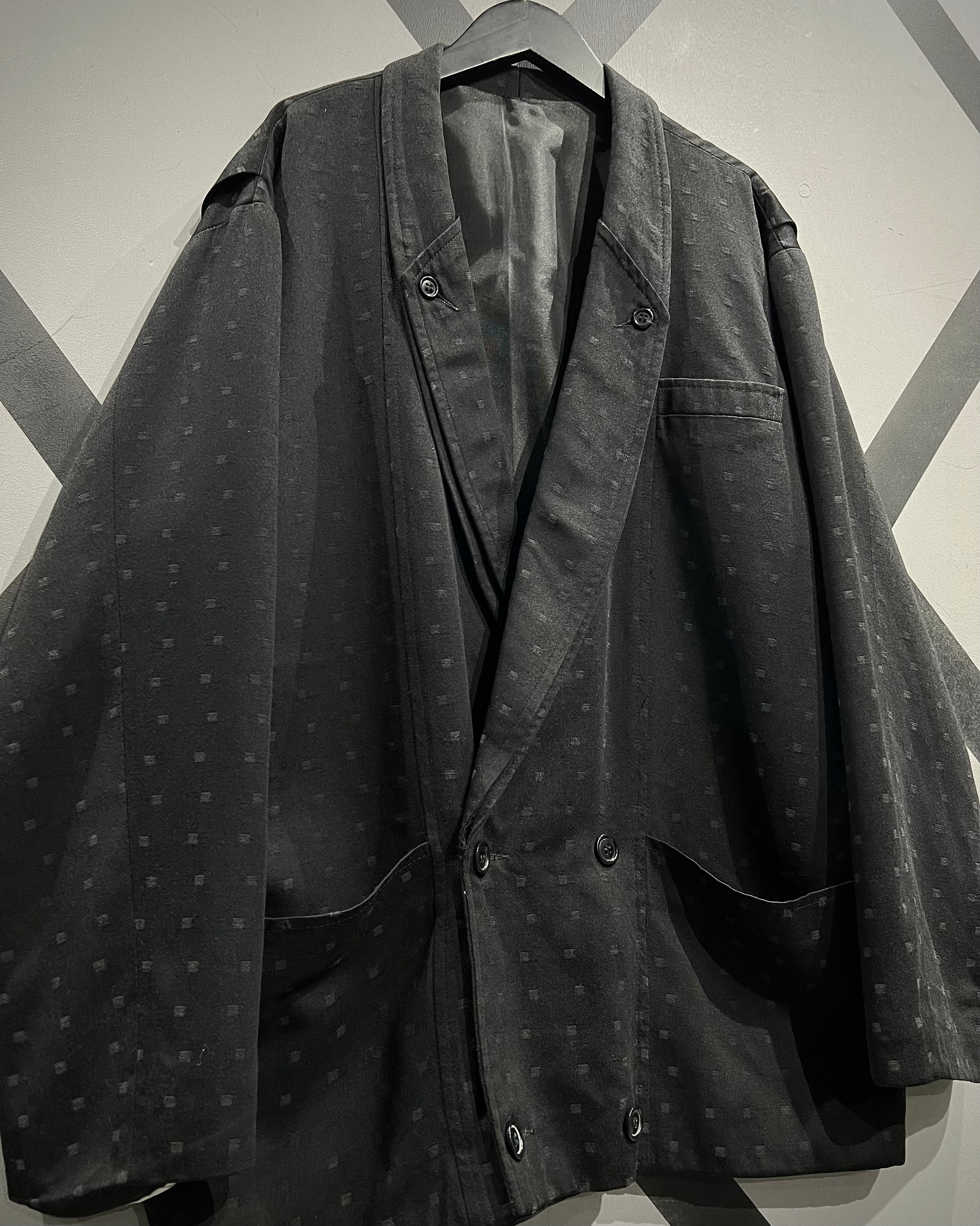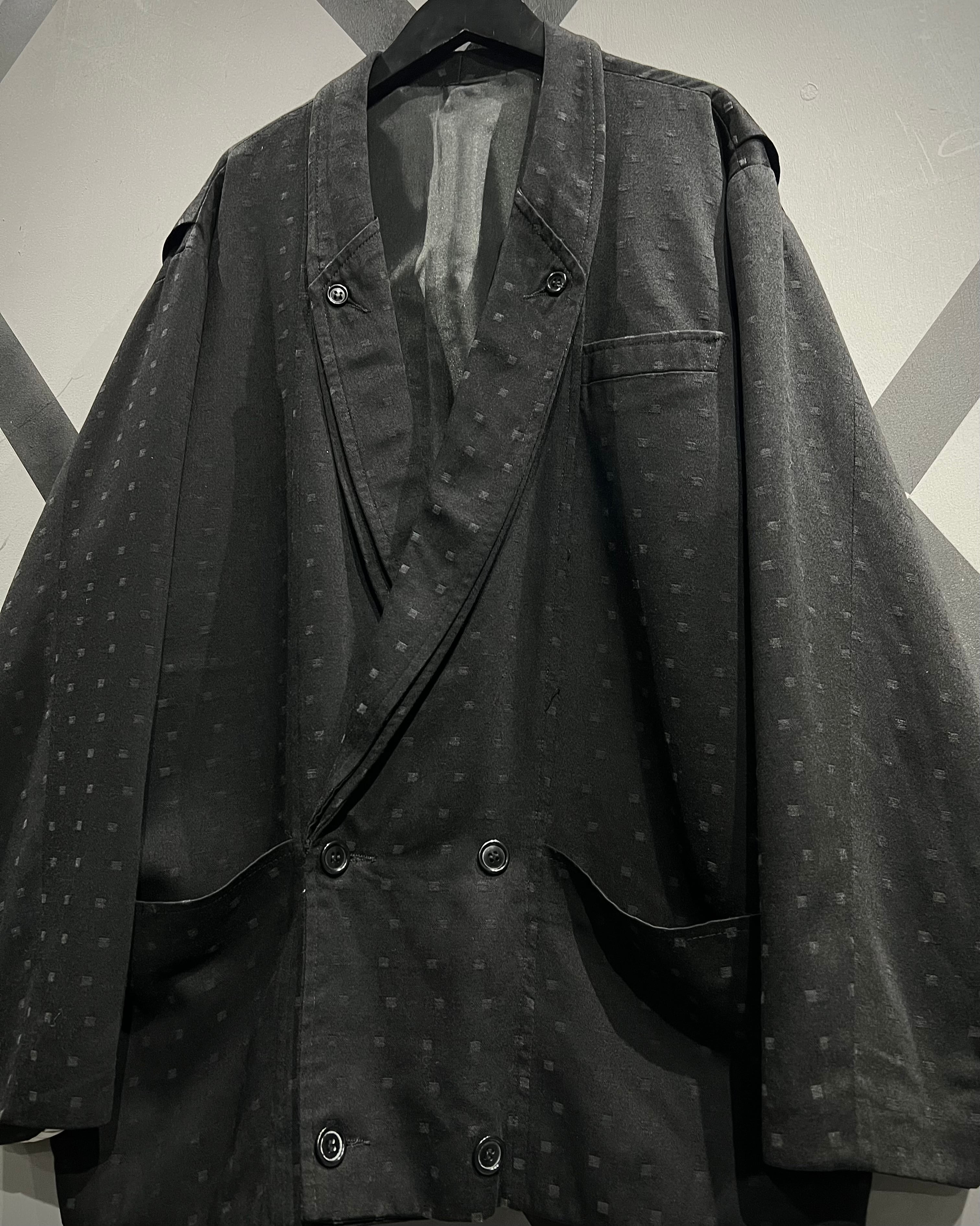 ショールカラー仕様のダブルブレスト。ラペルからフロントにかけて流れるような曲線が、クラシックでありながらどこかモードな雰囲気を演出。