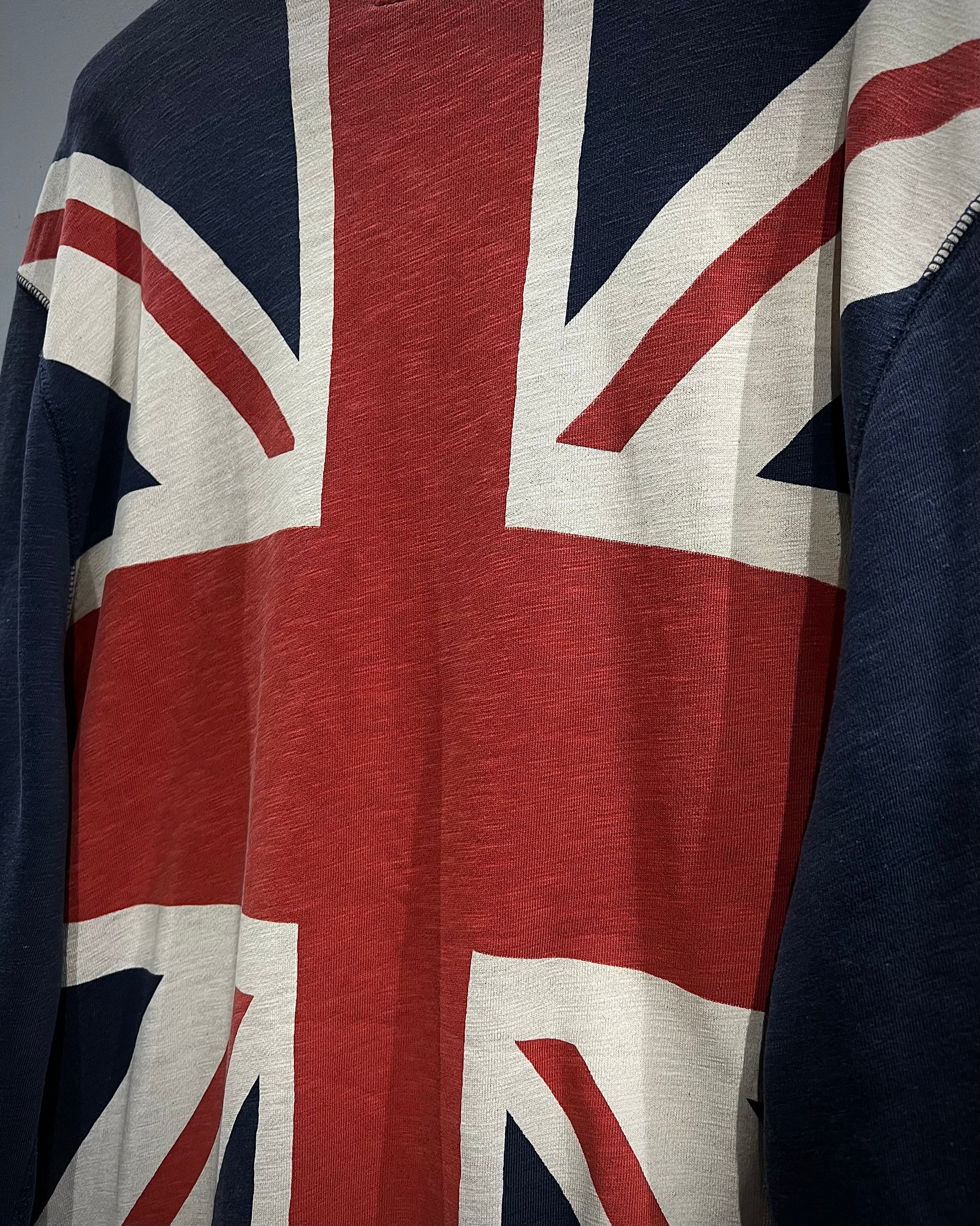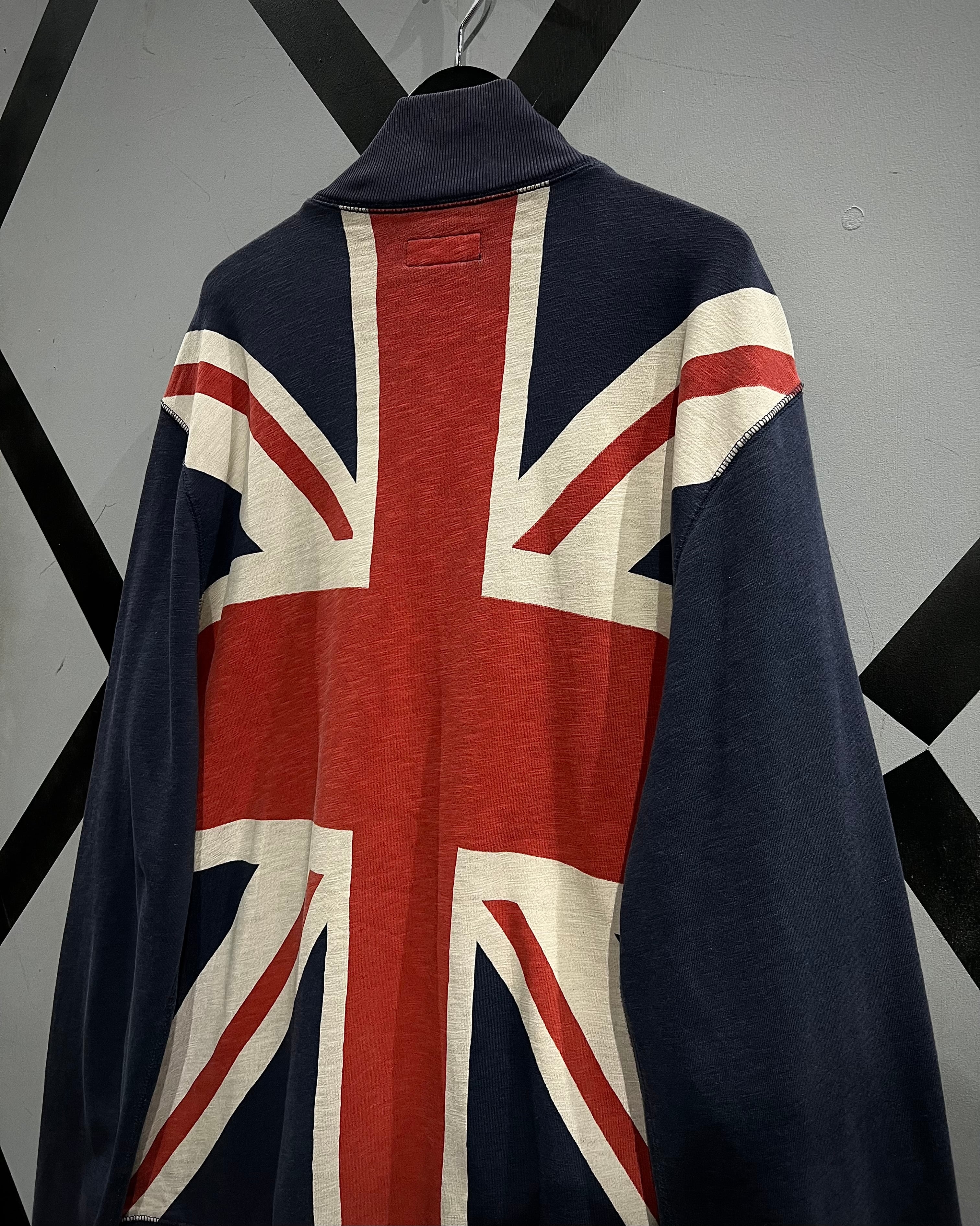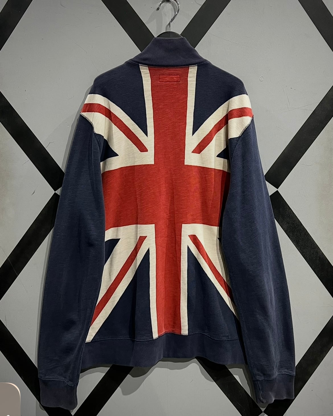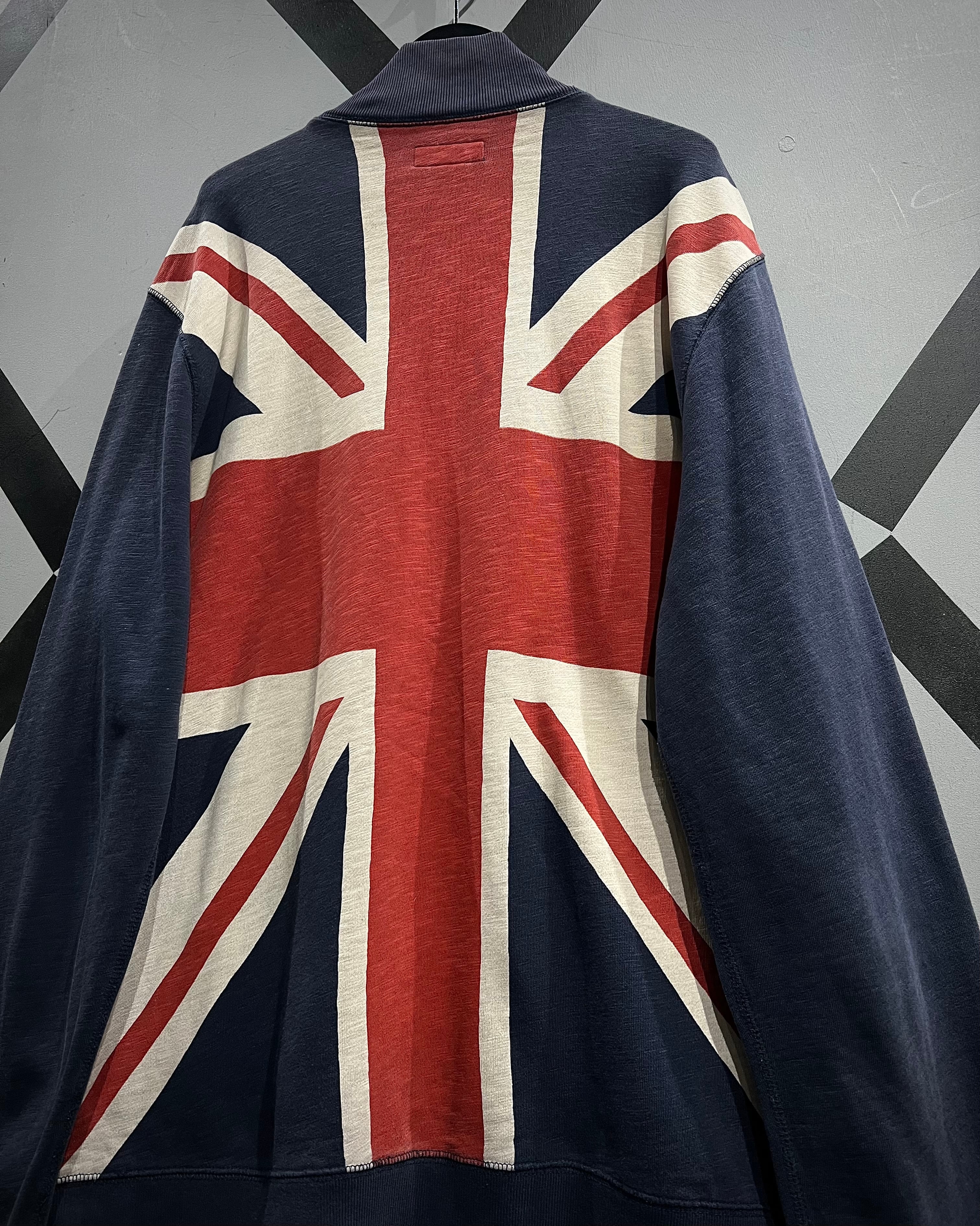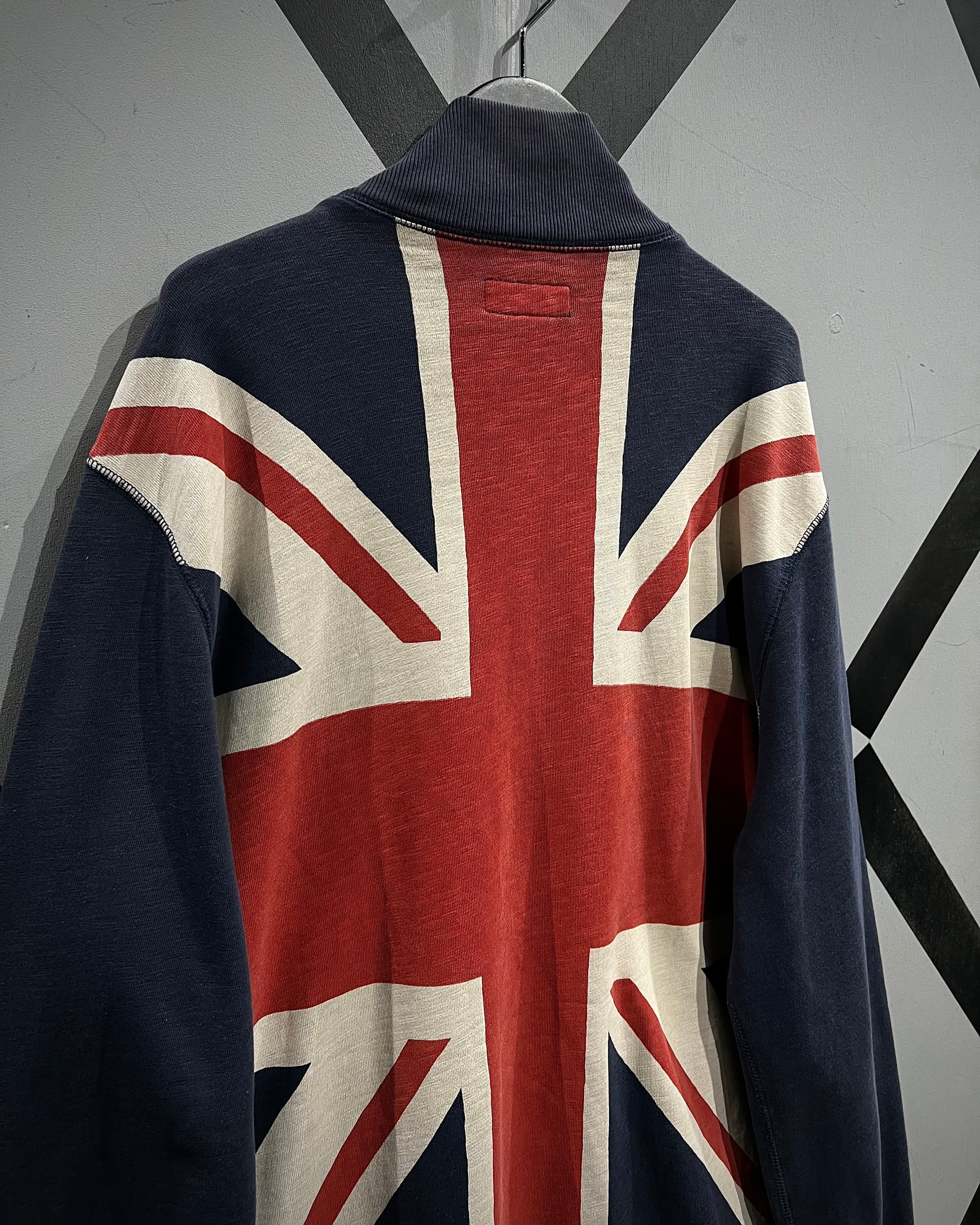 ネイビーボディをベースに、背面いっぱいに大胆に配されたユニオンジャックが圧巻の1着。フロントはミニマルな表情ながら、胸元にはシールドワッペンを配置し、前後でメリハリの効いたデザインバランスに仕上げられています。