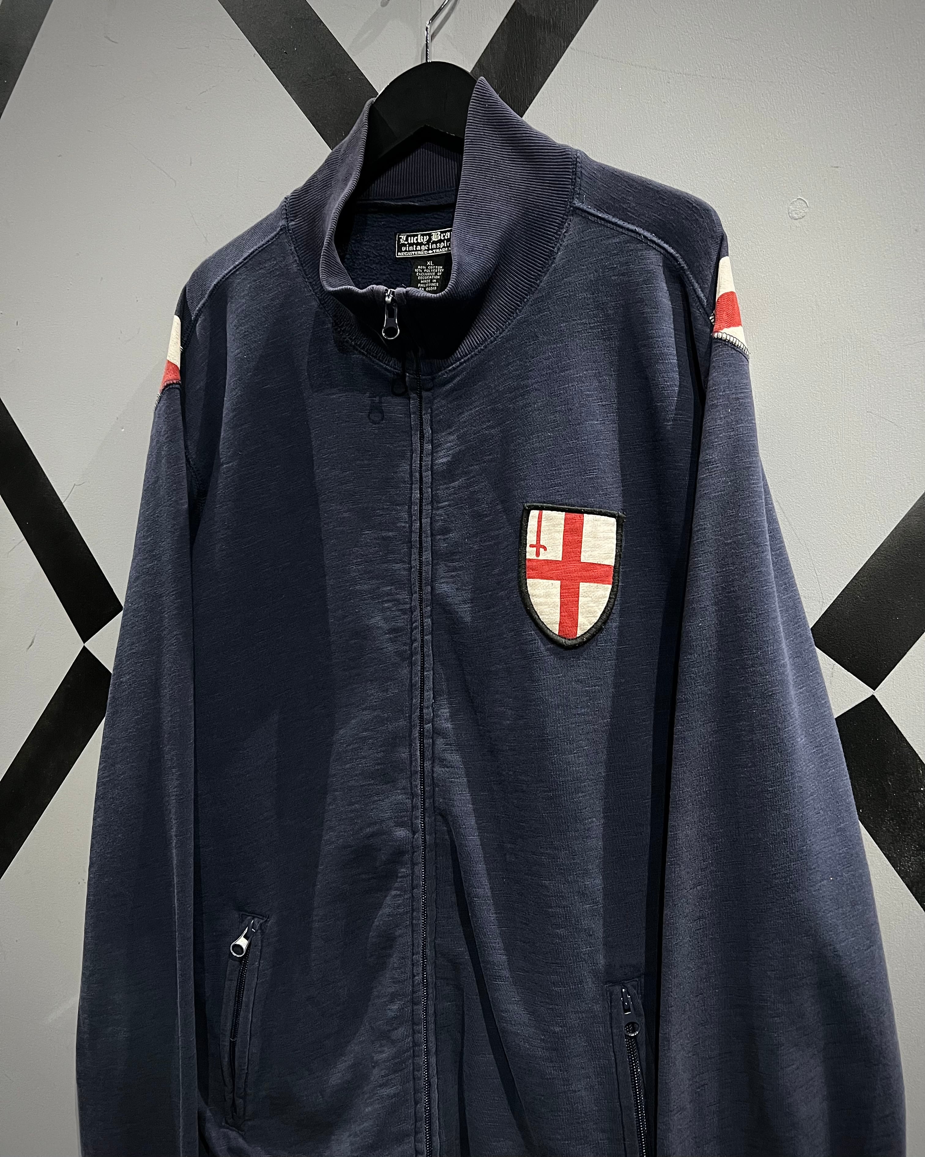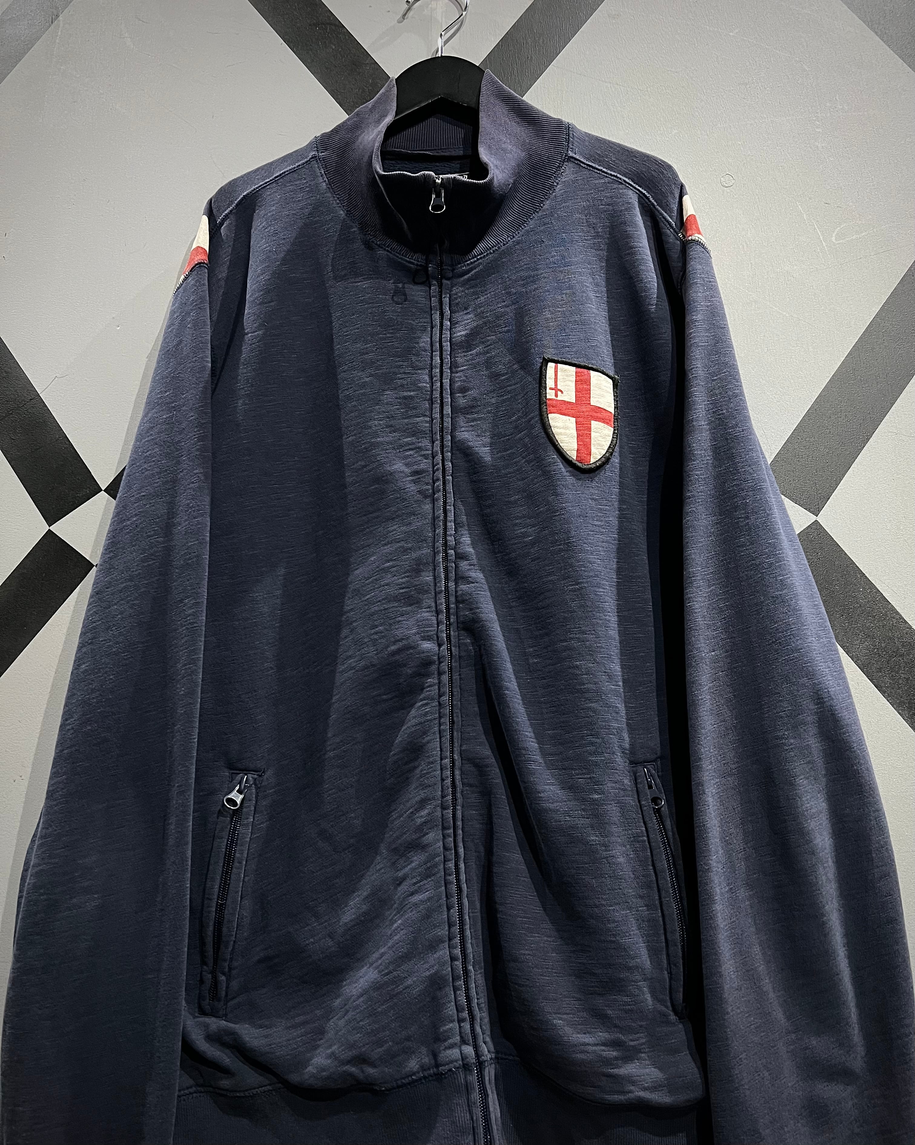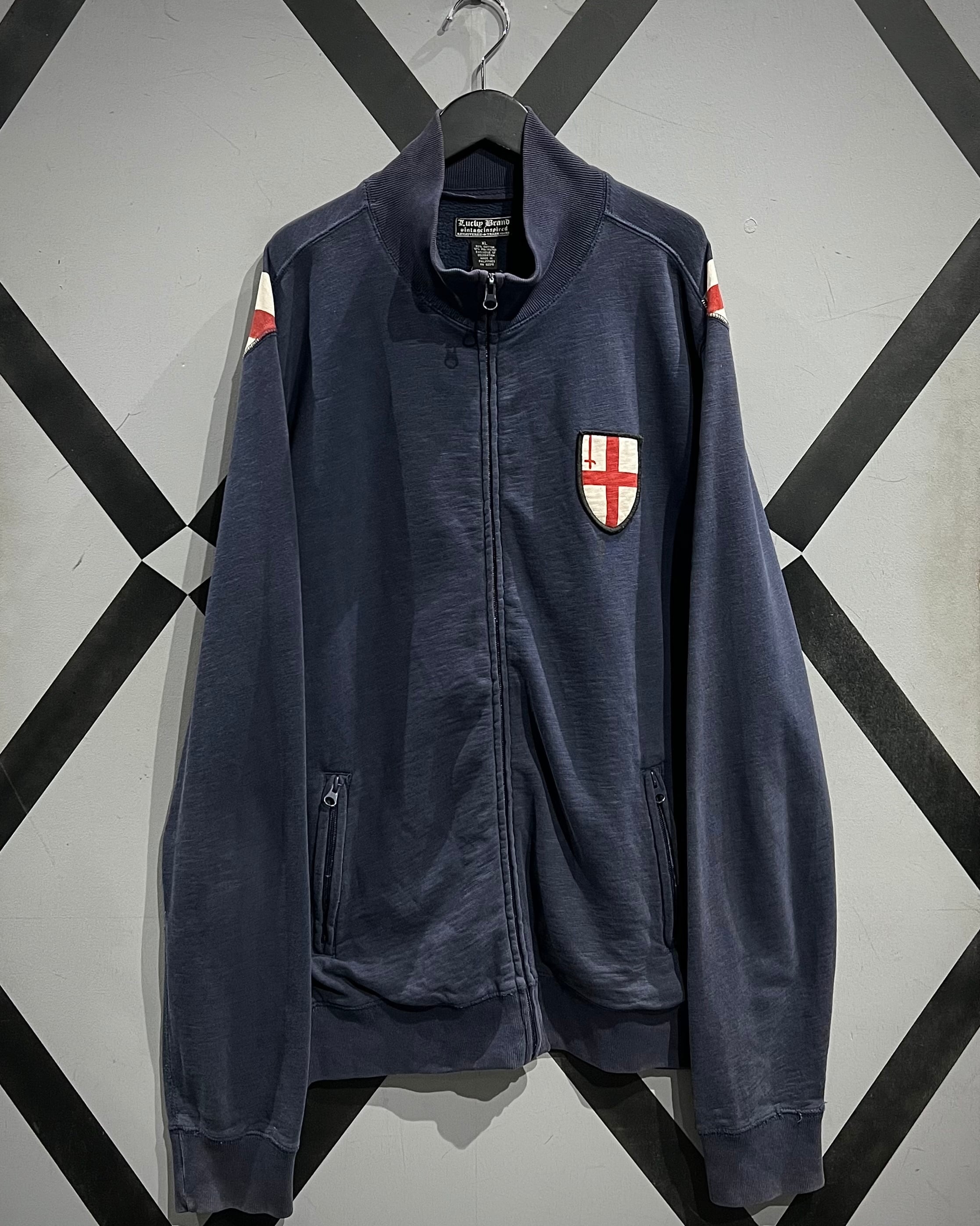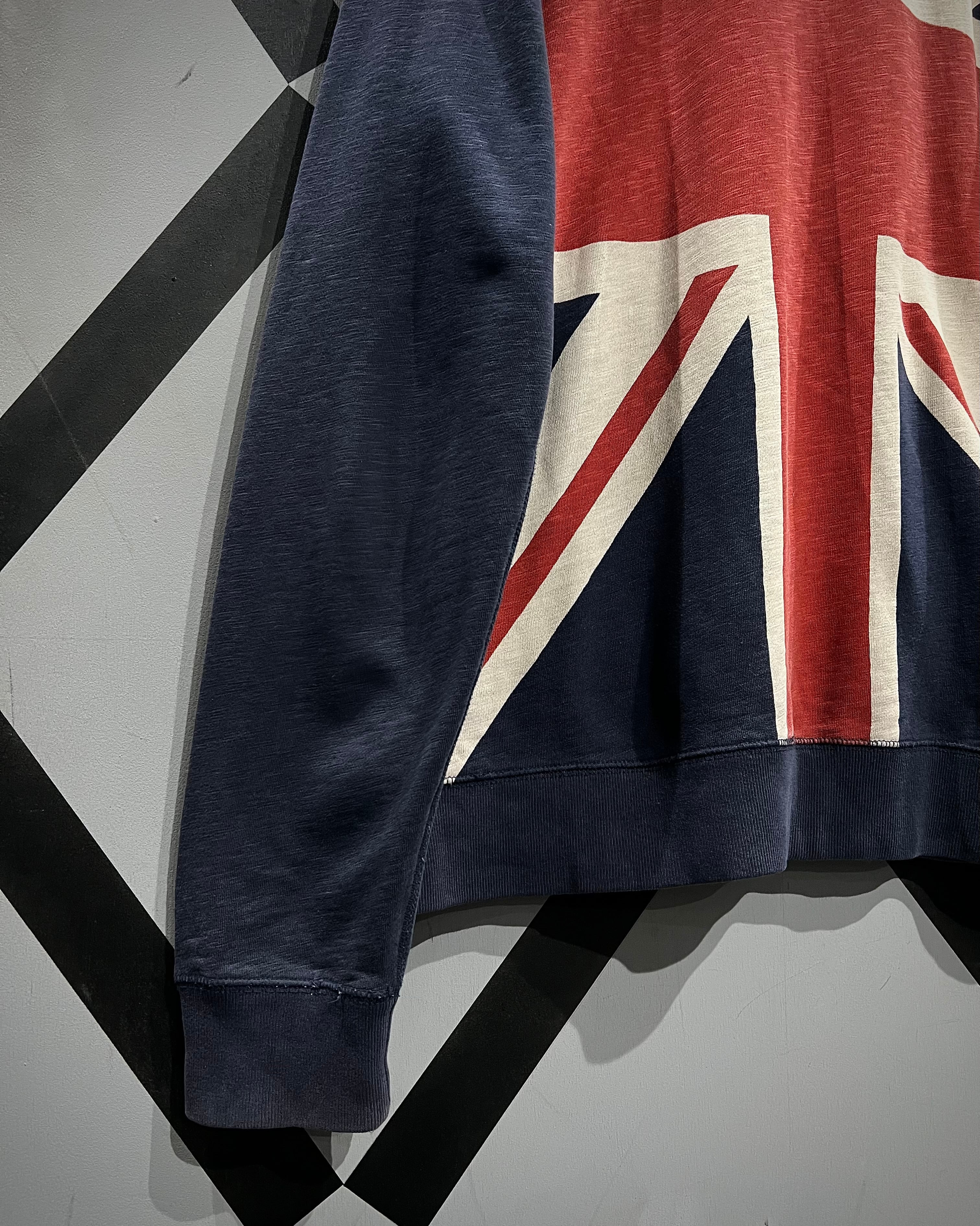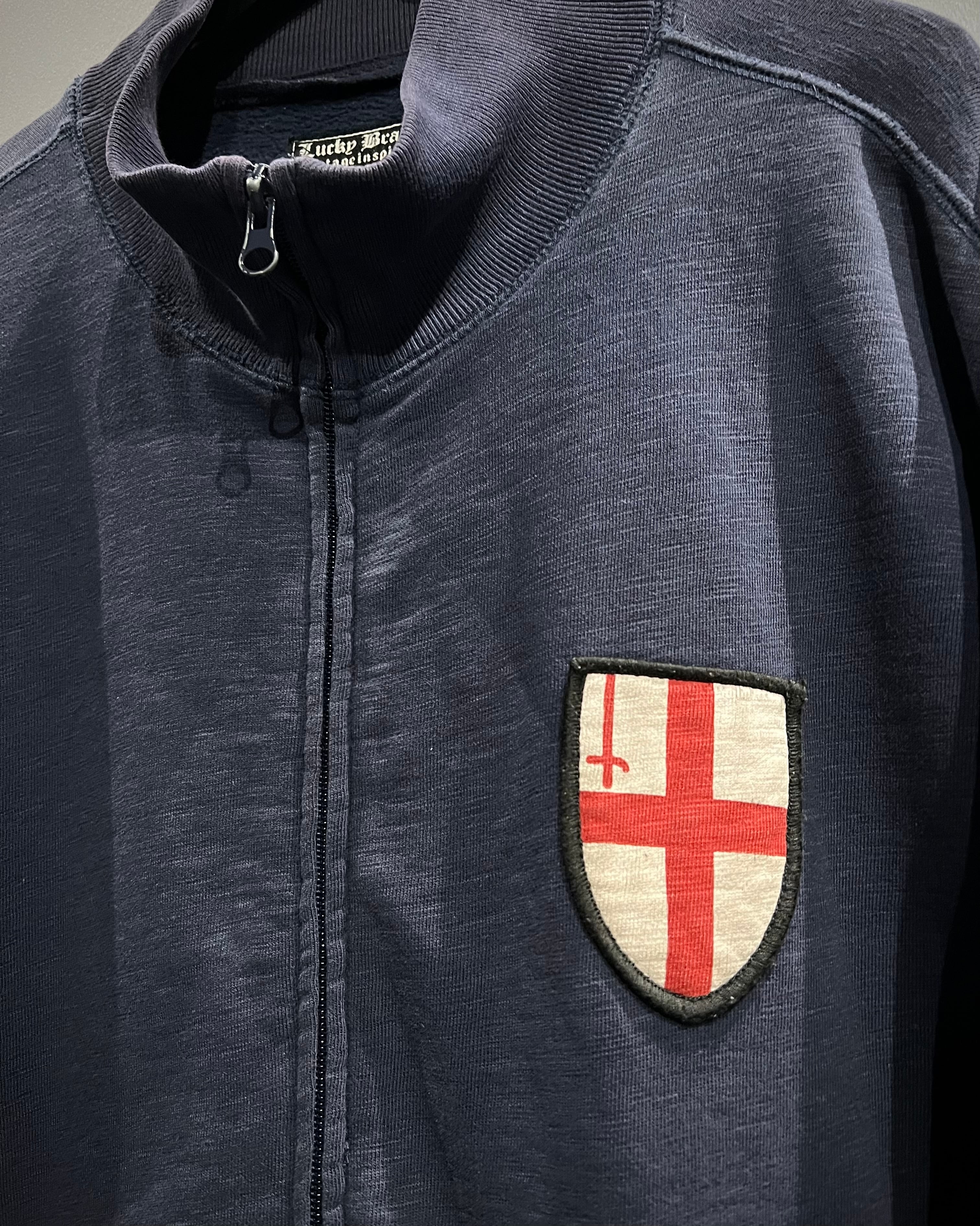 ネイビーボディをベースに、背面いっぱいに大胆に配されたユニオンジャックが圧巻の1着。フロントはミニマルな表情ながら、胸元にはシールドワッペンを配置し、前後でメリハリの効いたデザインバランスに仕上げられています。