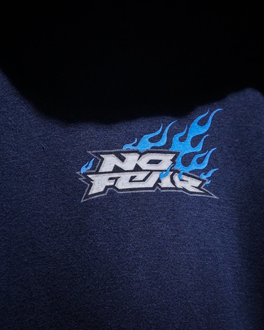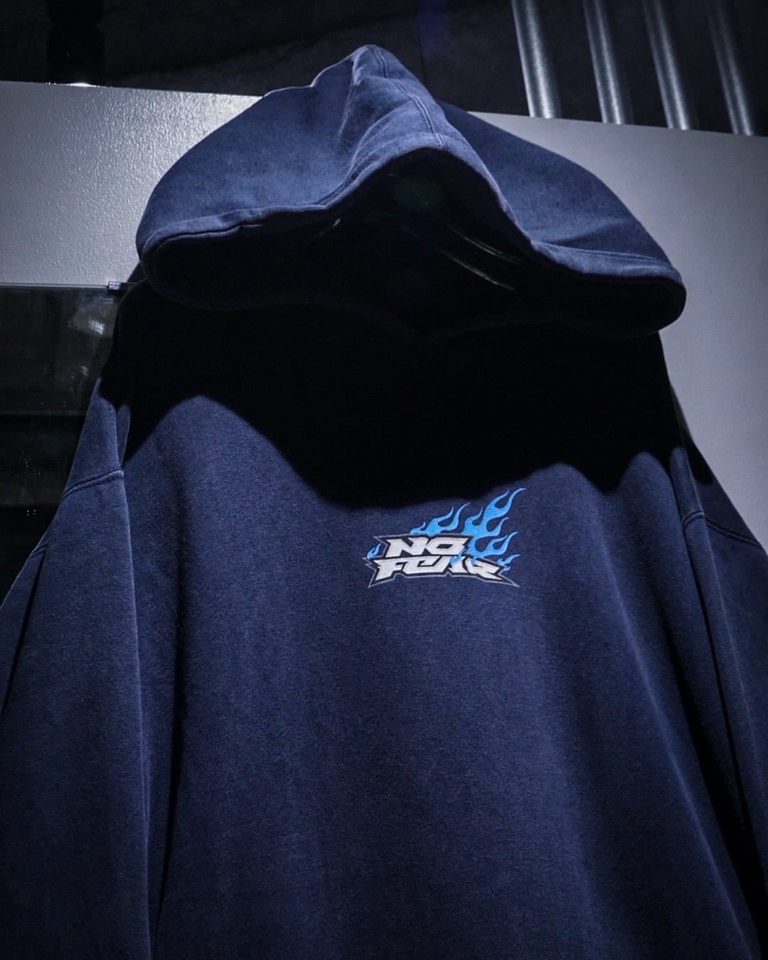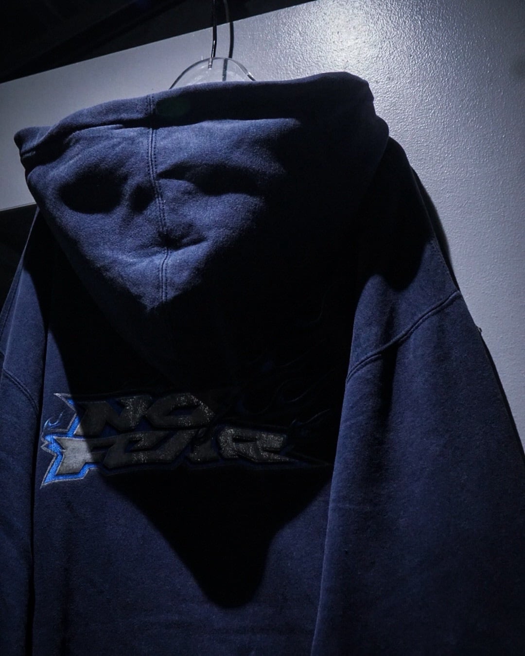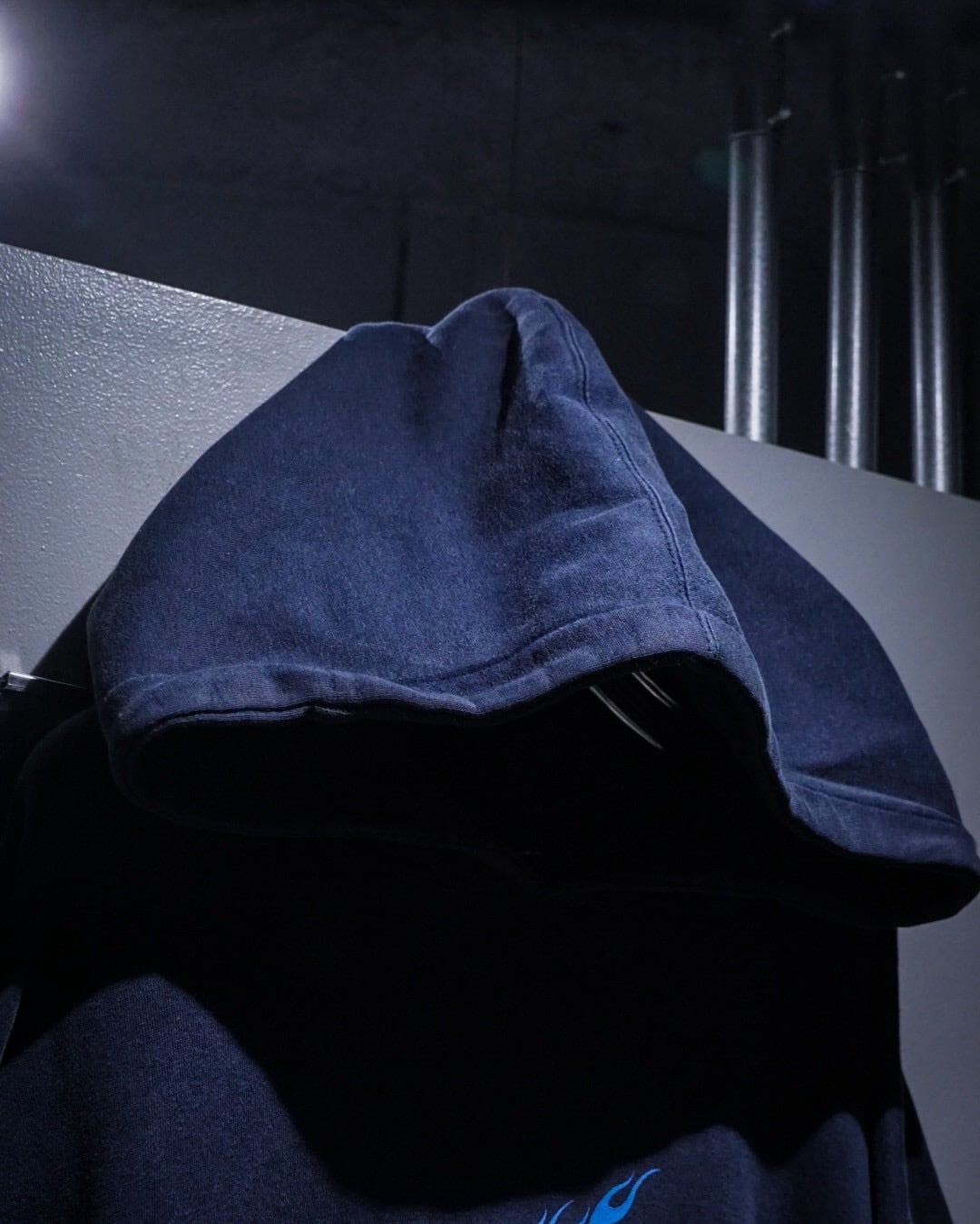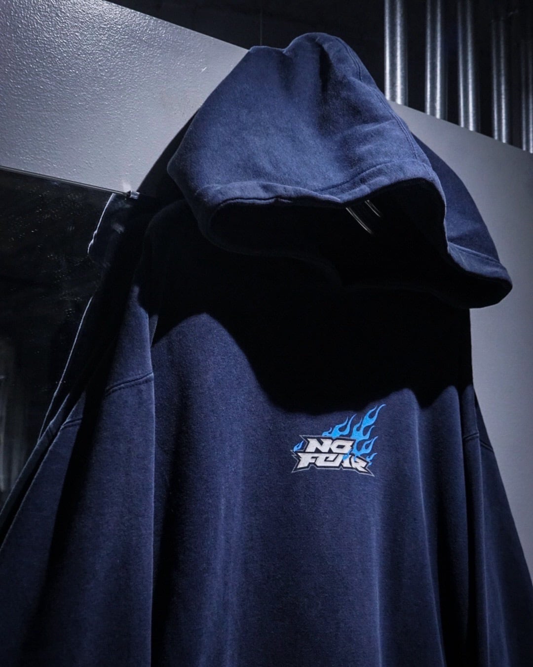 フェードがかったネイビーボディに、フロント、バックへ大胆に配されたブランドロゴが印象的な1着。ブルーフレイムを纏ったグラフィックが、シンプルなボディに強烈なインパクトを与えています。