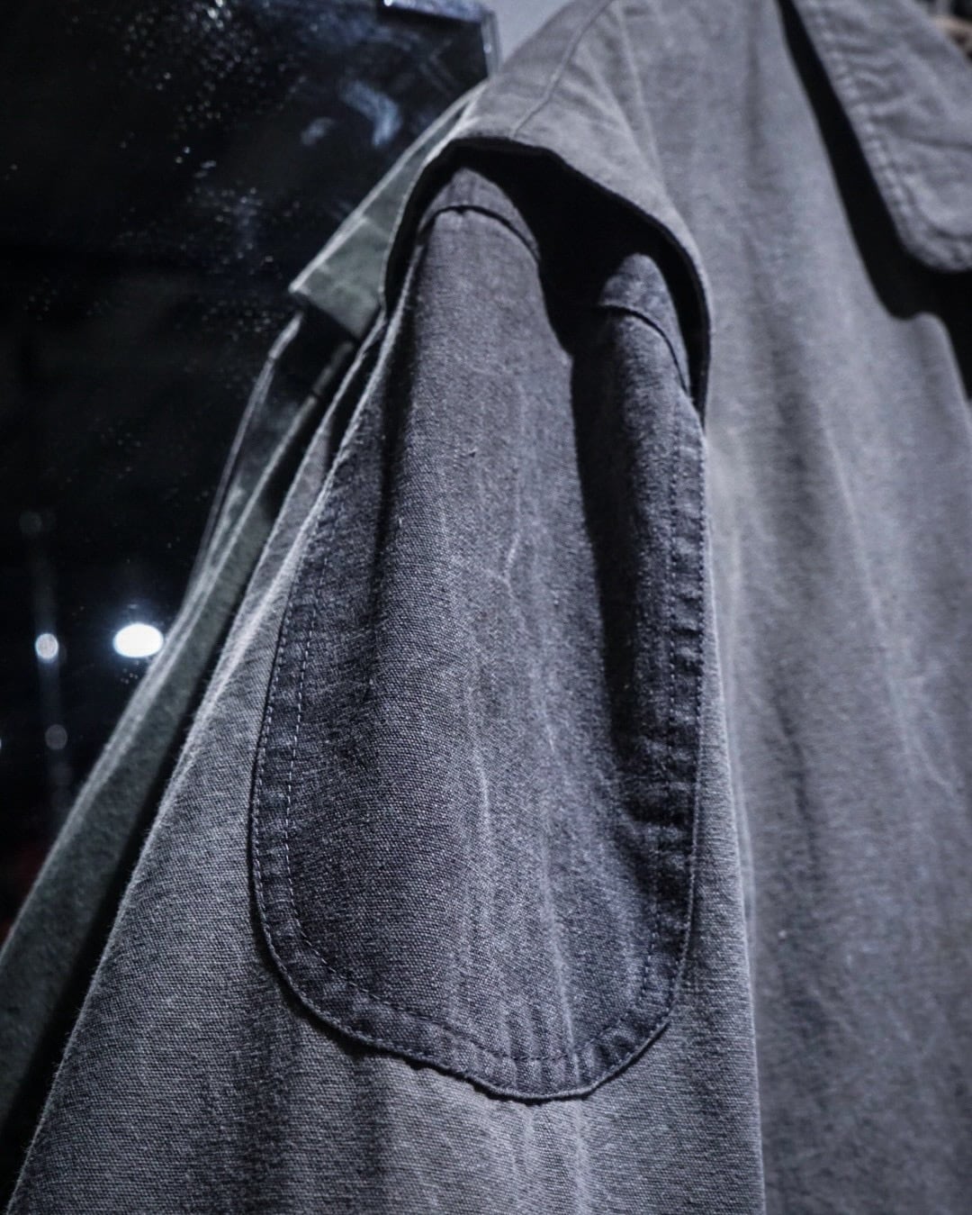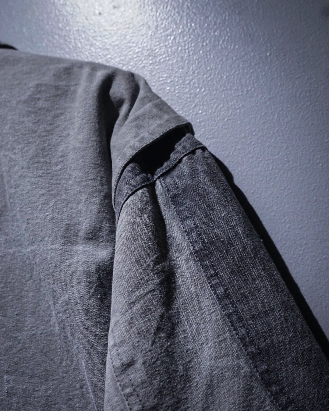 フロントは比翼仕様でミニマルにまとめつつ、大ぶりのフラップポケットが程よいワークテイストをプラスし、肩には切り替えが施され、さりげなく立体感を演出。
